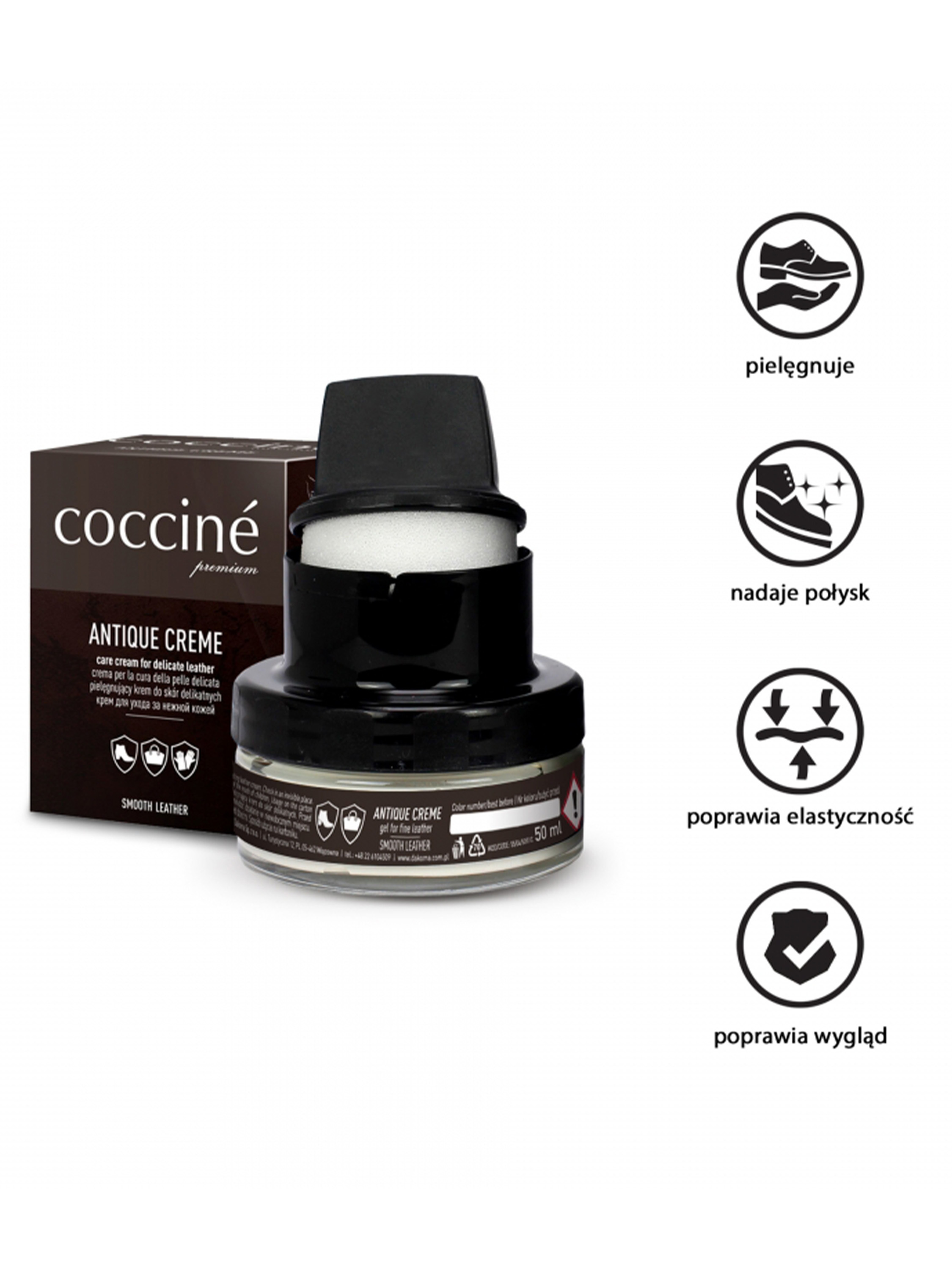 To wyjątkowy żel do codziennej pielęgnacji obuwia i galanterii skórzanej, toreb, teczek ze skóry antykowanej (o postarzonym wyglądzie). Zamknięty w poręcznym słoiczku z praktyczną gabeczką do nakładania i rozprowadzania preparatu na powierzchni skóry.