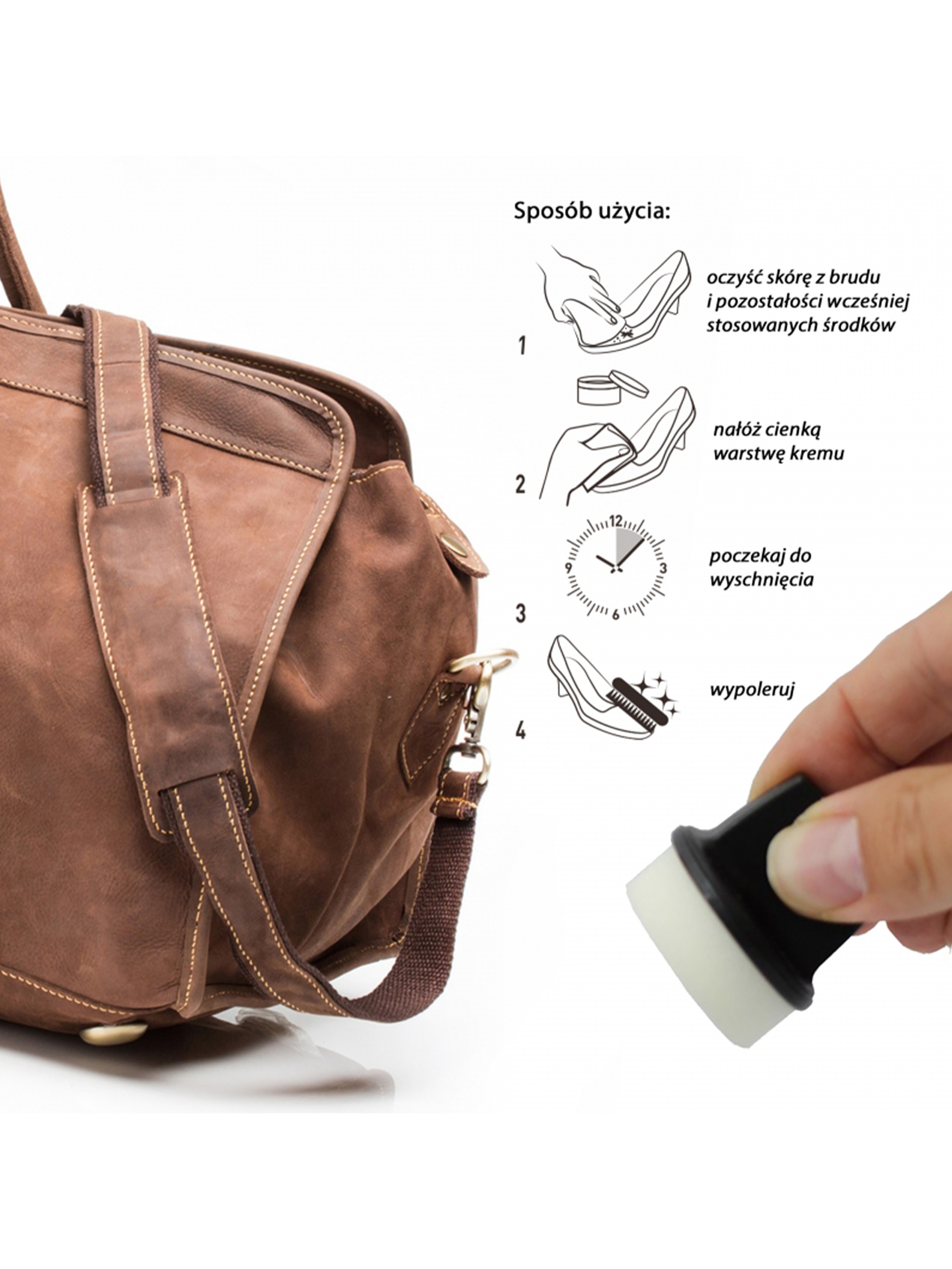 Równomiernie nałożyć cienką warstwę na powierzchnię skóry. Po wyschnięciu lekko wypolerować szczotką z miękkim włosiem.