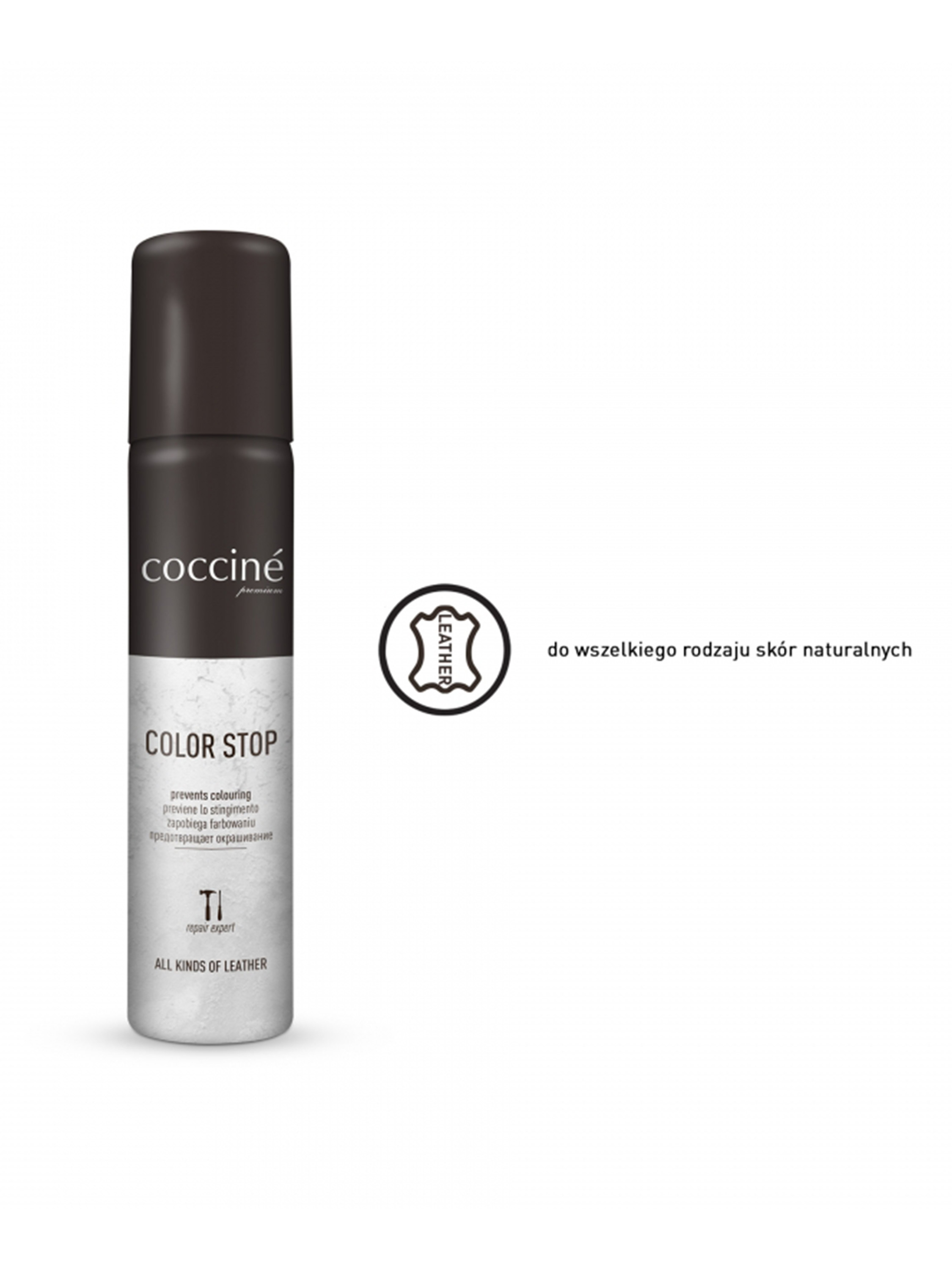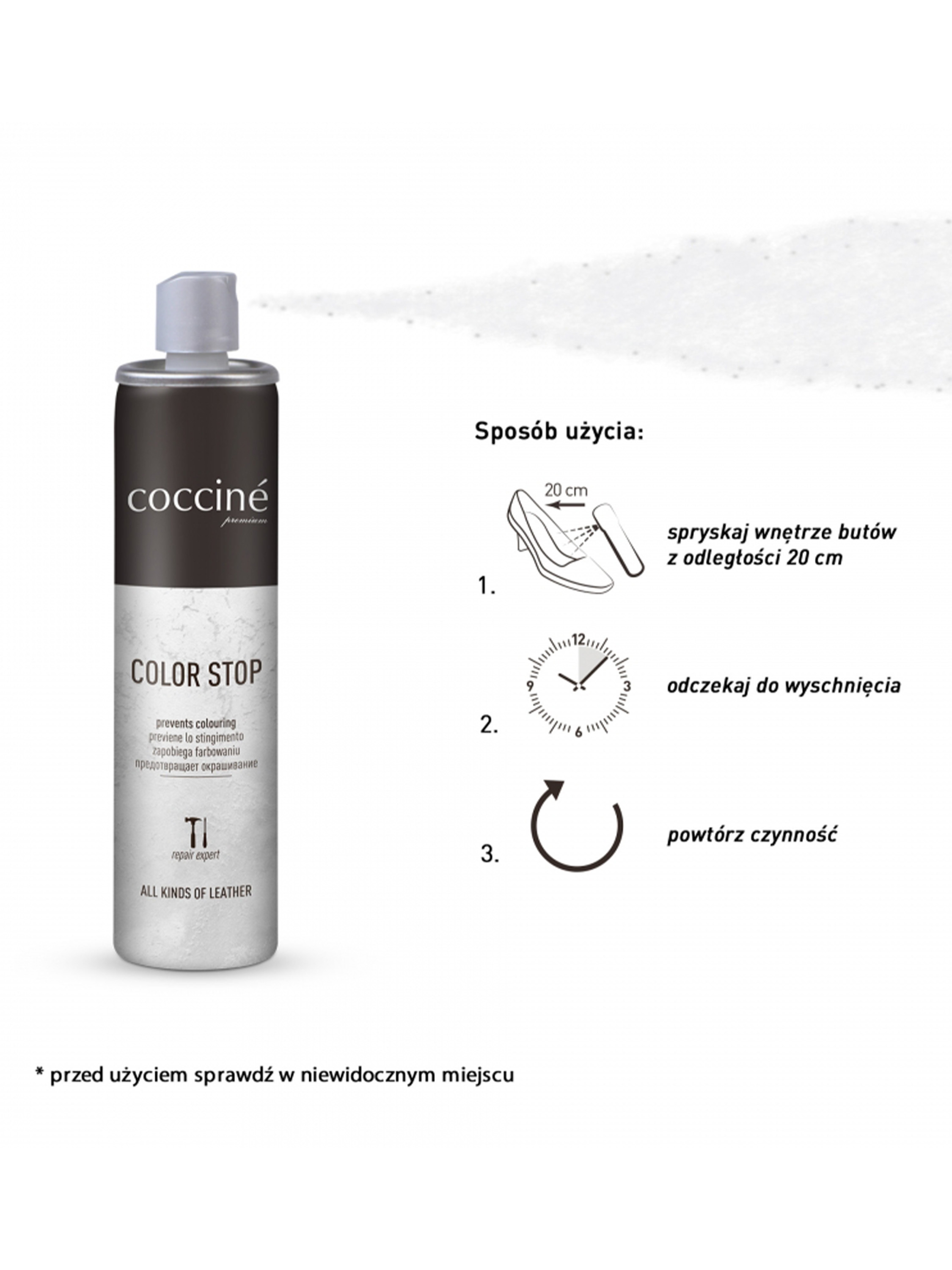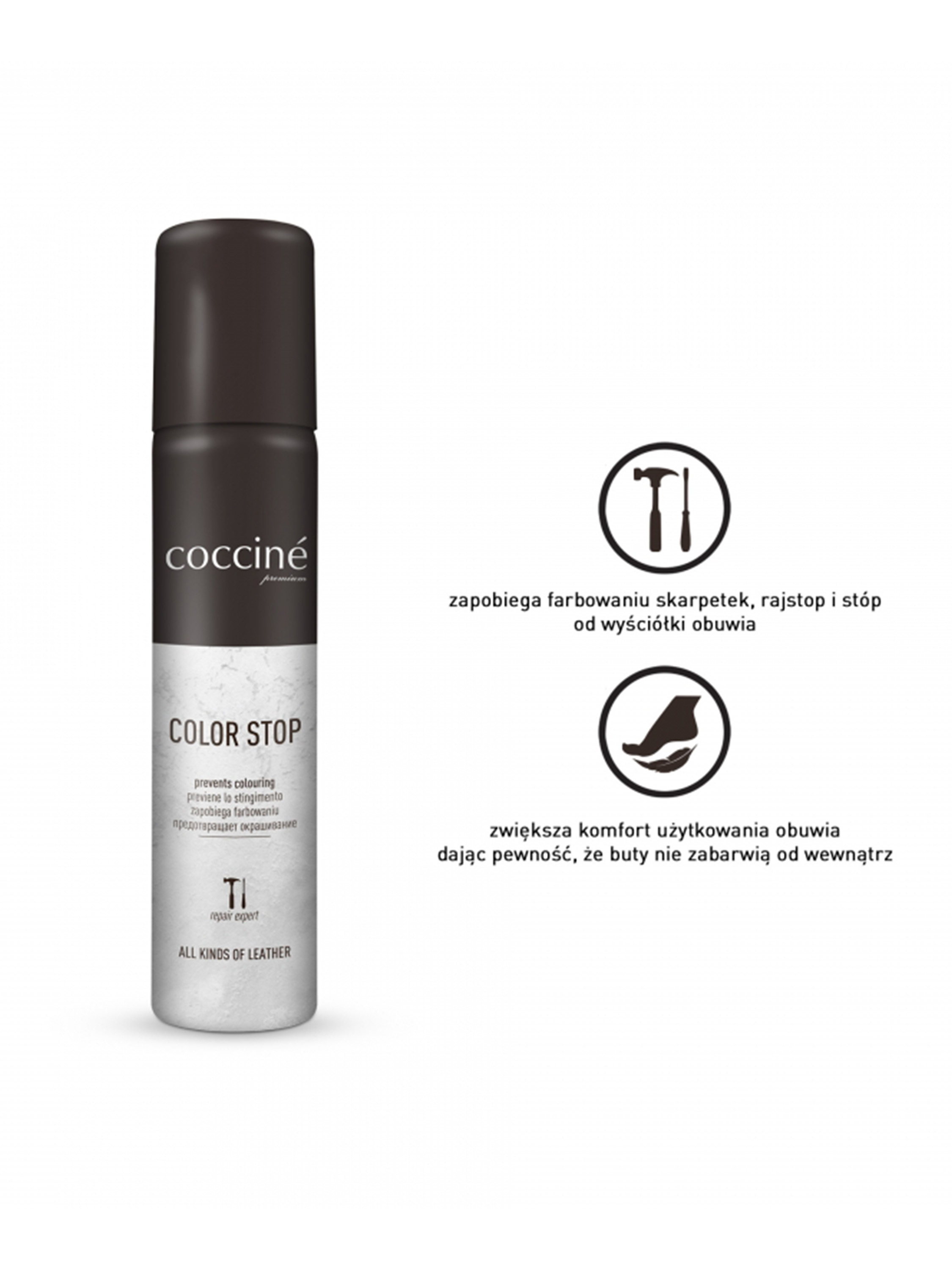 Kolor Stop to preparat przeznaczony do wszystkich rodzajów skór, zapobiegający barwieniu butów od wewnątrz. Pokrywając wyściółkę butów cienką powłoką zabezpieczającą, skutecznie eliminuje problem zafarbowanych skarpetek, rajstop i stóp. Czynność powtarzać systematycznie.