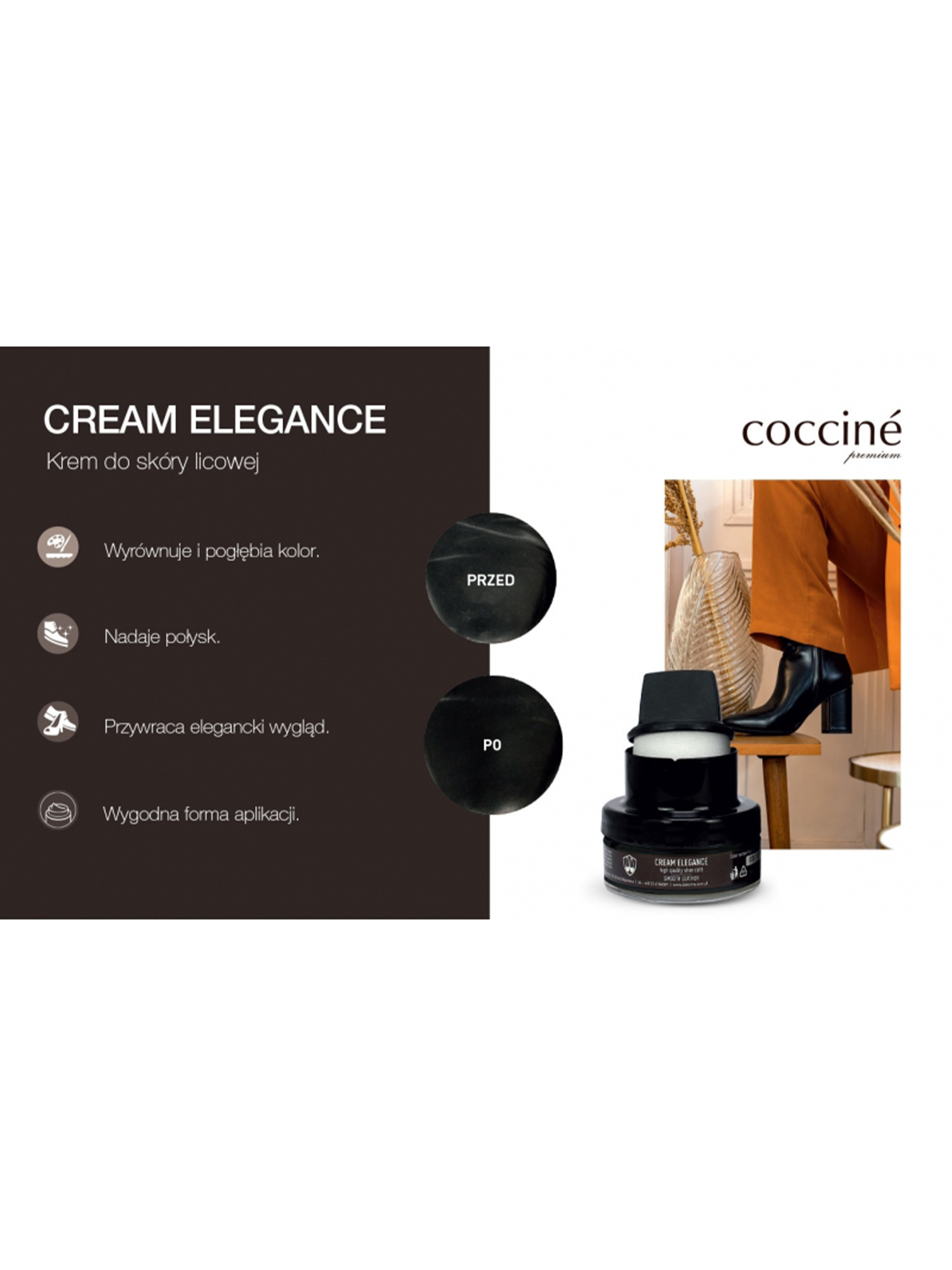 Cocciné Cream Elegance jest optymalnym wyborem dla wszystkich, którzy poszukują wydajnego i skutecznego kremu pielęgnującego obuwie. Zalety używania kremu docenią także osoby dbające o domowe finanse. Krem zabezpieczając obuwie wydłuża ich życie, co ogranicza konieczność ich wymiany na nowe. Zawiera woski, które po wypolerowaniu nadają piękny połysk i chronią skórę.