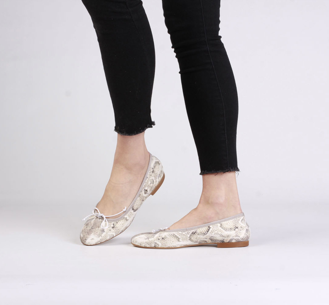 Klasyczne baleriny w nowoczesnym wydaniu to propozycja dla kobiet szukających uniwersalnych rozwiązań z charakterem. Skórzana cholewka, wnętrze oraz wkładka gwarantuje niebywały komfort i oddychanie stopie. Imitujący wężową skórkę print sprawia, że ponadczasowy design prezentuje się niezwykle unikatowo. Nikt nie przejdzie obok nich obojętnie!