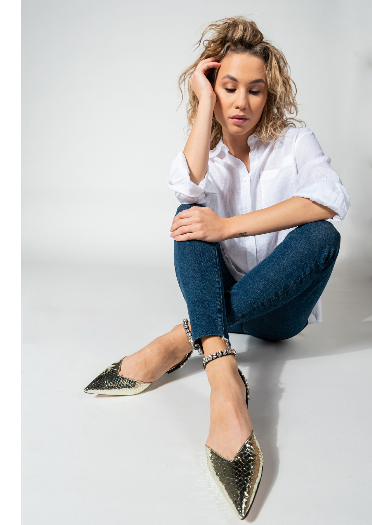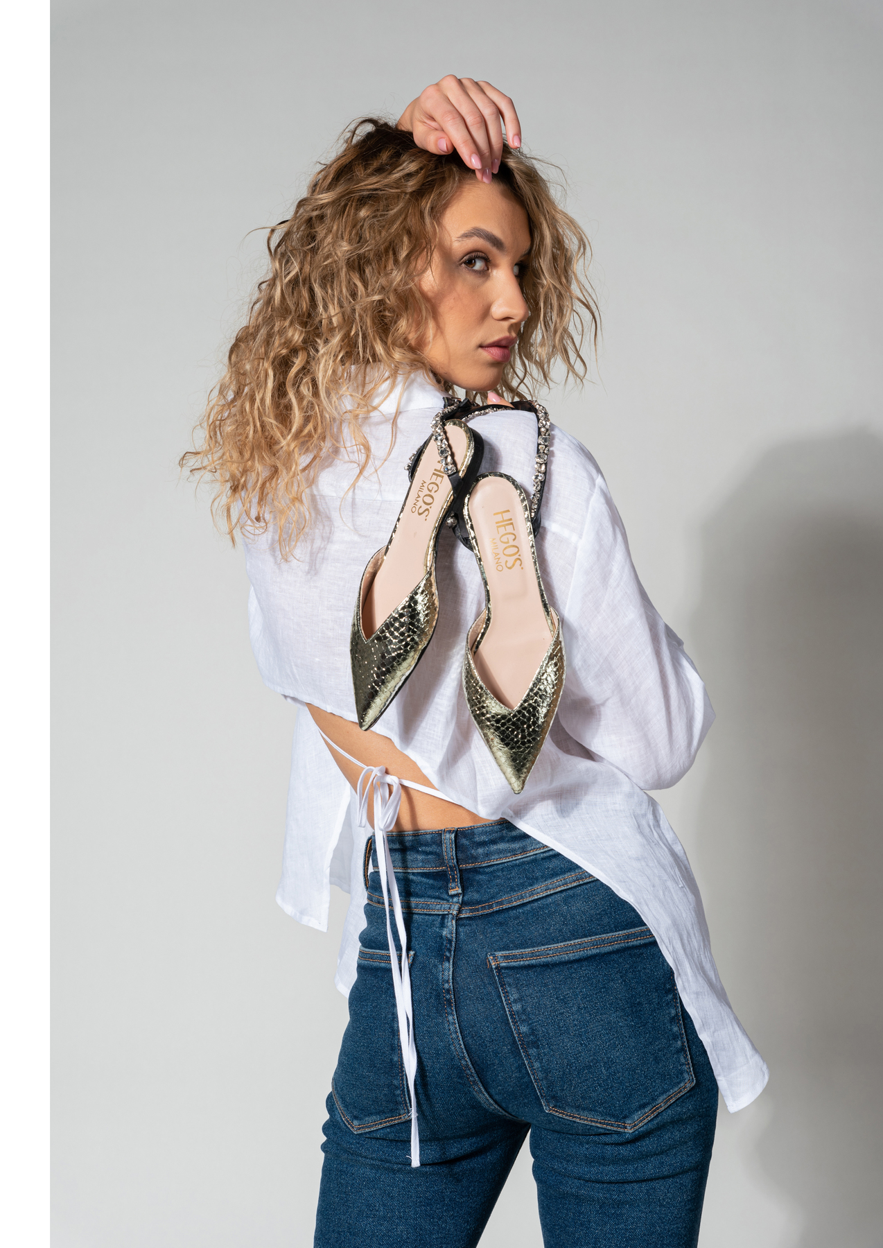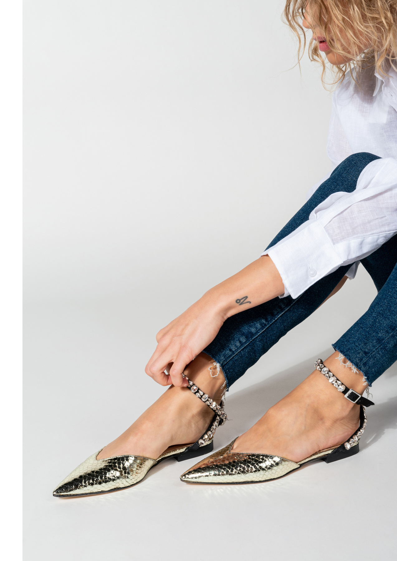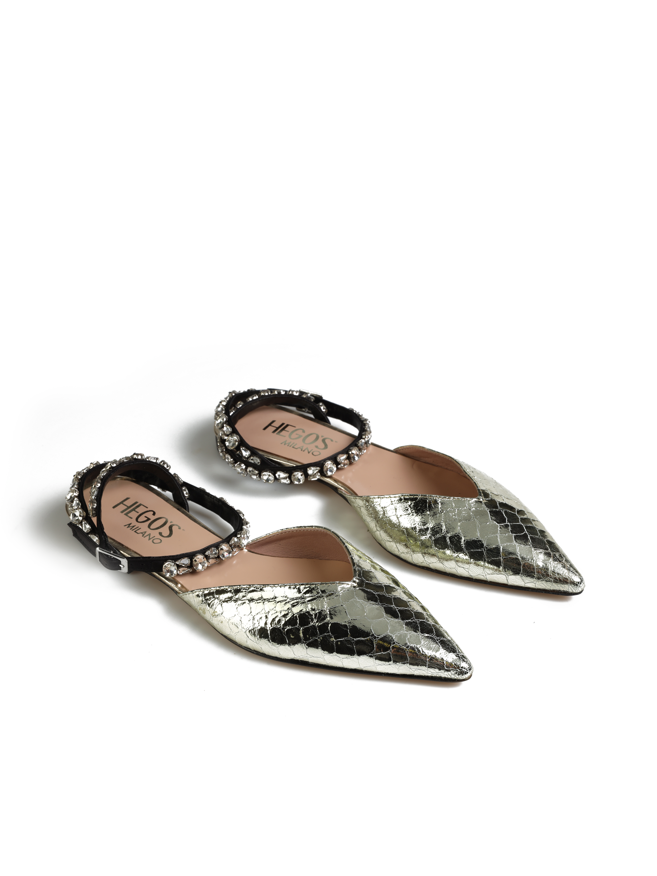Baleriny z odkrytą piętą HEGO'S Milano to prawdziwy italian chic. Wykonane są z włoskiej, naturalnej skóry. Wycięta cholewka pokryta jest połyskującymi łuskami w złotym kolorze. Regulowane zapięcie, zapinane wokół kostki trzyma stopę. Ozdobione zostało efektownymi kamieniami. Nosek w szpic wpisuje się w Trendy sezonu.