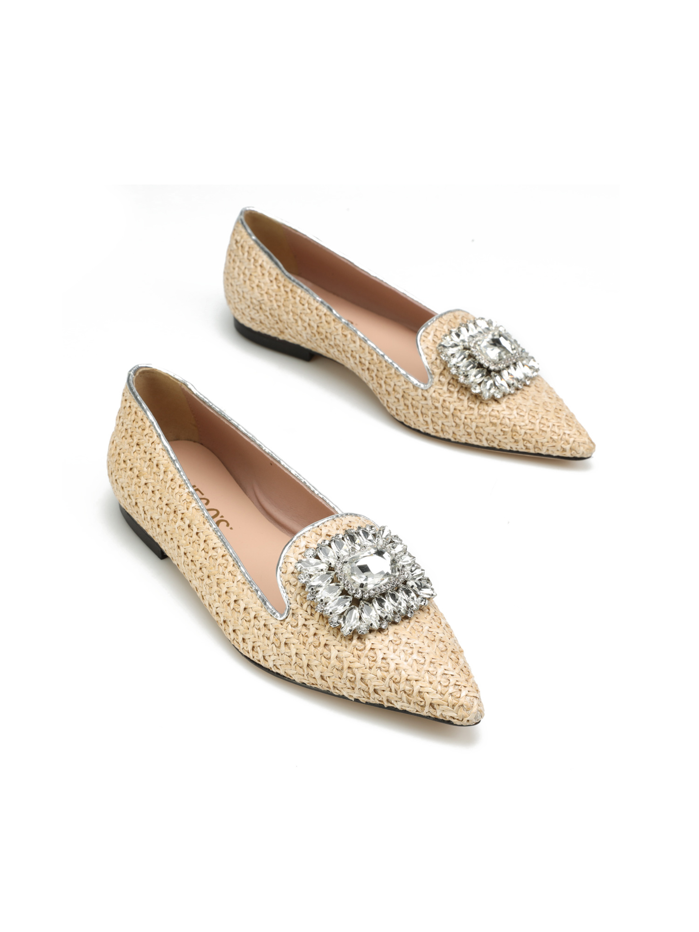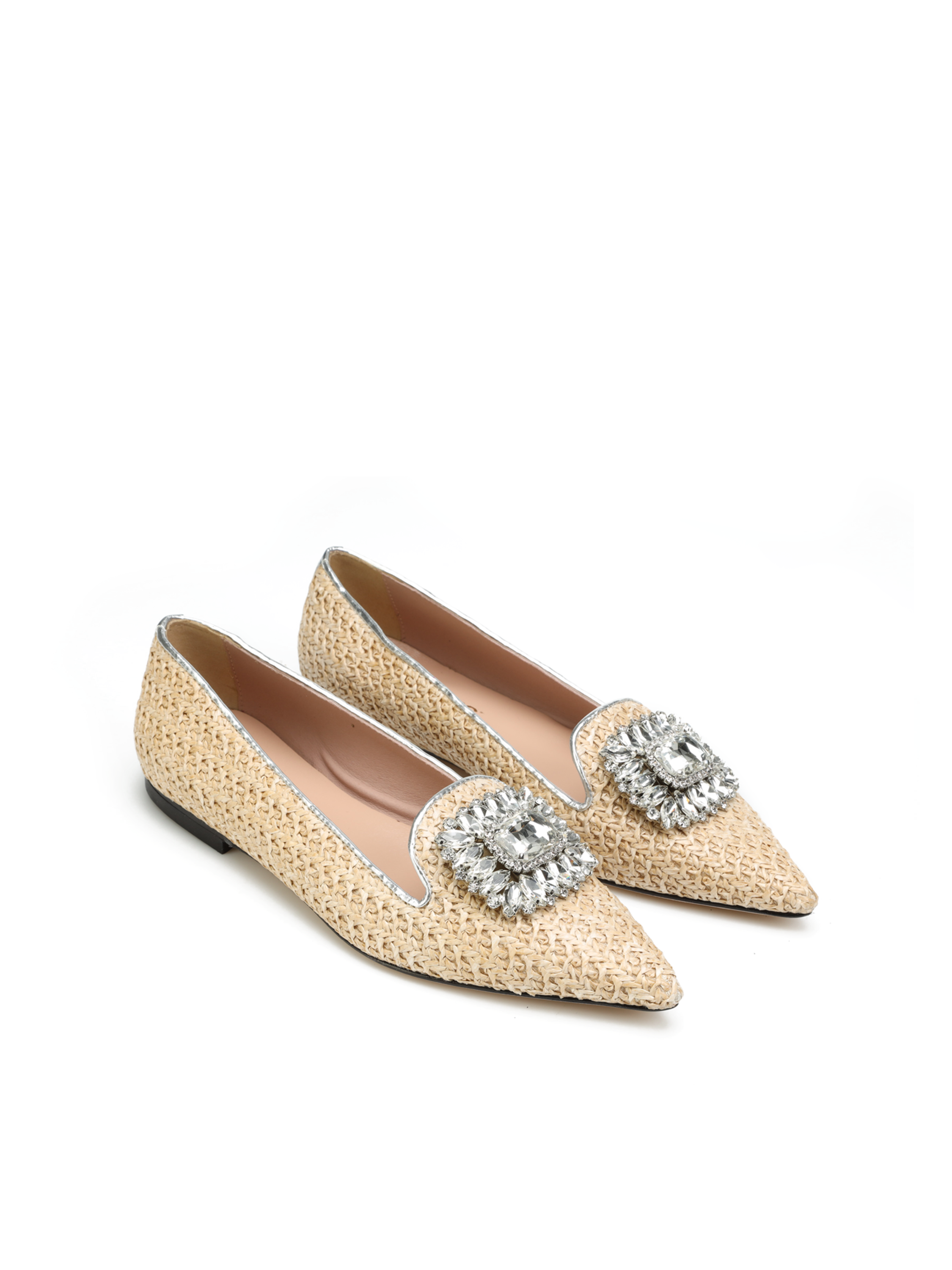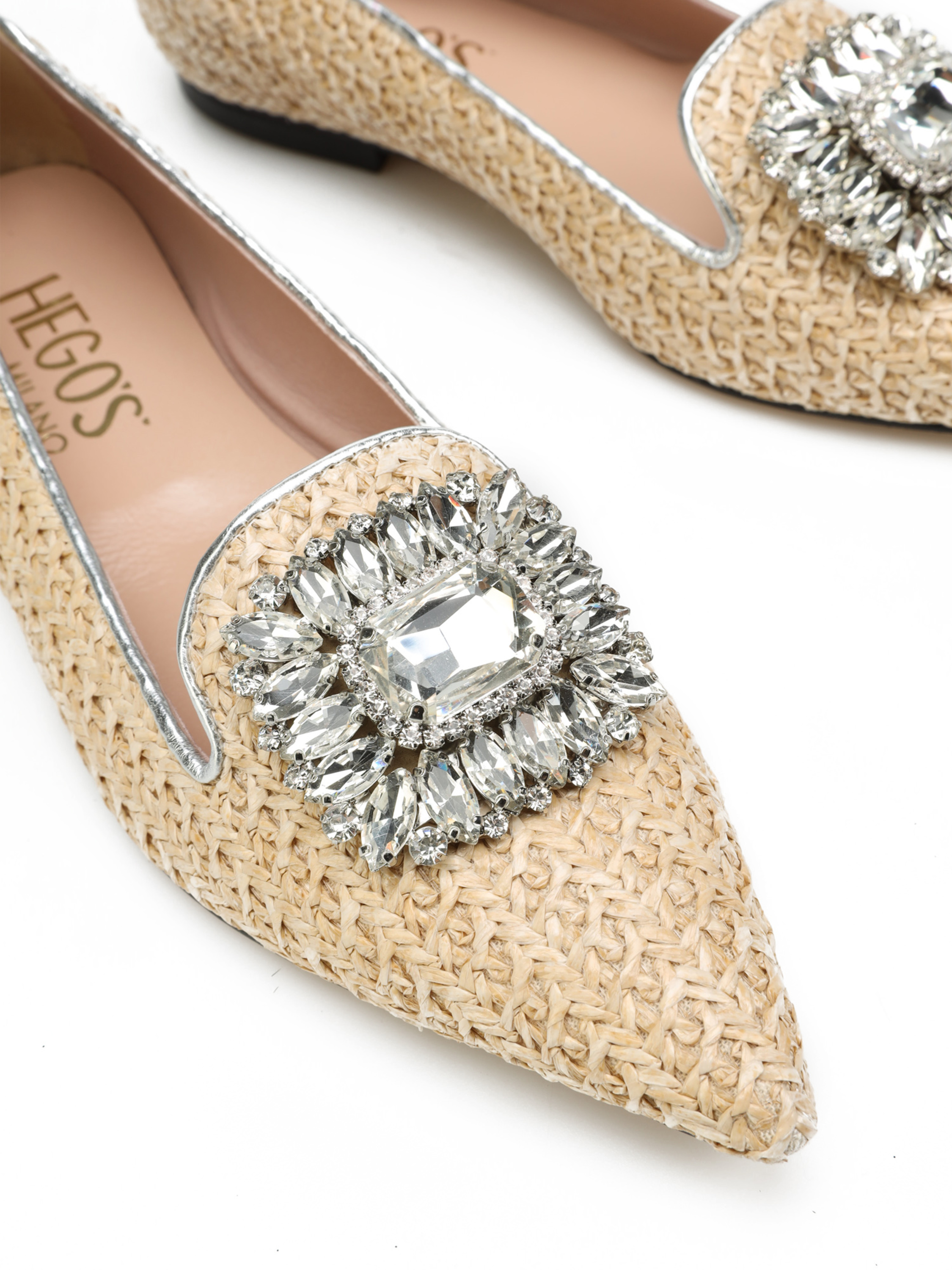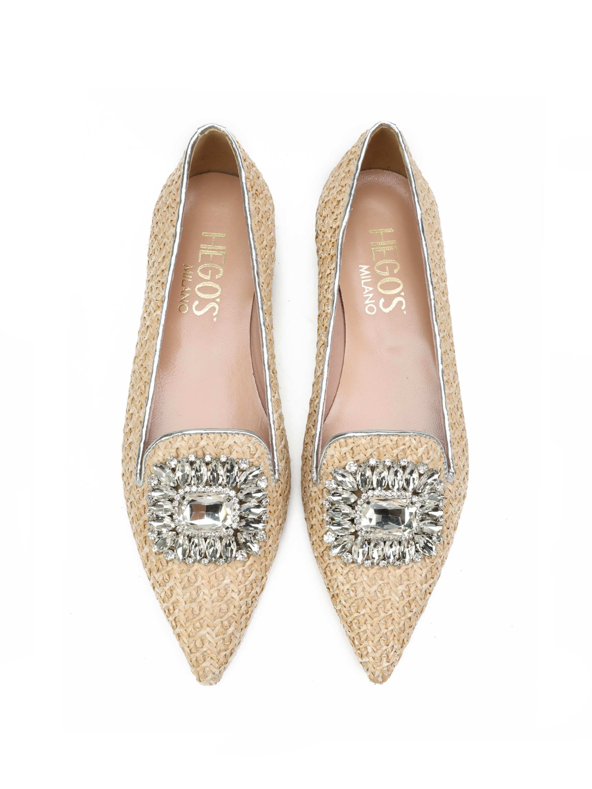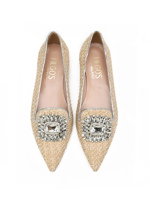 Baleriny w szpic HEGO'S Milano to HOT TREND sezonu. Baleriny z plecionki wykonane z materiały raffia. Miękka wkładka z koziej skóry i płaski obcas odpowiadają  za wygodę i komfort noszenia butów przez cały dzień. Cholewka wzbogacona została o biżuteryjną broszkę z kamieni oraz lamówkę w srebrnym kolorze. Klasyczny fason w naturalnym odcieniu będzie ozdobą i dopełnieniem modnej garderoby kobiety.