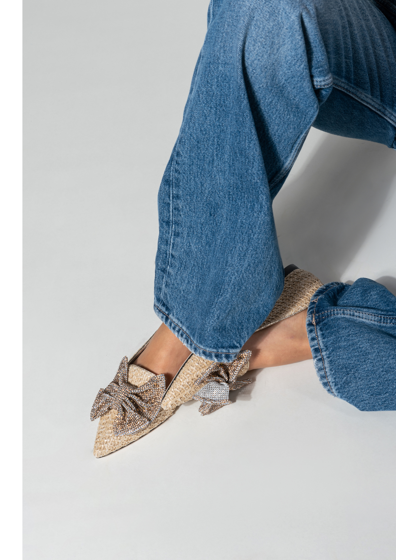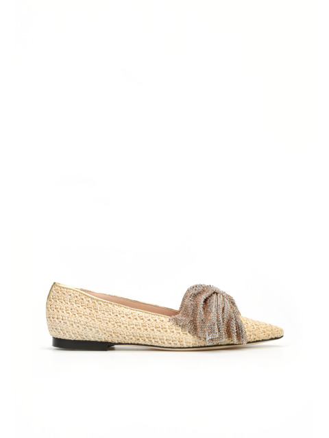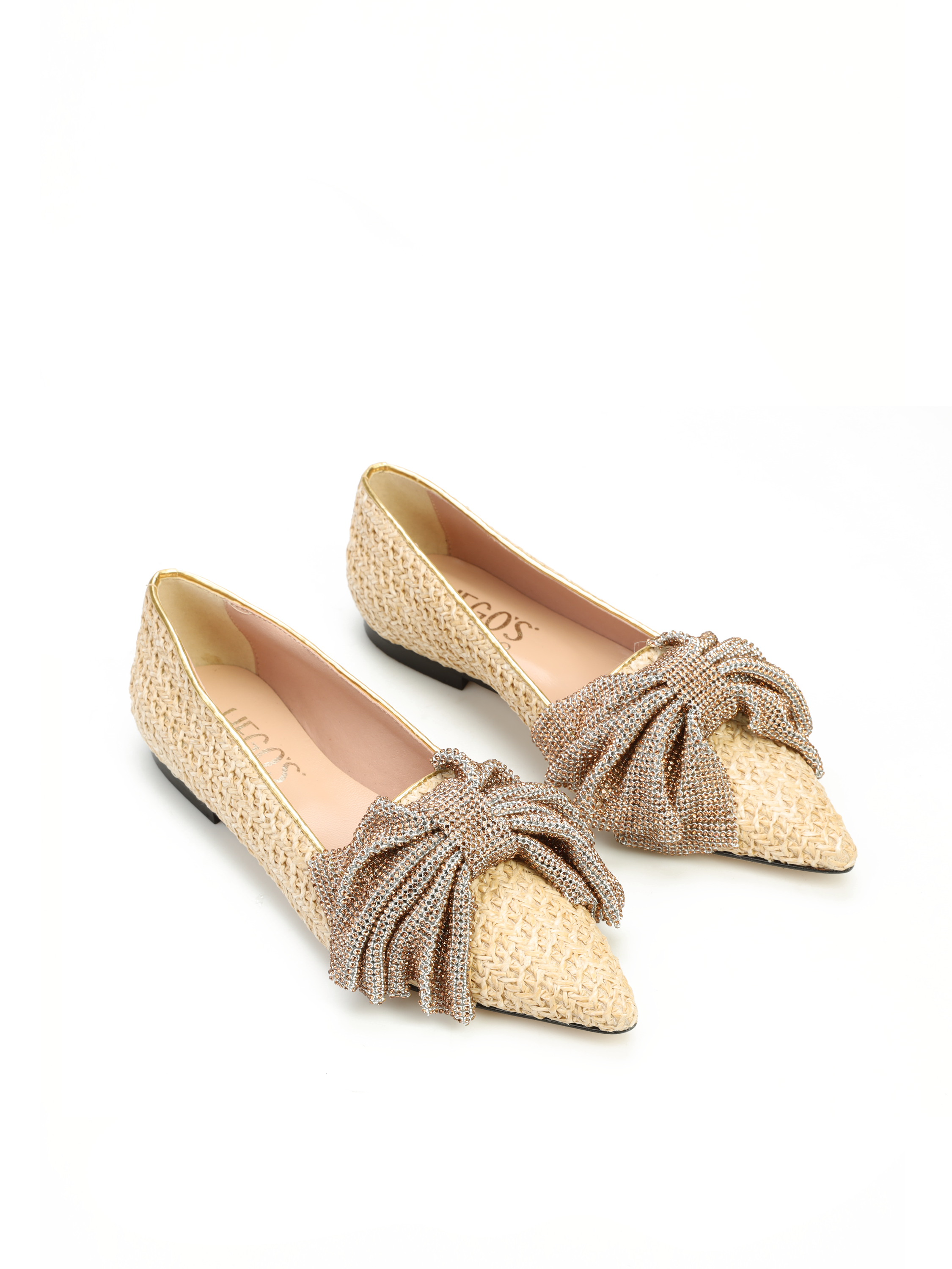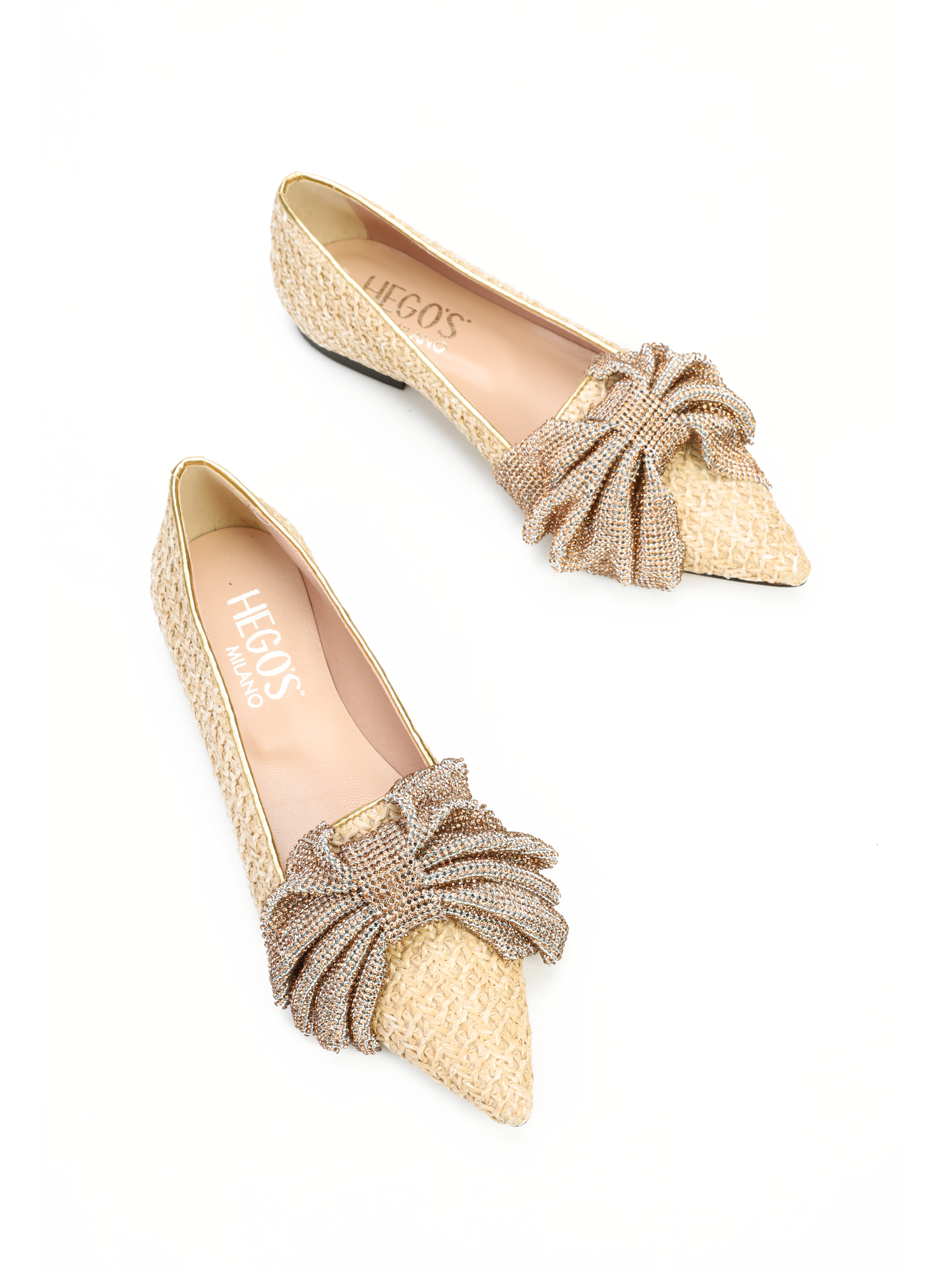 Baleriny w szpic HEGO'S Milano to HOT TREND sezonu. W całości wykonane są z naturalnej skóry. Miękka wkładka z koziej skóry i płaski obcas odpowiadają  za wygodę i komfort noszenia butów przez cały dzień. Cholewka zaprojektowana z naturalnej plecionki wpisuje się w obecne Trendy. Wzbogacona została o biżuteryjną, połyskującą kokardę oraz lamówkę w złotym kolorze. Klasyczny fason w naturalnym odcieniu będzie ozdobą i dopełnieniem modnej garderoby kobiety.