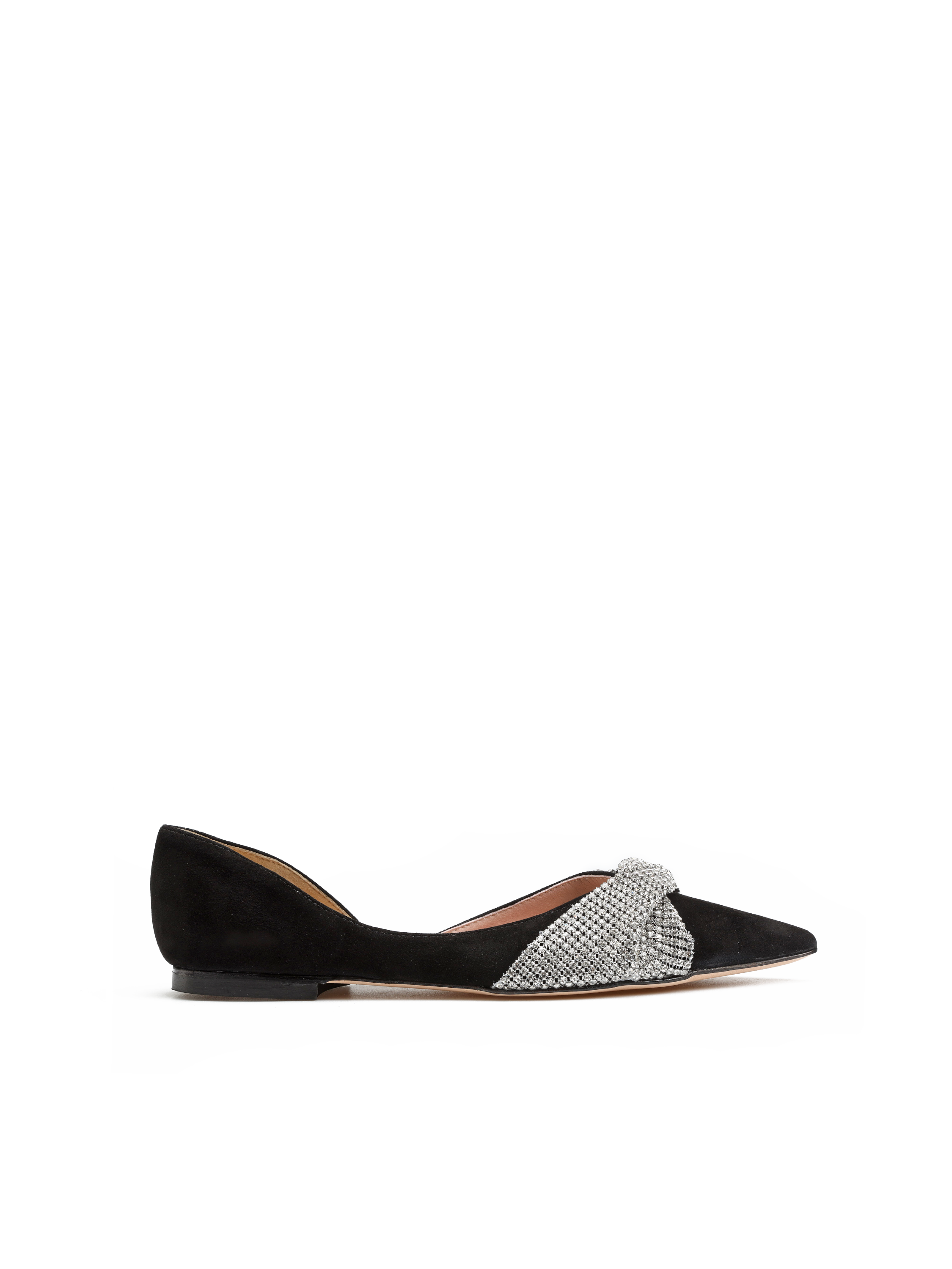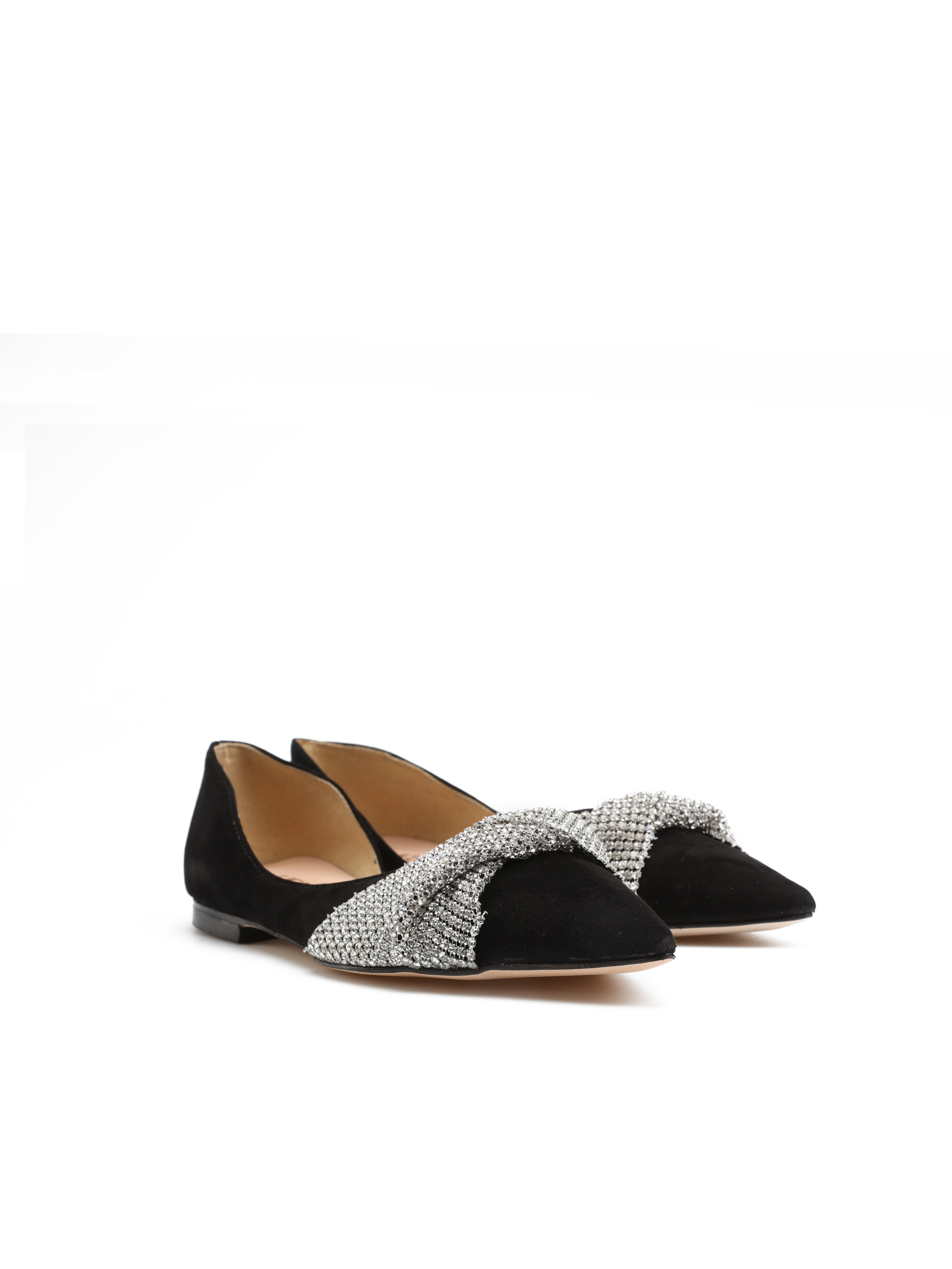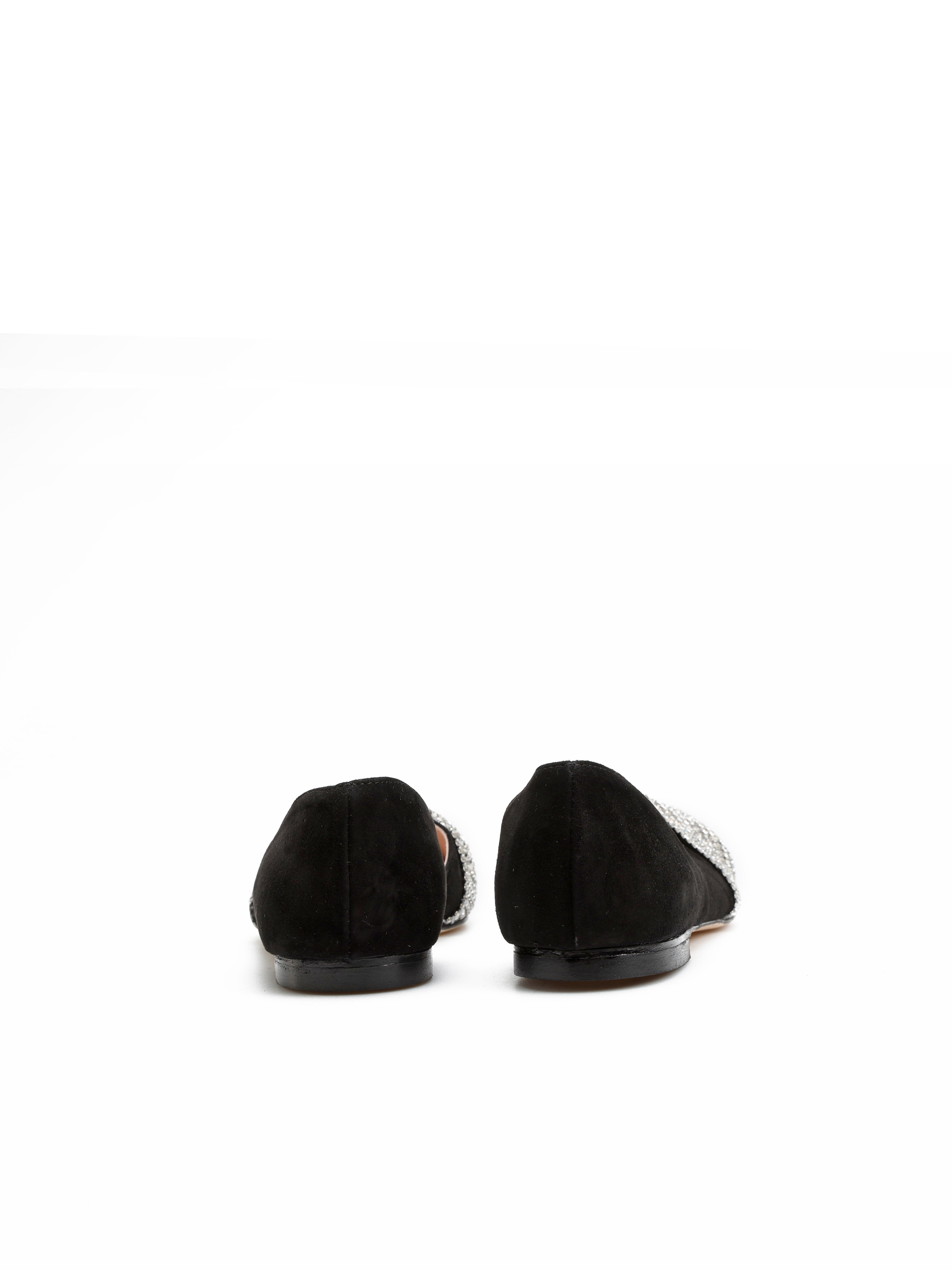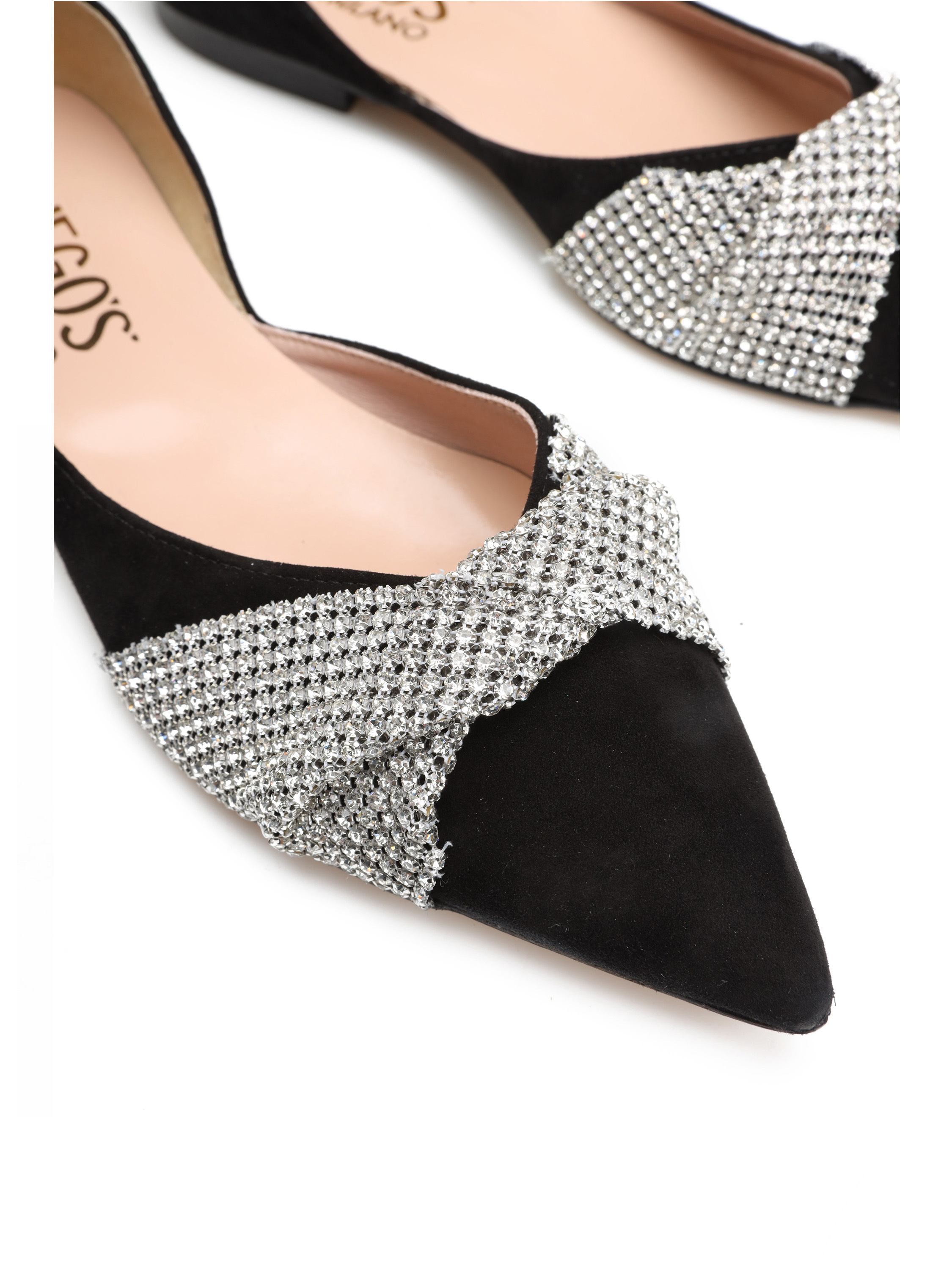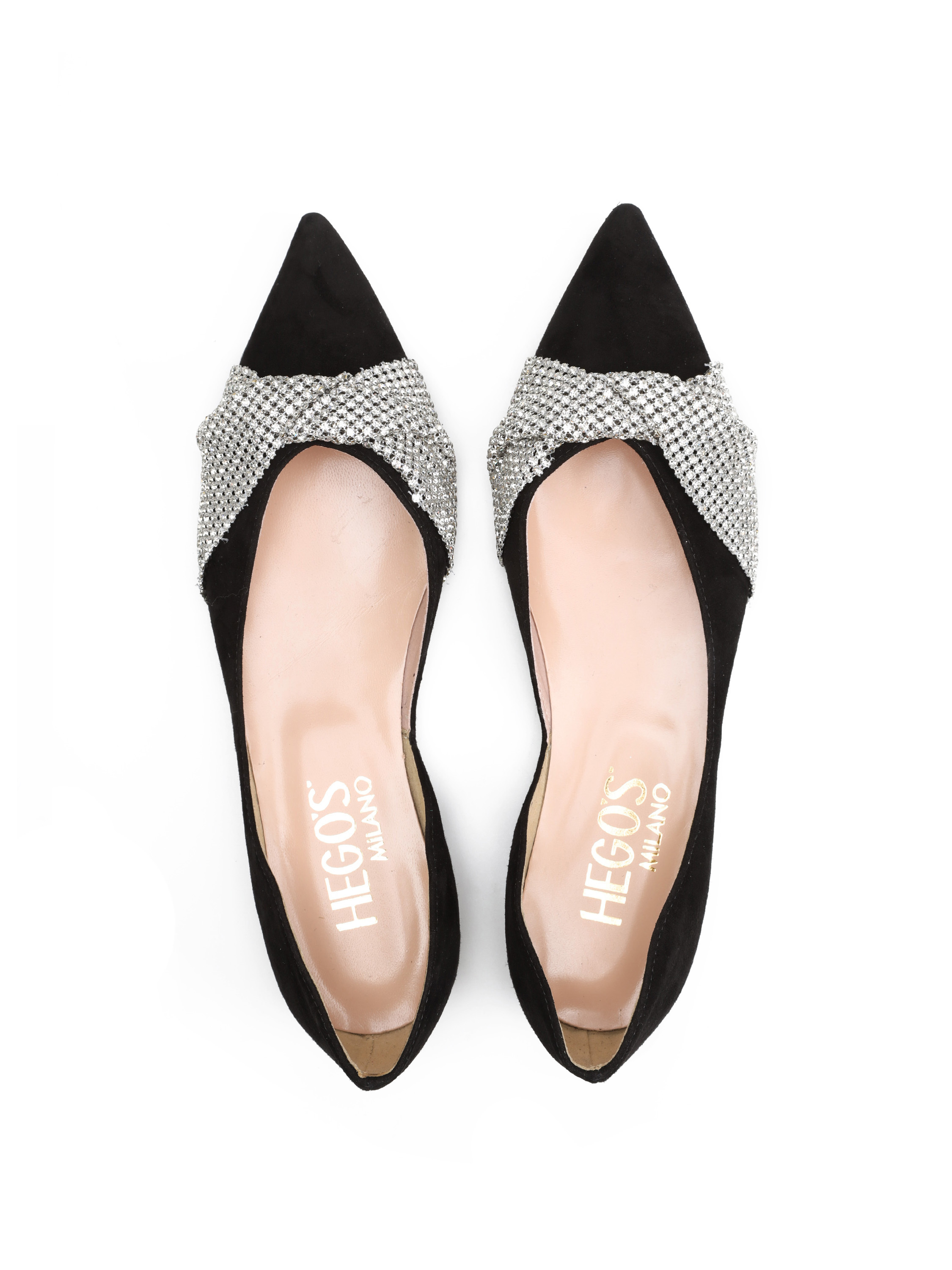 Baleriny na płaskim obcasie HEGO'S Milano to TOP Trend sezonu. Wykonane są z naturalnej skóry zamszowej. Miękka, skórzana wkładka i płaski obcas odpowiadają za wygodę i komfort noszenia butów przez cały dzień. Cholewka wzbogacona została o biżuteryjną, połyskującą kokardę. Nosek w szpic wpisuje się nie tylko w obecne Trendy. Klasyczny fason w ponadczasowym, czarnym kolorze będzie ozdobą i dopełnieniem modnej garderoby kobiety.