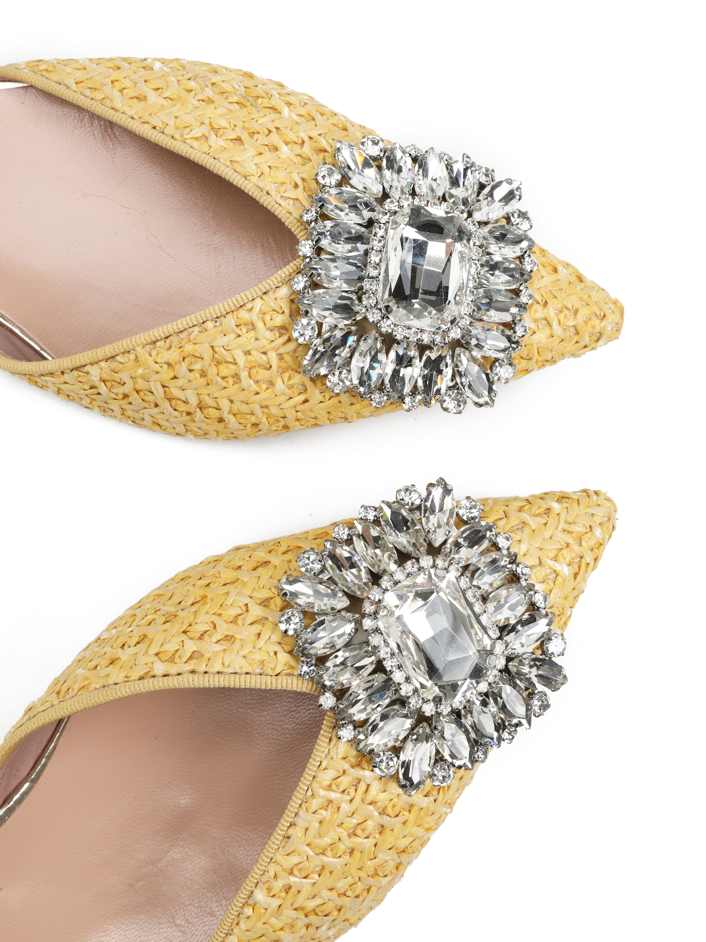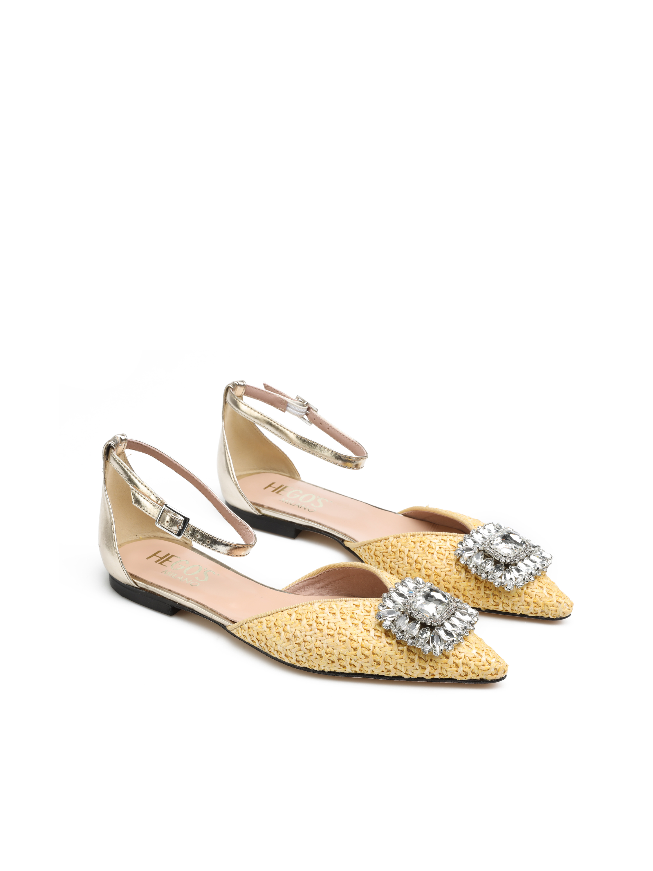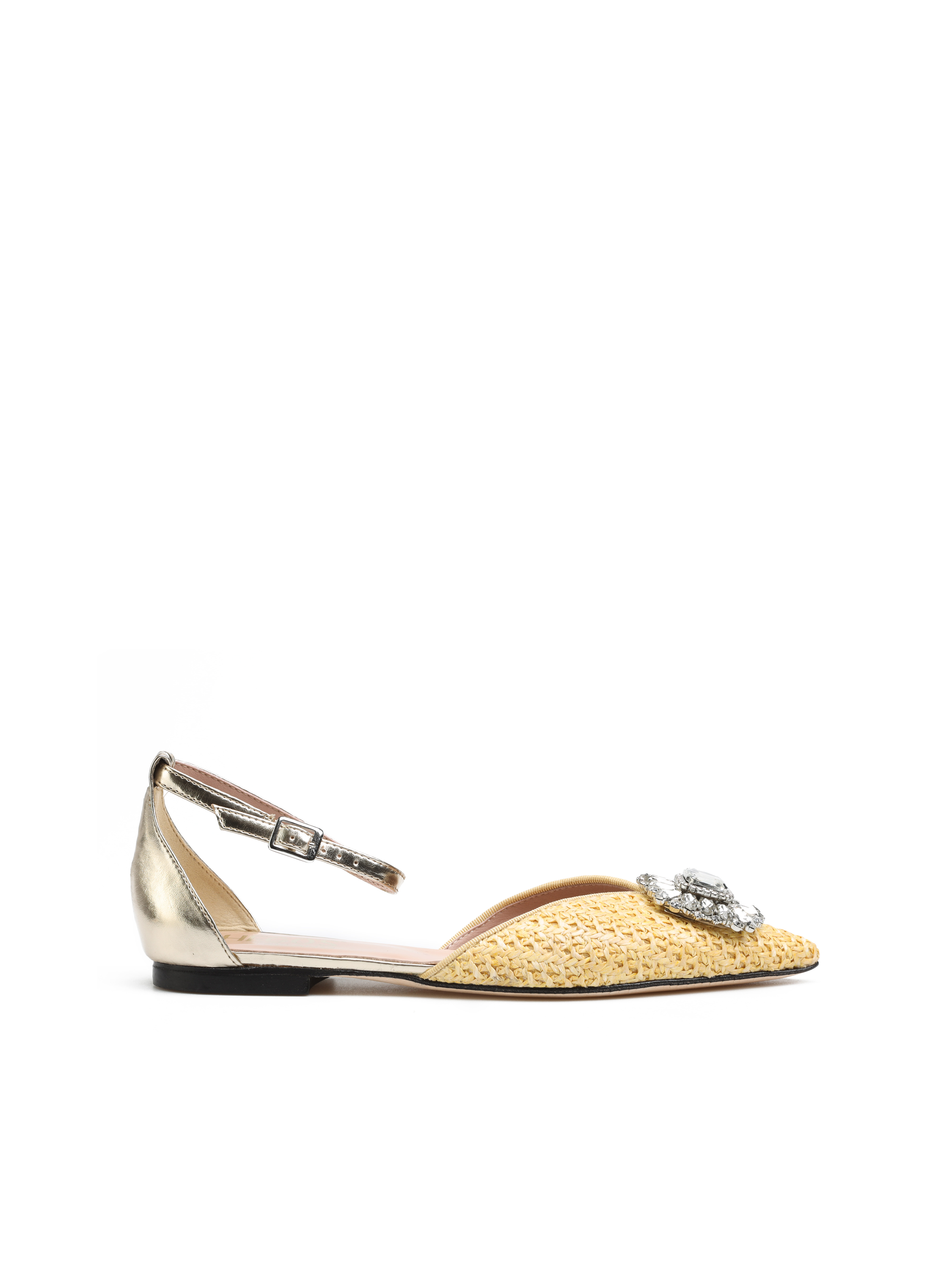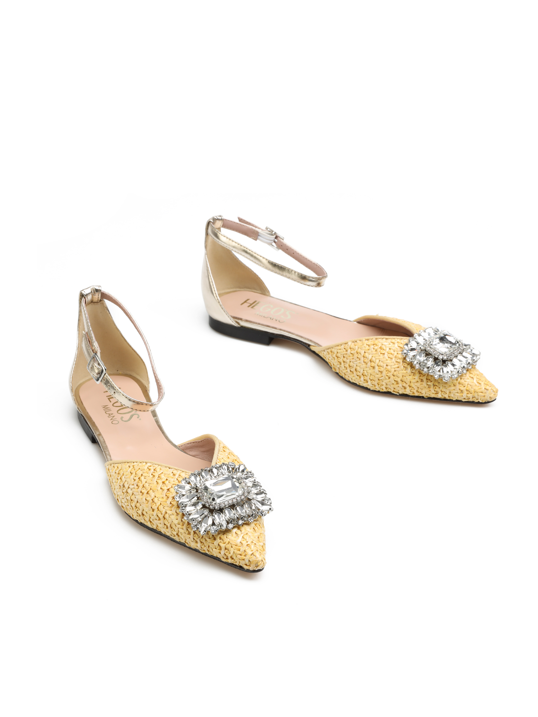 Baleriny w szpic to HOT TREND sezonu. Wykonane są z naturalnej skóry. Miękka wkładka z koziej skóry i płaski obcas odpowiadają  za wygodę i komfort noszenia butów. Model zapinany regulowanym paskiem na sprzączką. Cholewka zaprojektowana z naturalnej plecionki wpisuje się w obecne Trendy. Wzbogacona została o biżuteryjną broszkę z kamieni.