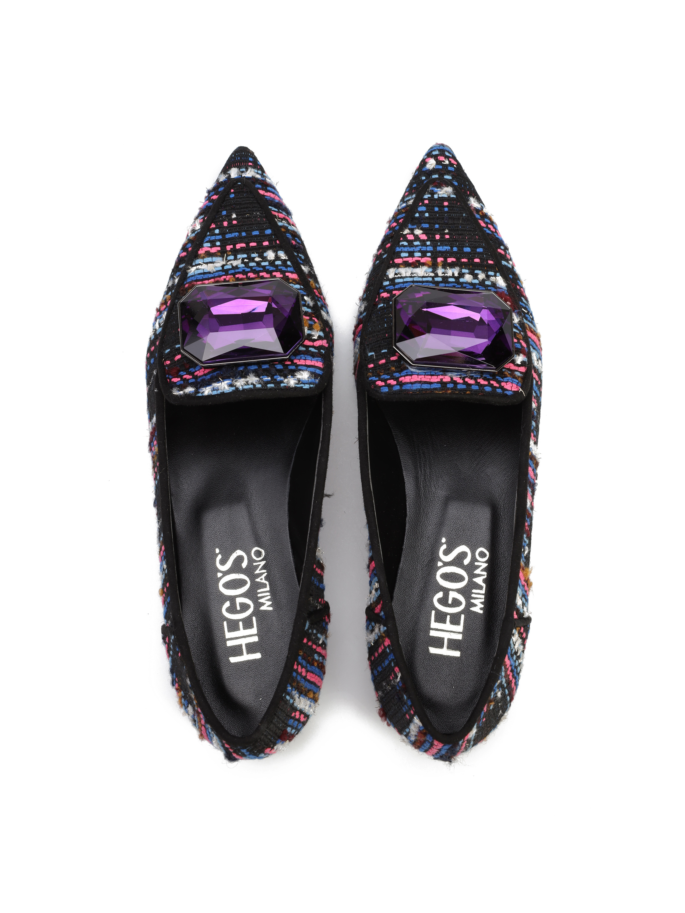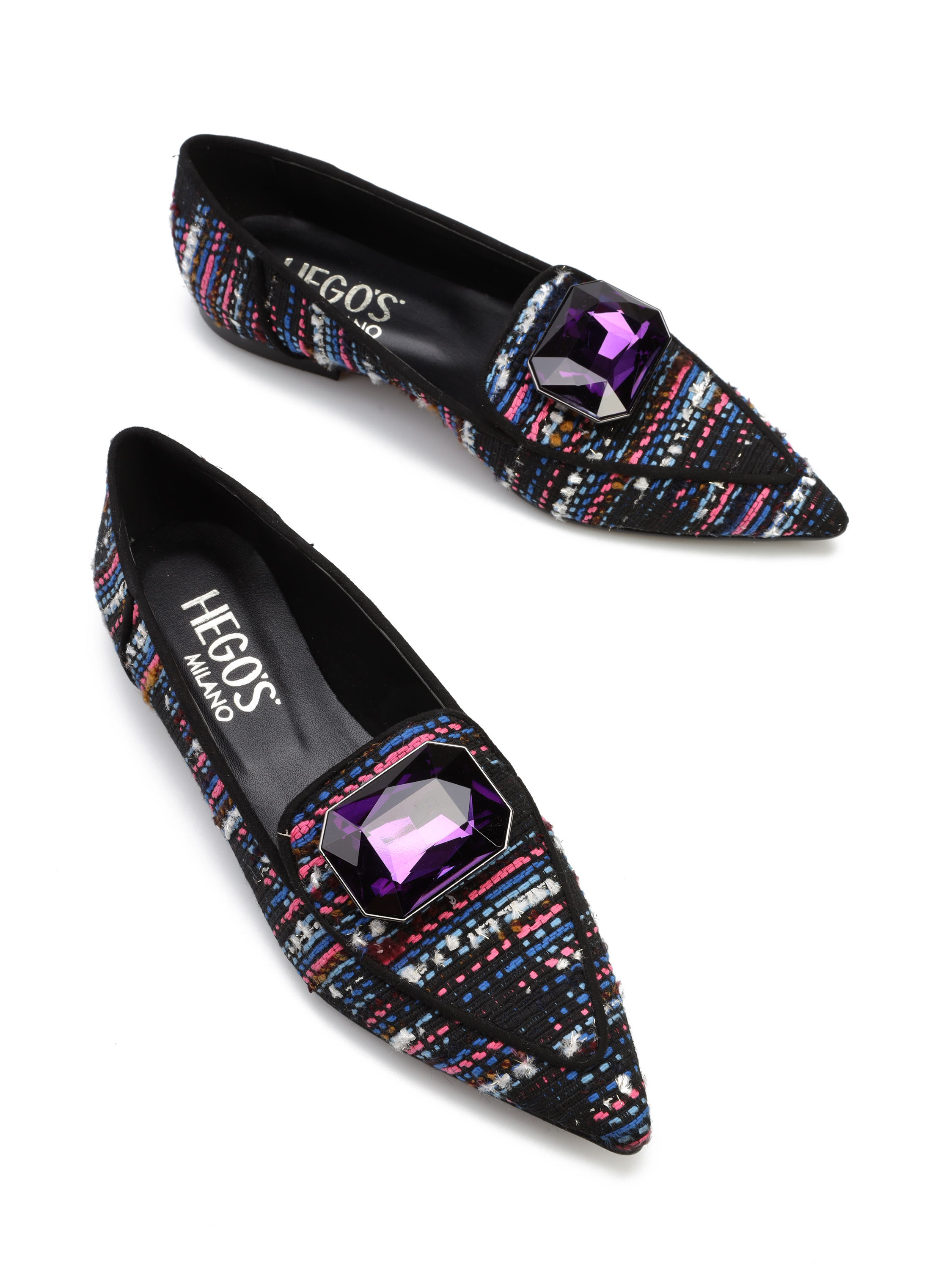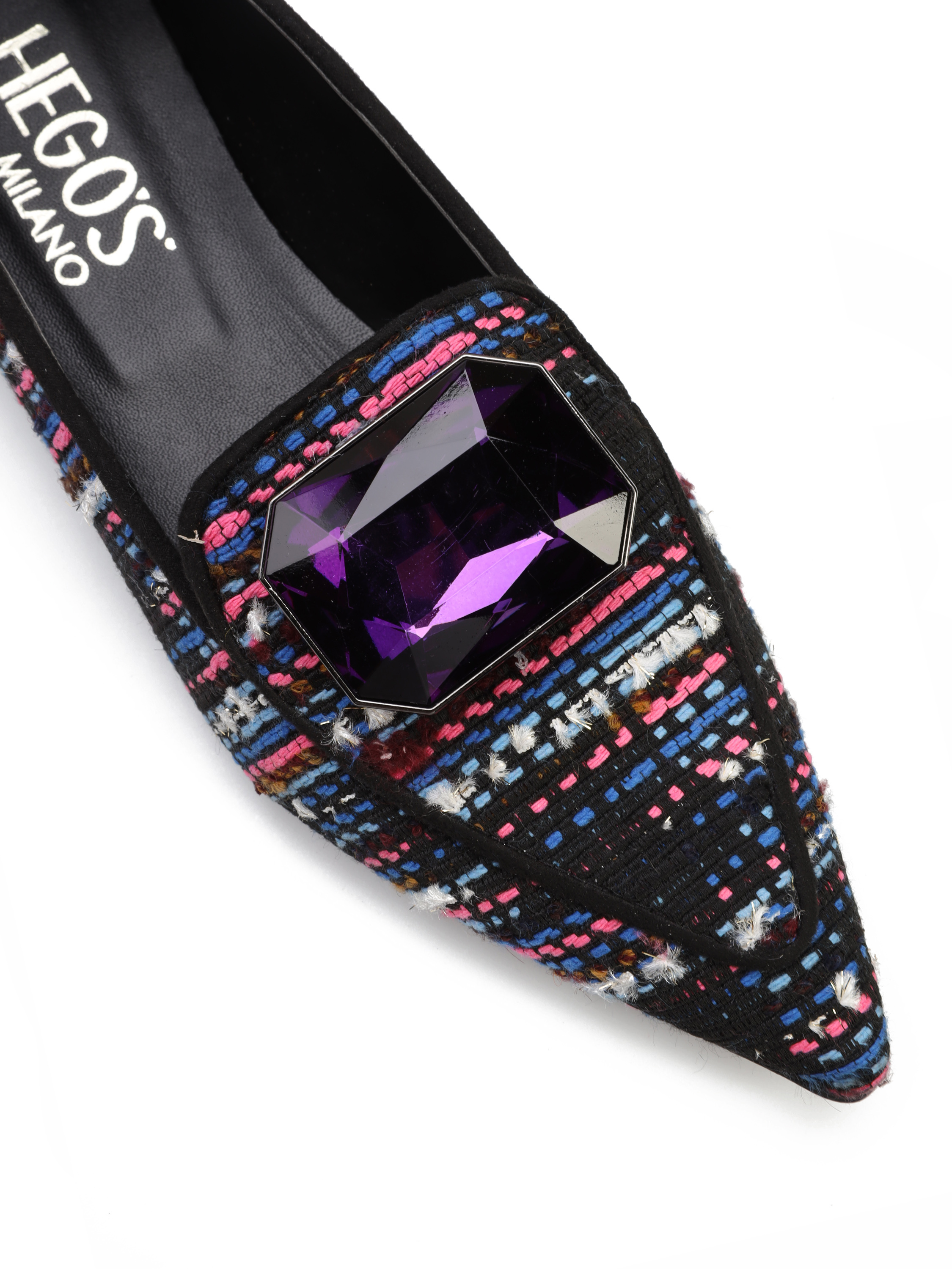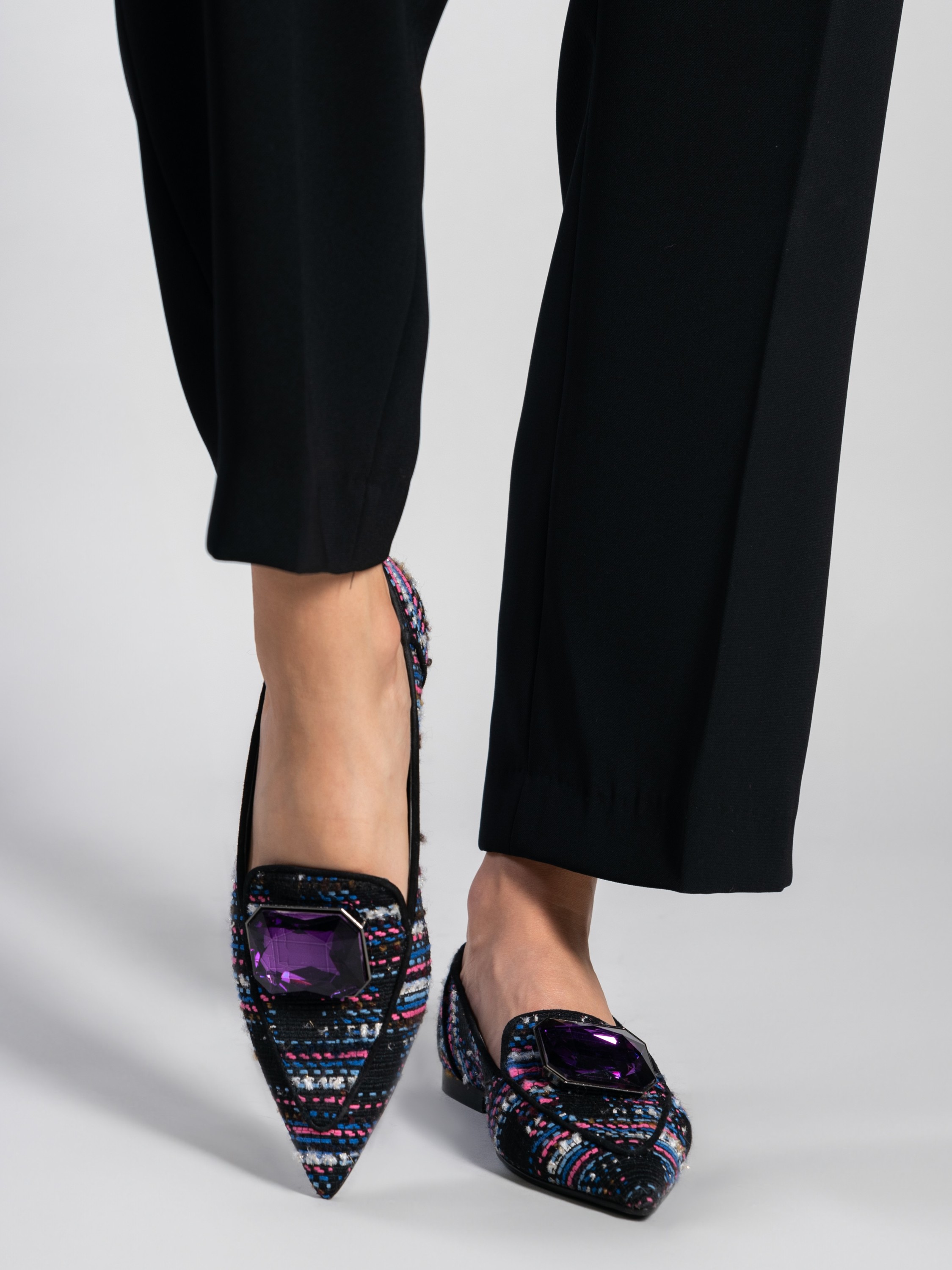 Baleriny w szpic to gorący Trend sezonu. Cholewka z kolorowej takniny uzupełniona została elegancką broszkę z kamienia. Model posiada wysoki język. Wnętrze wykonane jest z naturalnej skóry. Baleriny damskie będą ozdobą modnej garderoby kobiety.
