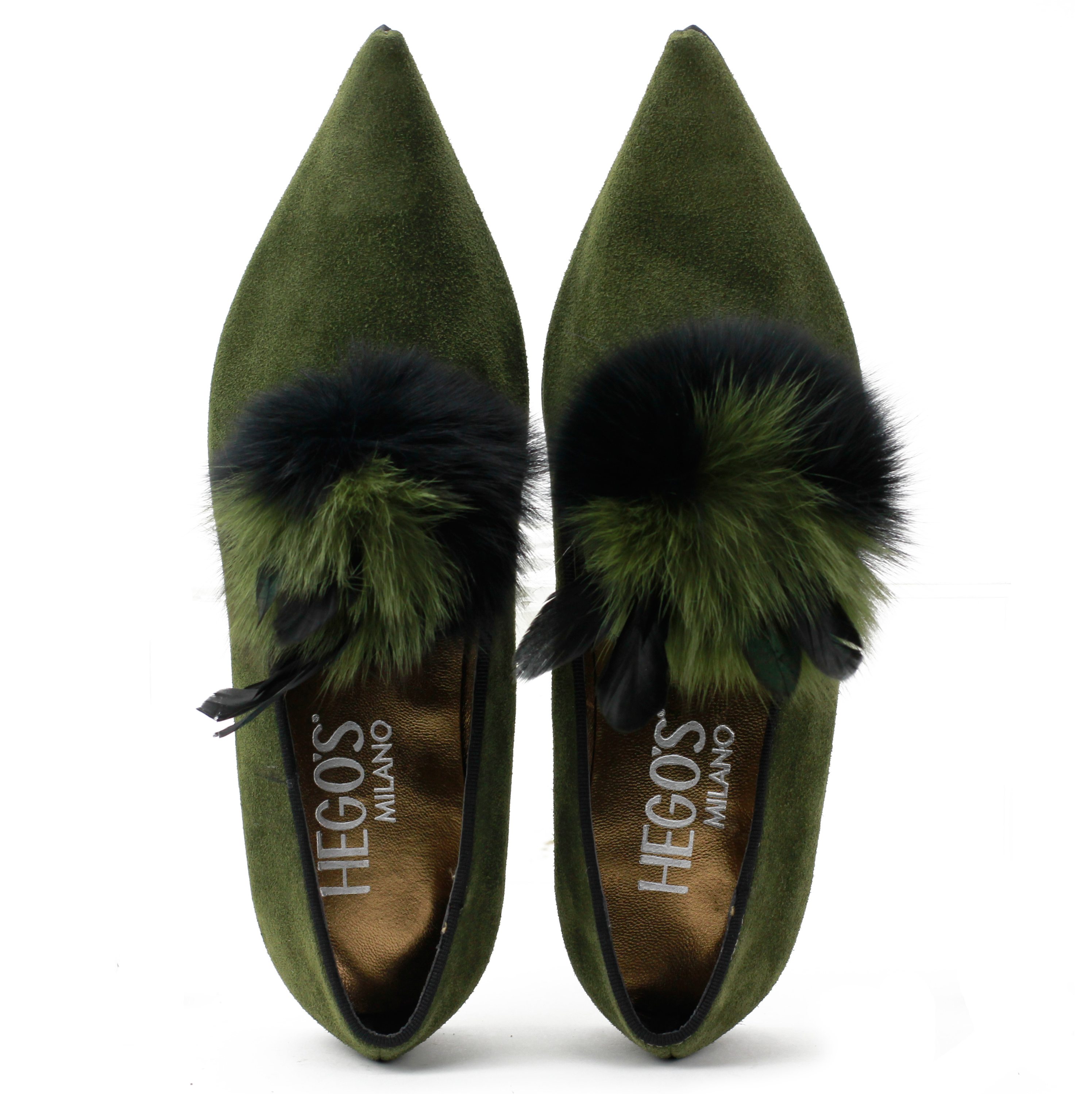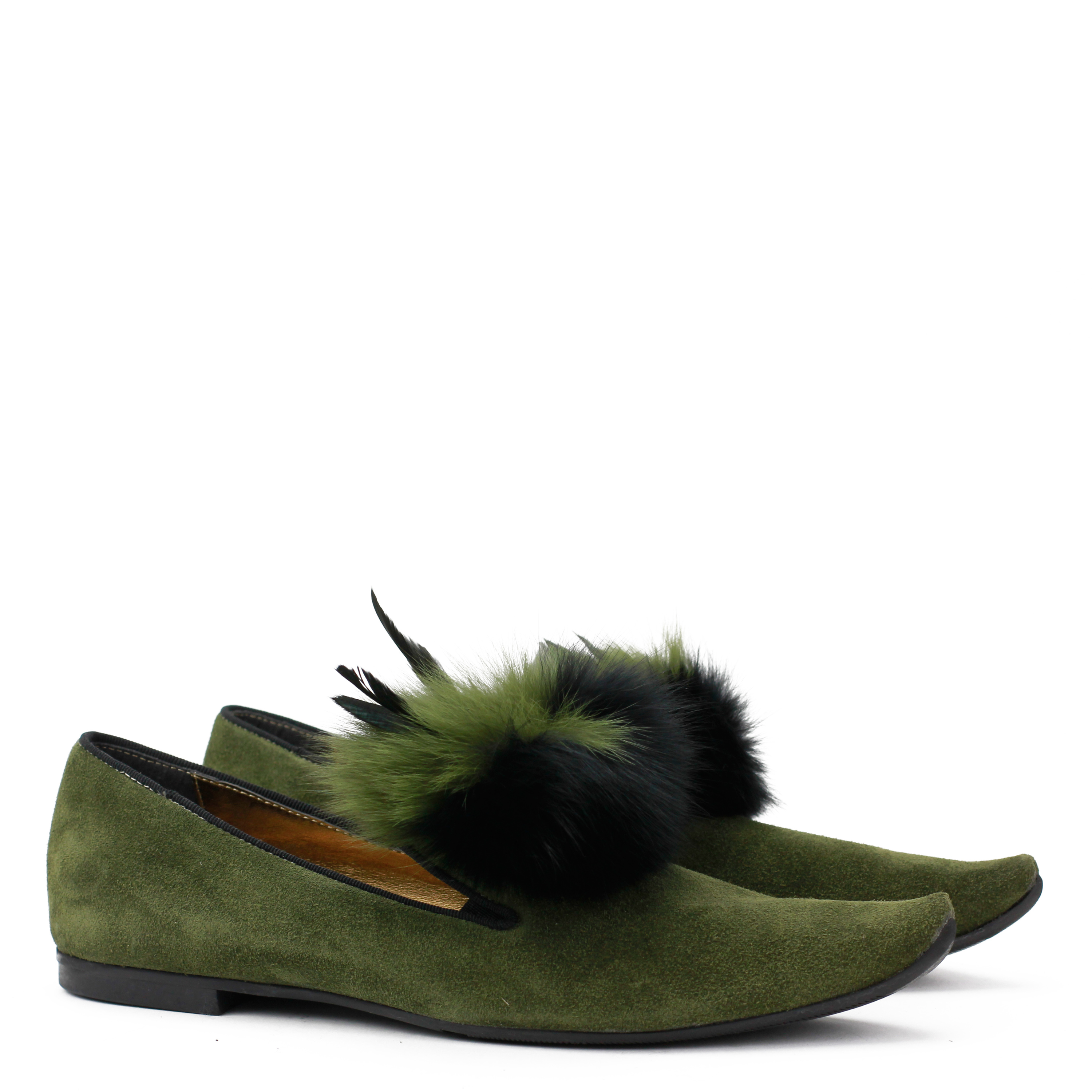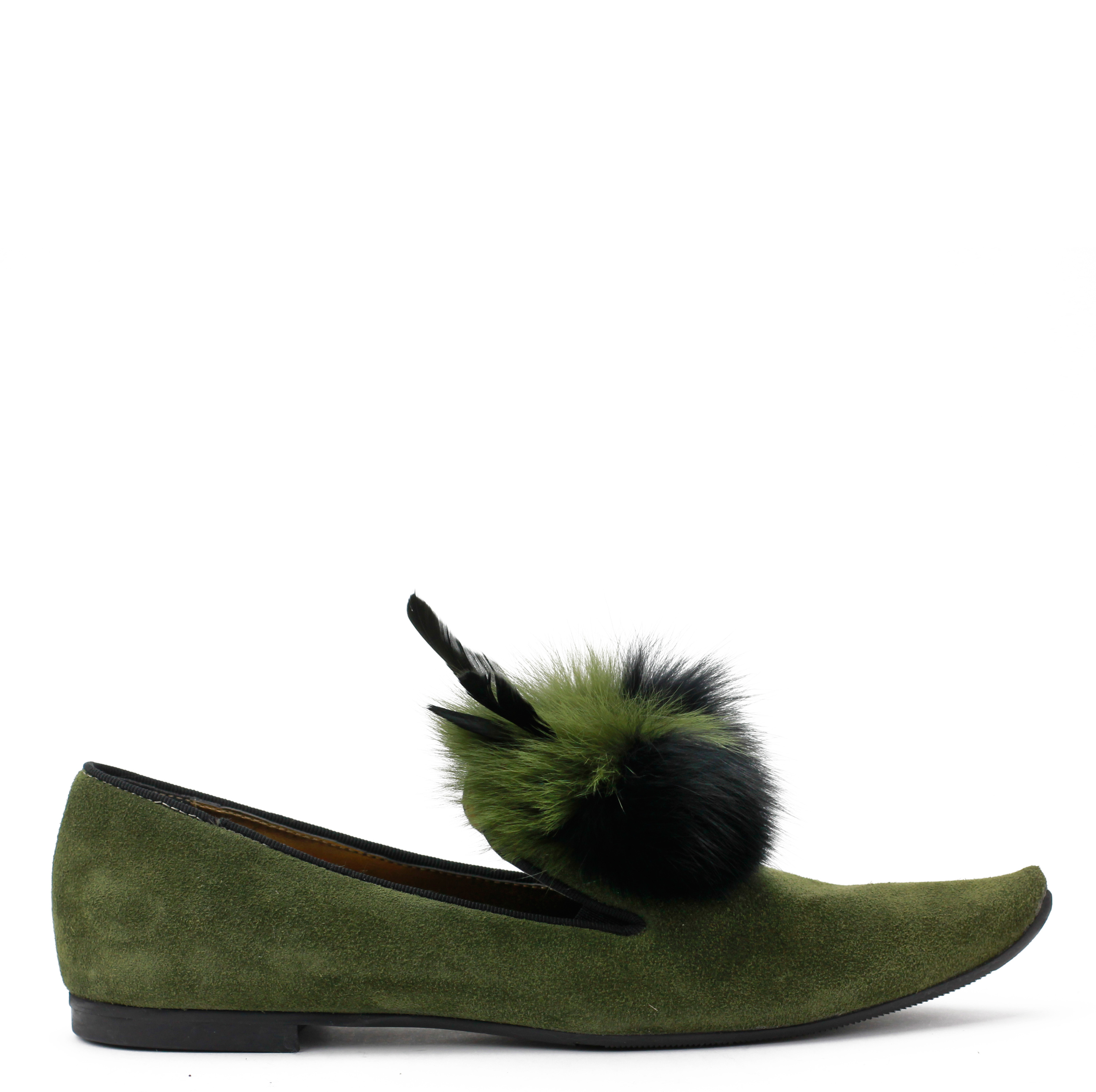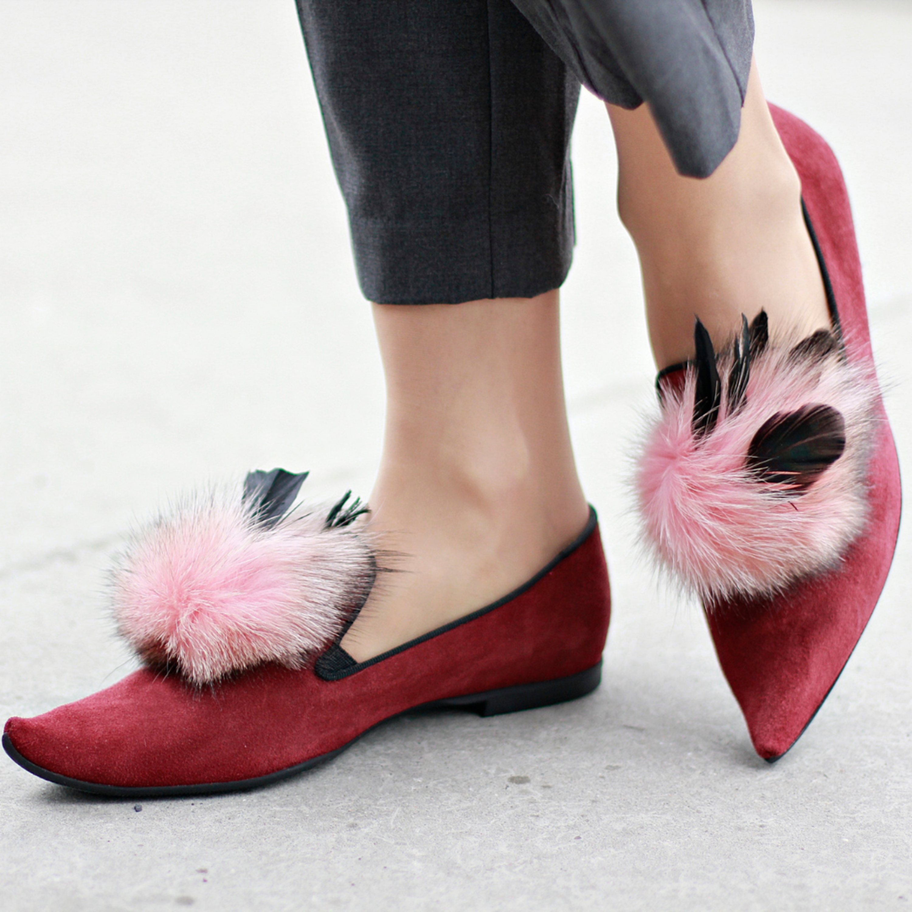Niezwykle unikatowe baleriny obok których nikt nie przejdzie obojętnie to idealna propozycja dla każdej, odważnej kobiety ceniącej sobie styl oraz wygodę. Zamszowa cholewka w połączeniu ze skórzanym wnętrzem gwarantuje komfort przez wiele godzin na nogach. Swój niepowtarzalny design zawdzięczają lekko uniesionemu noskowi w szpic oraz puszystej ozdobie. Dodadzą elegancji i szyku każdej stylizacji.
