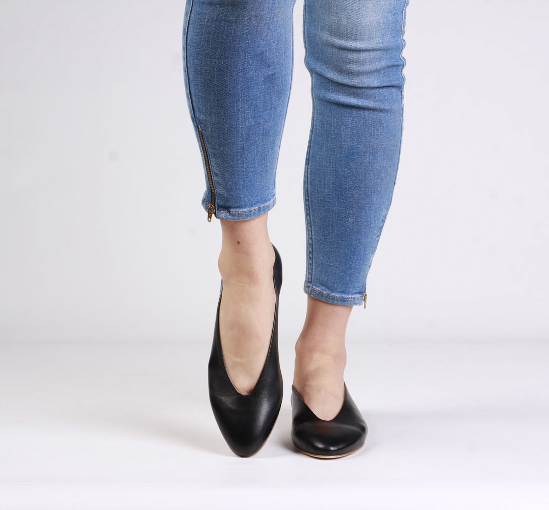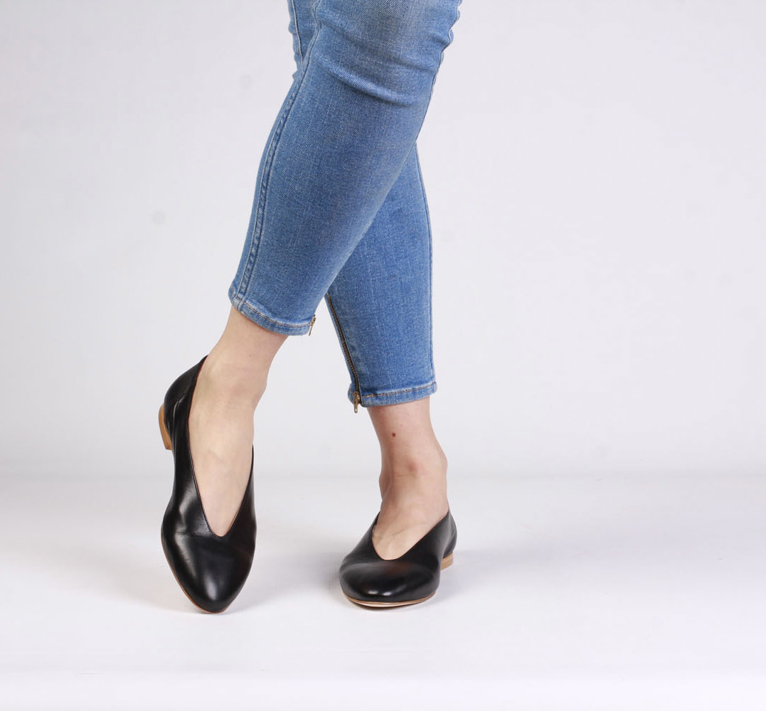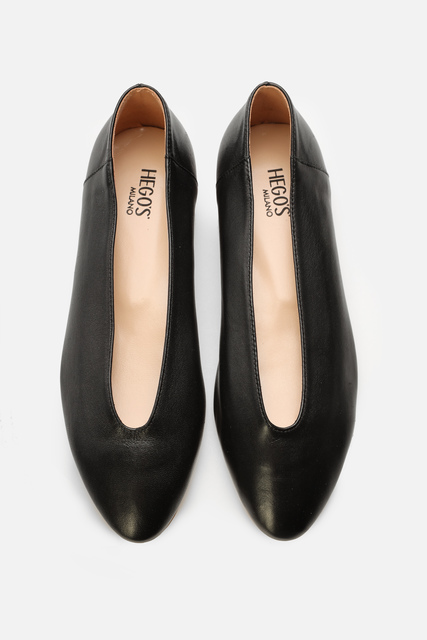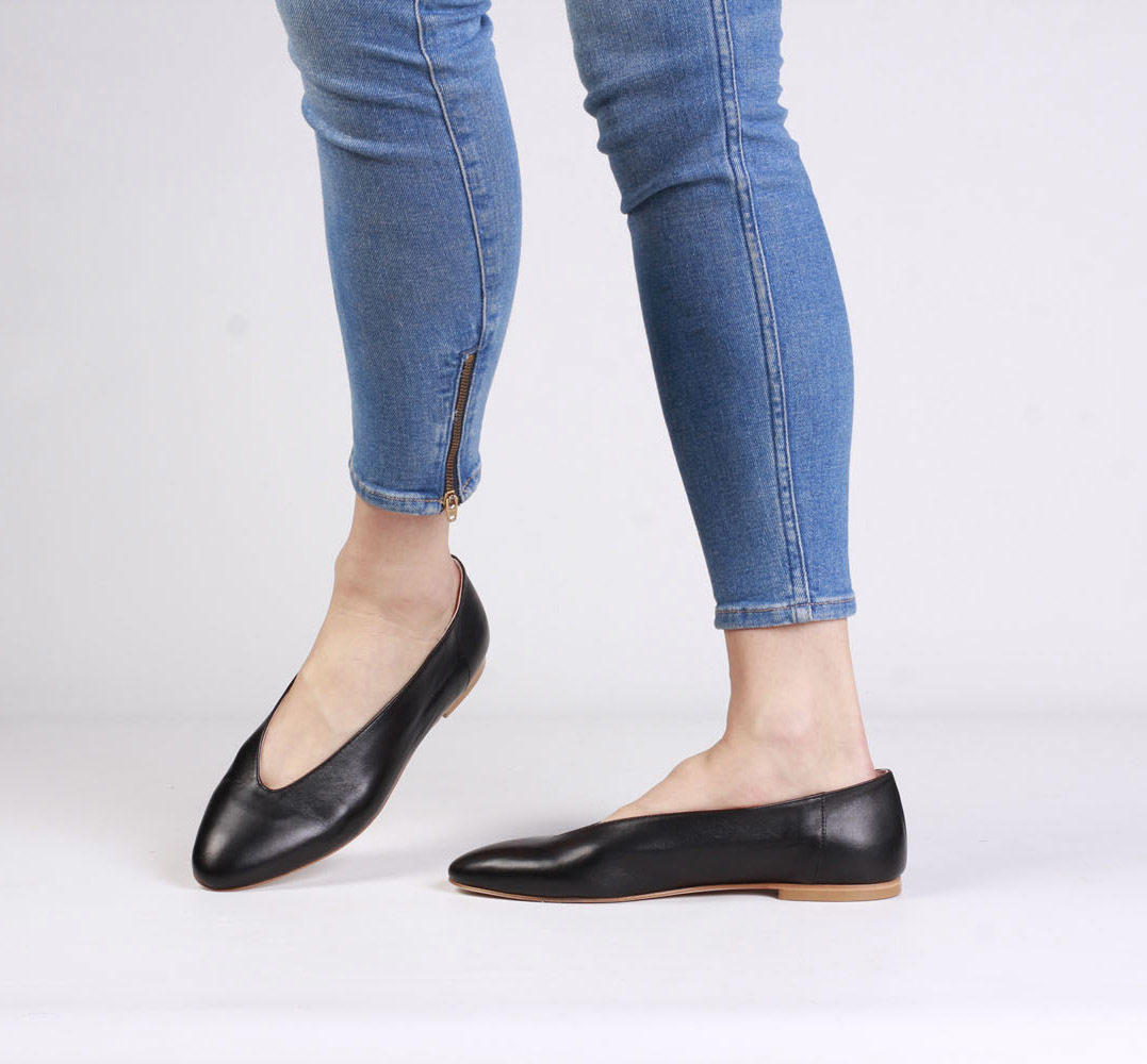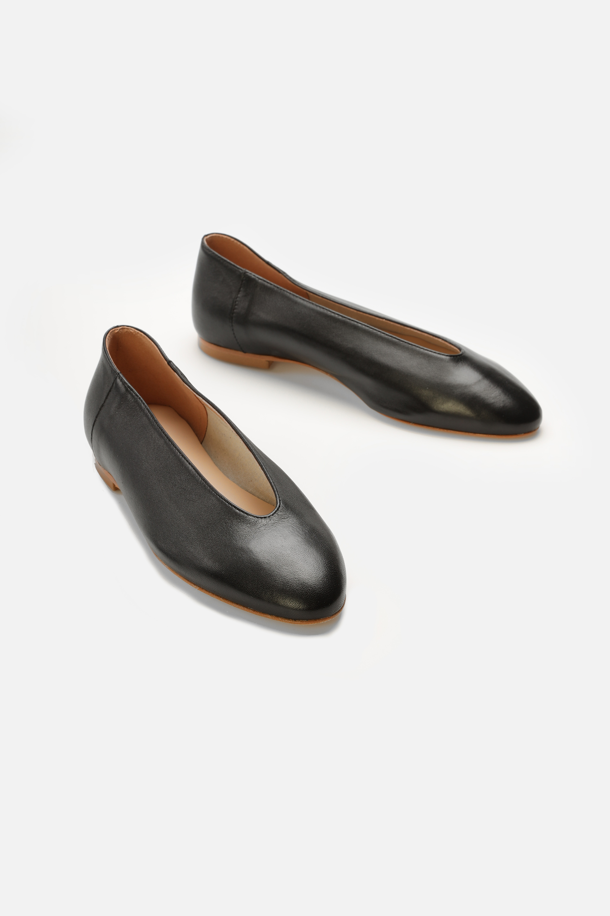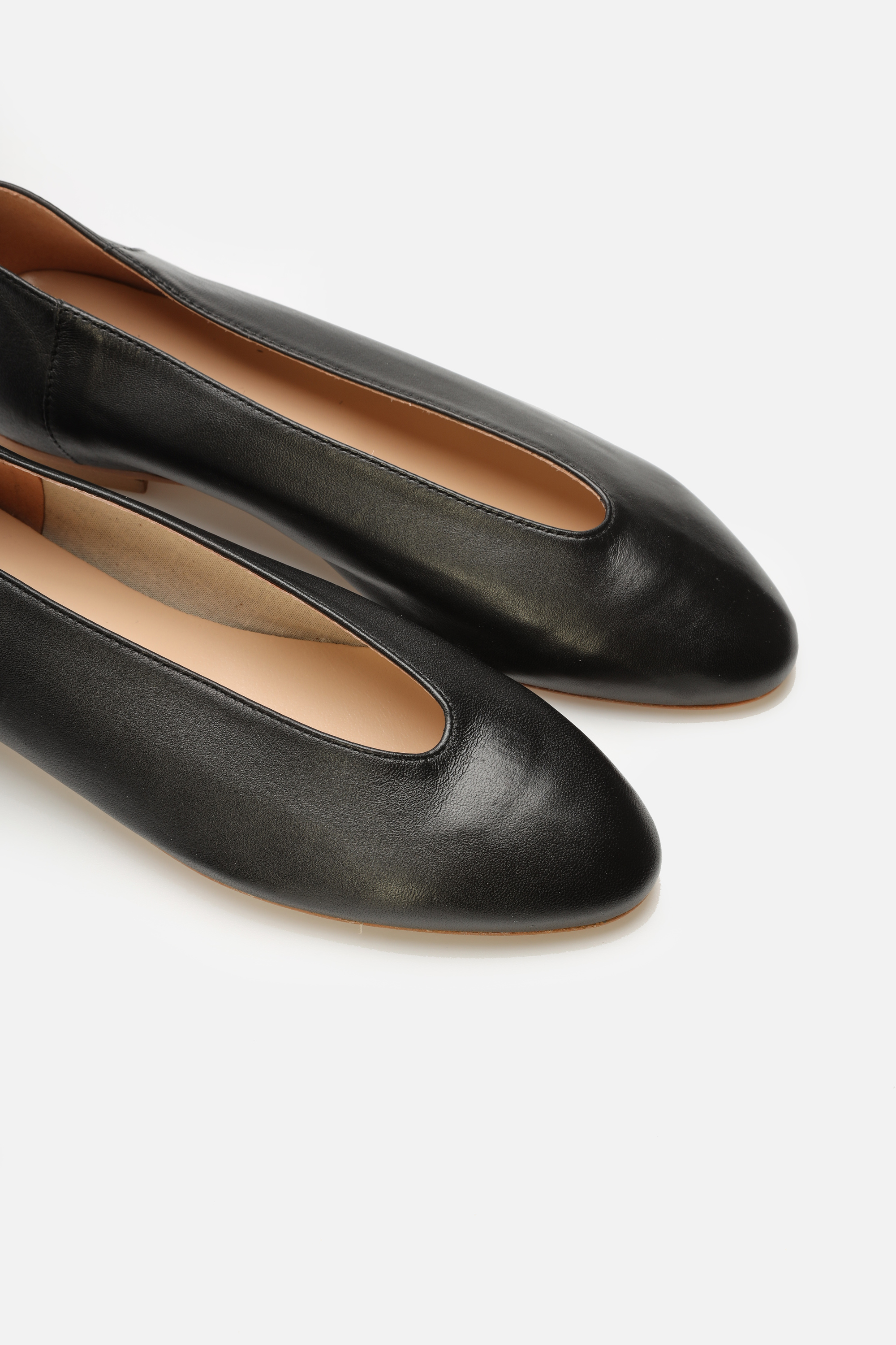Czarne,gładkie baleriny wykonane w całości z miękkiej ,naturalnej skóry nappa.Przód buta z wycięciem w łódeczke. Głęboki wykrój.Buty idealnie dopasowują się do stopy.