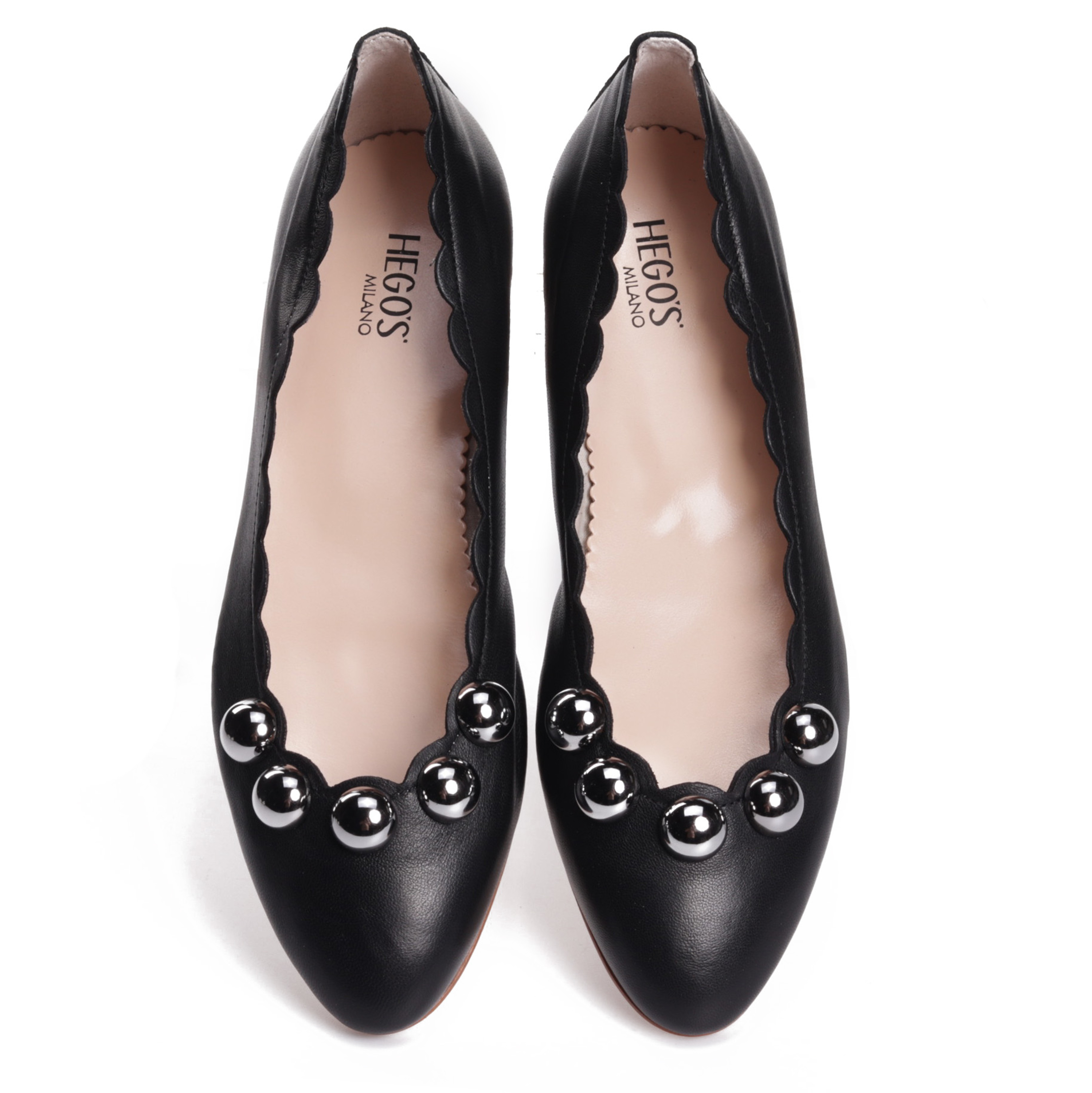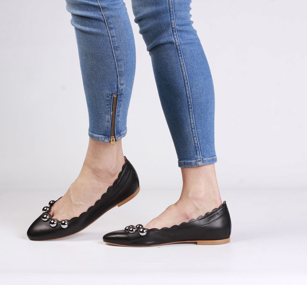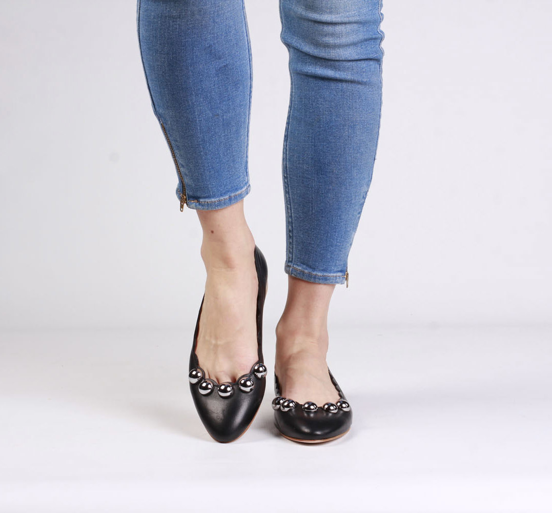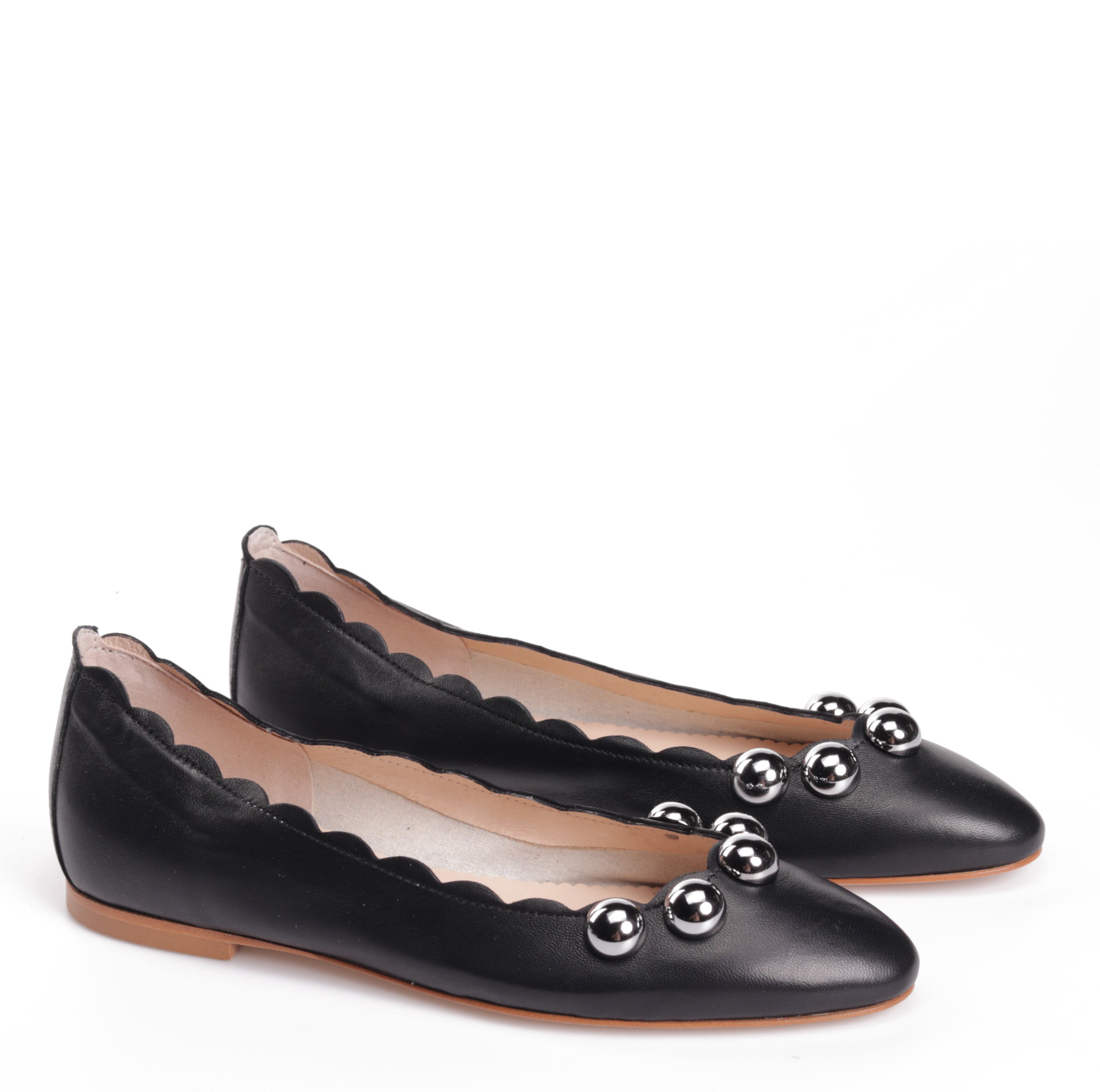 Piękne, nowoczesne baleriny w klasycznej czerni świetnie sprawdzą się zestawione zarówno z klasycznymi jak i bardziej casualowymi stylizacjami. Skórzana cholewka oraz wkładka gwarantują komfort i dopasowanie do stopy. Charakterystyczne wykończenie cholewki w zestawieniu z ozdobnymi elementami na przodzie sprawia, że prezentują się niezwykle uroczo i niebanalnie. Nikt nie przejdzie obok nich obojętnie!