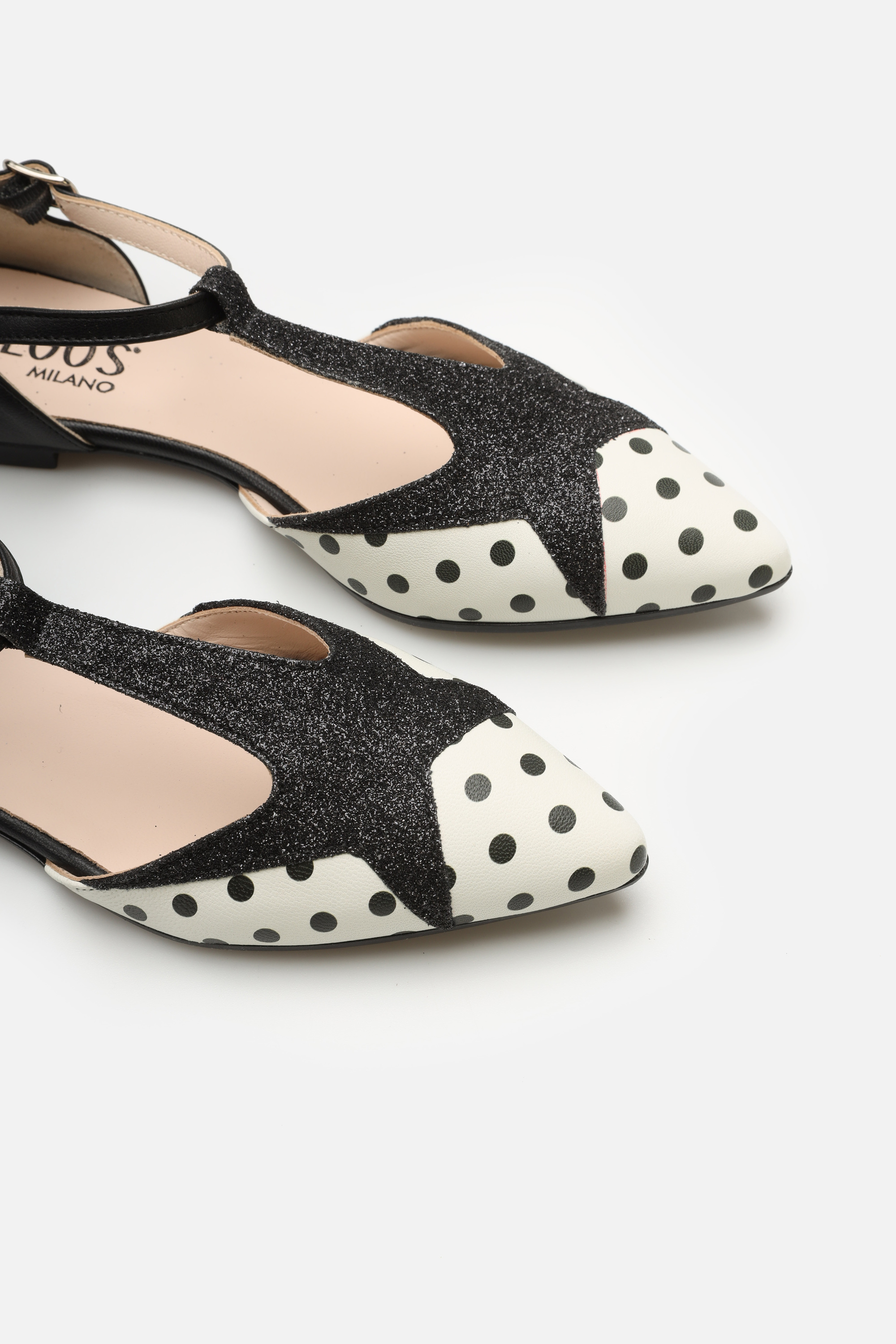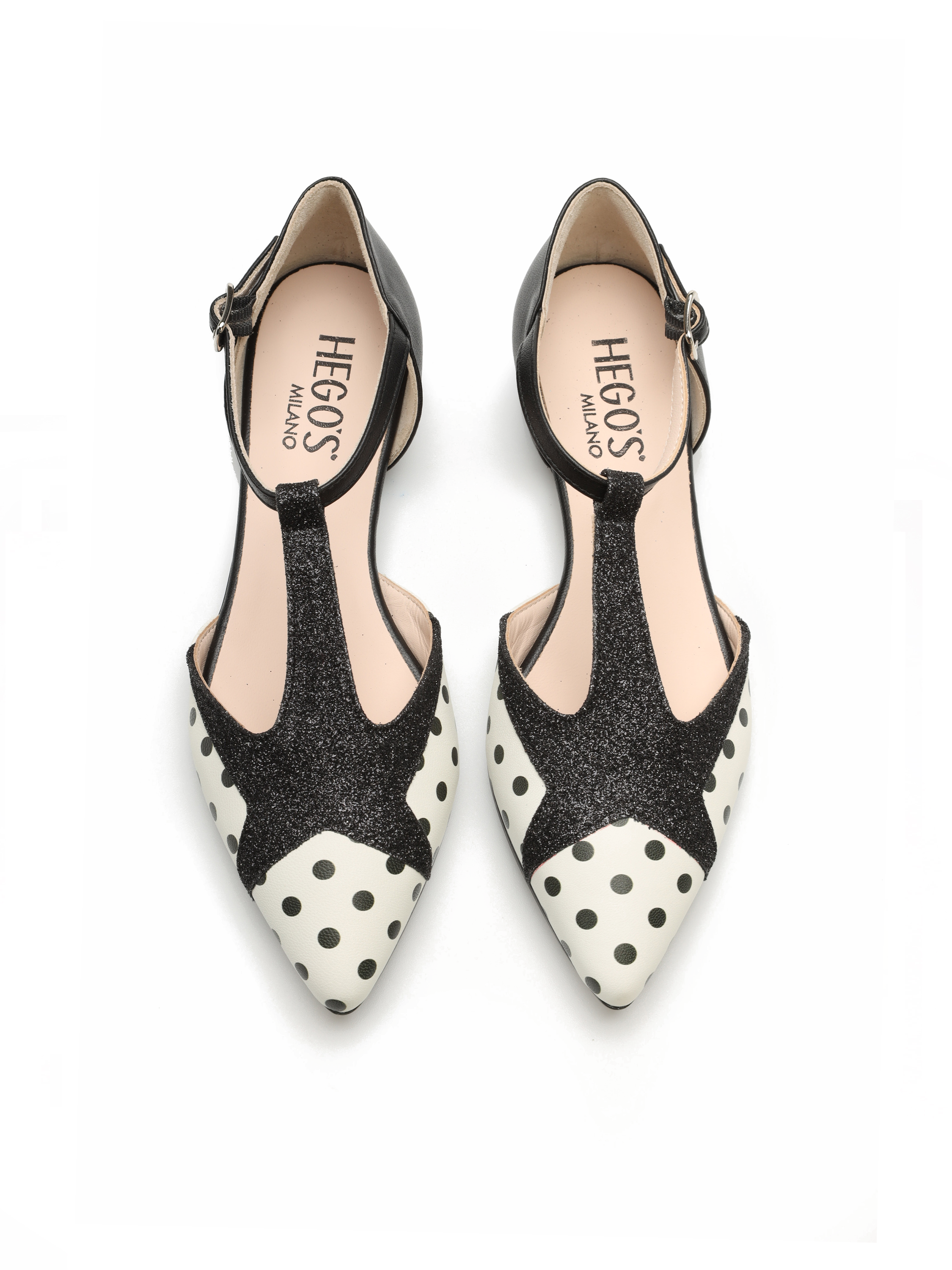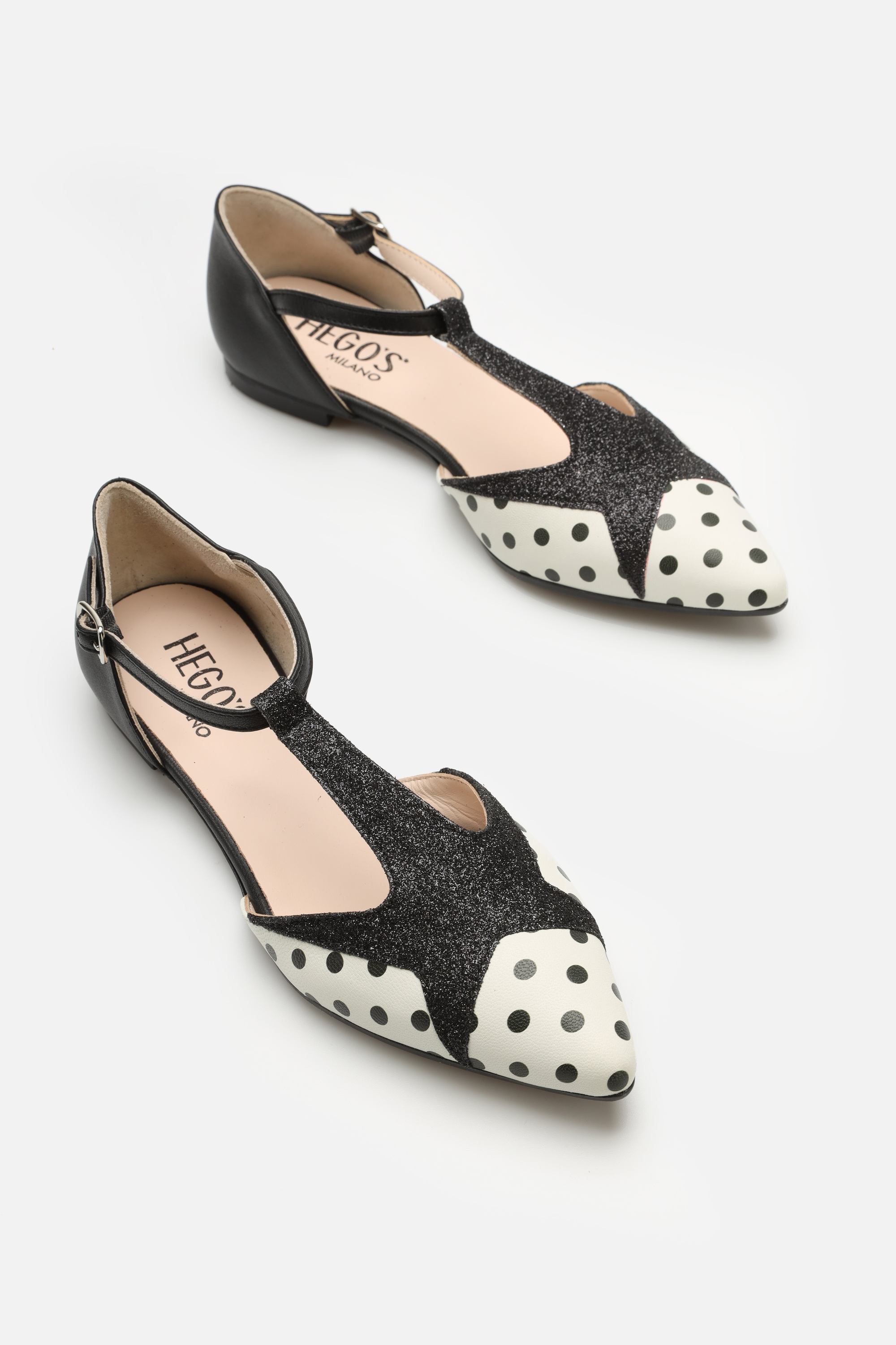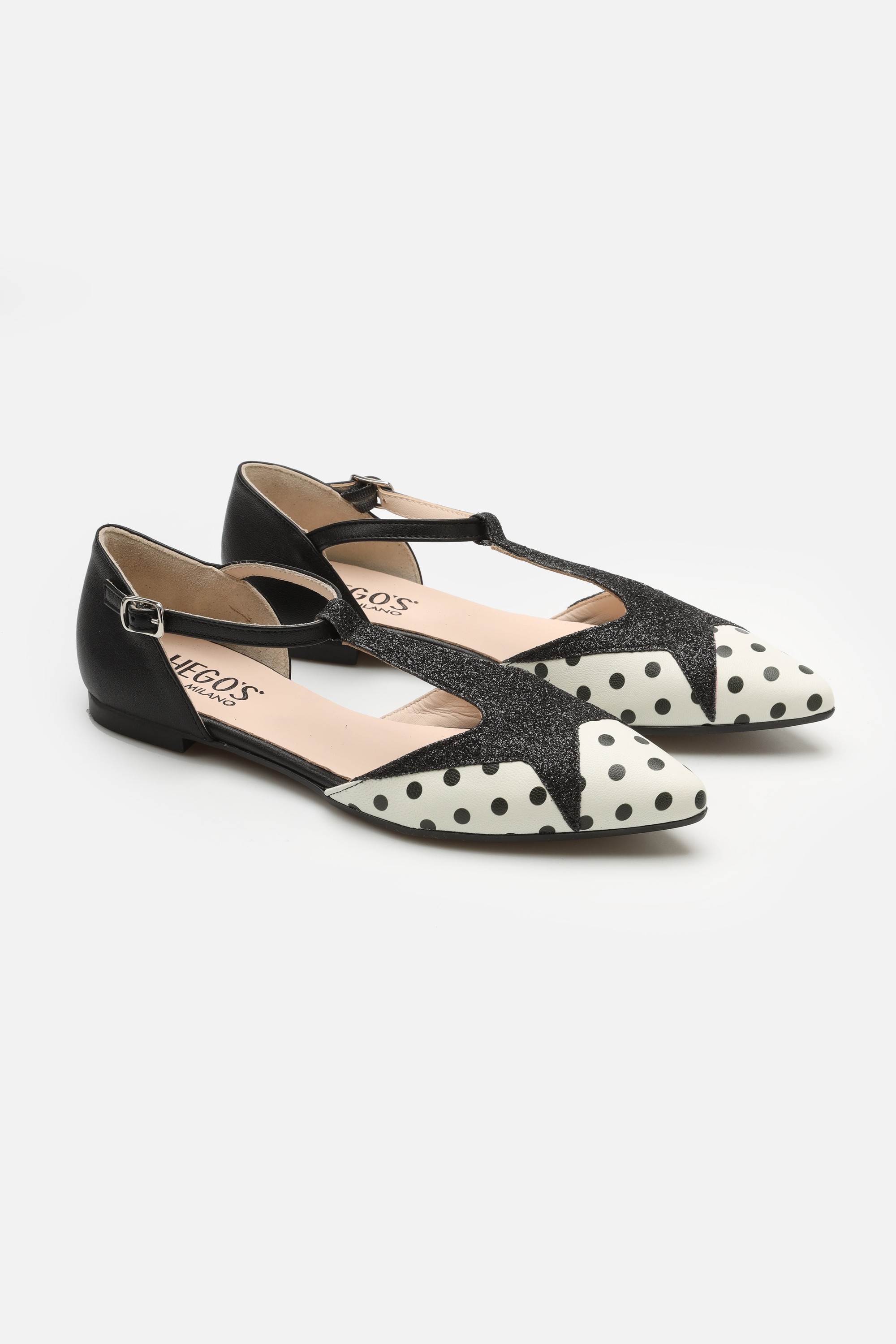 Limitowana linia HEGO'S Milano w stylu PIN-UP zauroczy każdego! Baleriny HEGO'S z zapinanym paseczkiem są naszą propozycją uzupełnienia codziennej stylizacji o coś niebanalnego! Wykonane z miękkiej włoskiej skóry perfekcyjnie dopasują się do stopy. Dzięki skórzanemu wnętrzu oraz wkładce odczuwalny jest większy komfort użytkowania. Podeszwa z gumy gwarantuje amortyzację na wiele godzin. Pasek przechodzący przez podbicie optycznie wysmukli stopę, co dodatkowo podkreśli idący w czubek nosek. Ozdobna brokatowa gwiazda przechodząca w pasek w łączeniu z uroczymi kropkami idealnie podkreśla kraj ich pochodzenia!