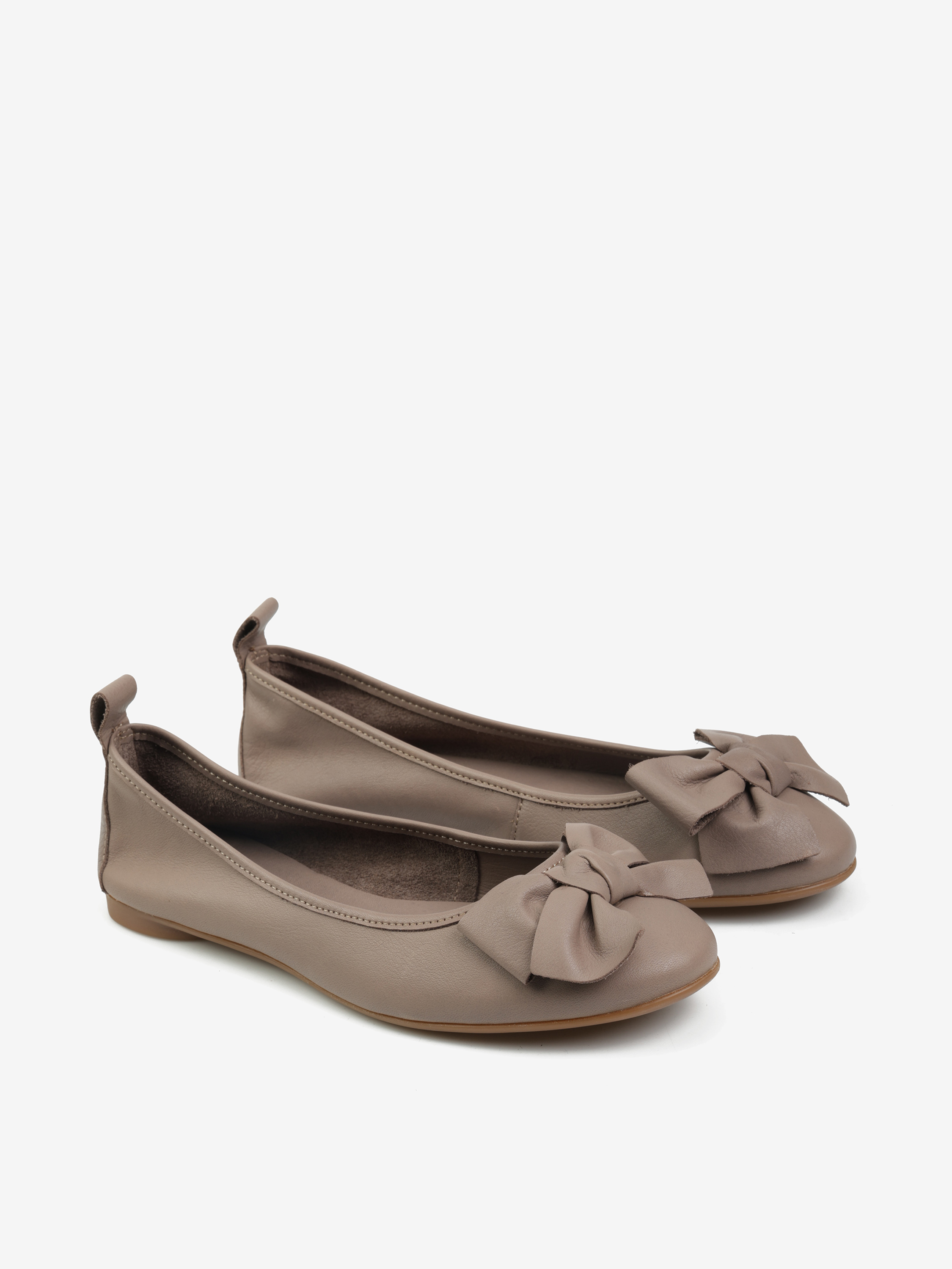 Baleriny wykonane z delikatnej, miękkiej skóry. Okrągły nosek ze skórzaną kokarda.