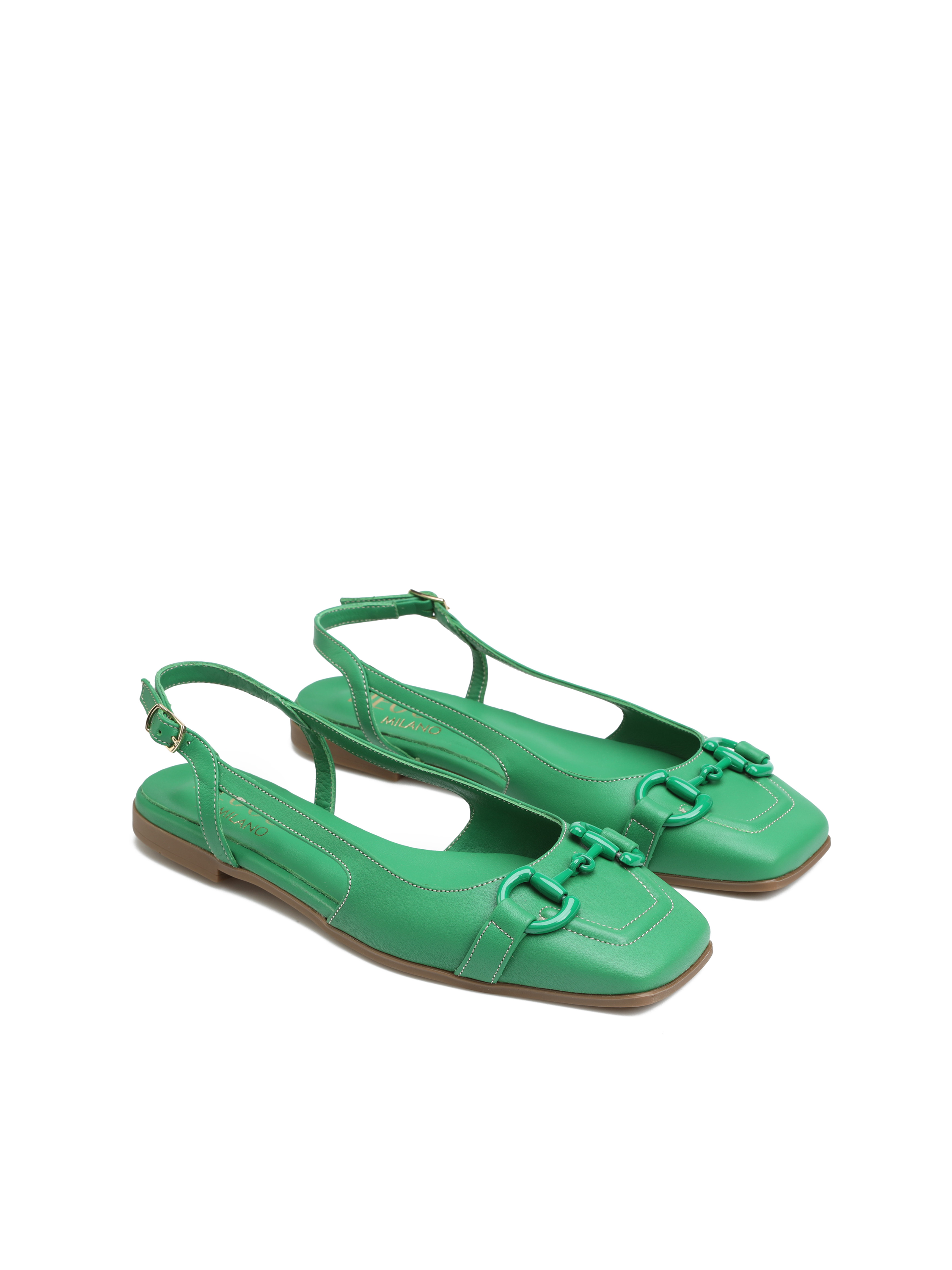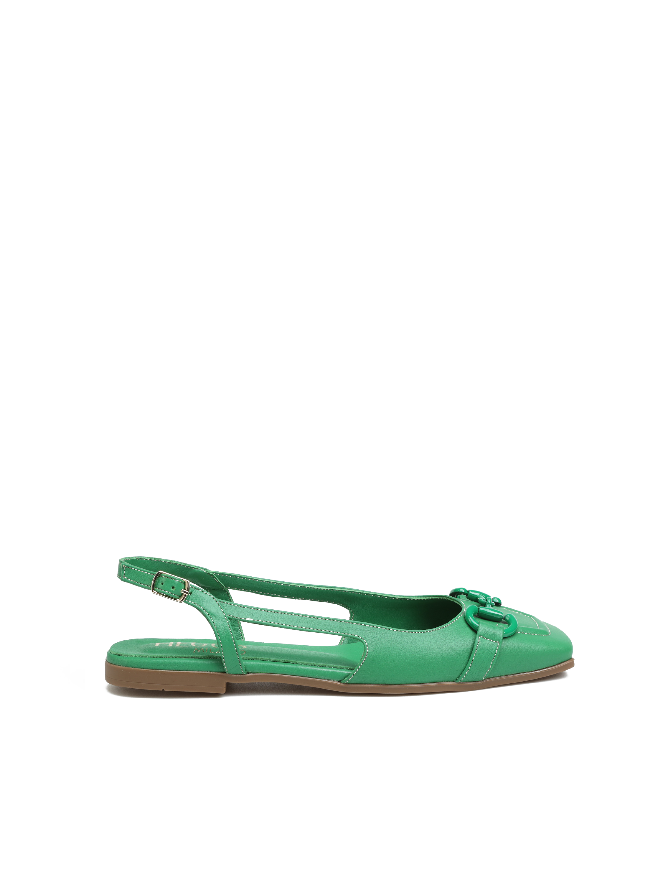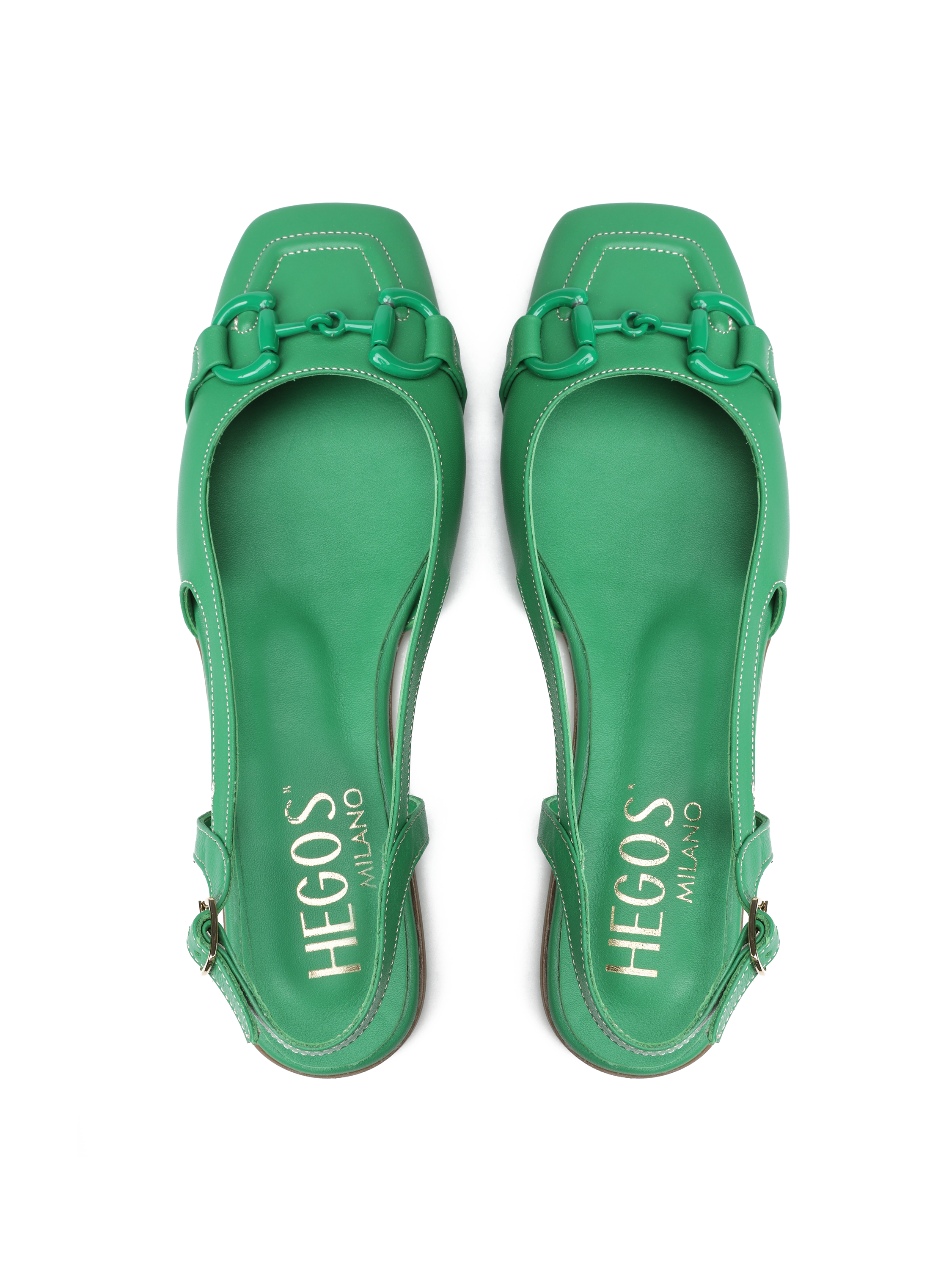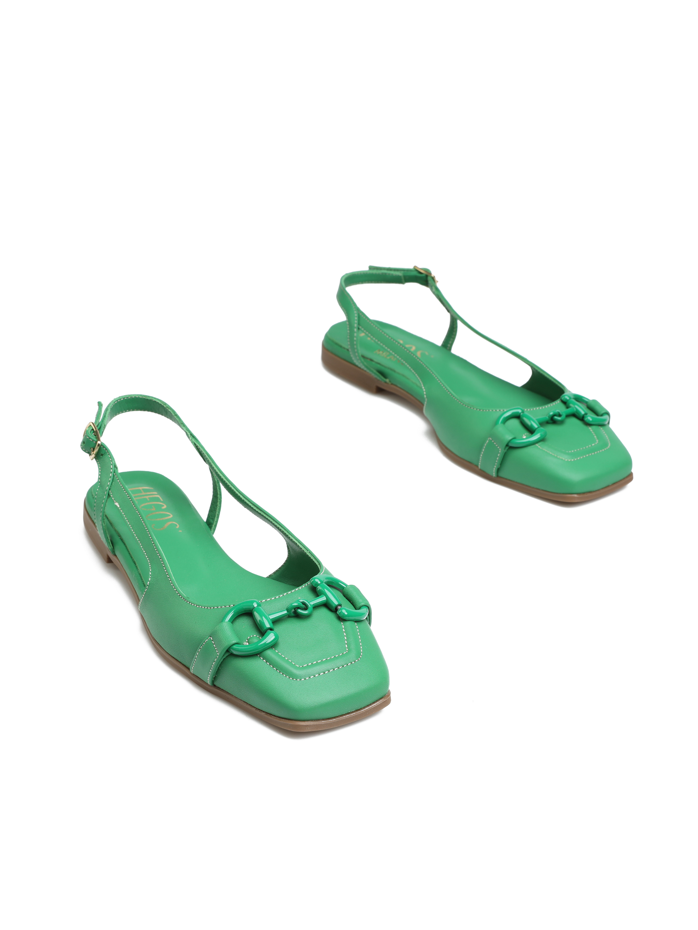 Baleriny z odkrytą piętą HEGO'S Milano to TOP Trend sezonu. Wykonane są z włoskiej naturalnej skóry licowej. Miękka, skórzana wkładka i płaski obcas odpowiadają  za wygodę i komfort noszenia butów przez cały dzień. Zapinane na regulowany pasek, dopasują się do Twojej stopy. Cholewka wzbogacona została o wędzidło w tym samym  kolorze. Kwadratowy nosek oraz modowy kolor to must have sezonu.