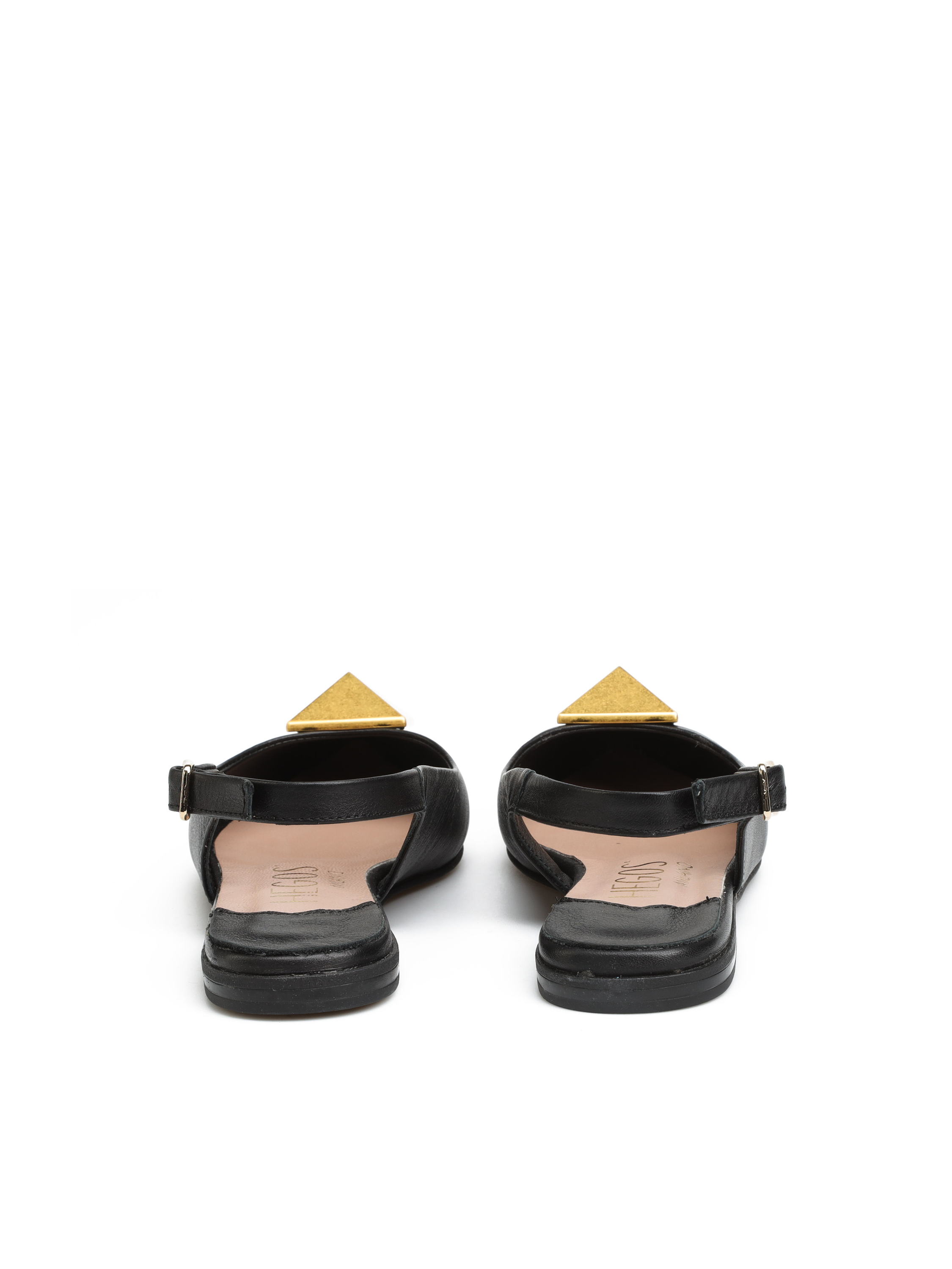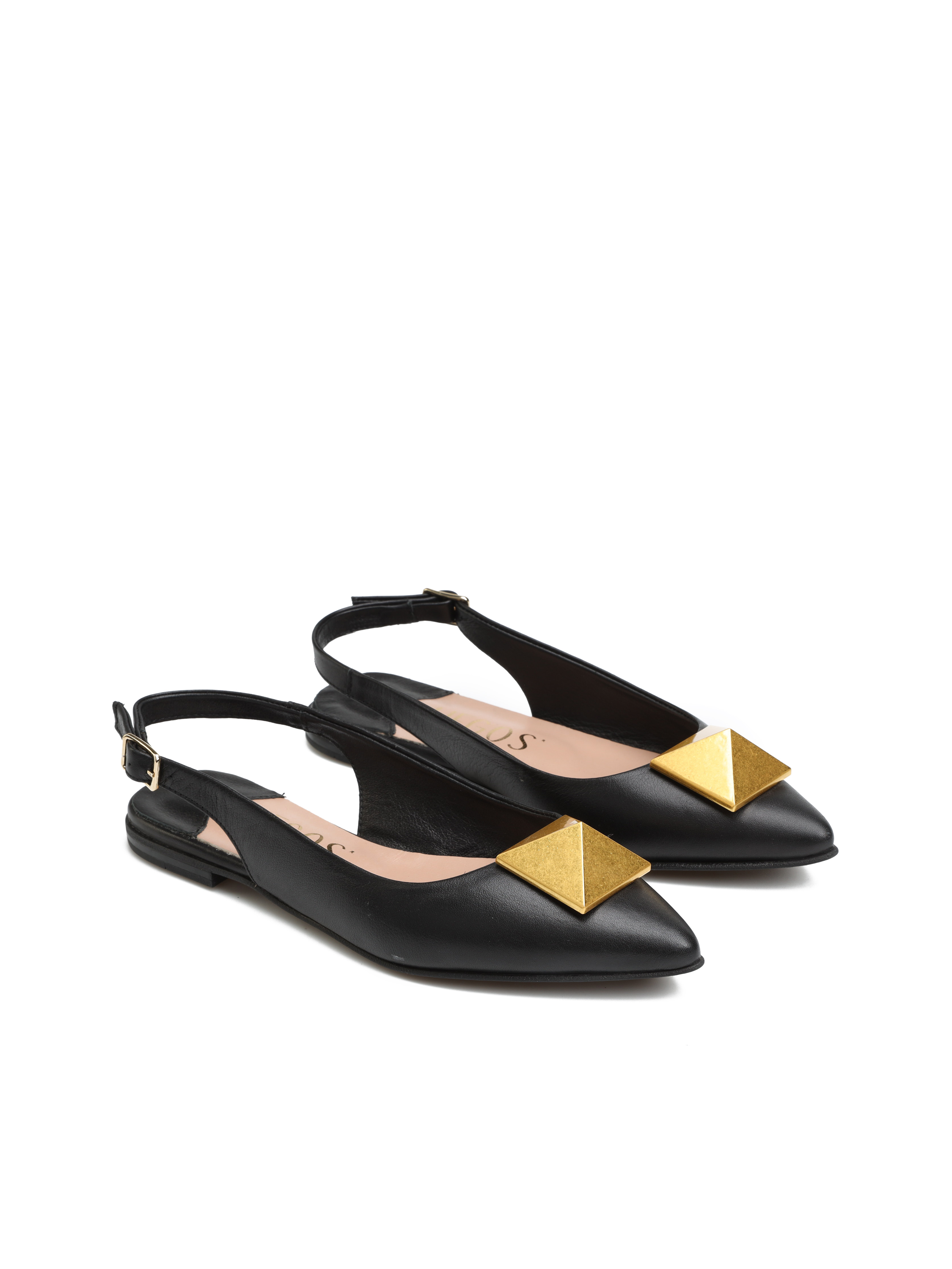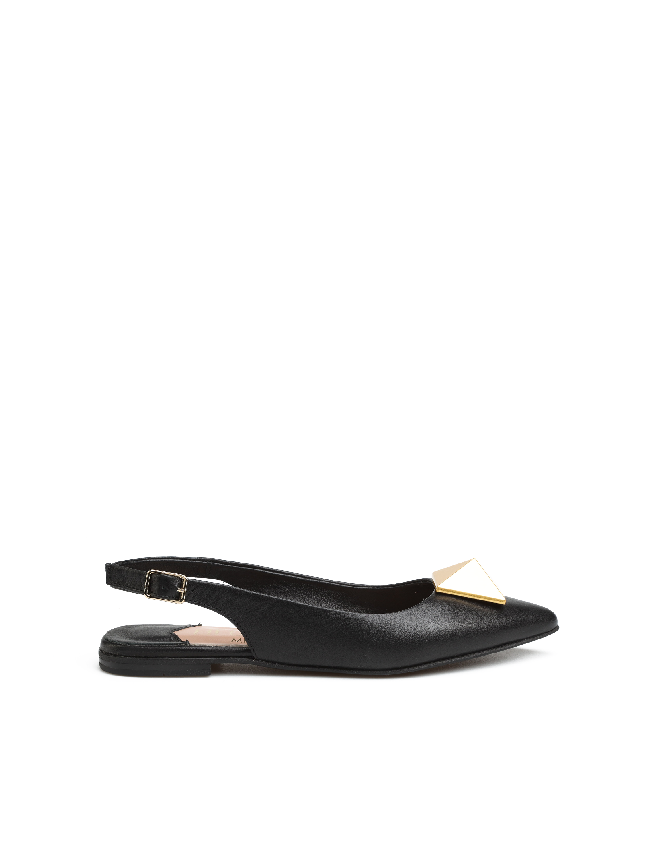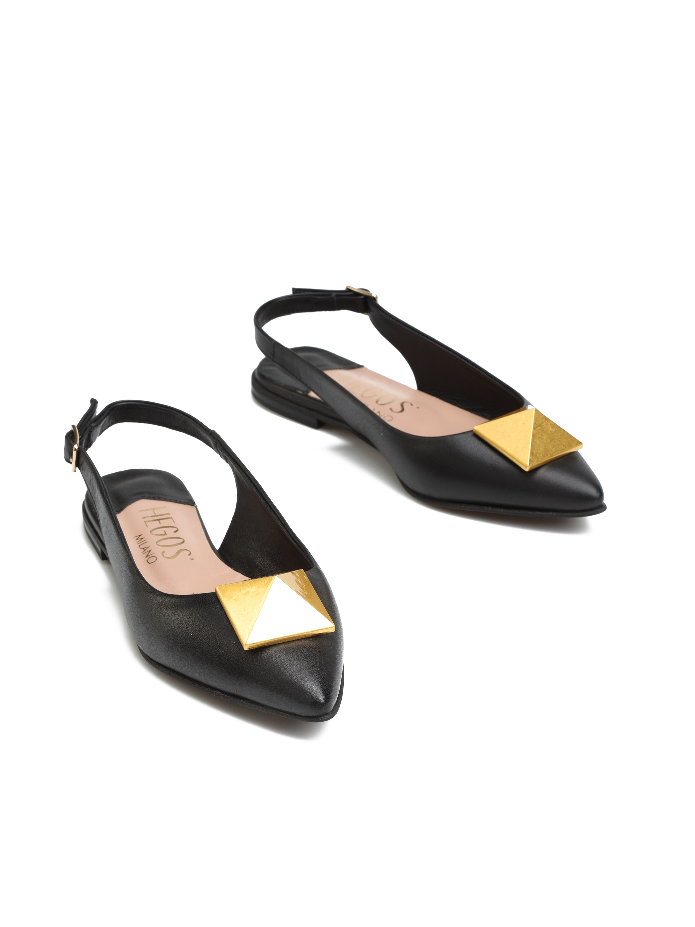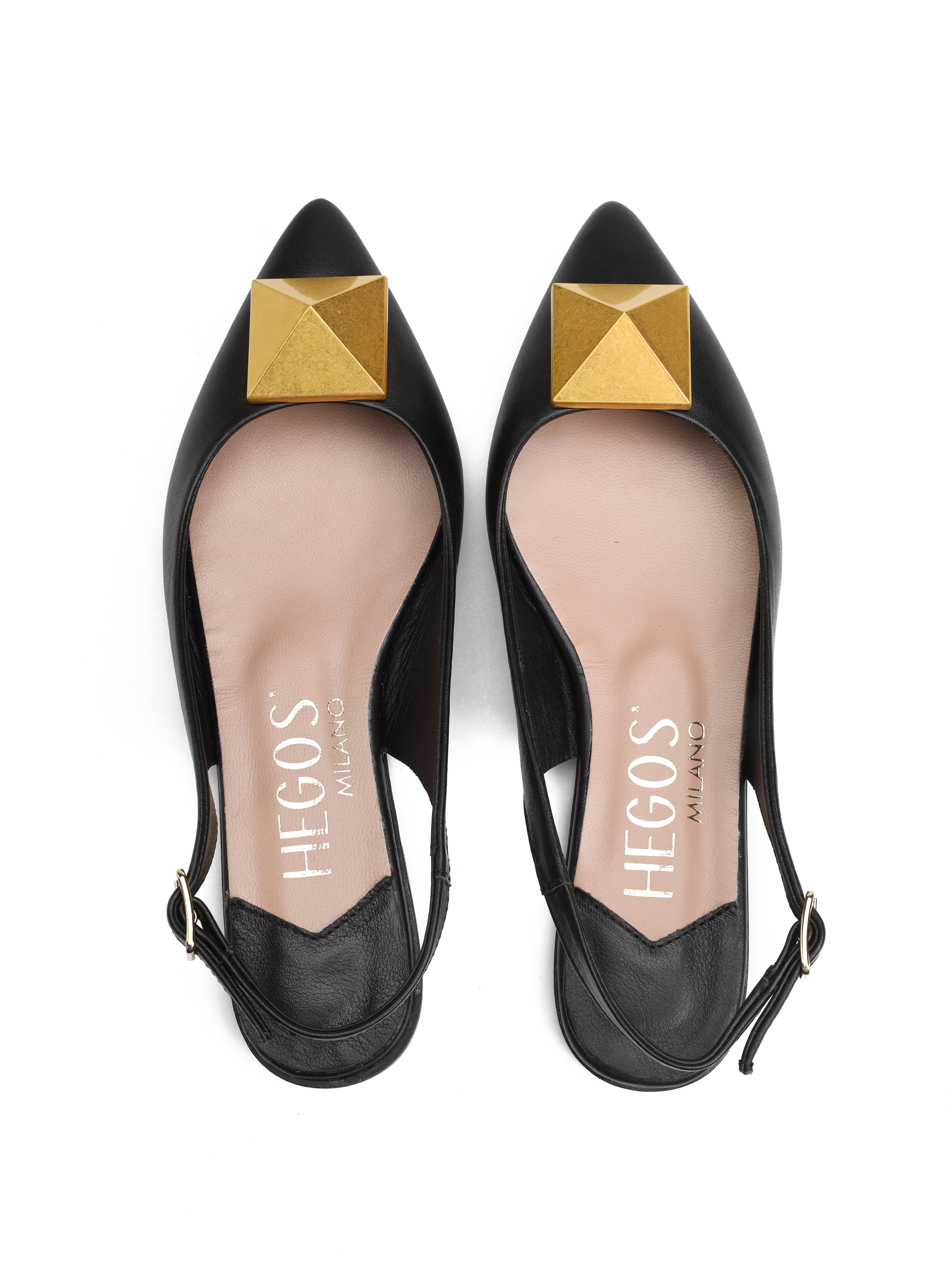 Baleriny z odkrytą piętą HEGO'S Milano to TOP Trend sezonu. Wykonane są z włoskiej naturalnej skóry licowej. Miękka, skórzana wkładka i płaski obcas odpowiadają za wygodę i komfort noszenia butów przez cały dzień. Zapinane na regulowany pasek, dopasują się do Twojej stopy. Cholewka wzbogacona została o metalową, geometryczną ozdobę w złotym kolorze. Nosek w szpic wpisuje się nie tylko w obecne Trendy.