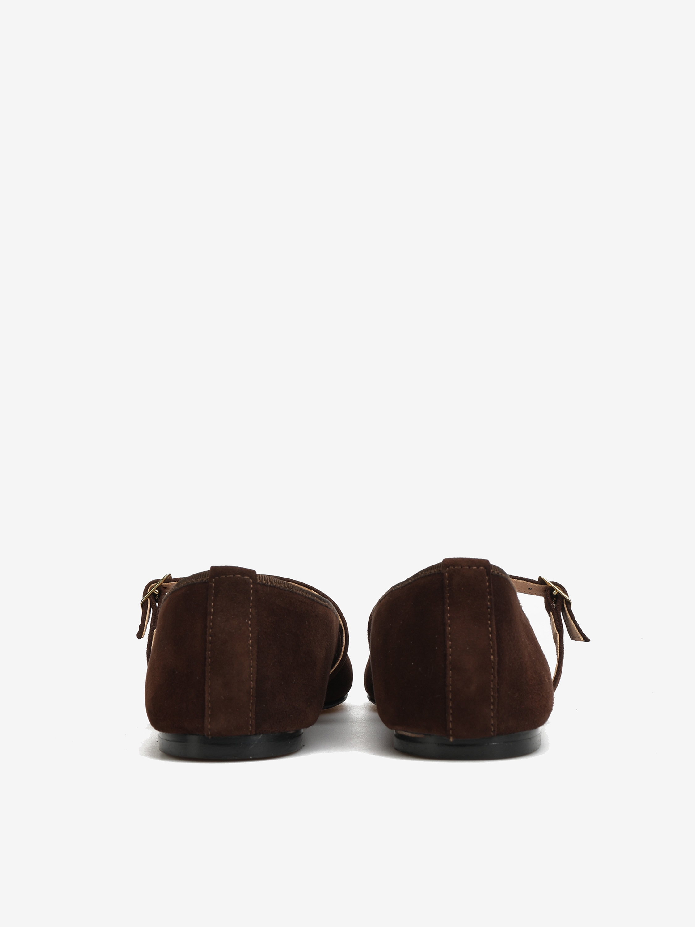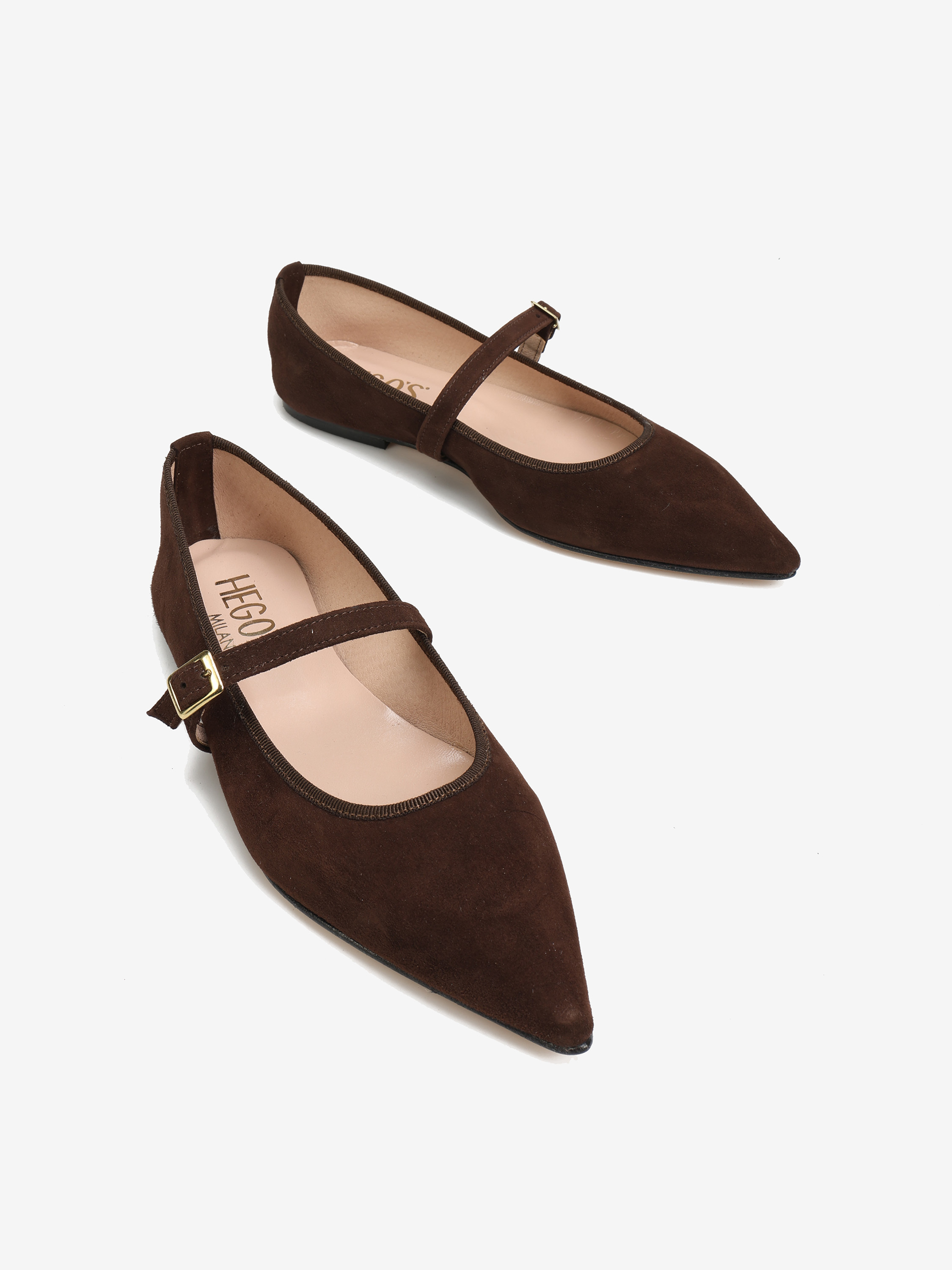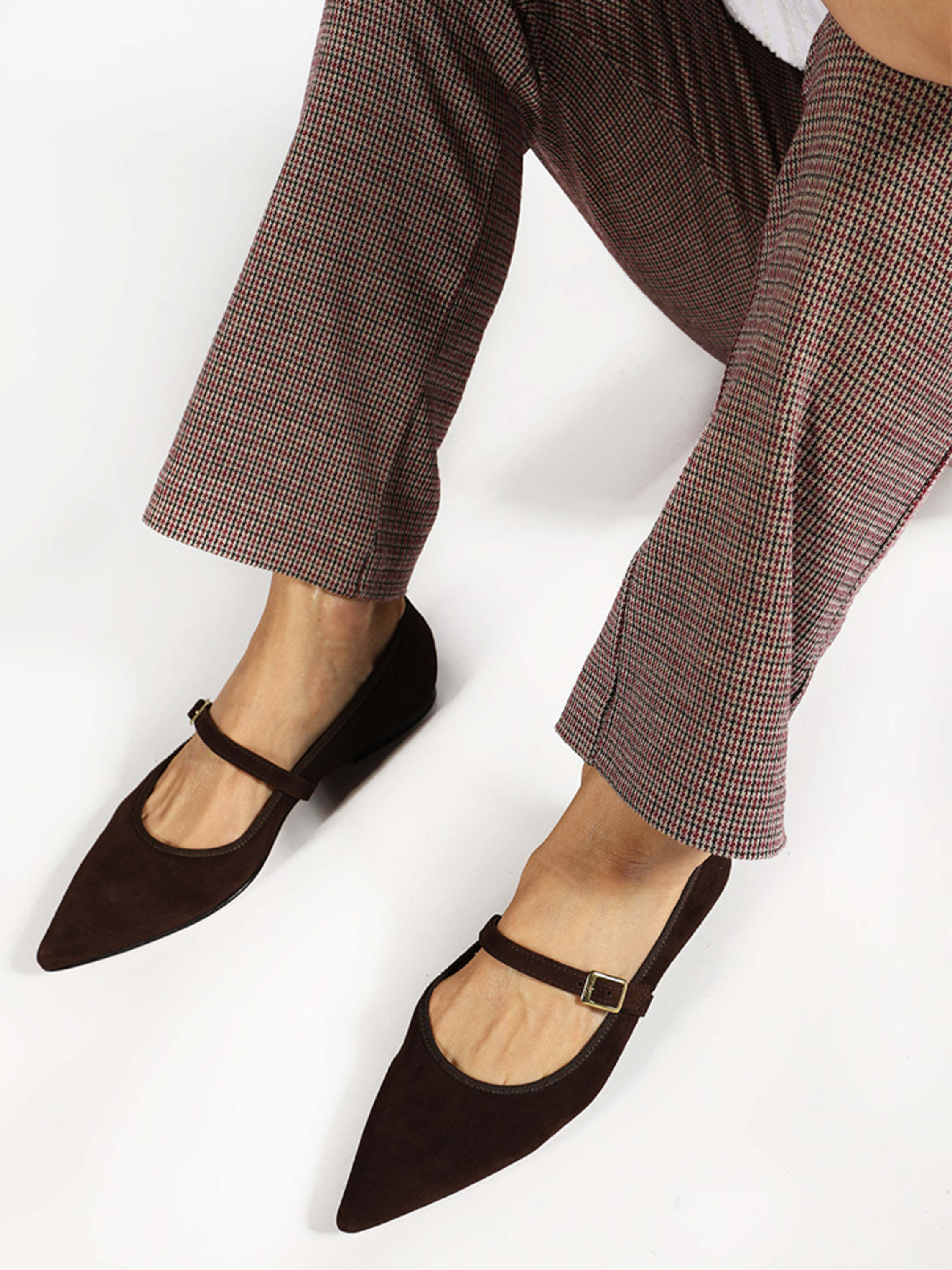 Zamszowe baleriny Mary Jane z noskiem w szpic. Regulowany pasek.