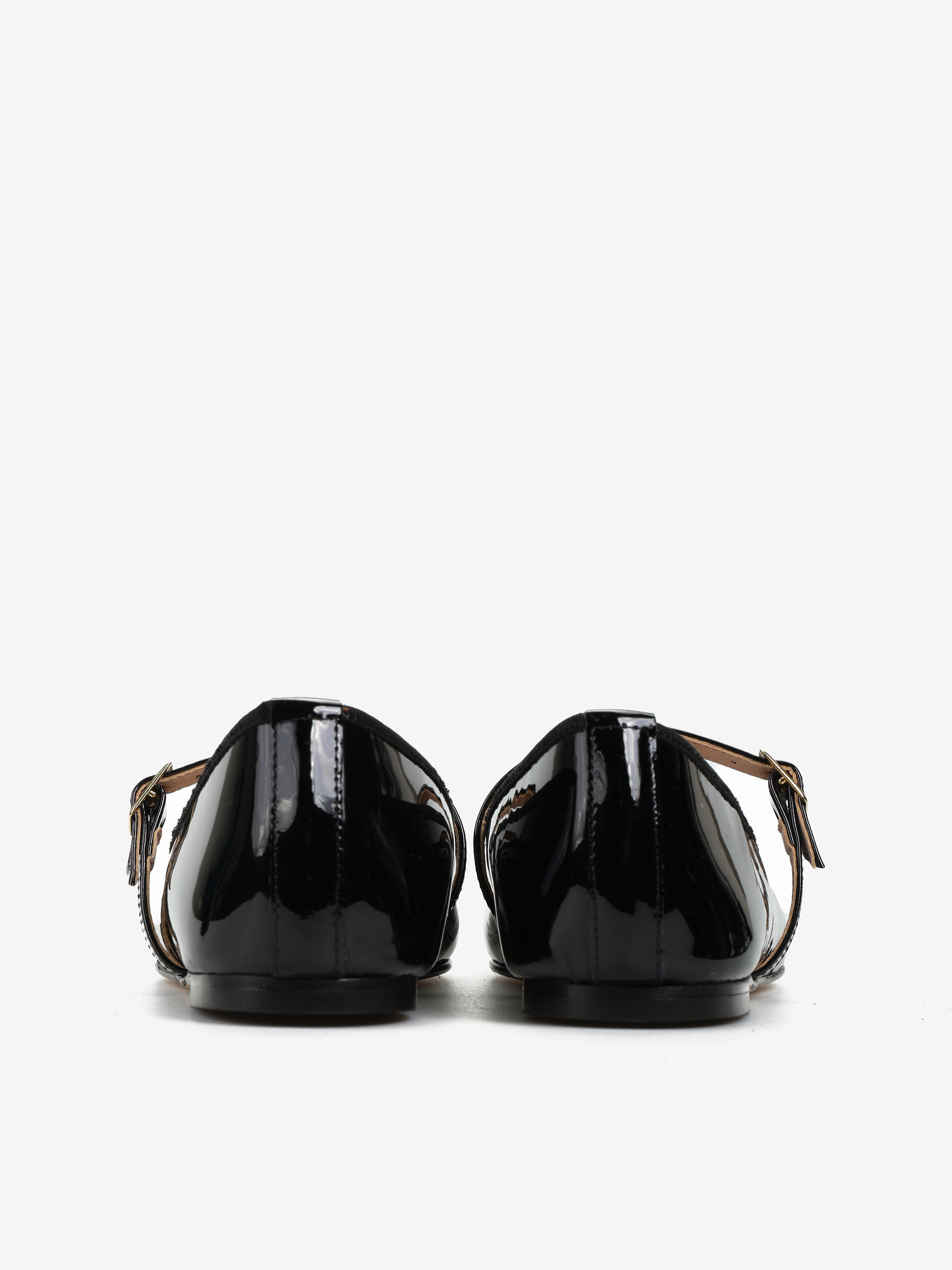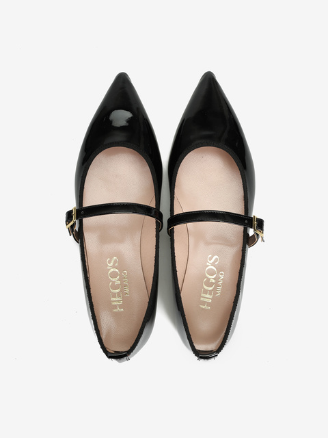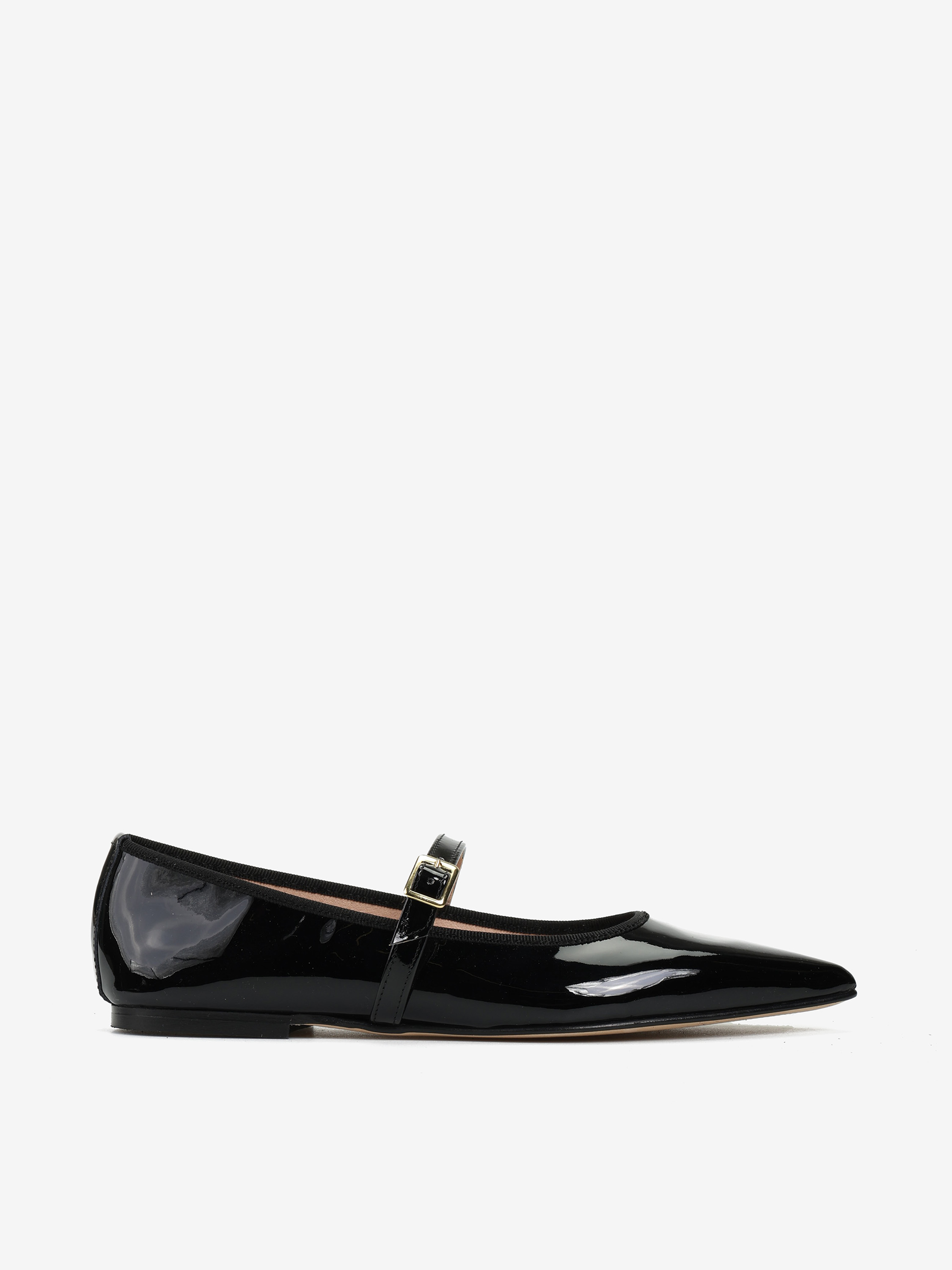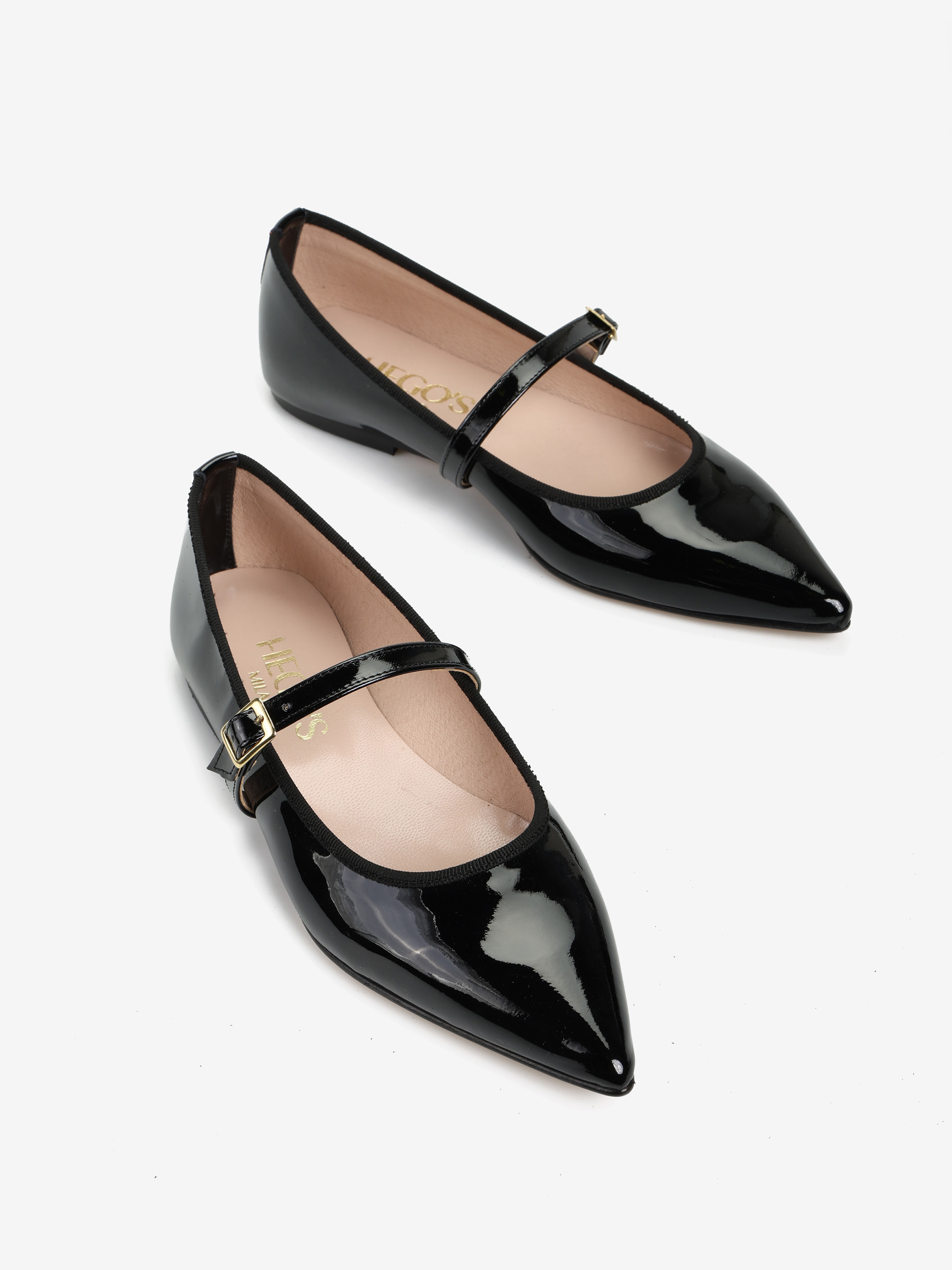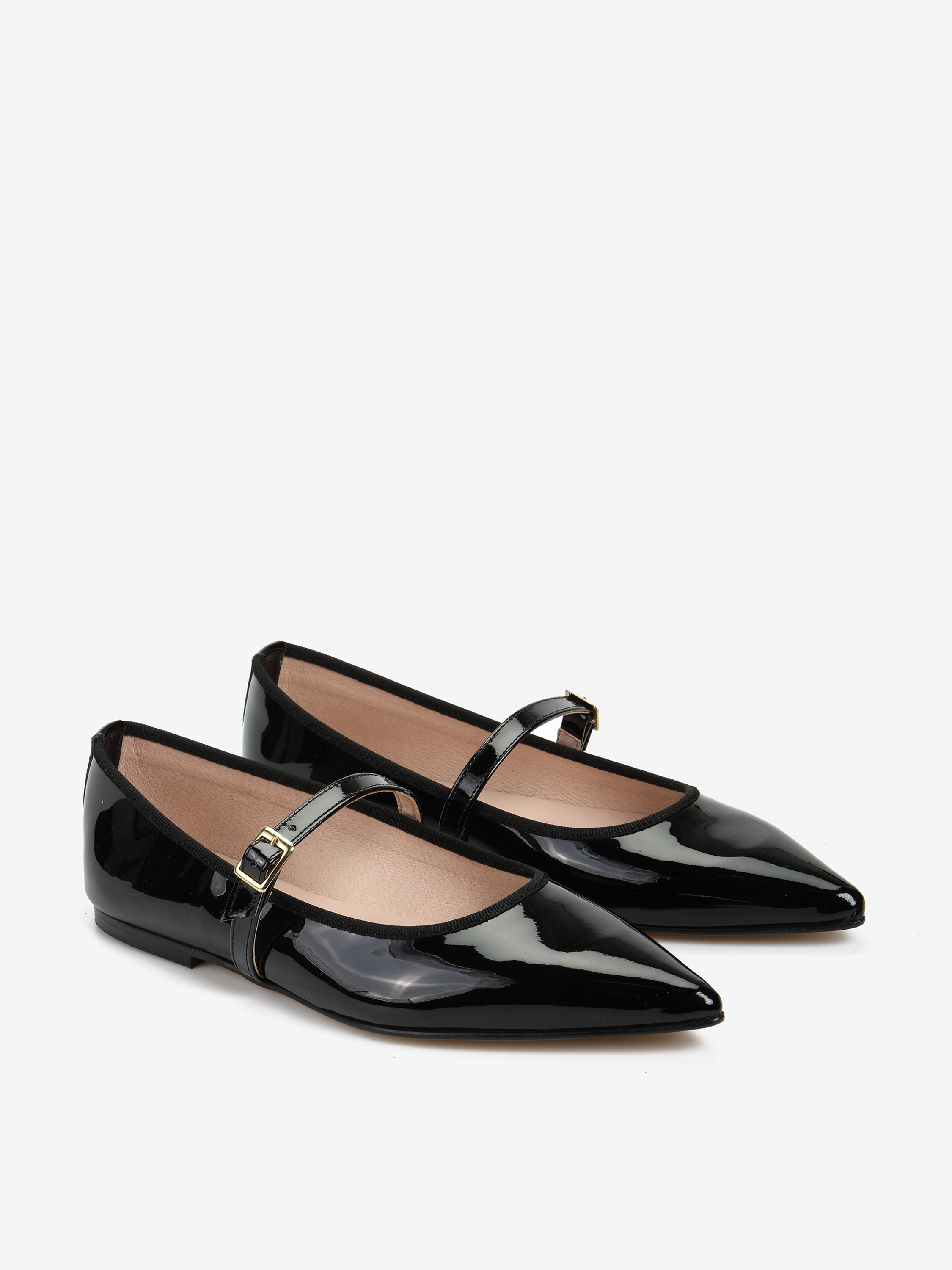 Baleriny Mary Jane wykonane z ekologicznej skóry wysoko polerowanej. Nosek w szpic i regulowany pasek.