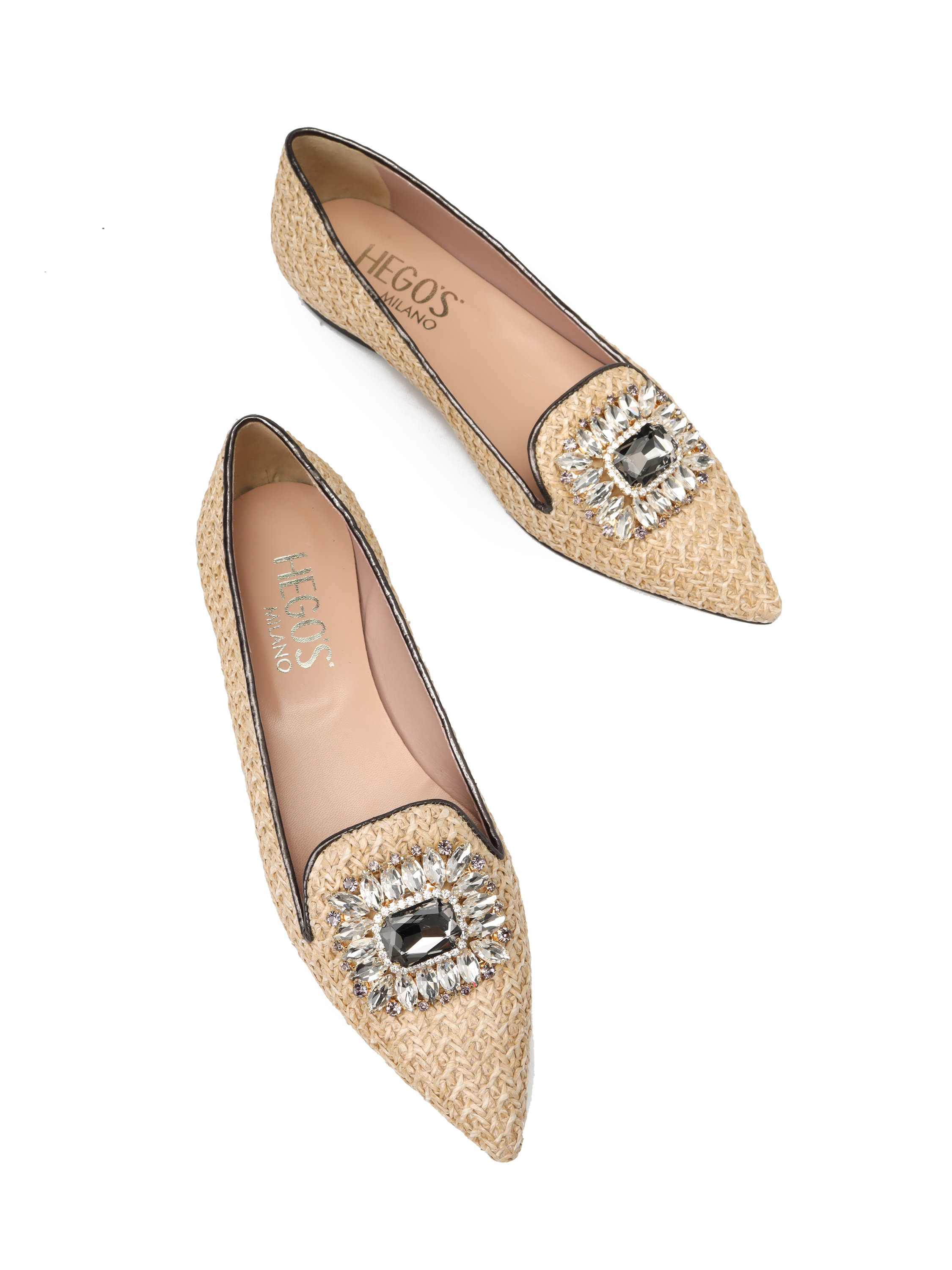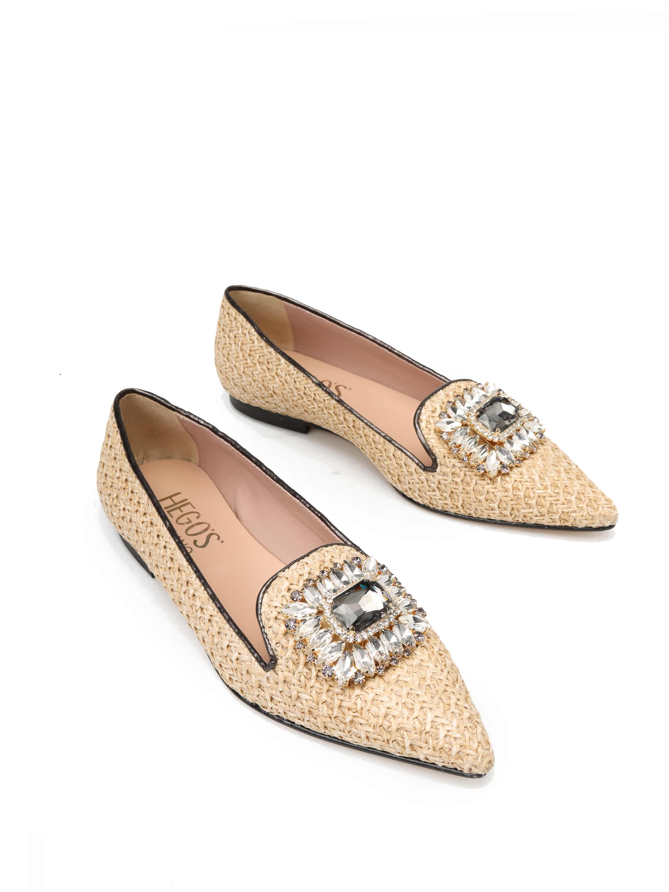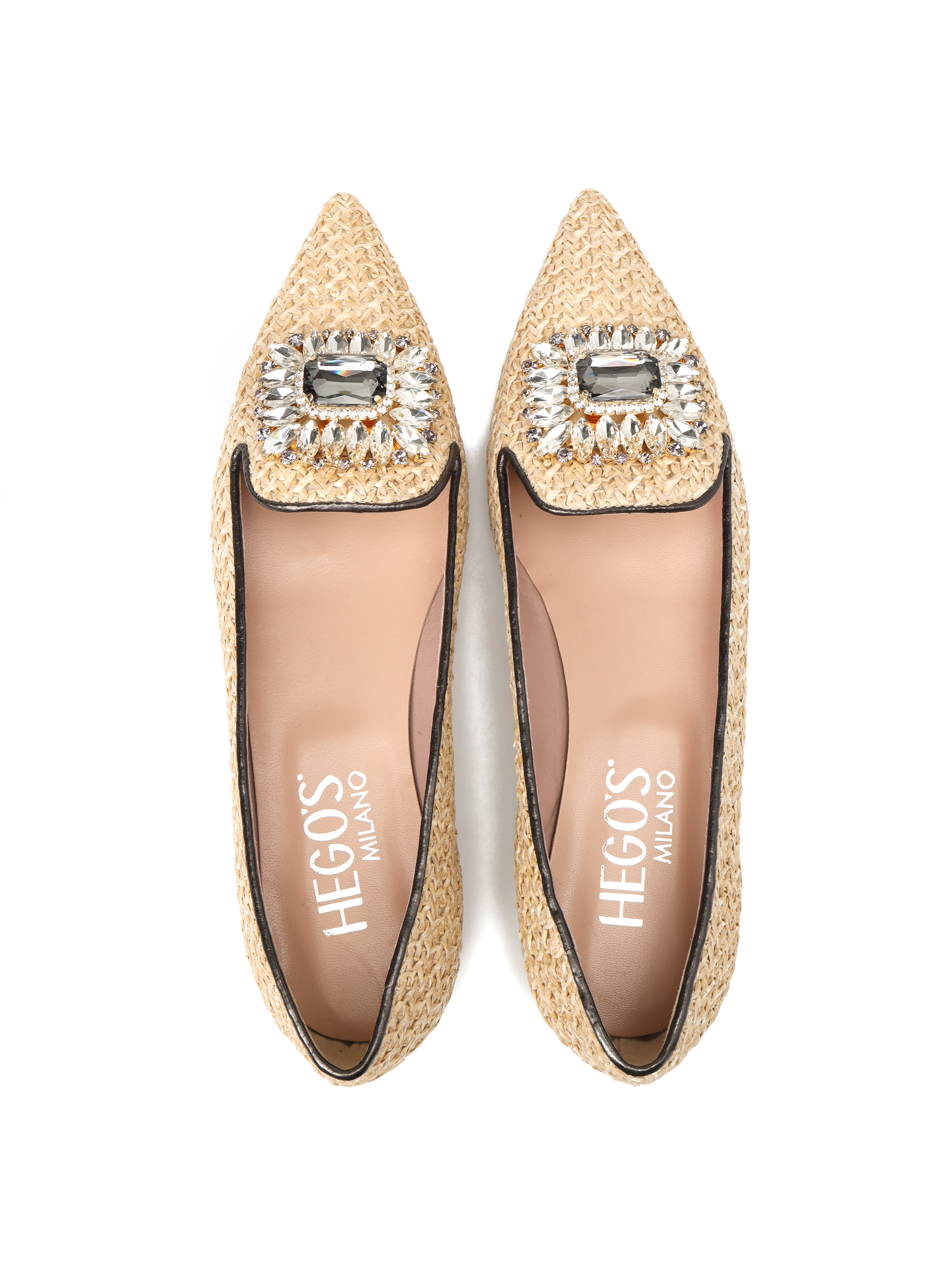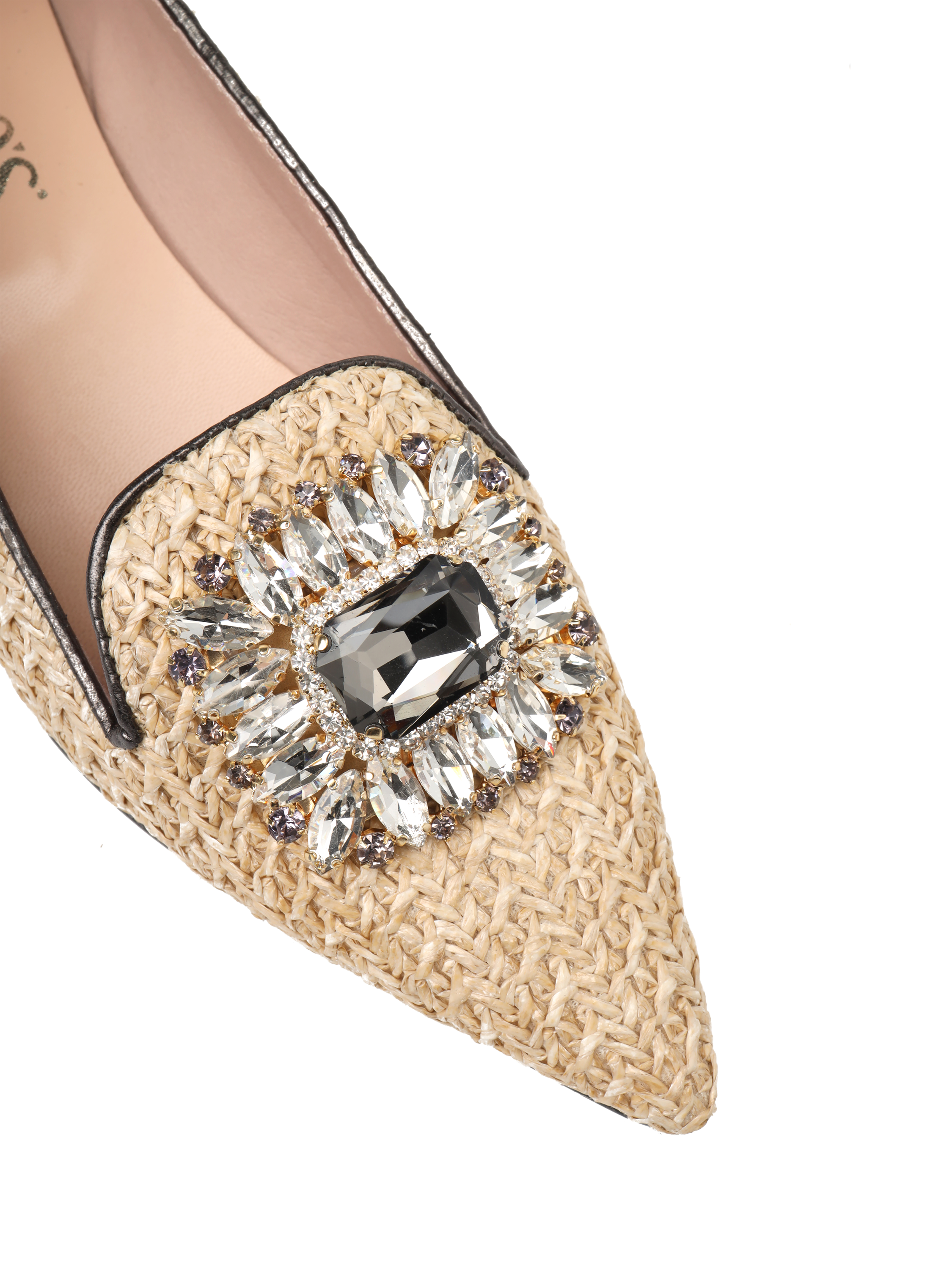 Baleriny w szpic to Trend sezonu. Cholewka w beżowym kolorze zaprojektowana jest z naturalnej Raffi. Ozdobiona została biżuteryjną broszką z kamieni oraz kontrastową lamówką. Włoskie baleriny to prawdziwy Italian Chic.