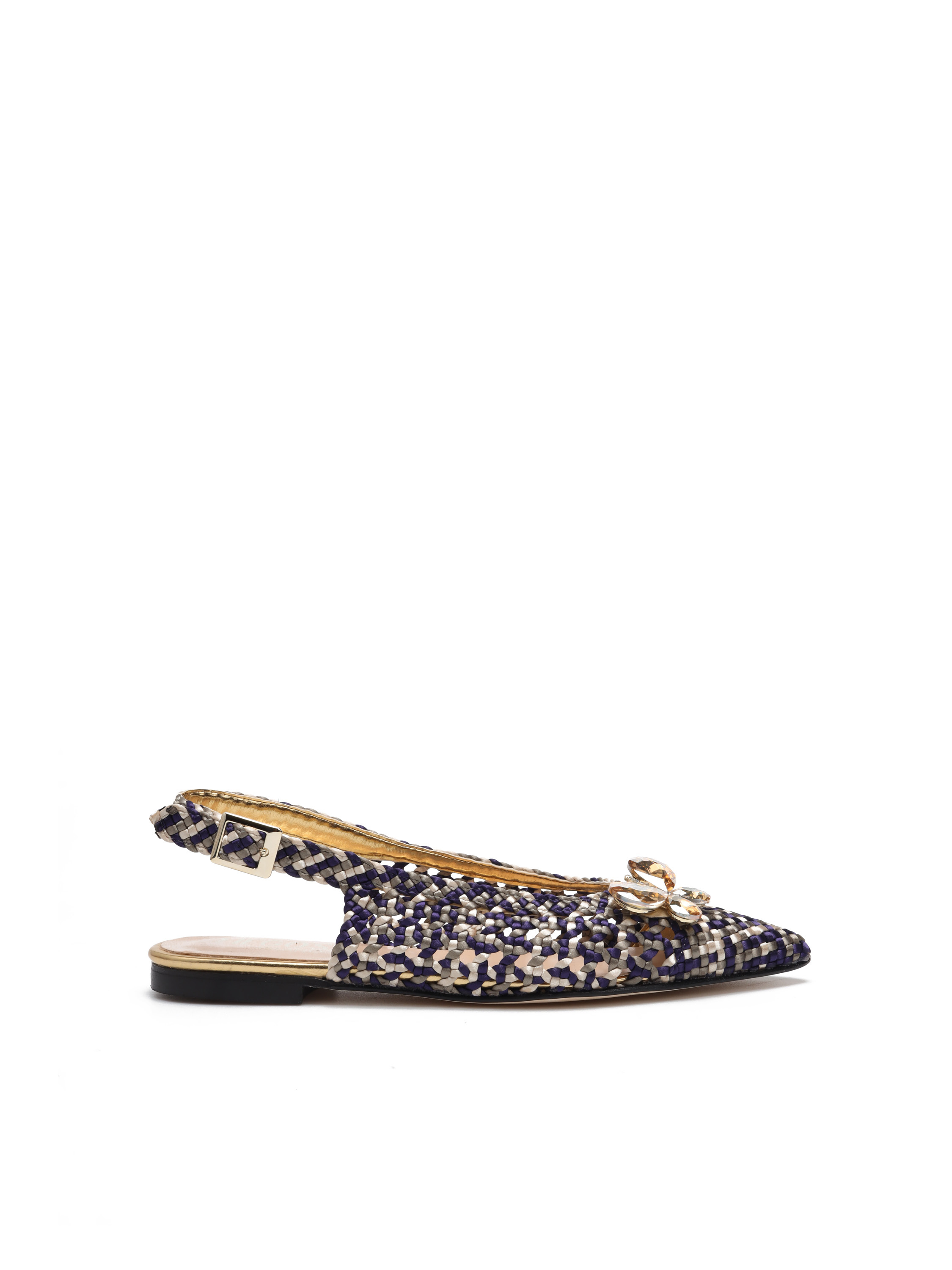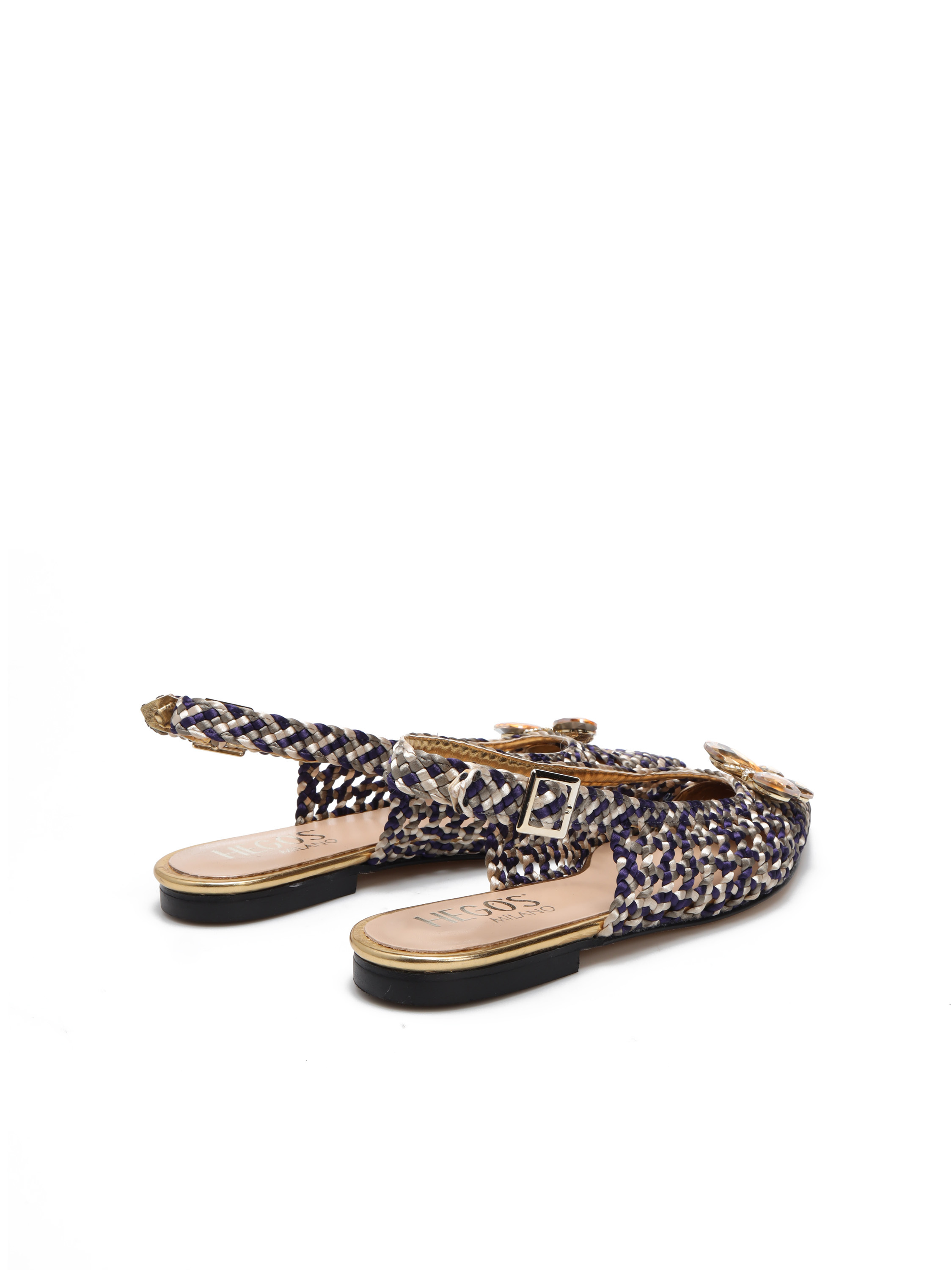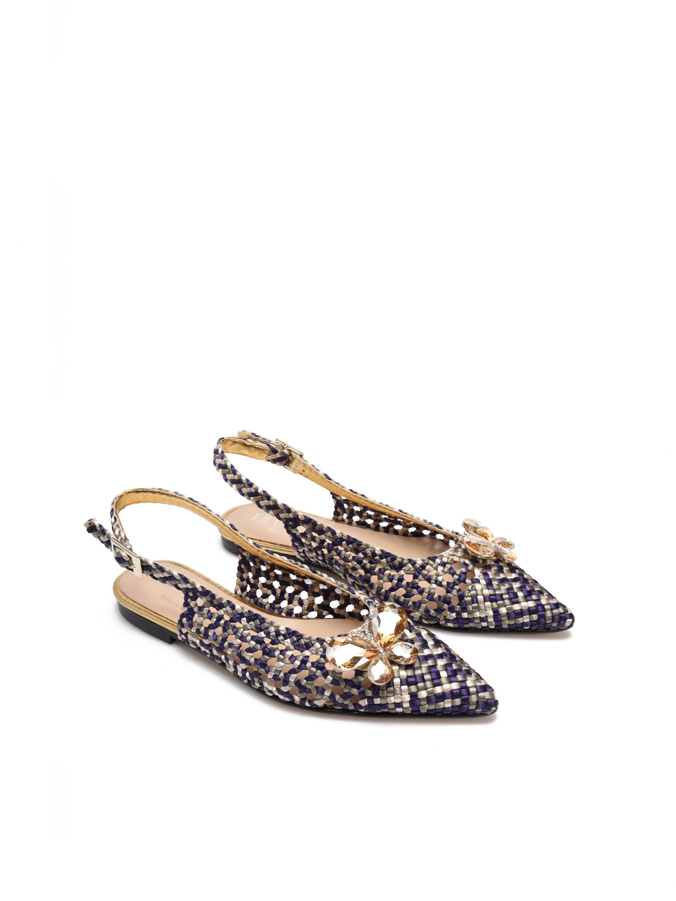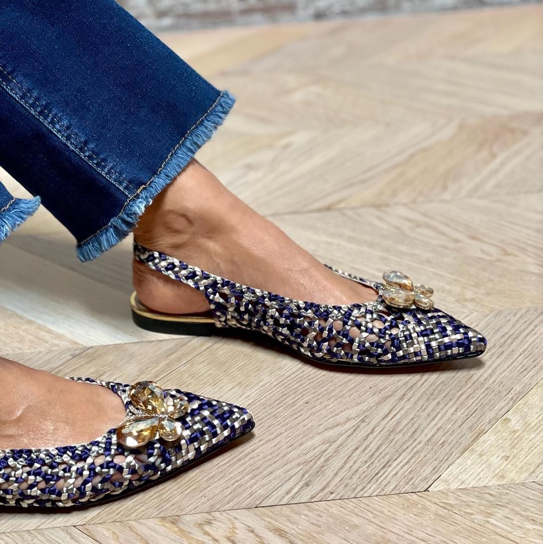 Baleriny z satynowej plecionki, w niespotykanym połączeniu złota i granatu. Model z Limitowanej Kolekcji Urodzinowej FELICITA.