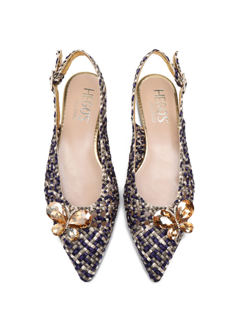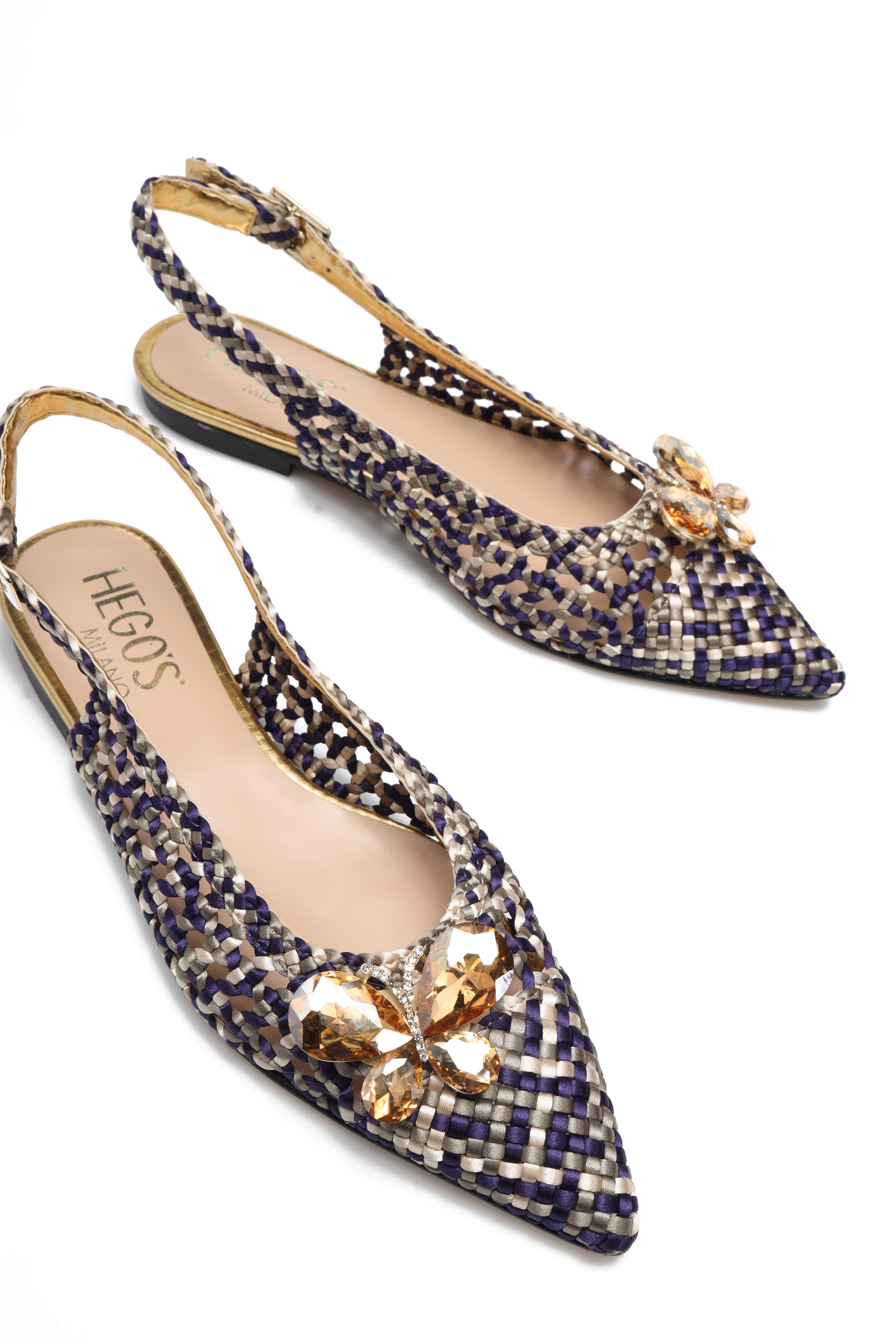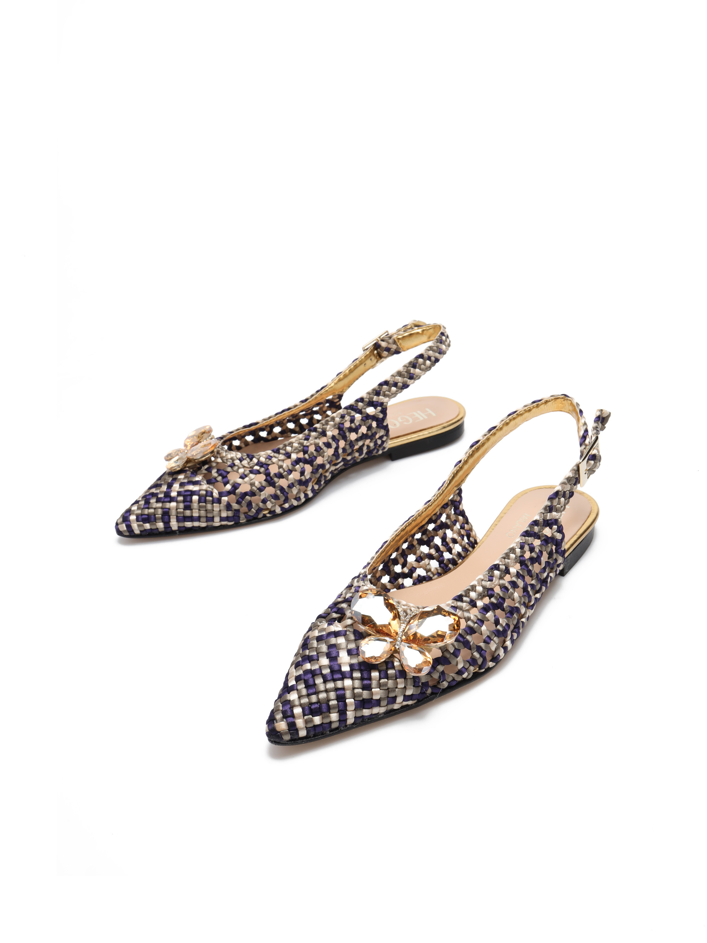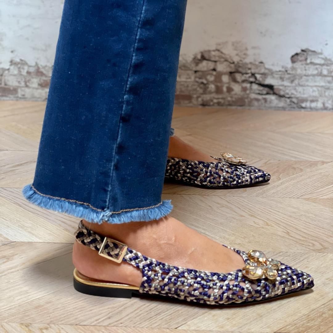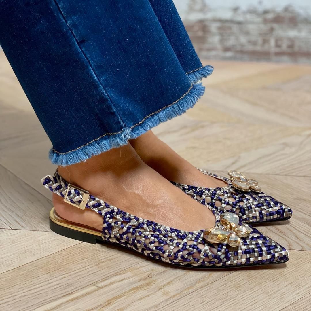 Baleriny z satynowej plecionki, w niespotykanym połączeniu złota i granatu. Model z Limitowanej Kolekcji Urodzinowej FELICITA.