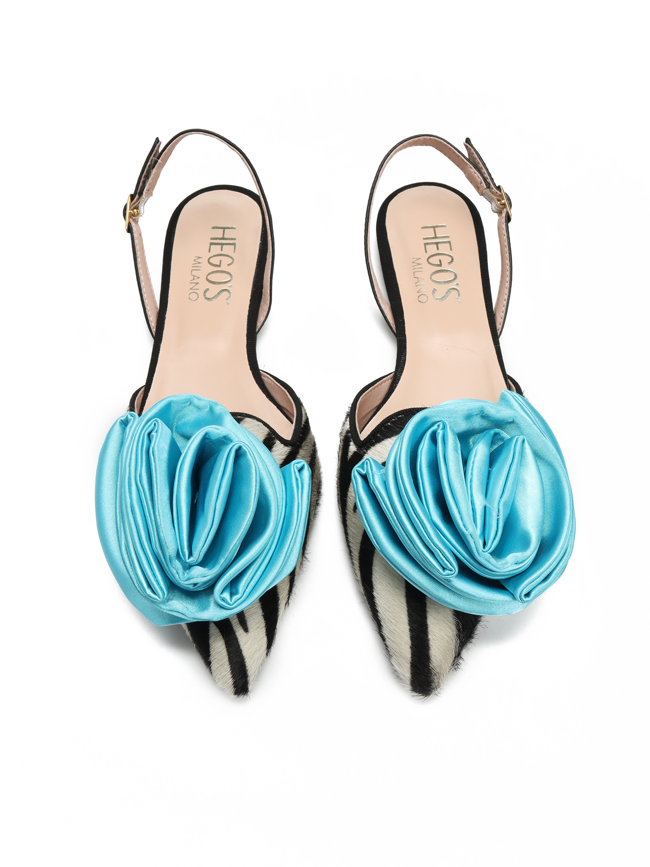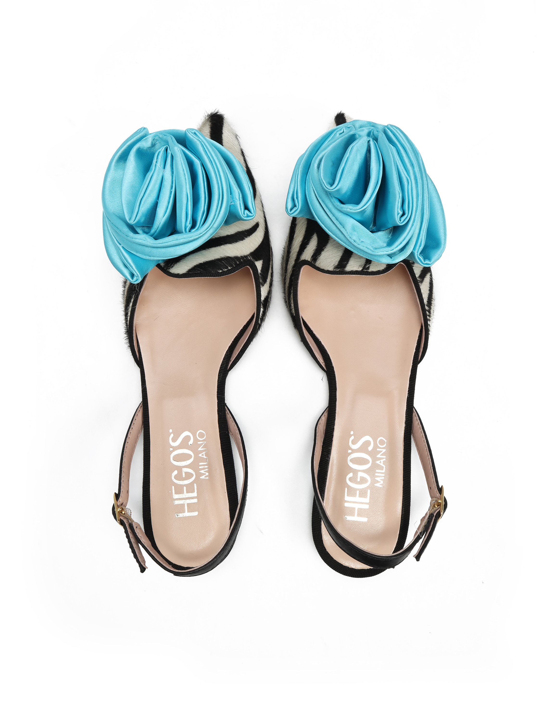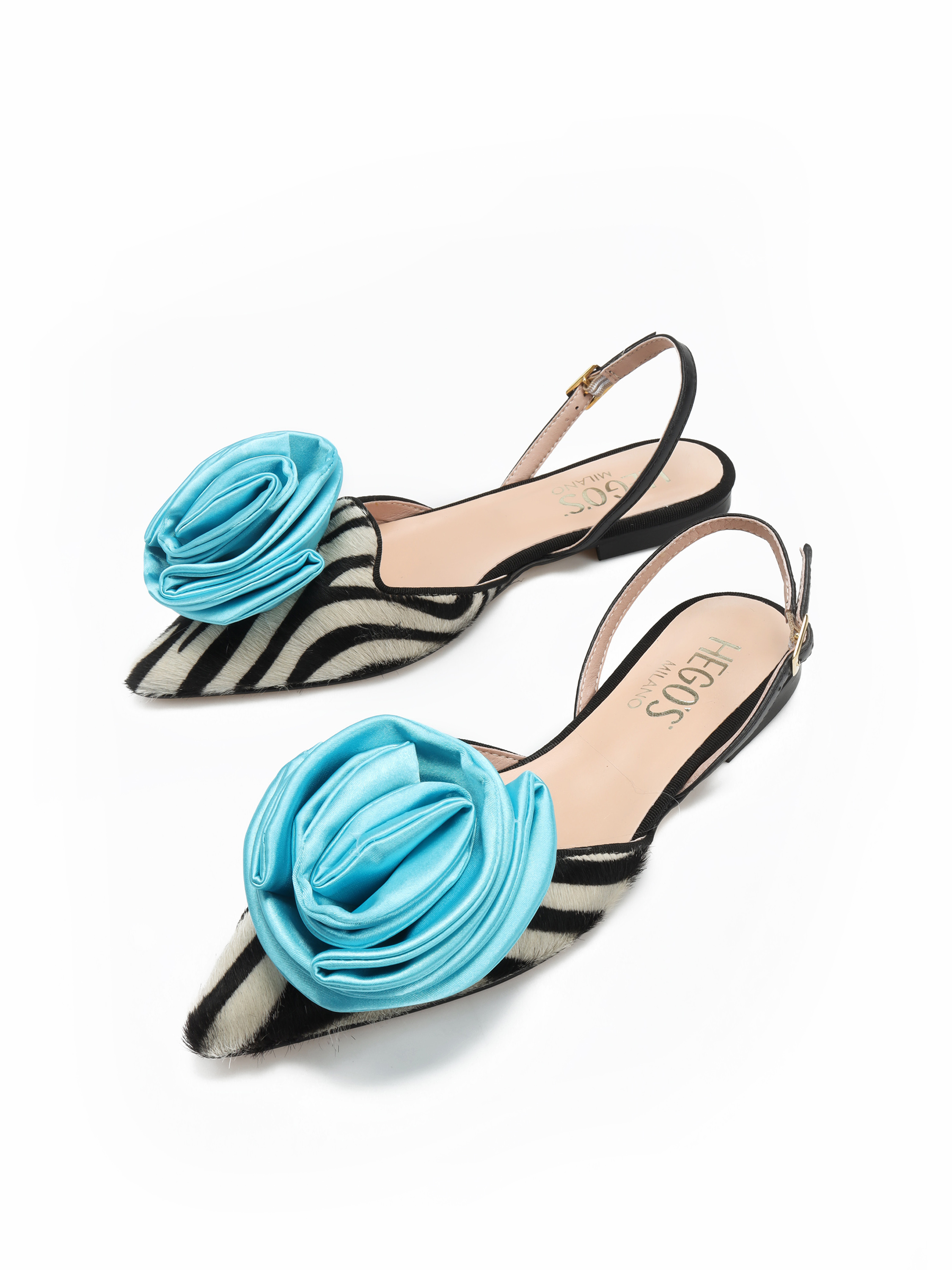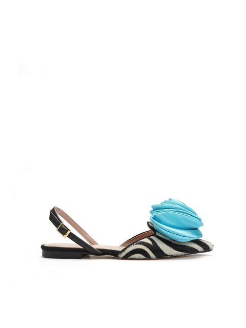 Ogważne baleriny czarno-biały zwierzęcy PRINT, ozdobione dużym turkusowym kwiatem. Model z Limitowanej Kolekcji FELICITA.