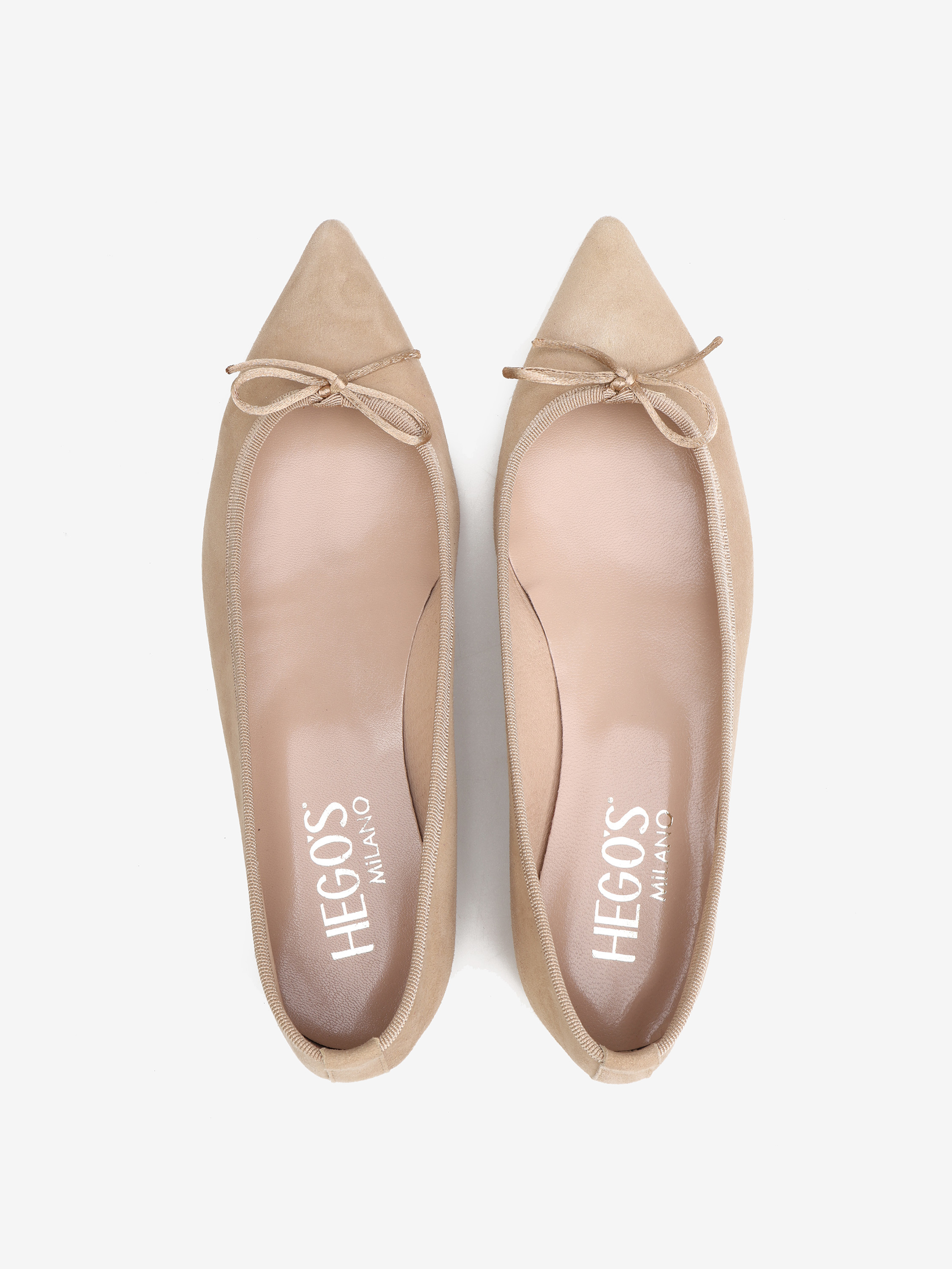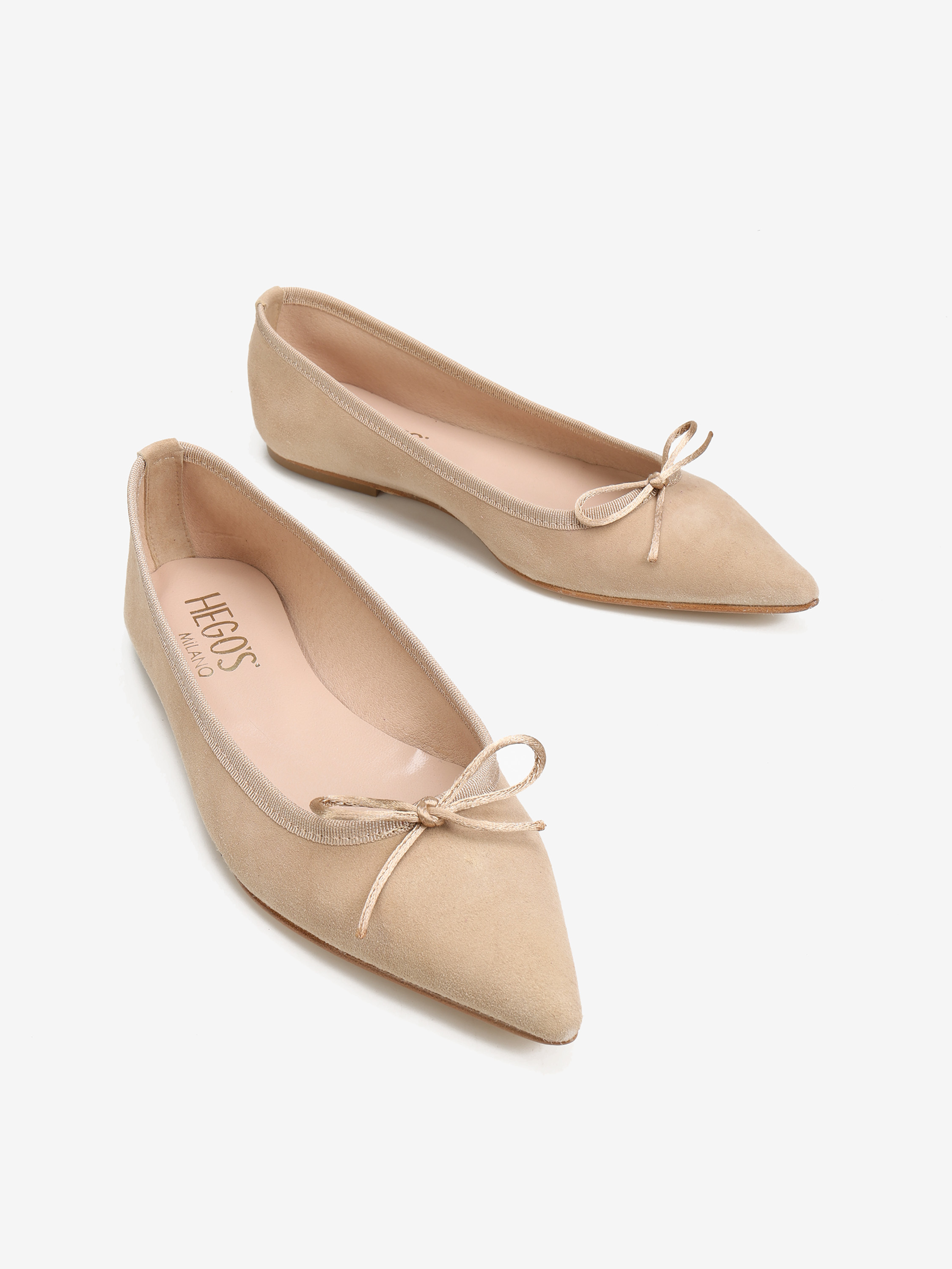 Baleriny z noskiem w szpic wykonane z modnego w tym sezonie zamszu. Wiązana kokardka umożliwia regulację dopasowania.