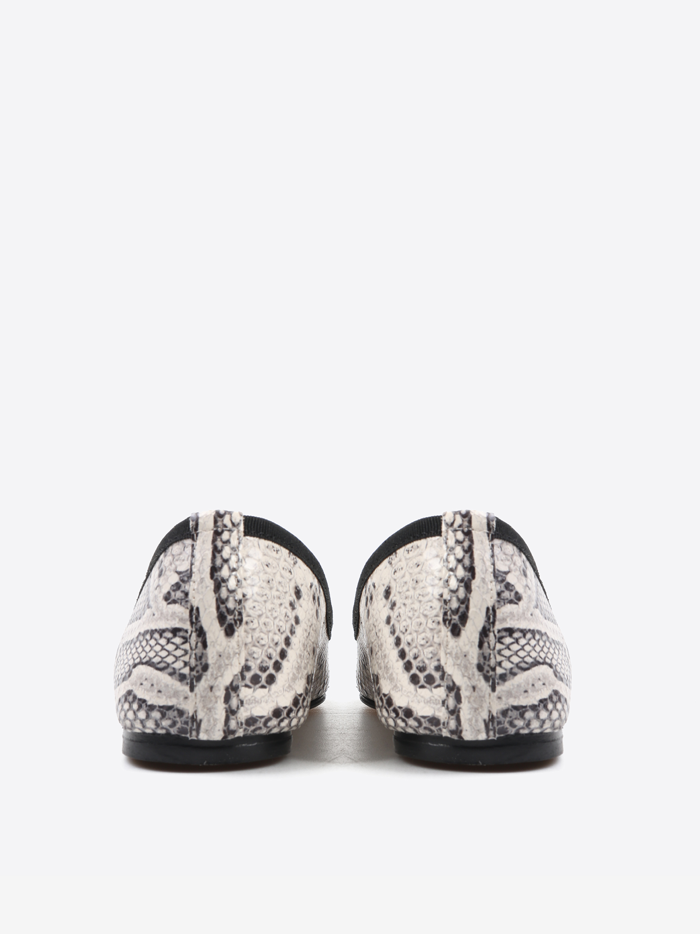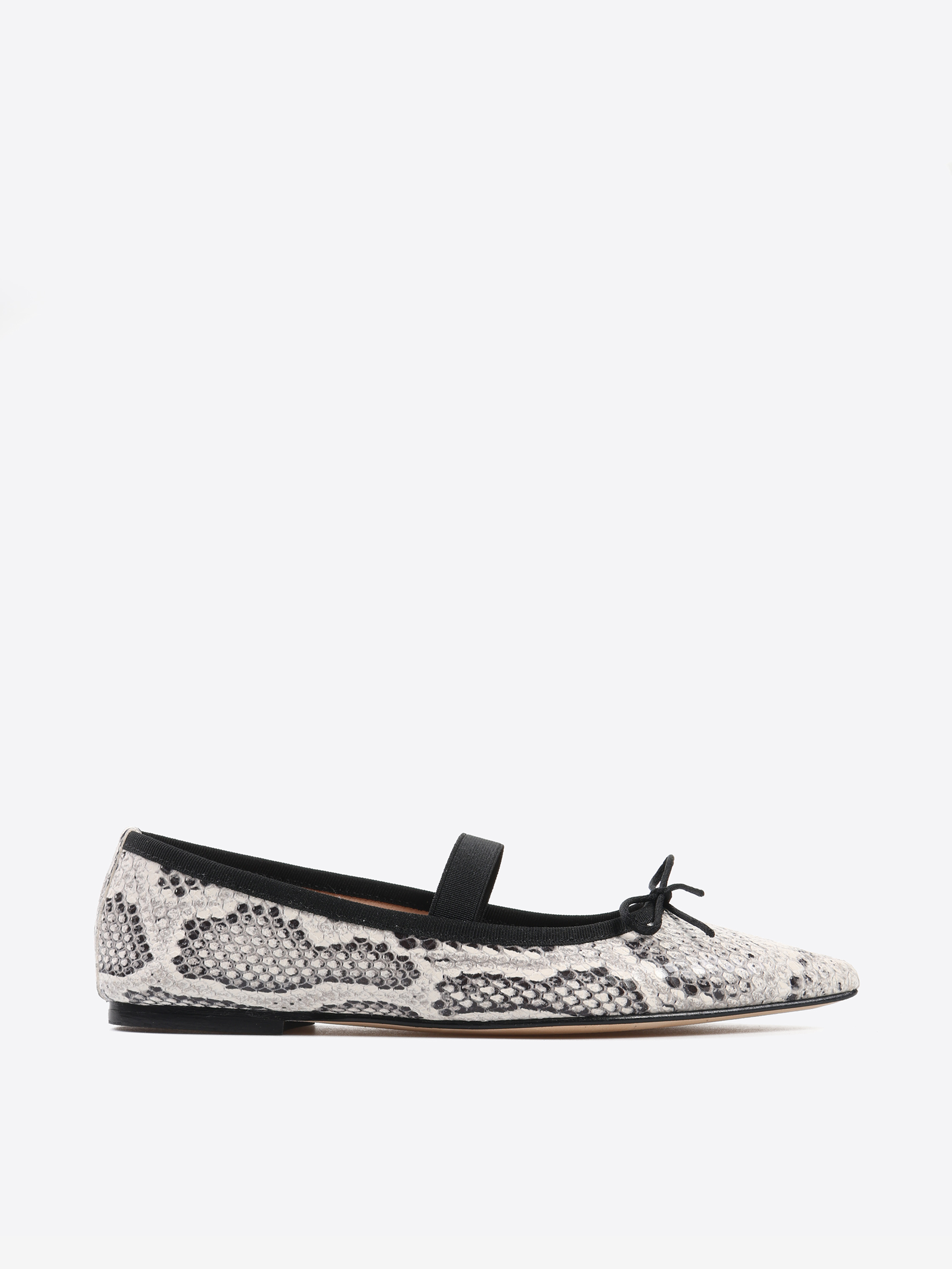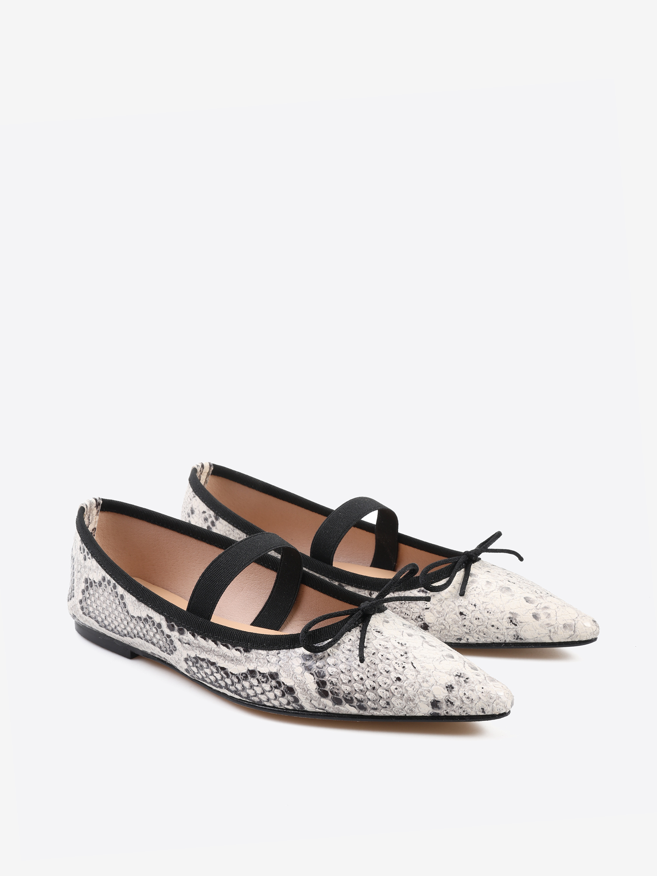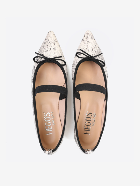 Baleriny w wężowy wzór, noskiem w szpi i gumką na podbiciu. Wiązana kokardka umożliwia regulację dopasowania.