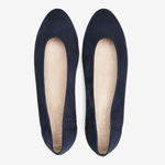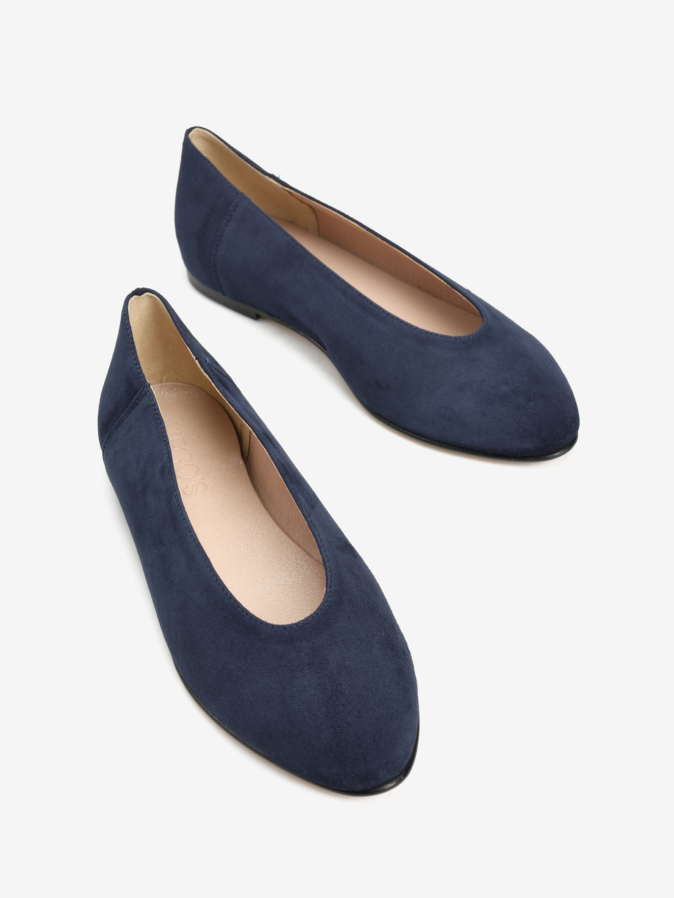 Proste baleriny z owalnym wycięciem i zabudowanymi brzegami na skórzanej podeszwie, wykonane z modnego w tym sezonie zamszu.