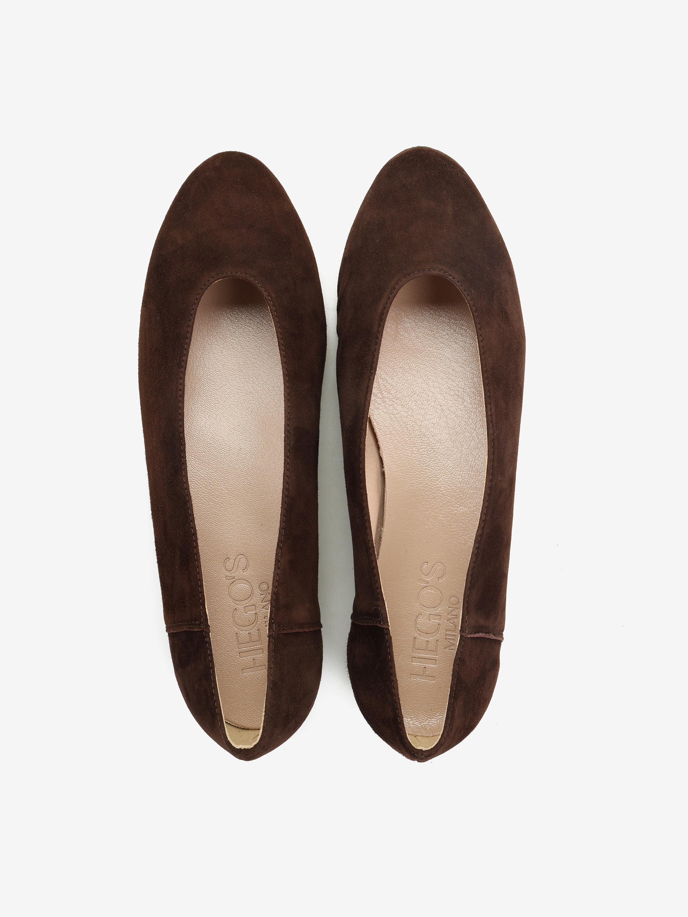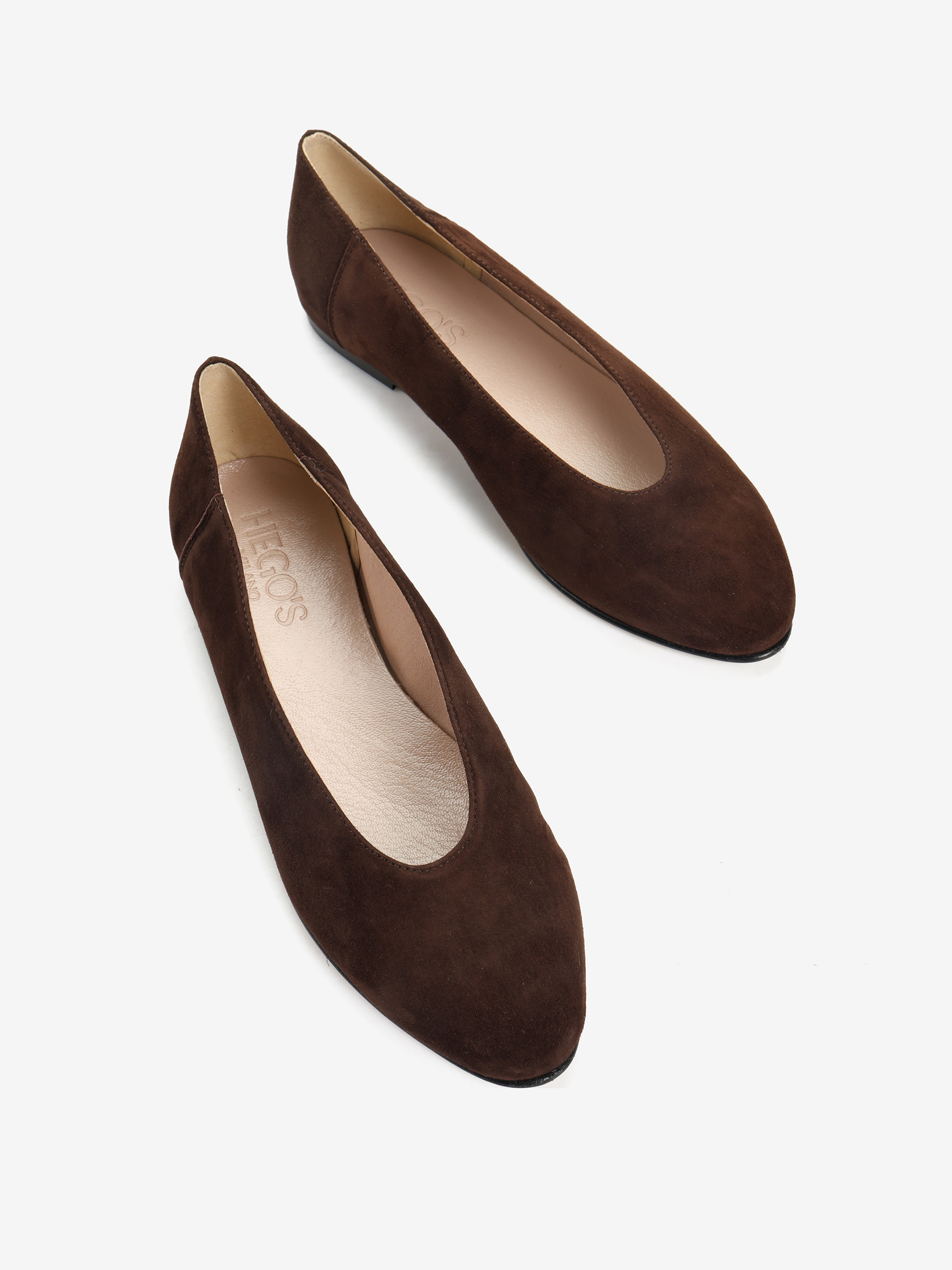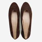Proste baleriny z owalnym wycięciem i zabudowanymi brzegami na skórzanej podeszwie, wykonane z modnego w tym sezonie zamszu.