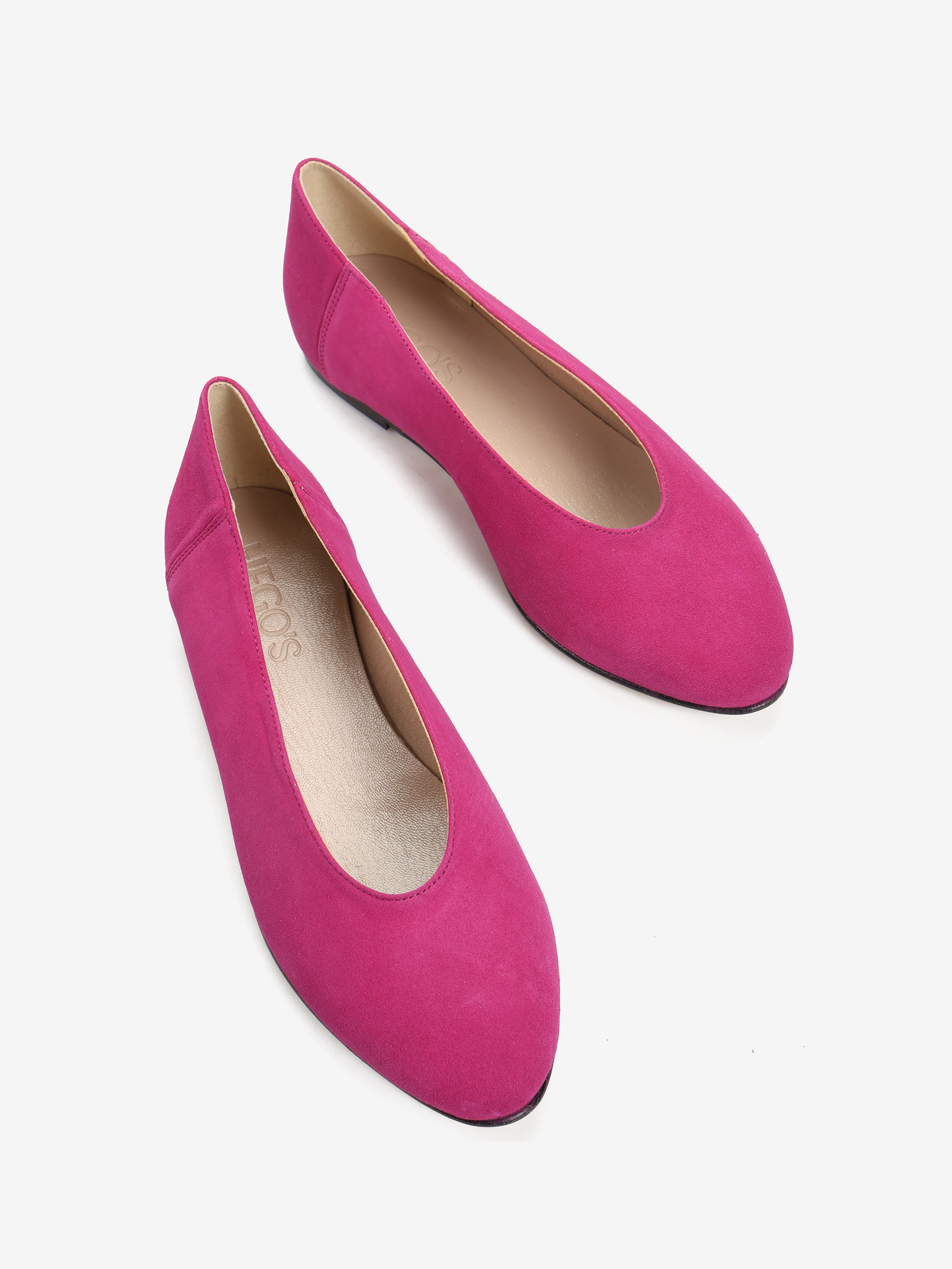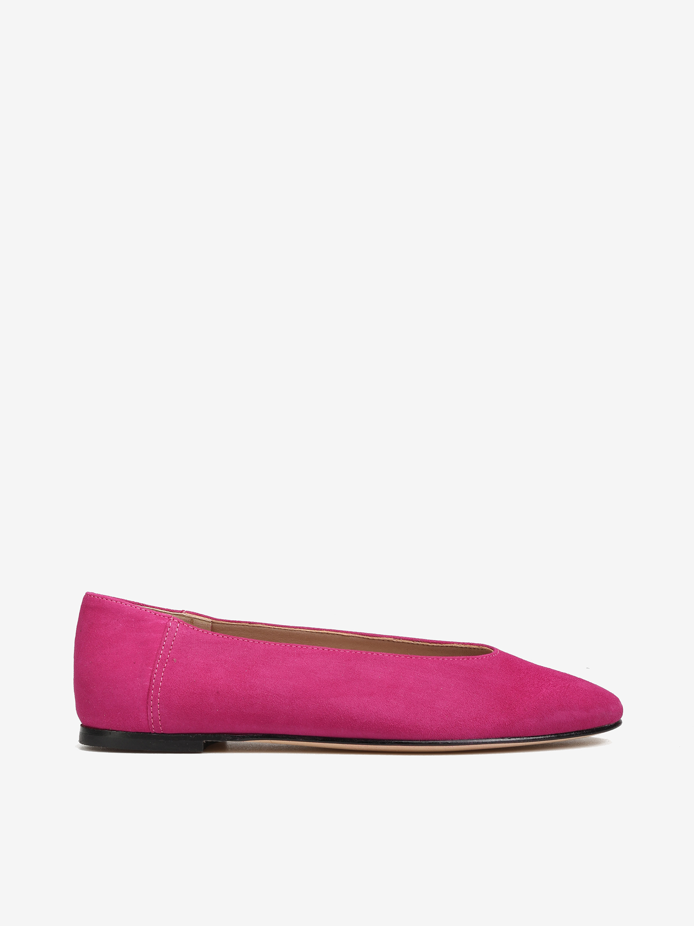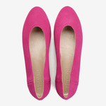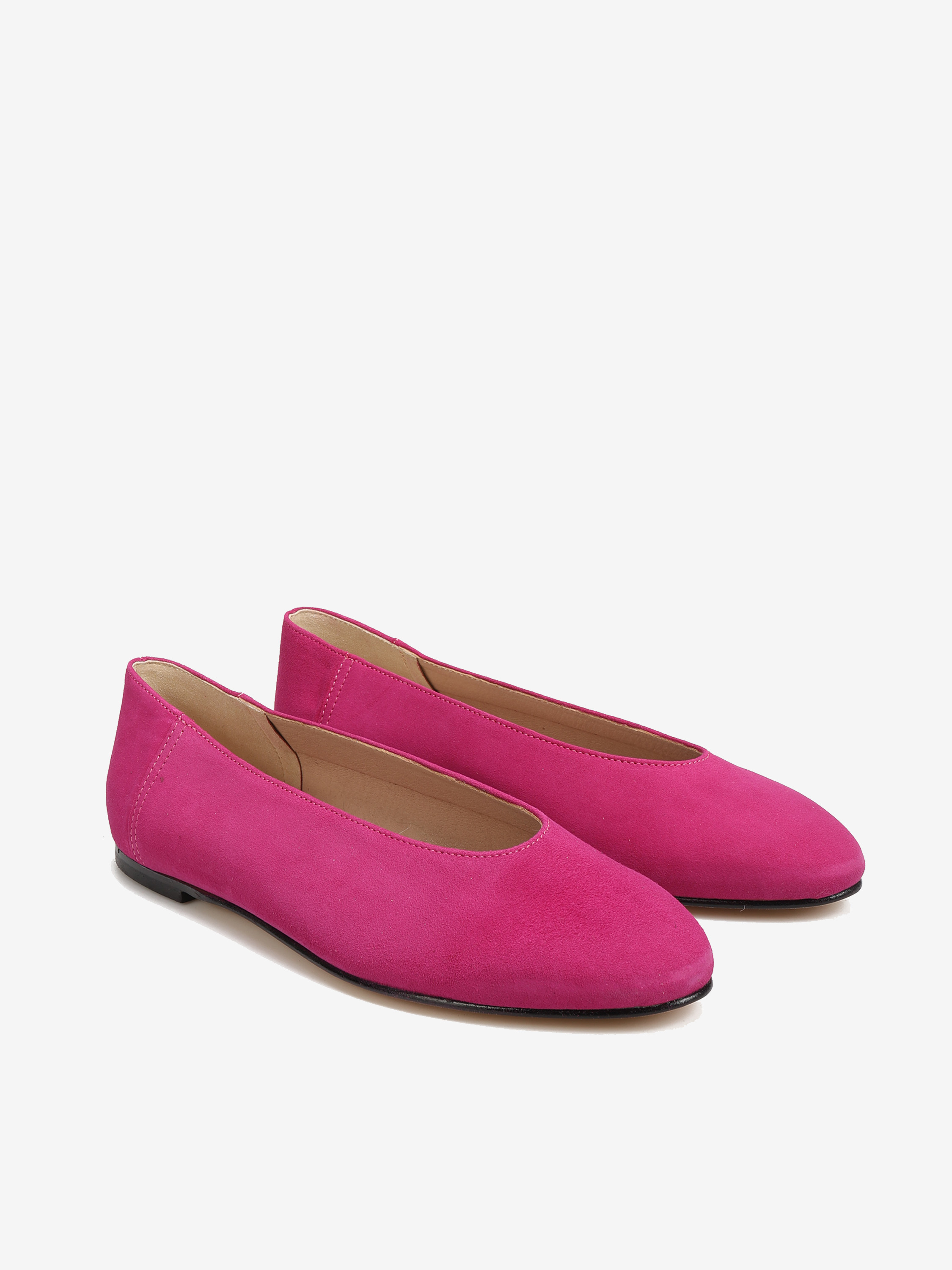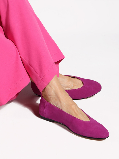 Proste baleriny z owalnym wycięciem i zabudowanymi brzegami na skórzanej podeszwie, wykonane z modnego w tym sezonie zamszu.