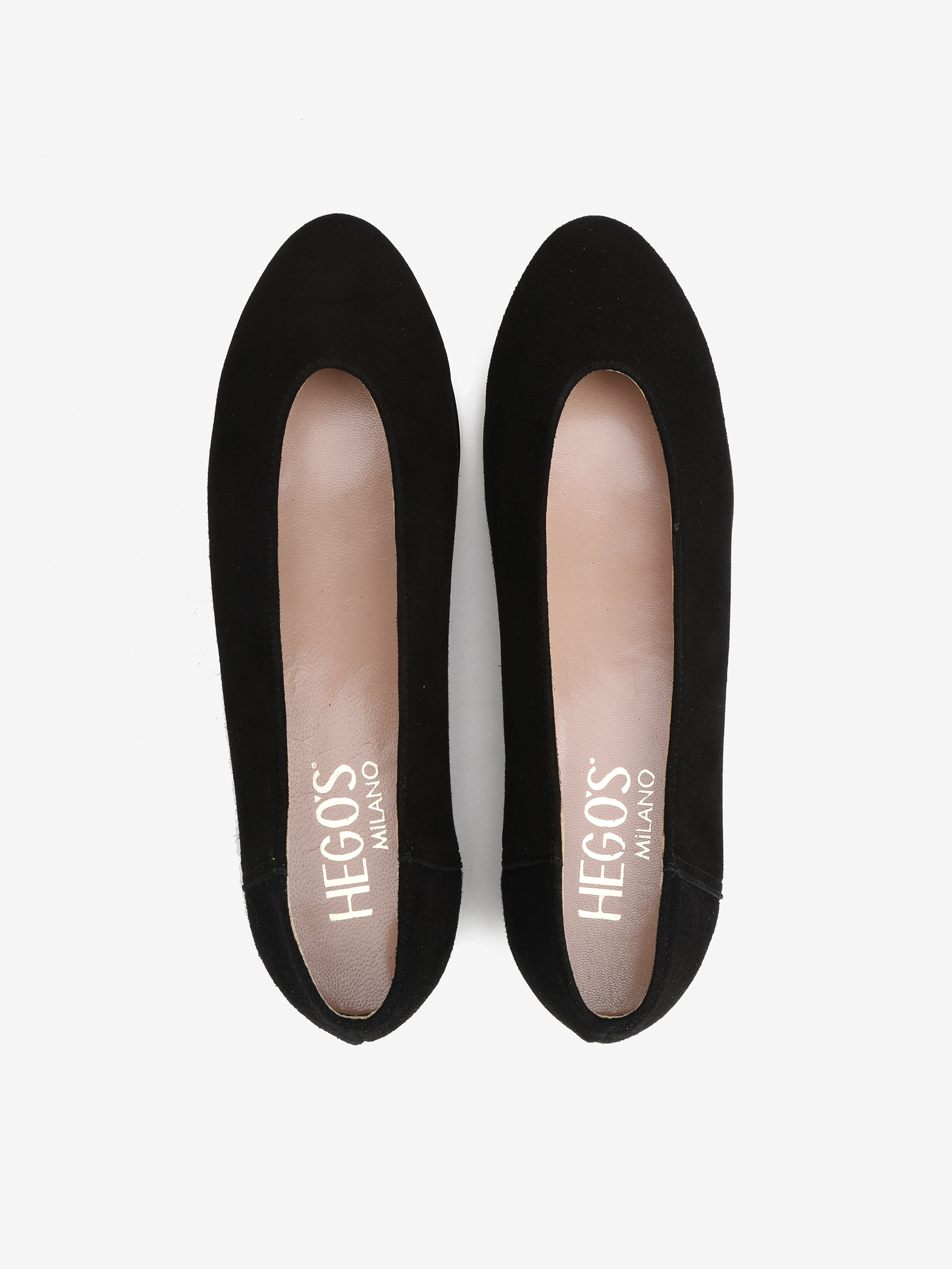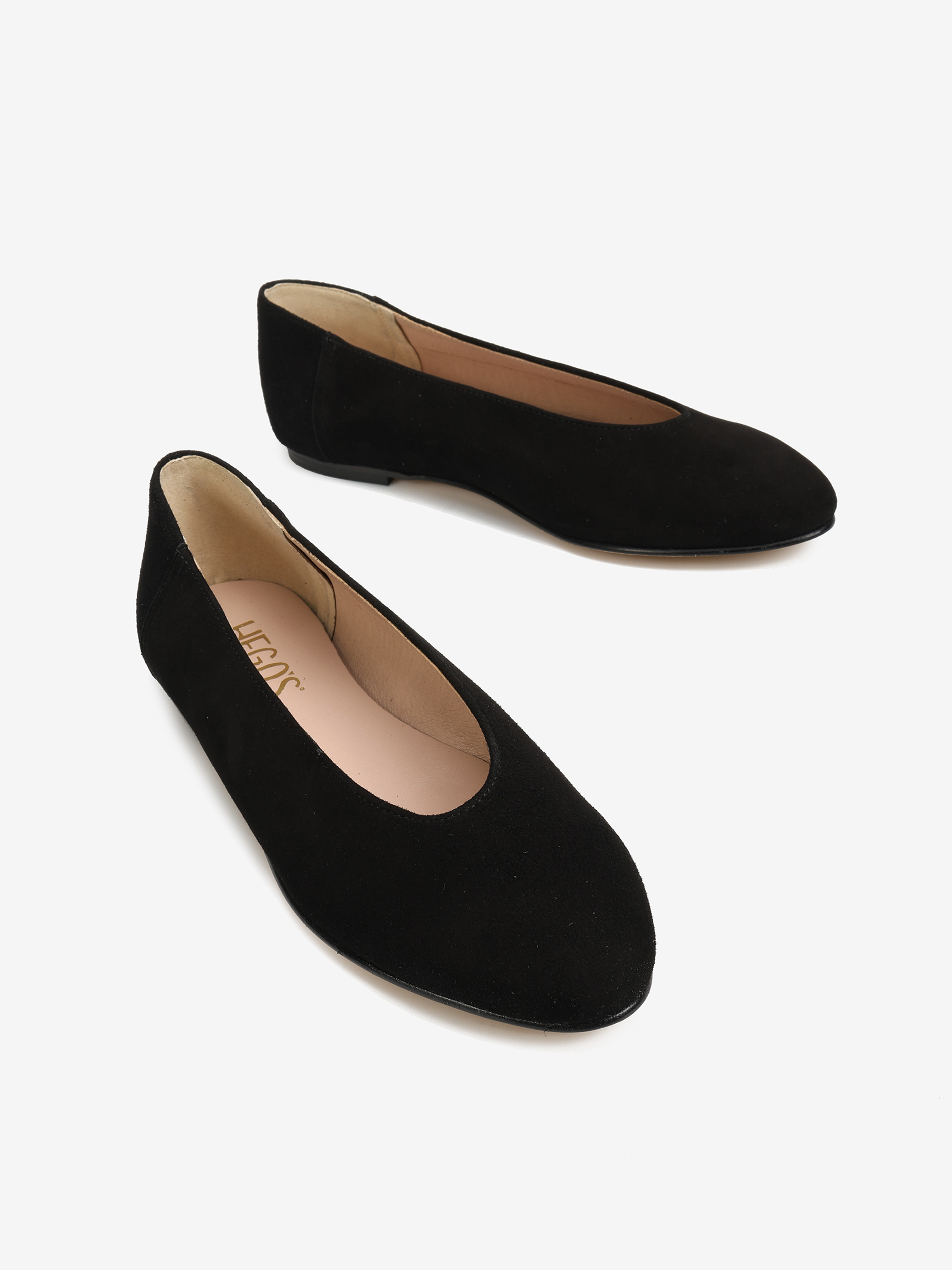 Proste baleriny z owalnym wycięciem i zabudowanymi brzegami na skórzanej podeszwie, wykonane z modnego w tym sezonie zamszu.