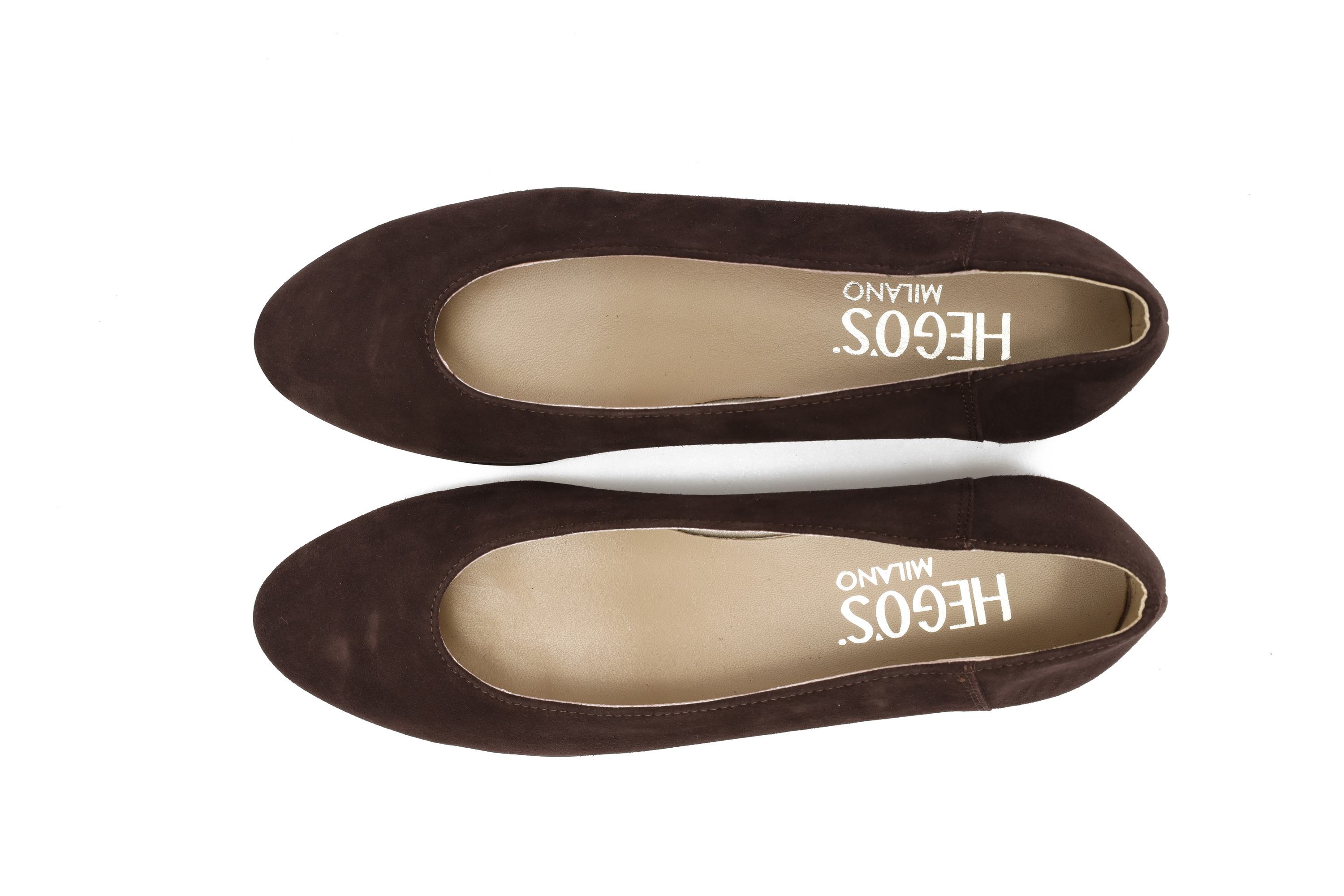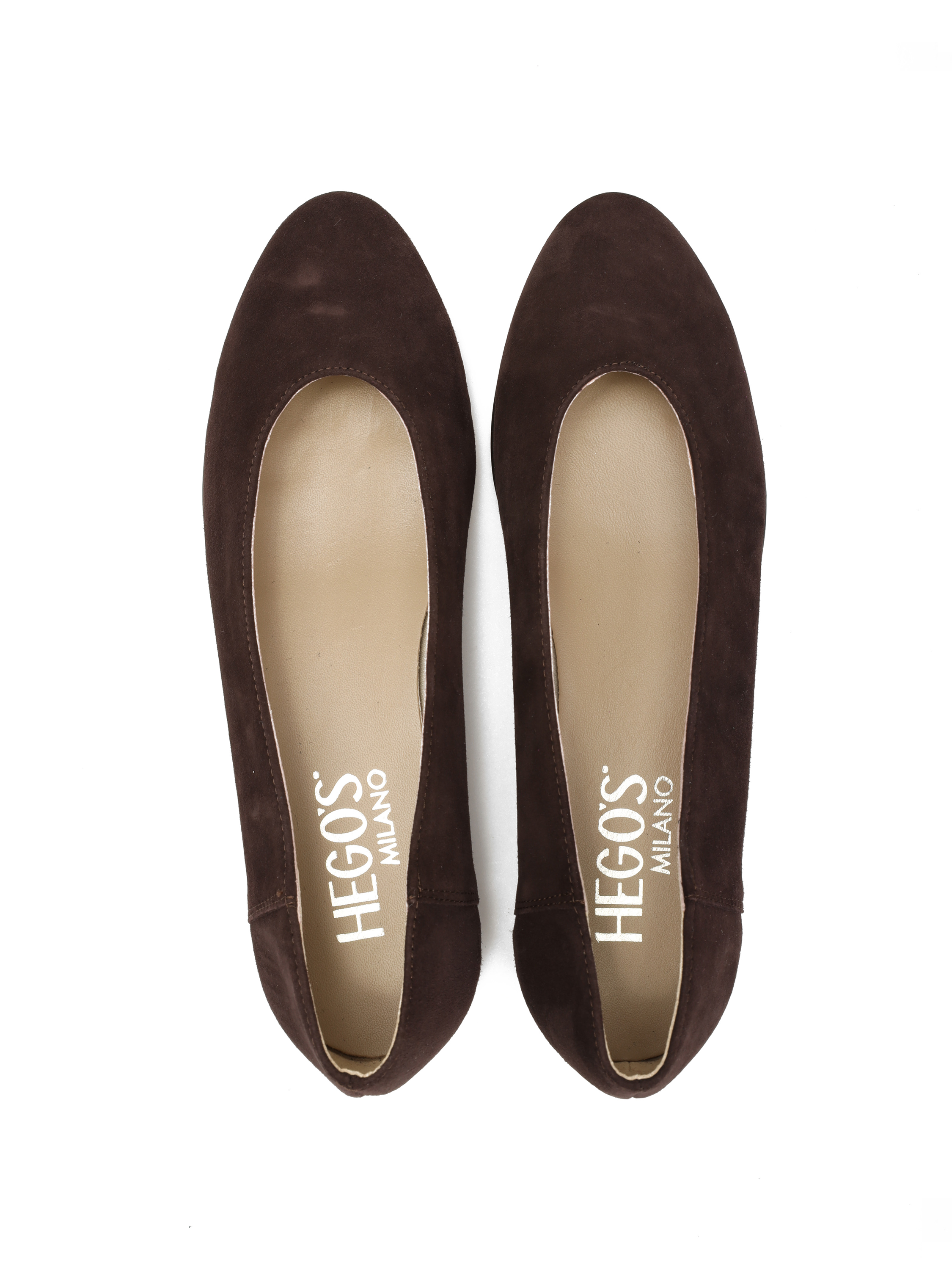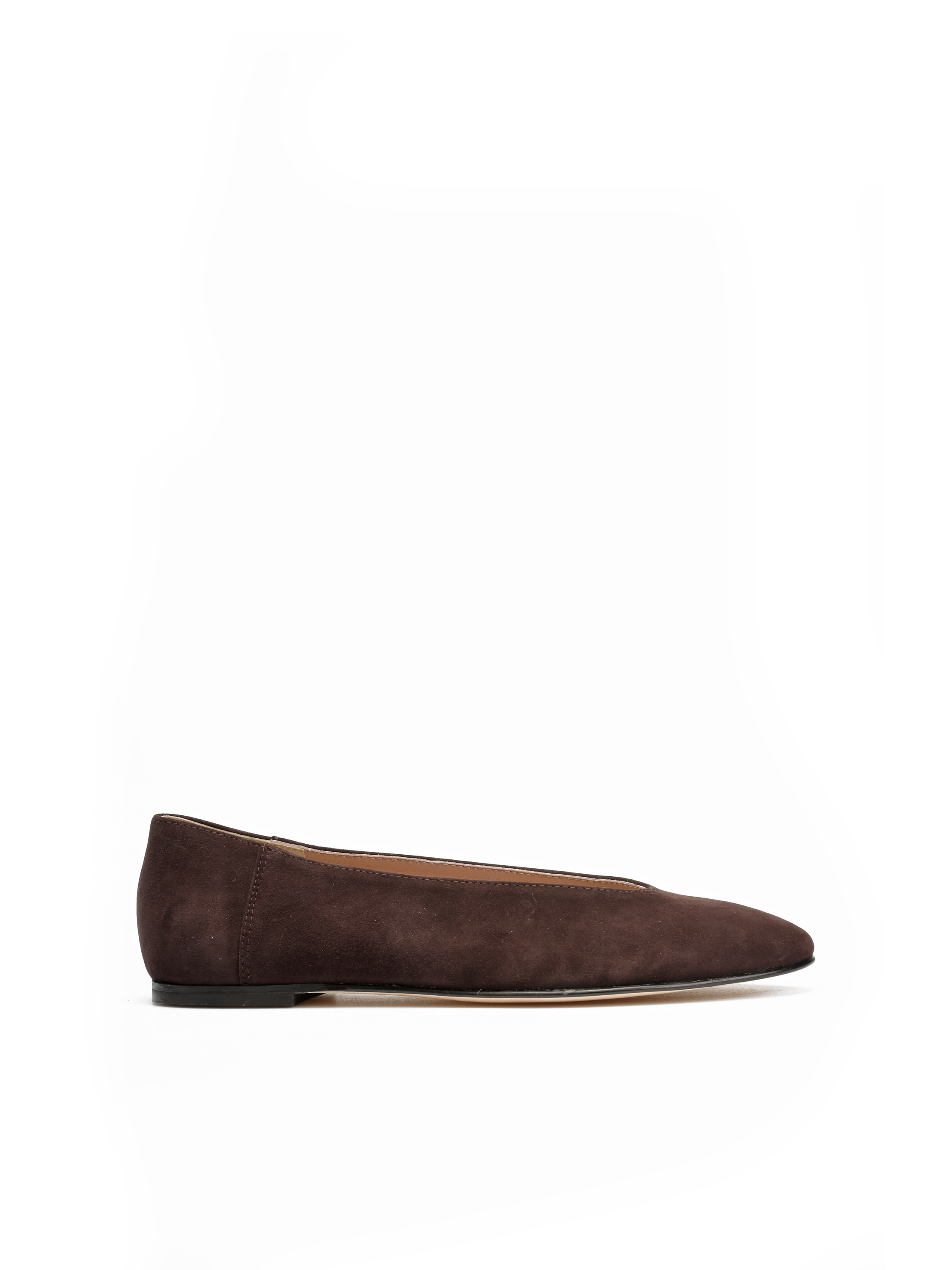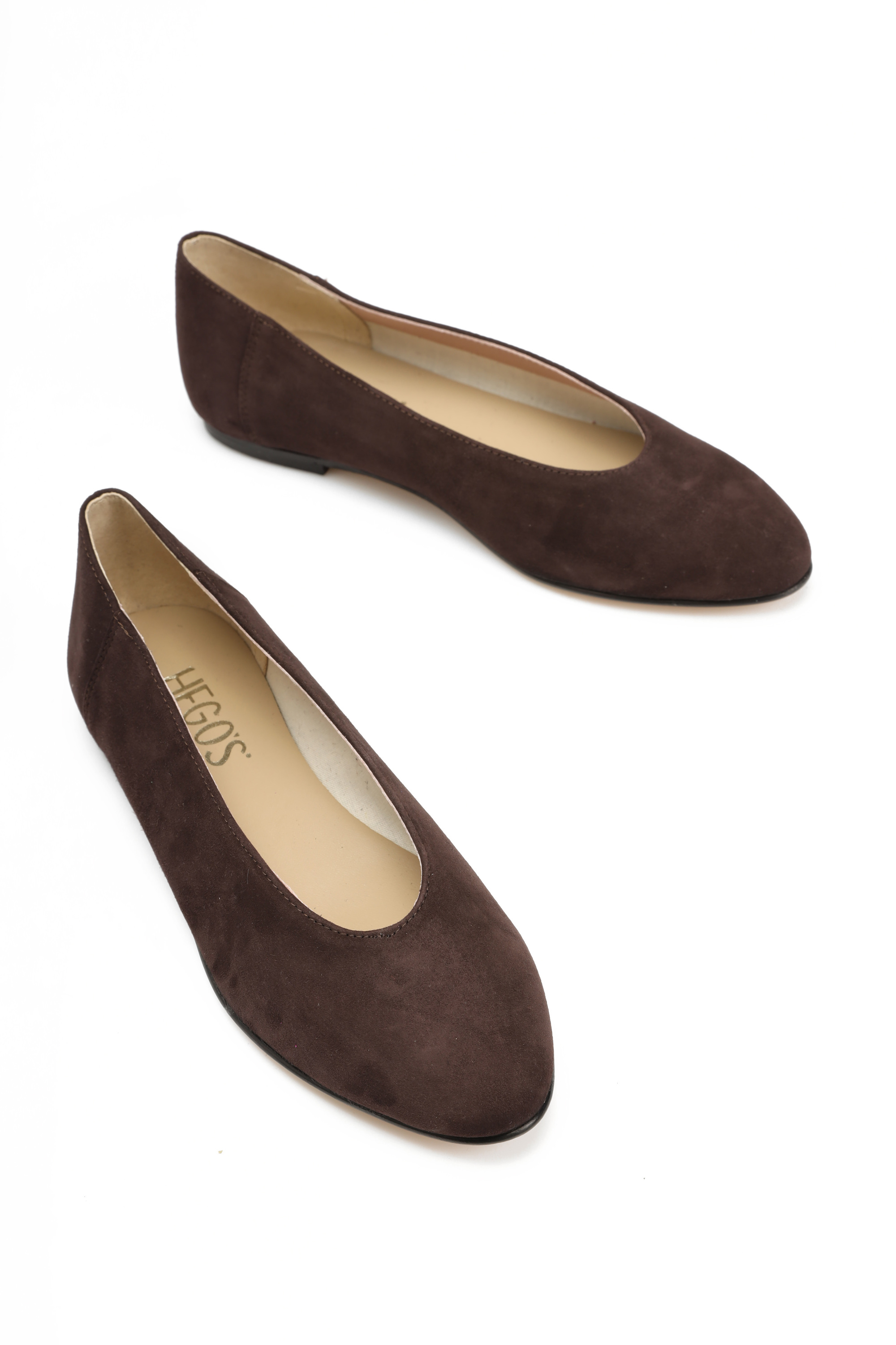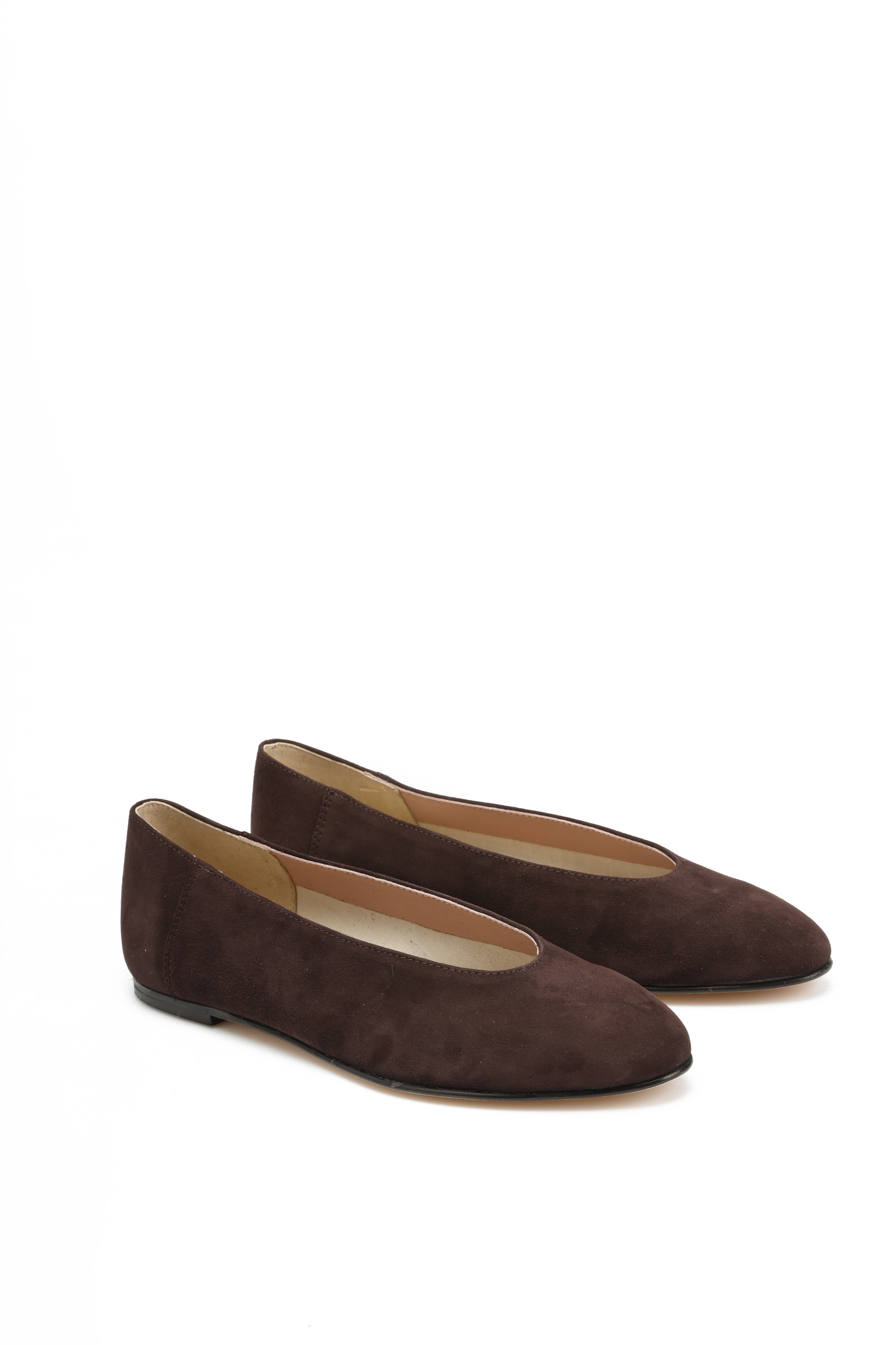 Proste baleriny z owalnym wycięciem i zabudowanymi brzegami na skórzanej podeszwie, wykonane z modnego w tym sezonie zamszu.