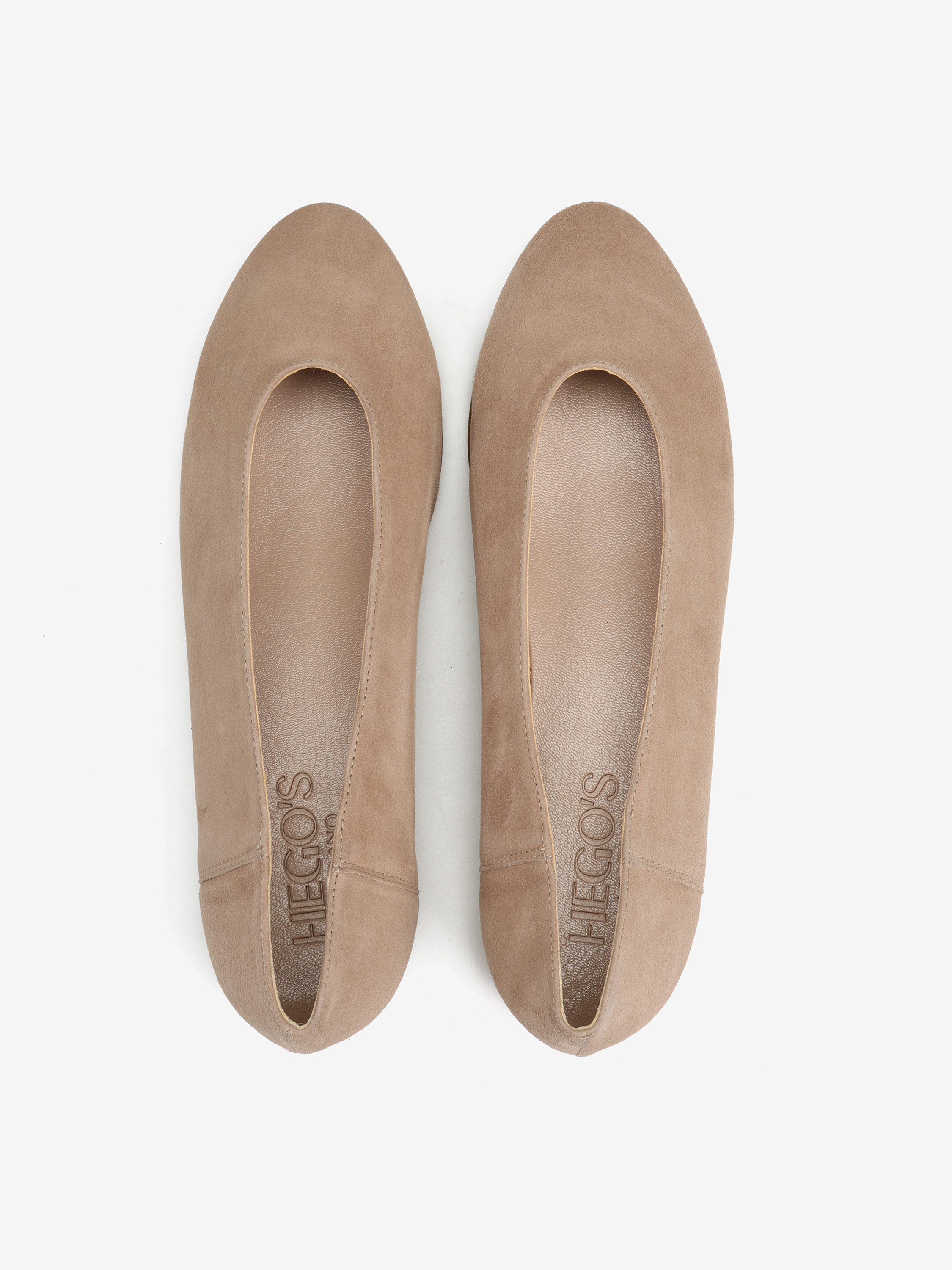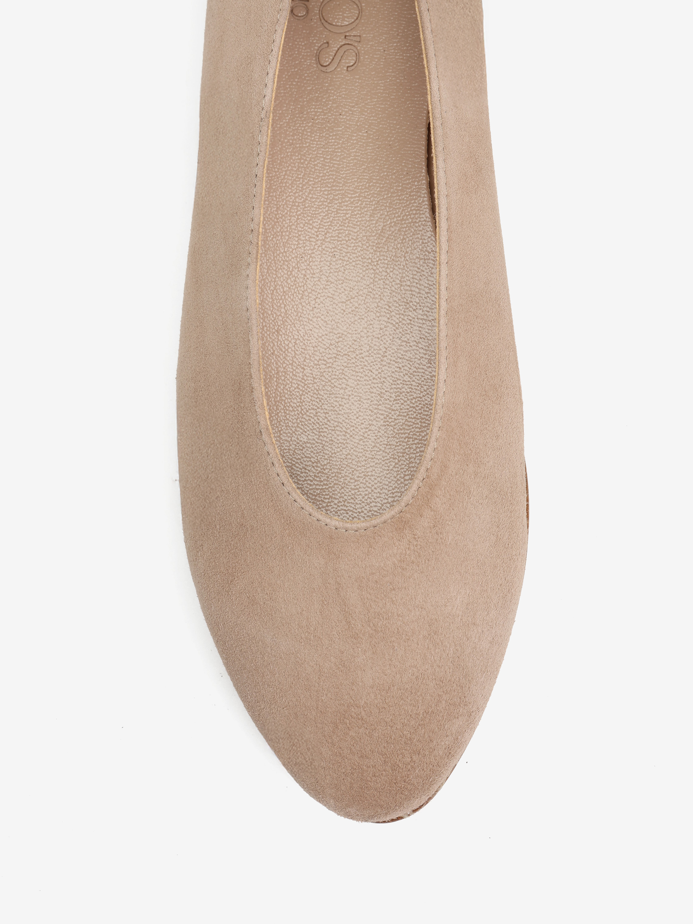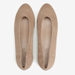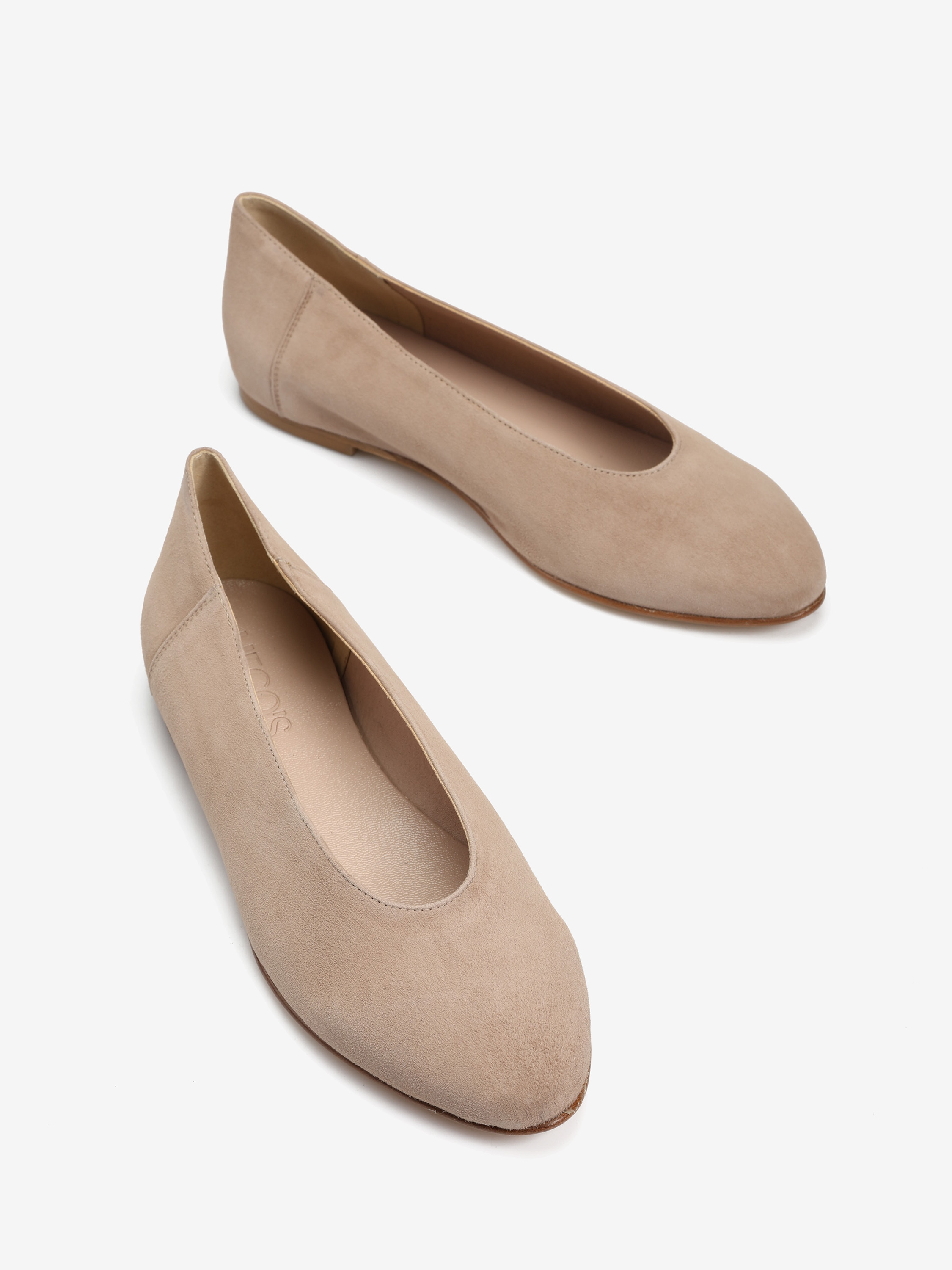 Proste baleriny z owalnym wycięciem i zabudowanymi brzegami na skórzanej podeszwie, wykonane z modnego w tym sezonie zamszu.