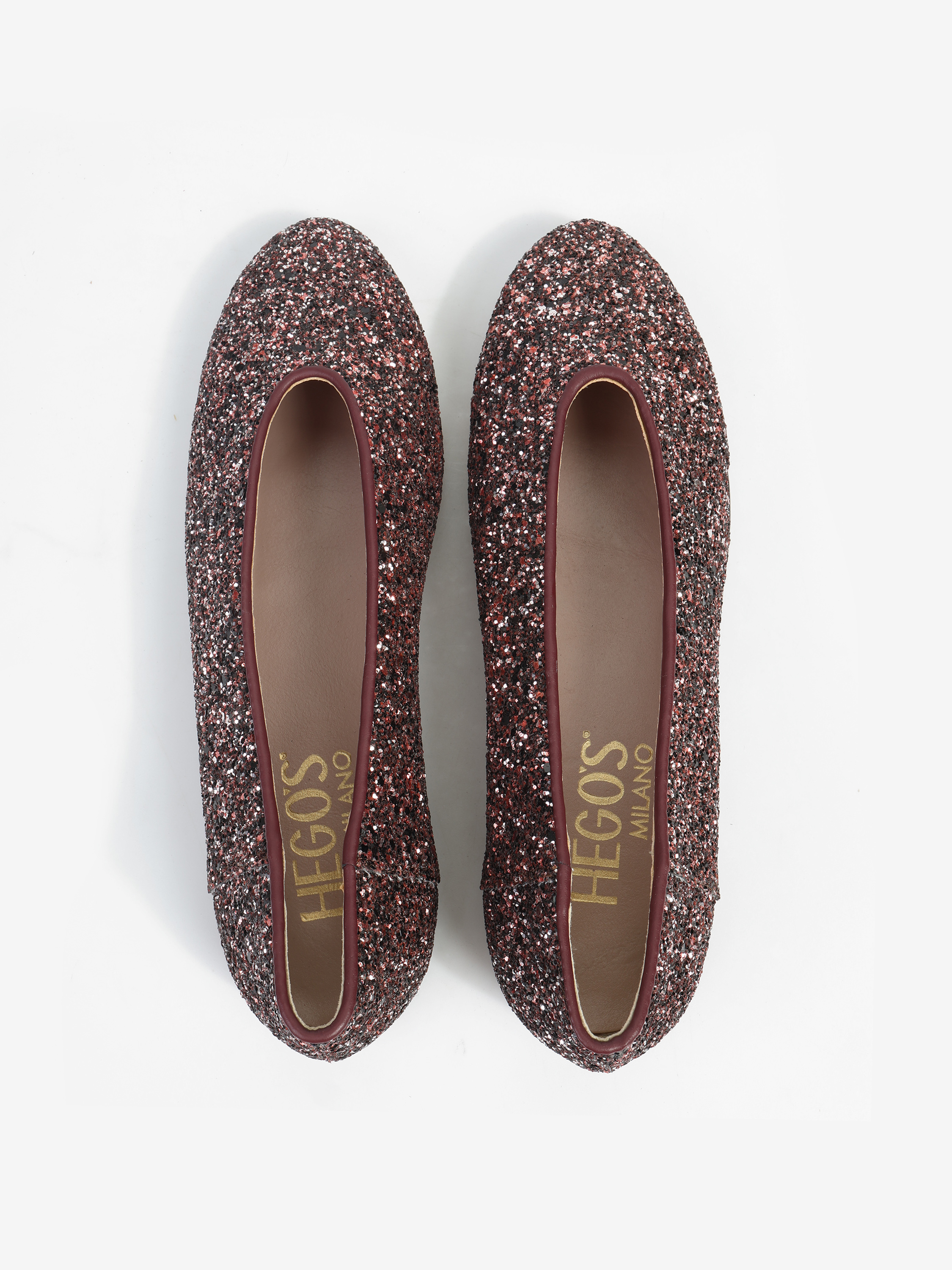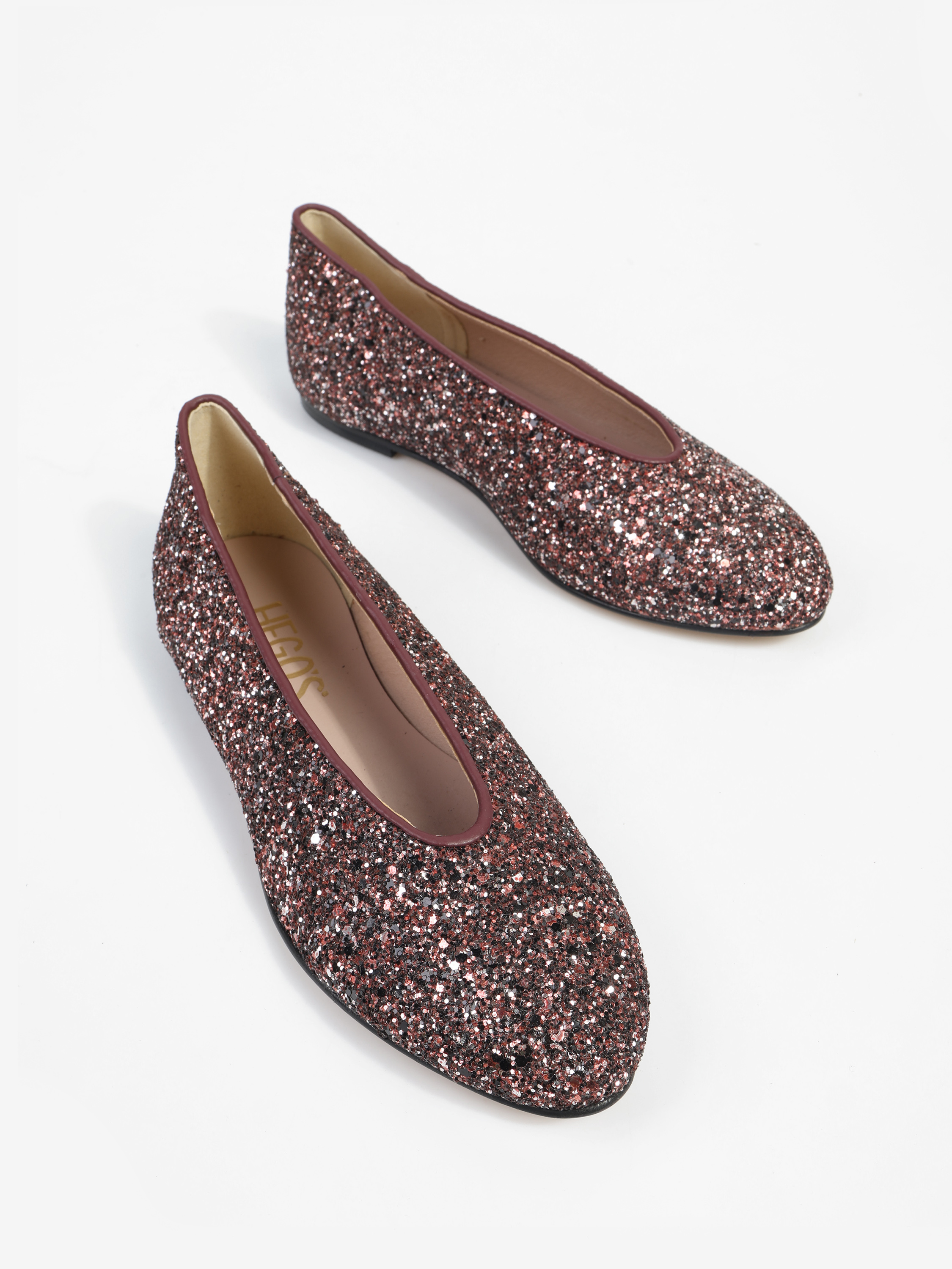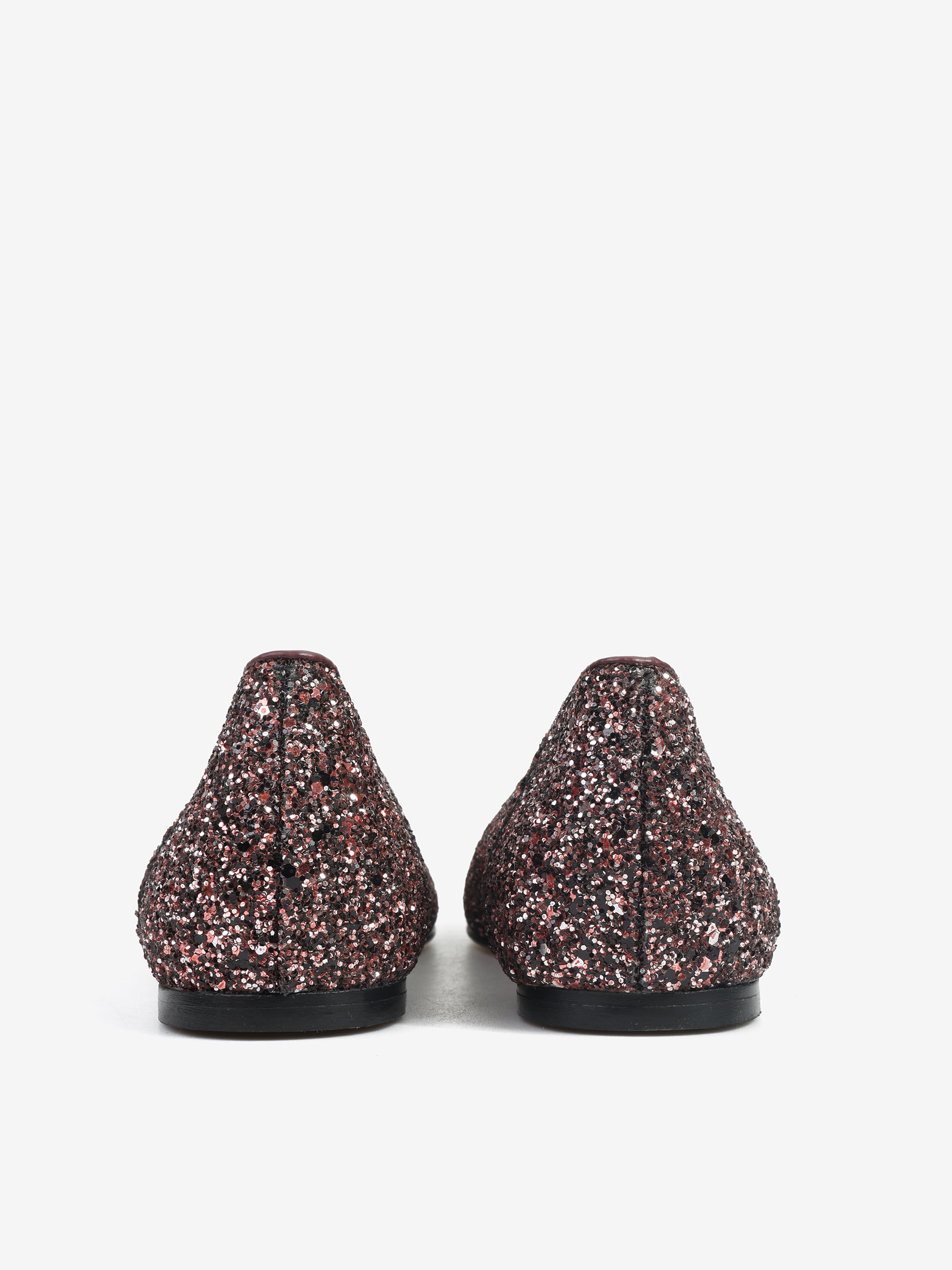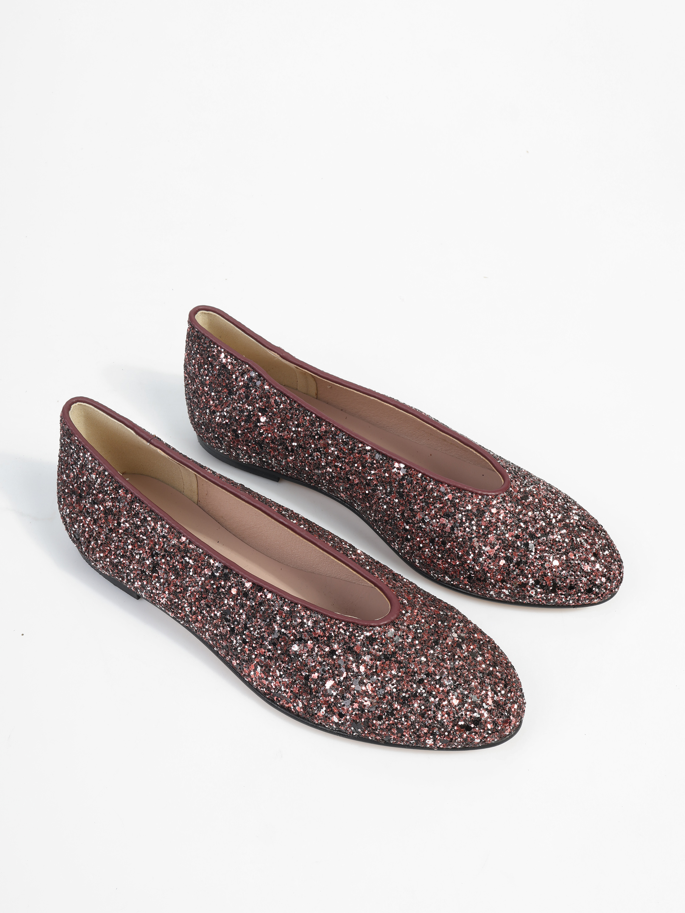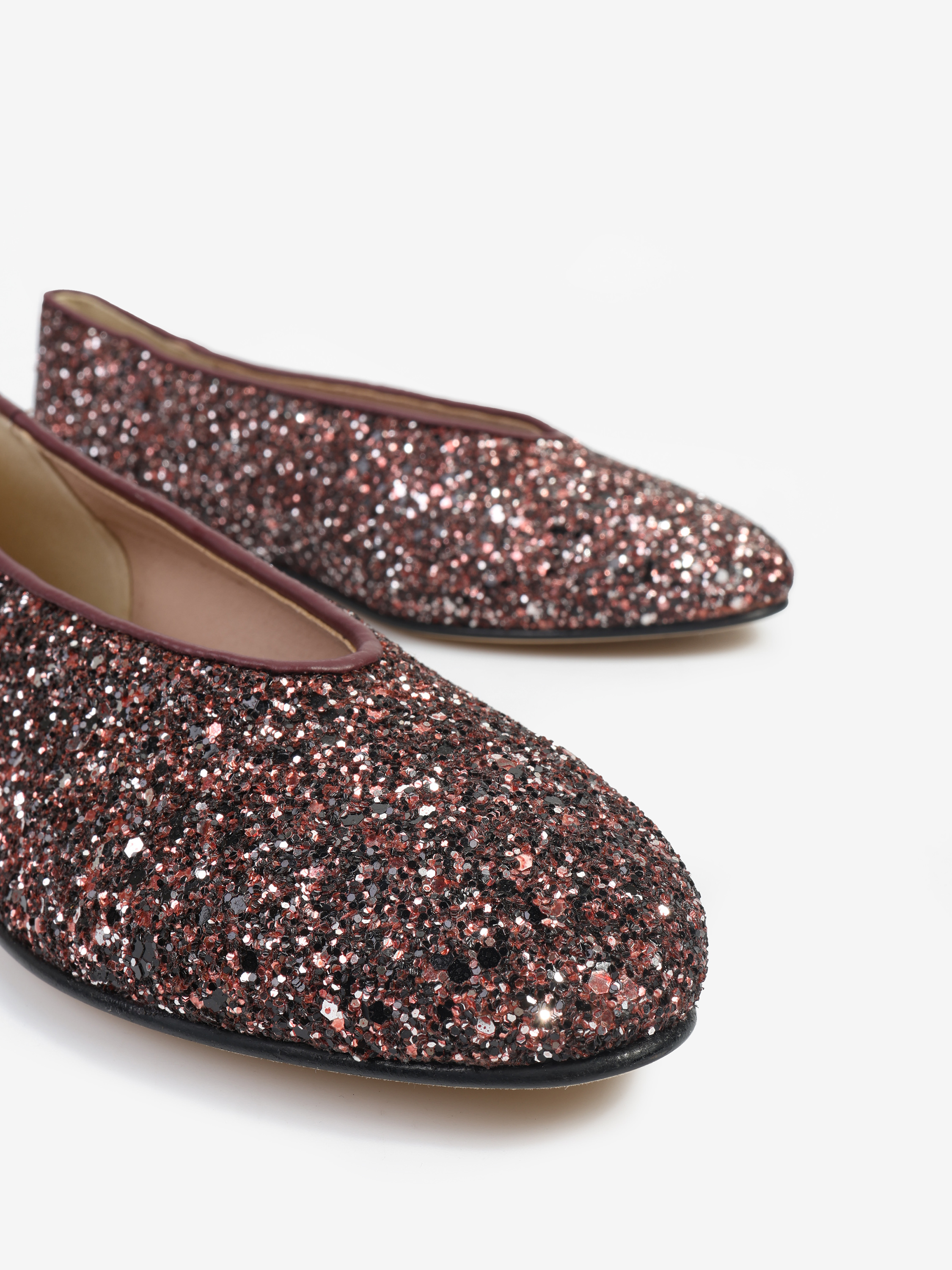 Proste baleriny z owalnym wycięciem i zabudowanymi brzegami na skórzanej podeszwie. Wykończone gruboziarnistym brokatem.