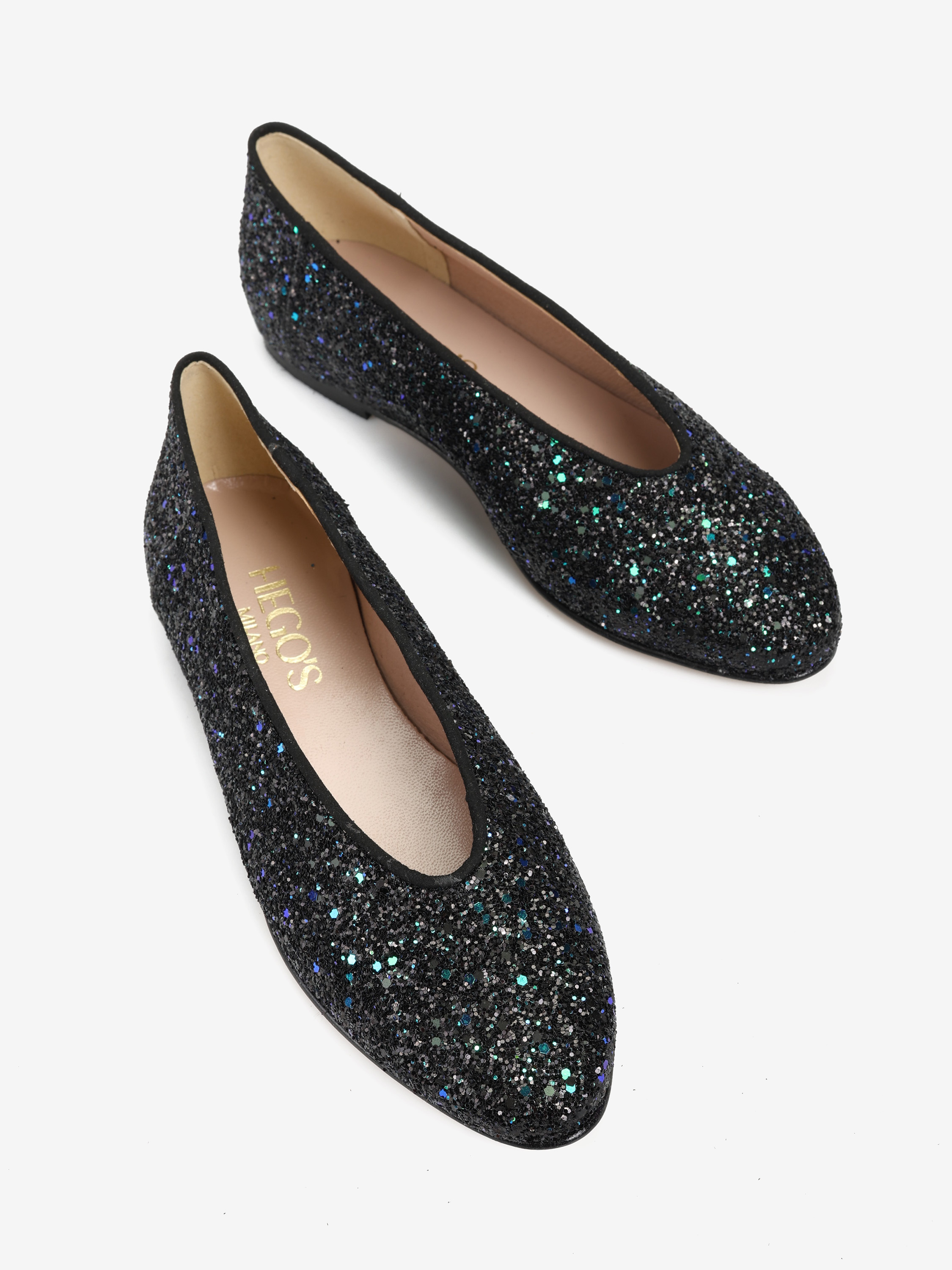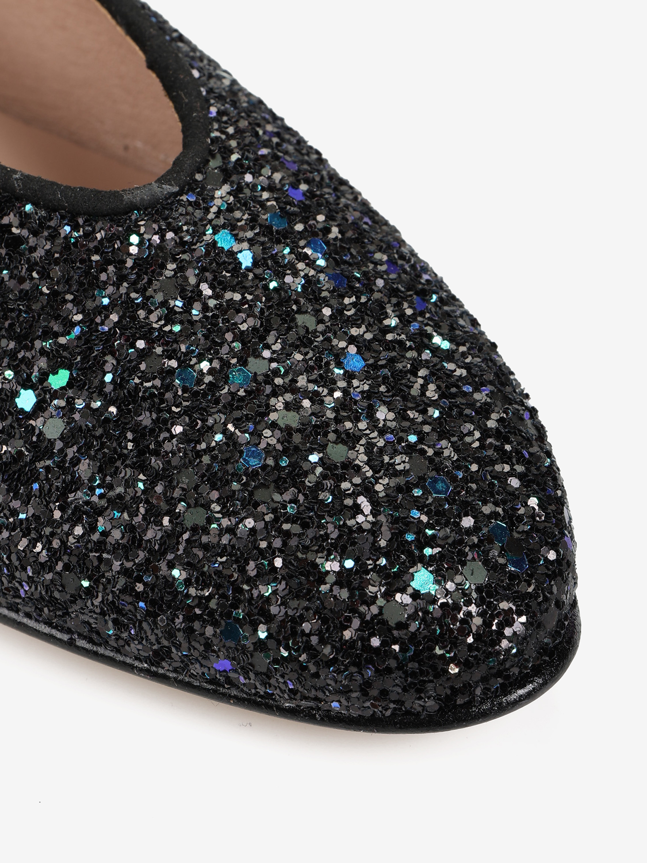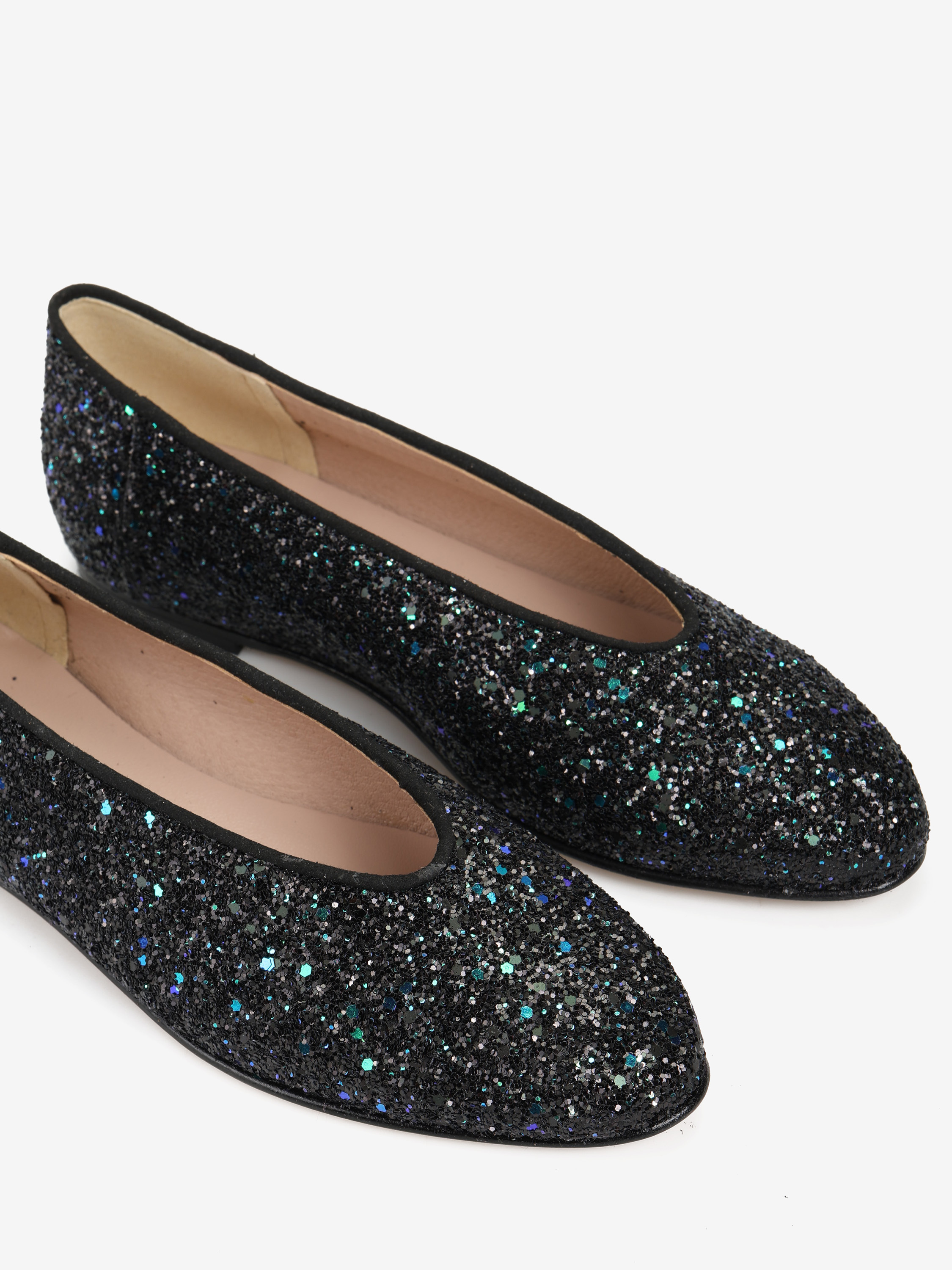 Proste baleriny z owalnym wycięciem i zabudowanymi brzegami na skórzanej podeszwie. Wykończone gruboziarnistym brokatem.