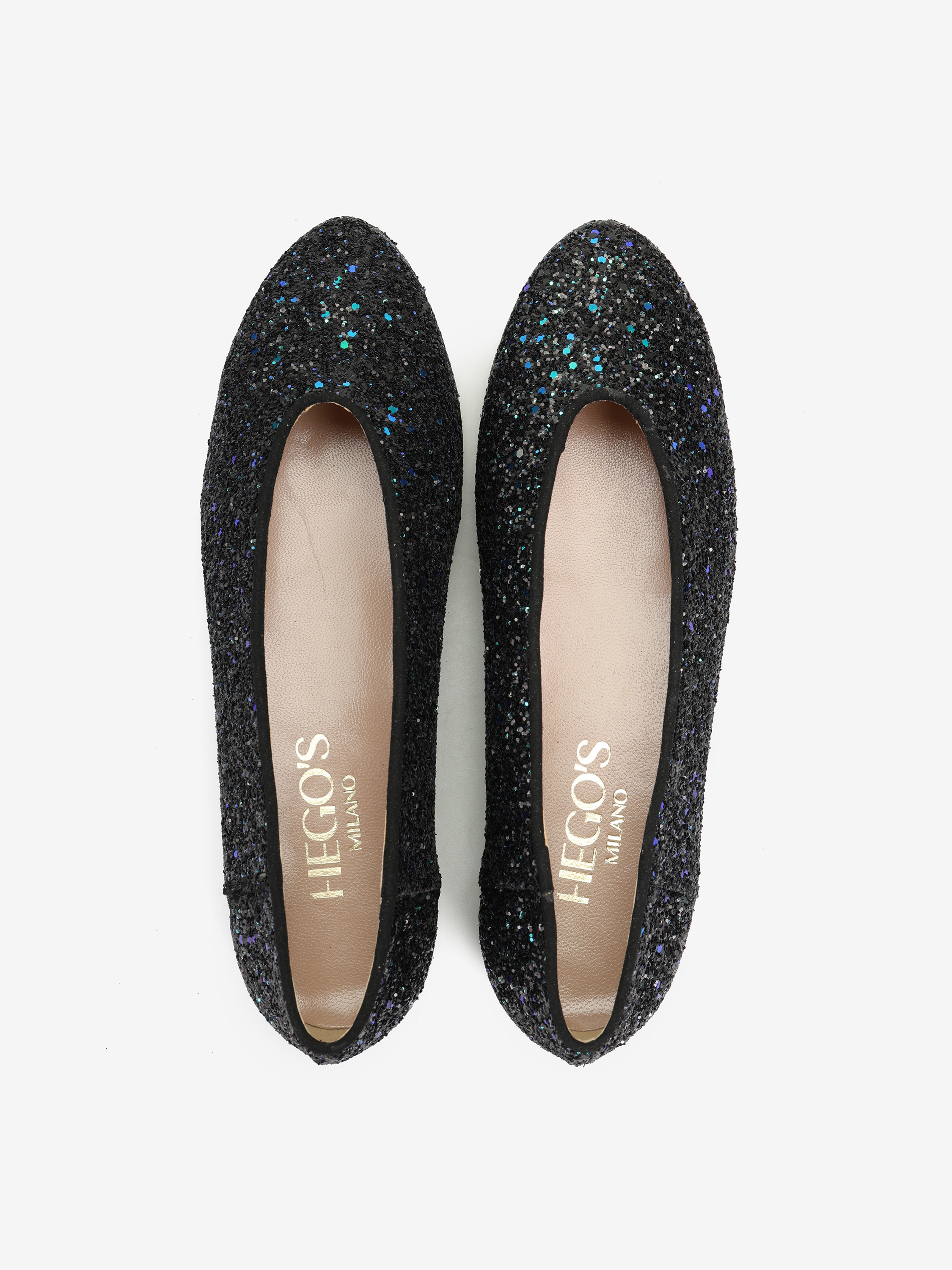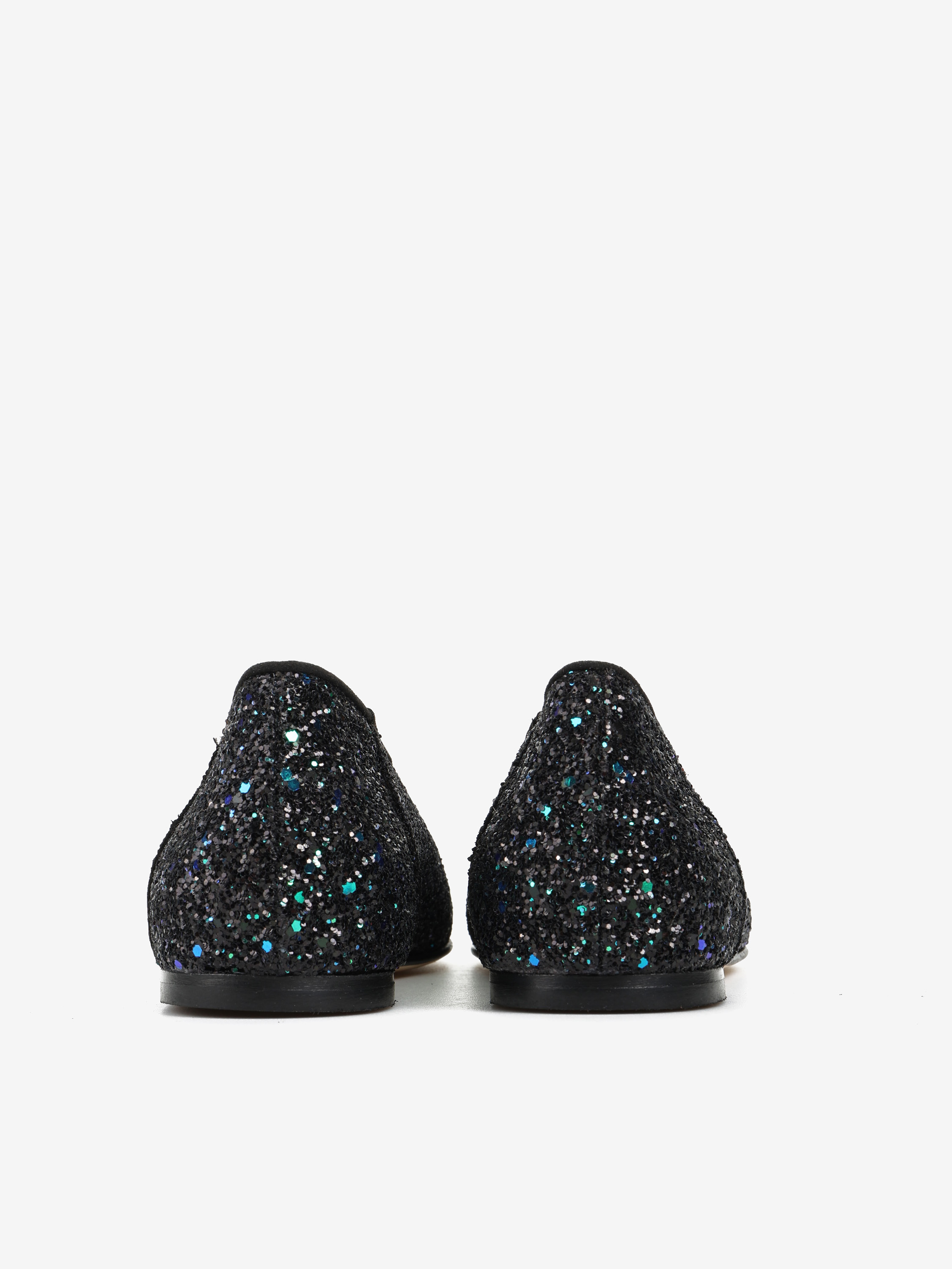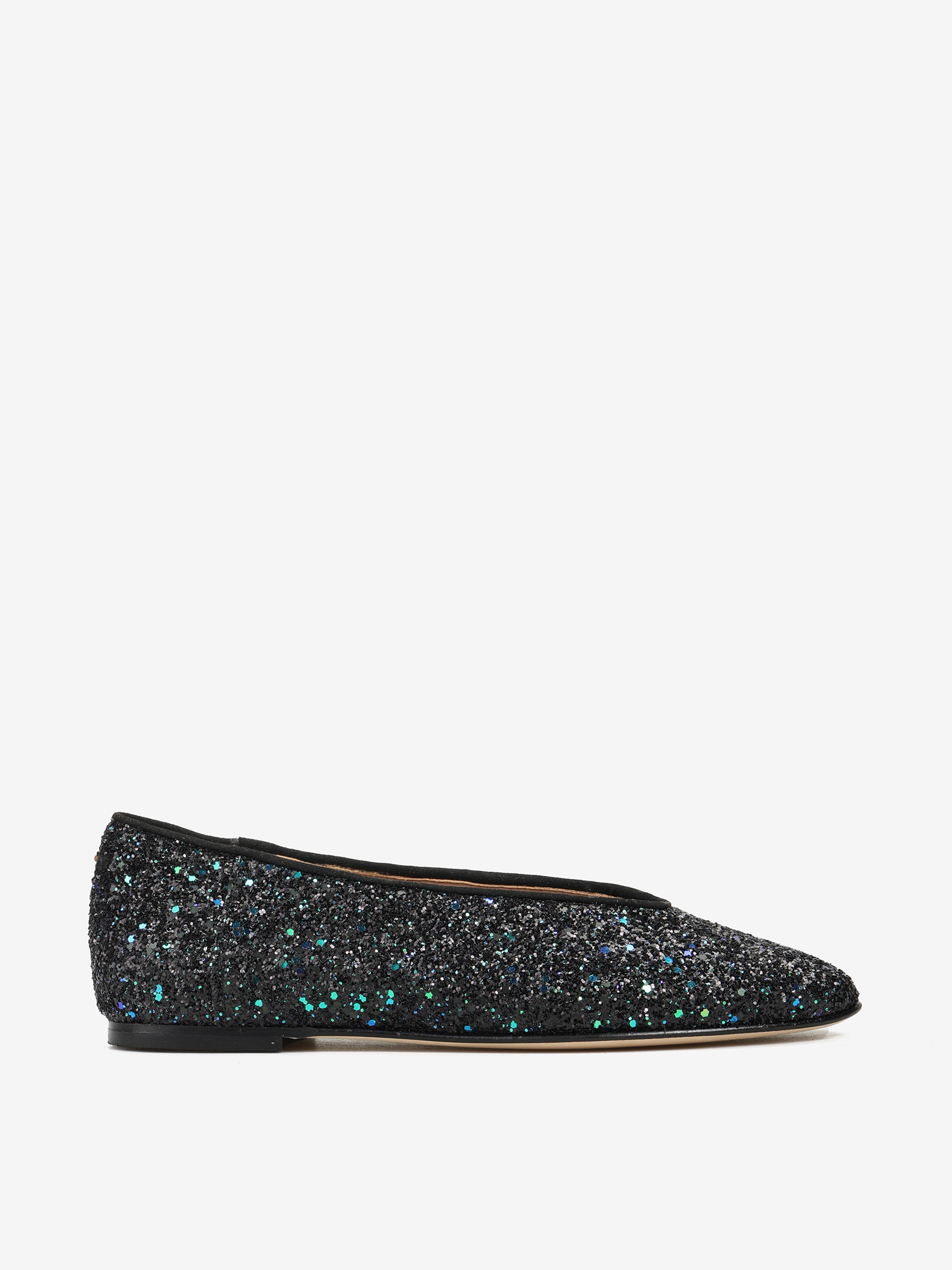Proste baleriny z owalnym wycięciem i zabudowanymi brzegami na skórzanej podeszwie. Wykończone gruboziarnistym brokatem.