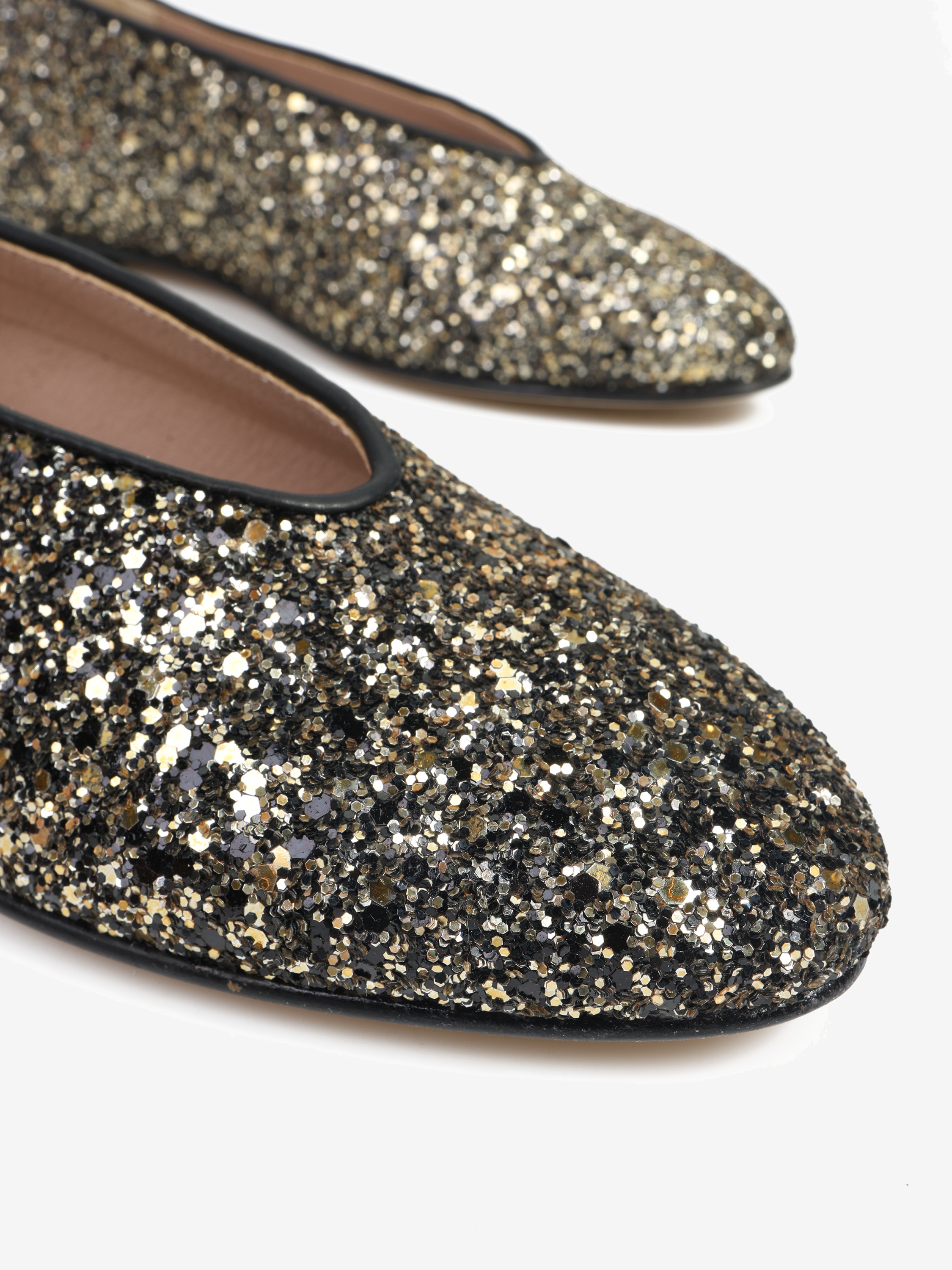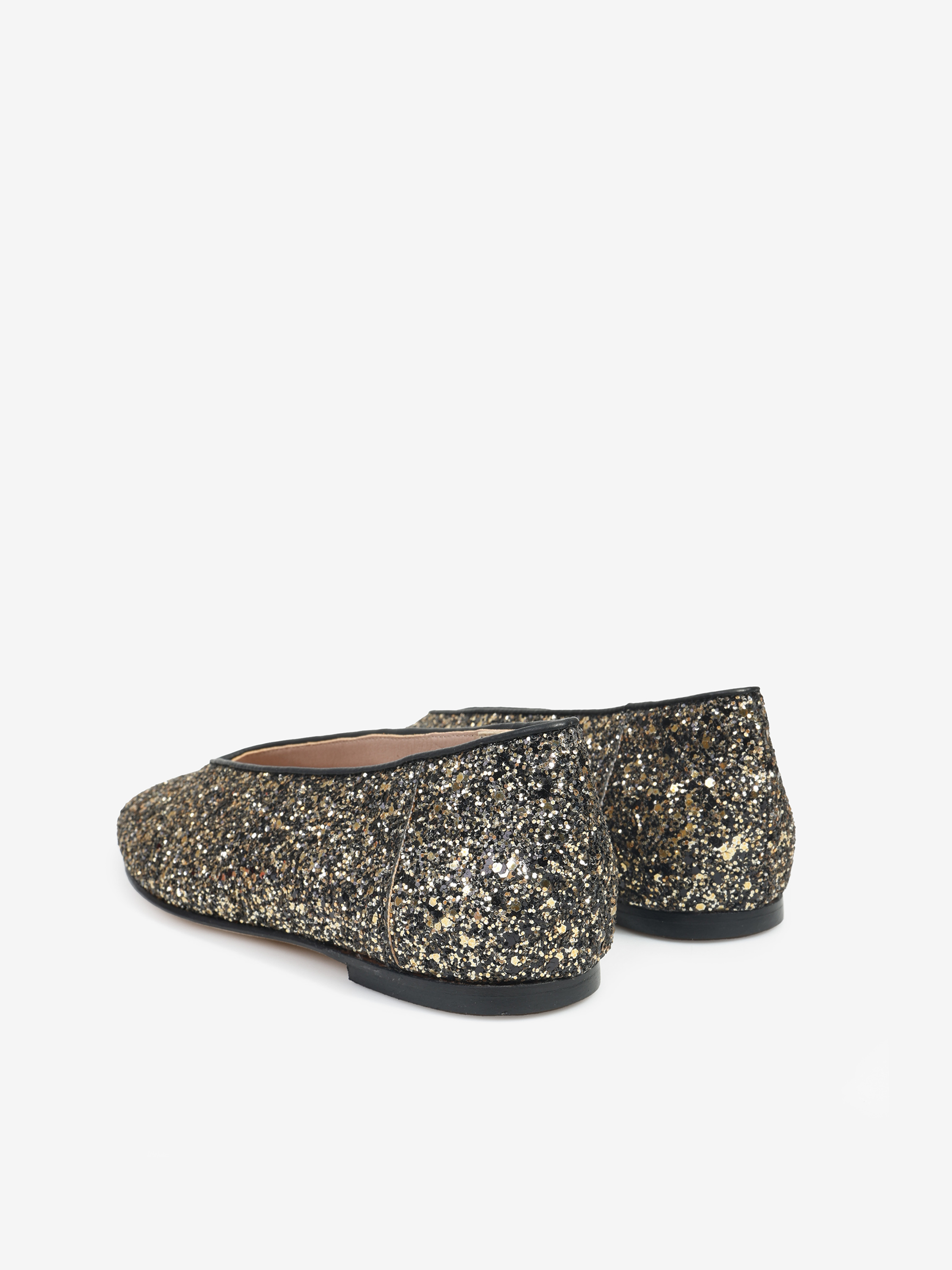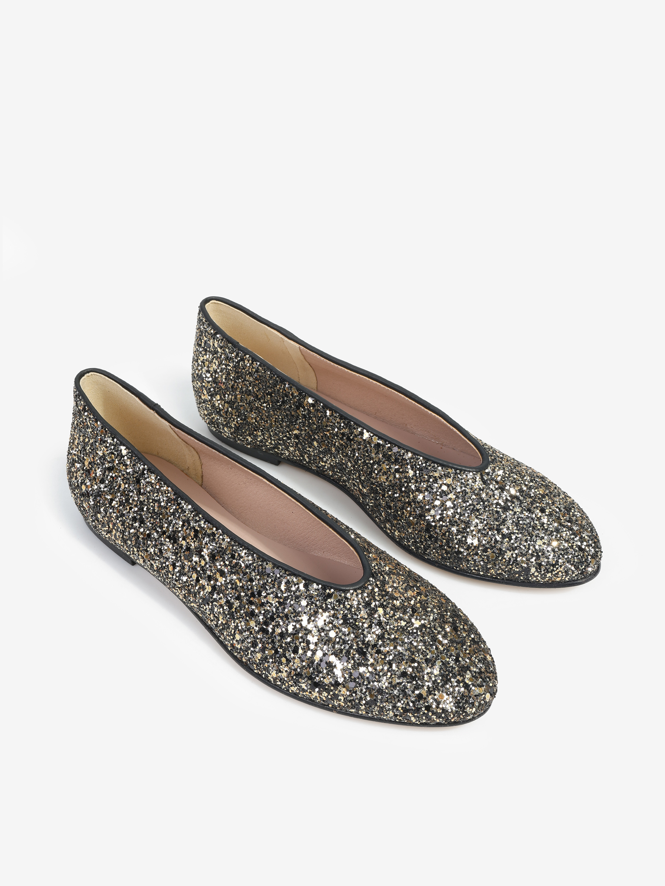 Proste baleriny z owalnym wycięciem i zabudowanymi brzegami na skórzanej podeszwie. Wykończone gruboziarnistym brokatem.