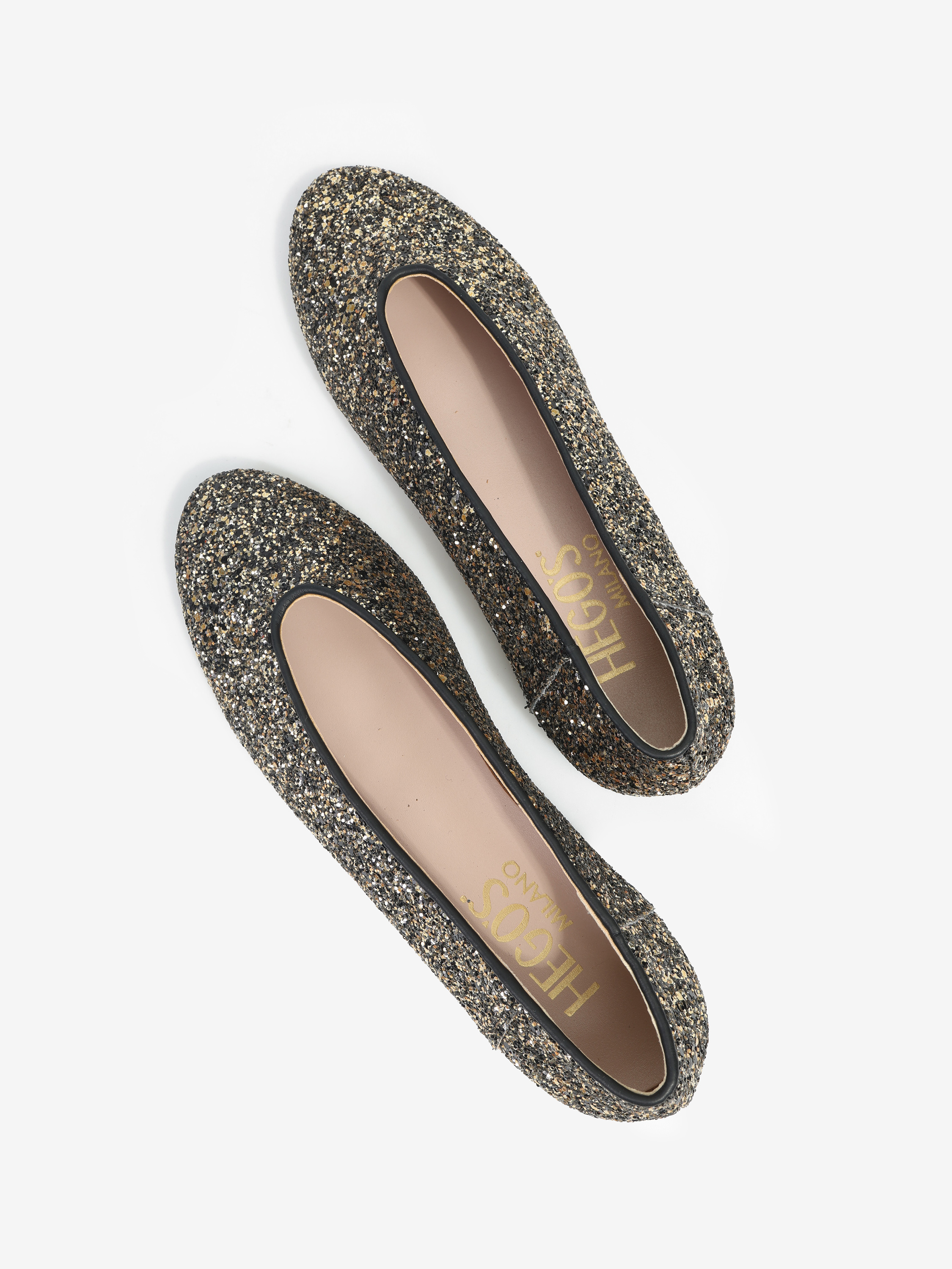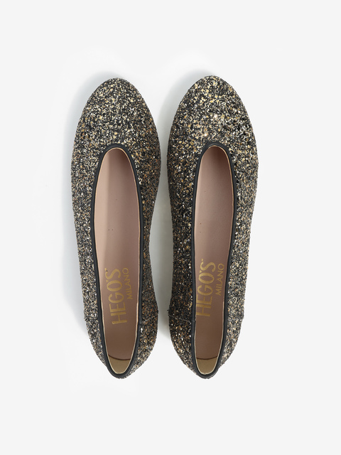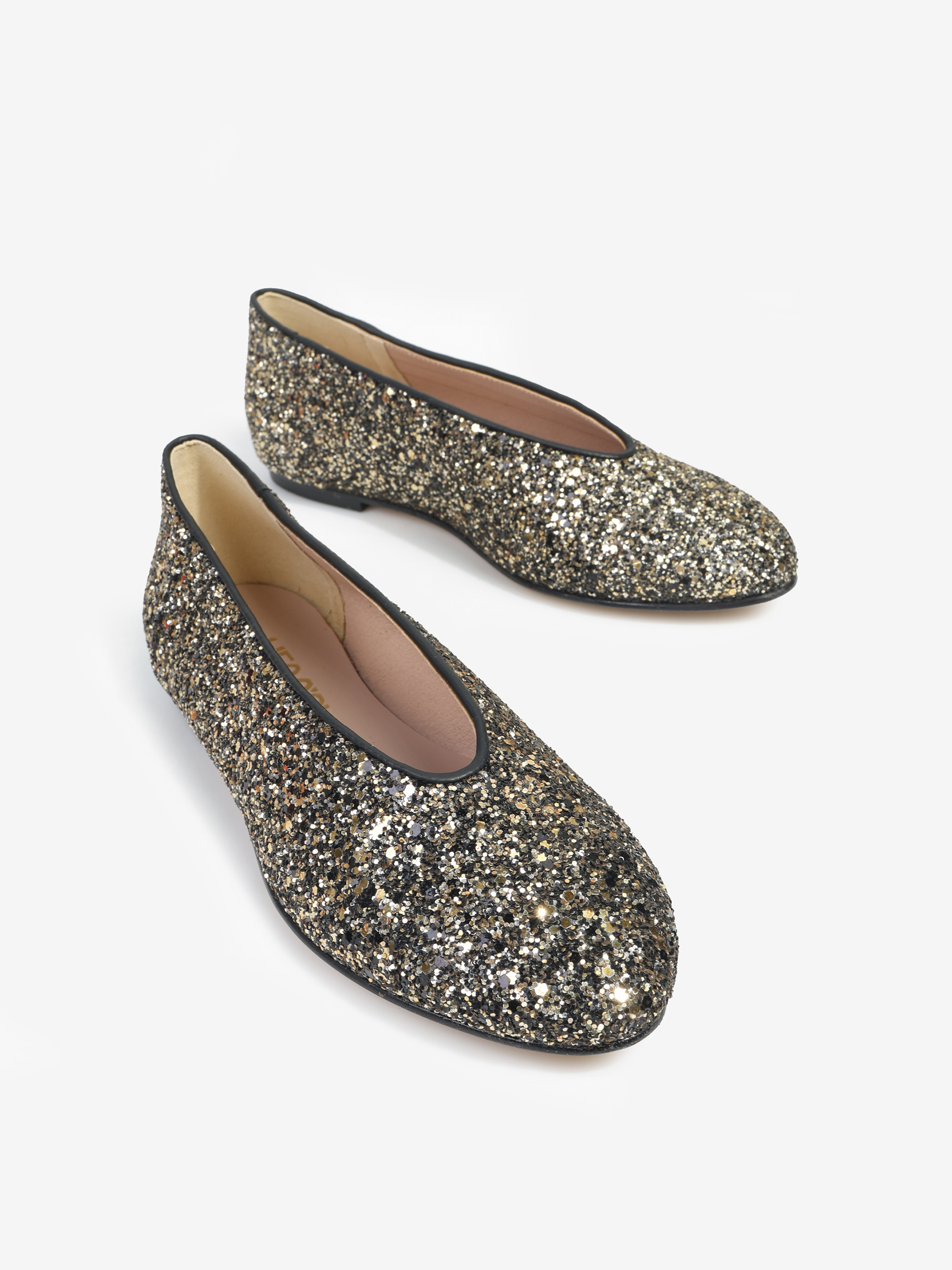 Proste baleriny z owalnym wycięciem i zabudowanymi brzegami na skórzanej podeszwie. Wykończone gruboziarnistym brokatem.