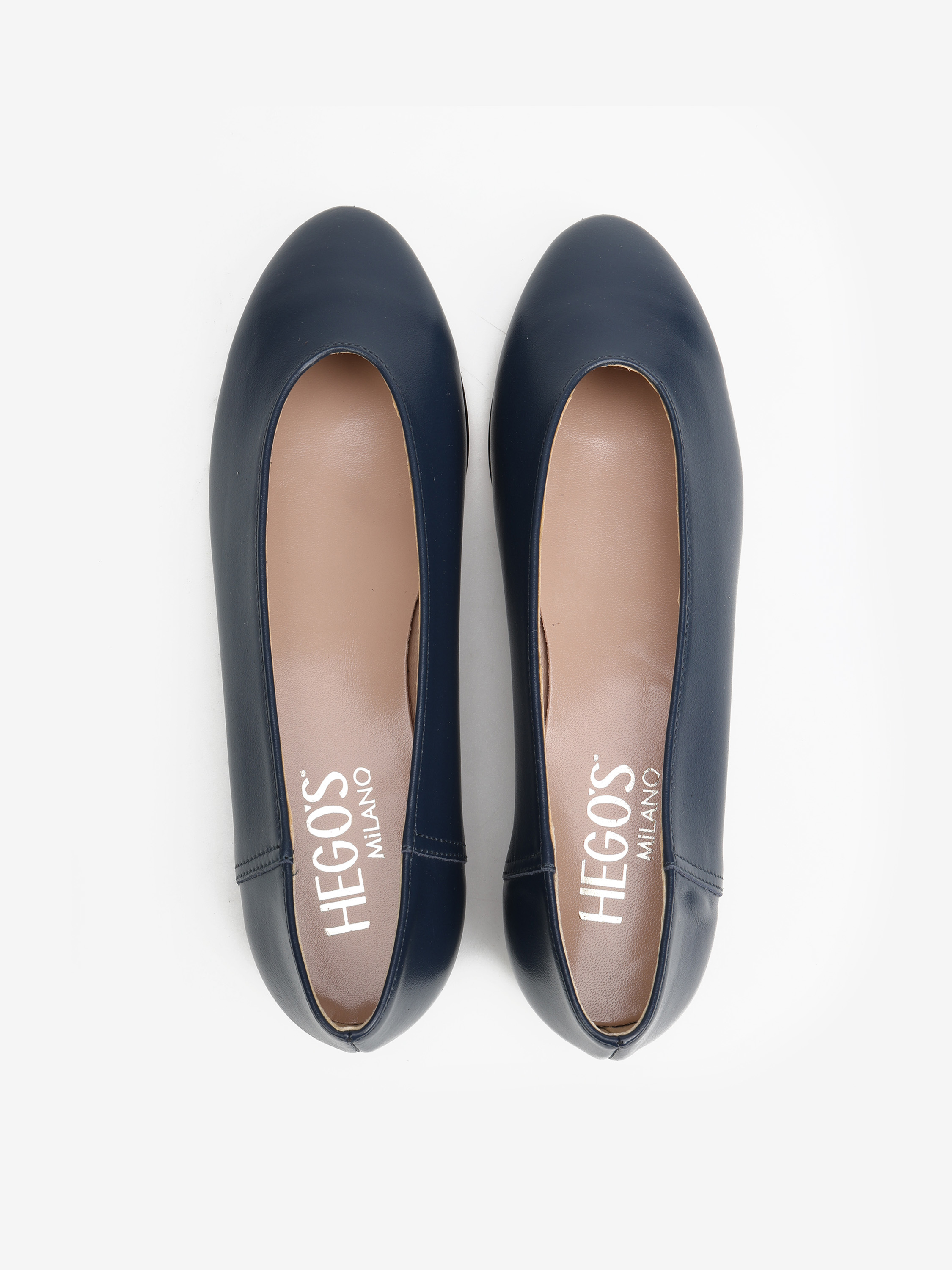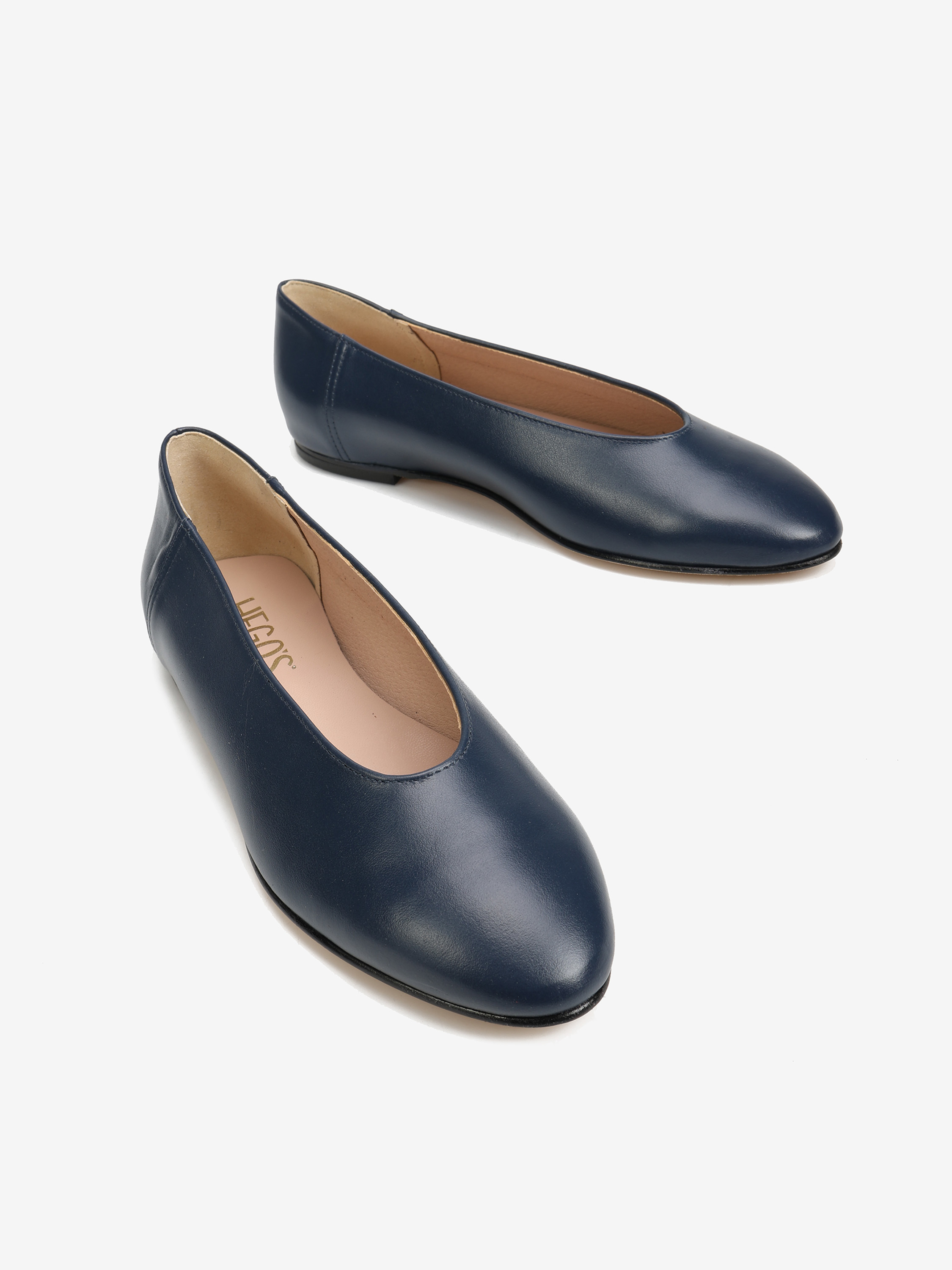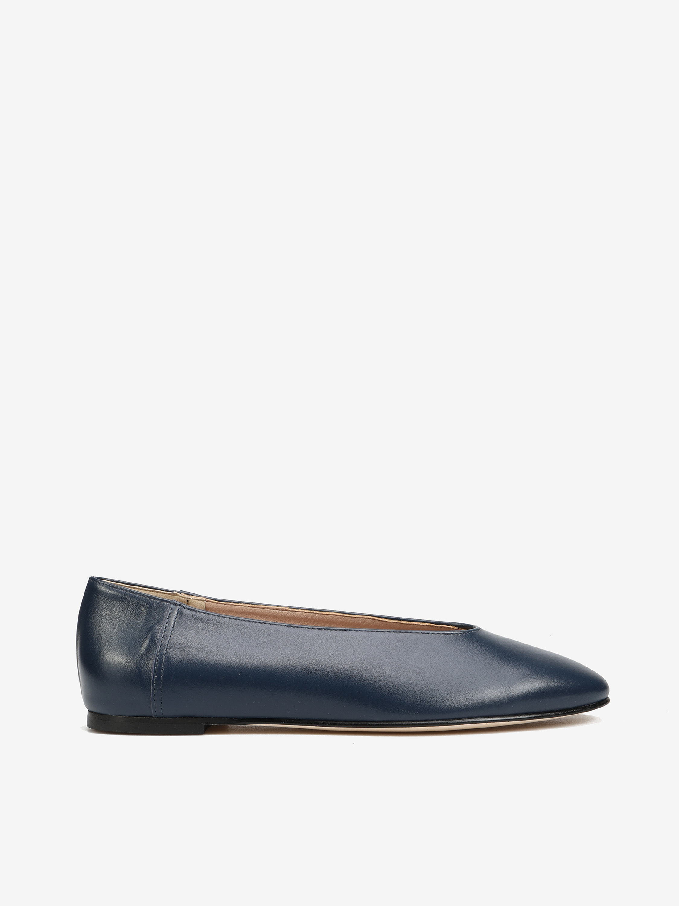 Proste baleriny z owalnym wycięciem i zabudowanymi brzegami na skórzanej podeszwie, wykonane z delikatnej, miękkiej skóry.