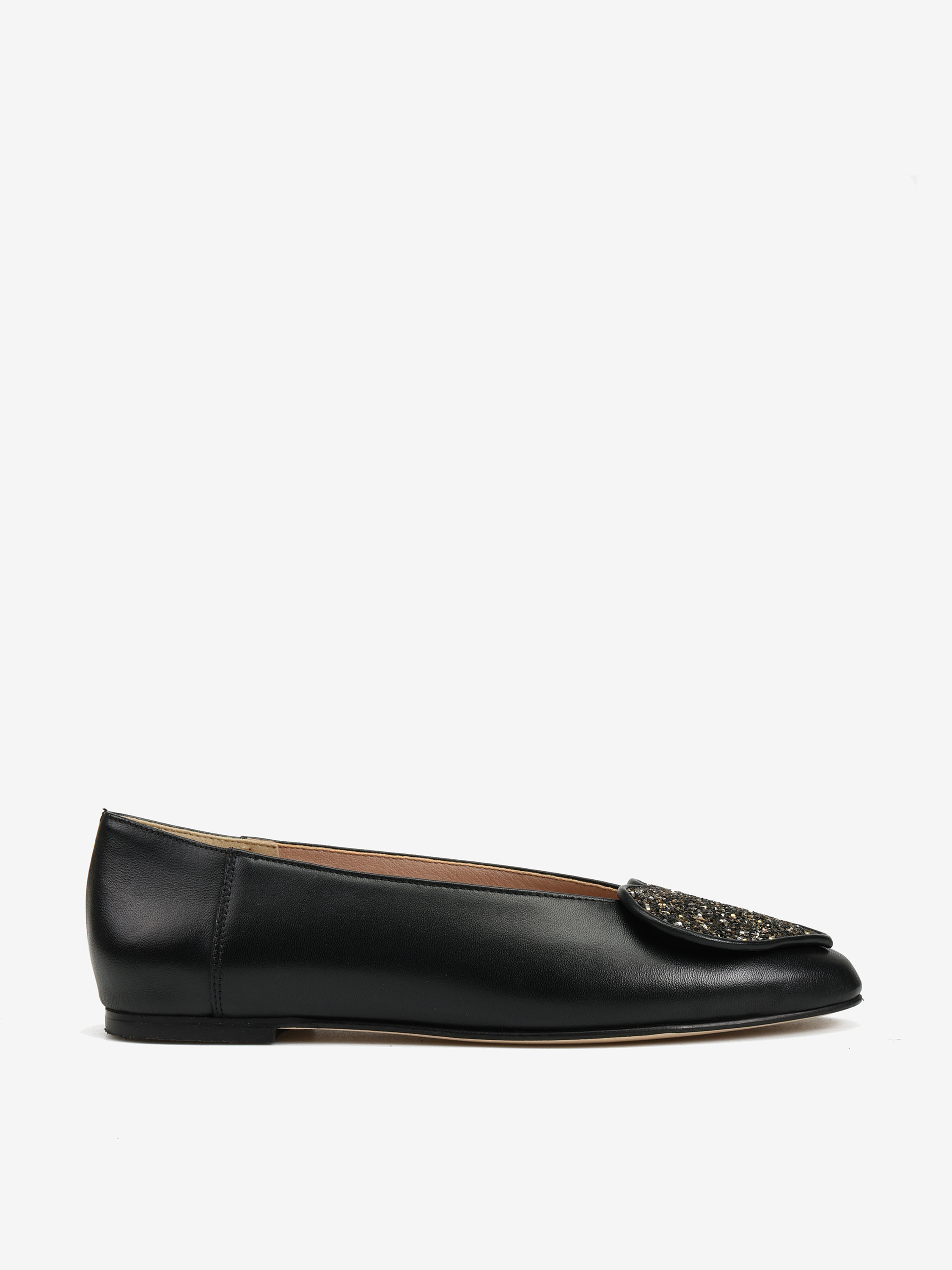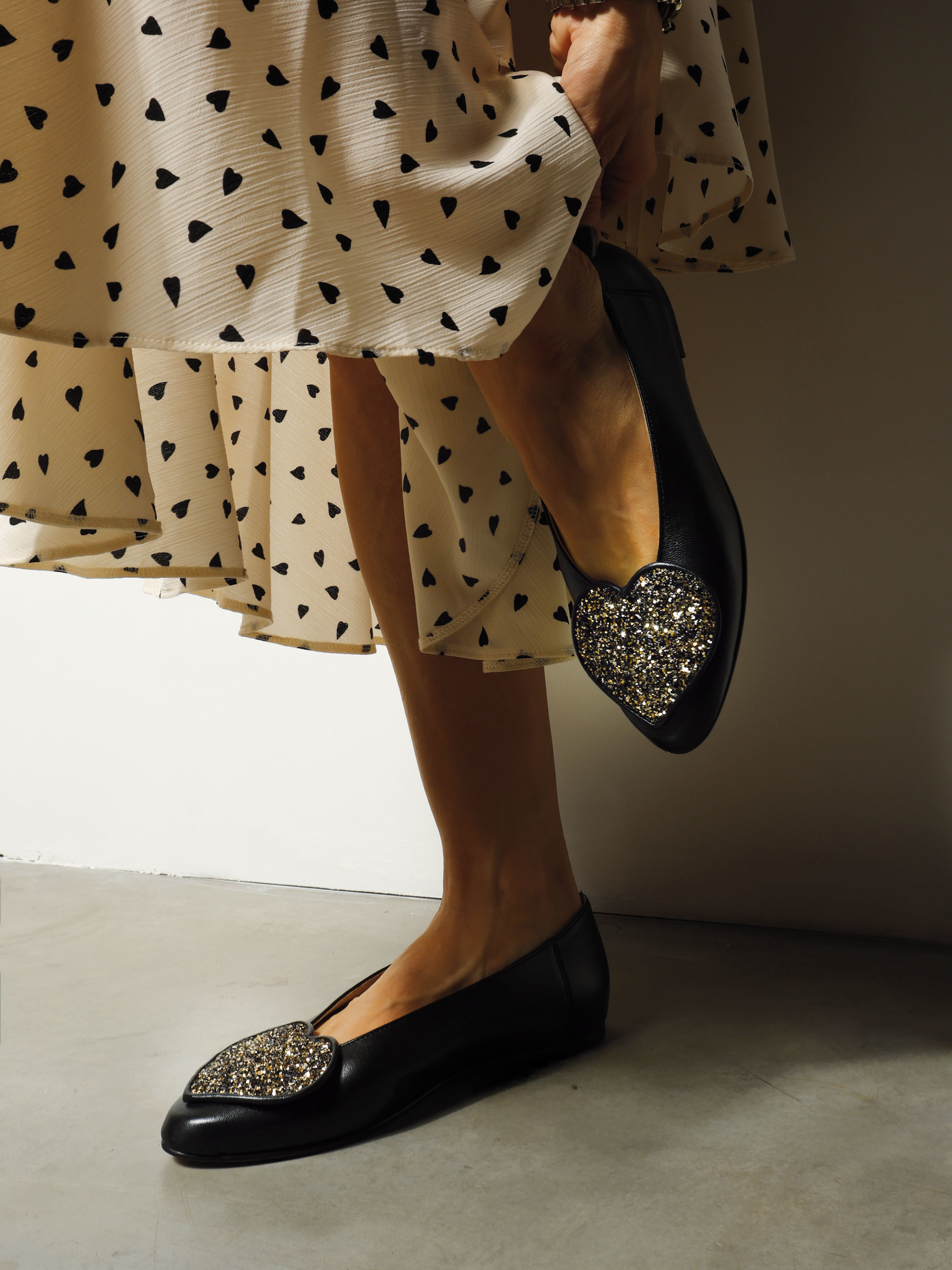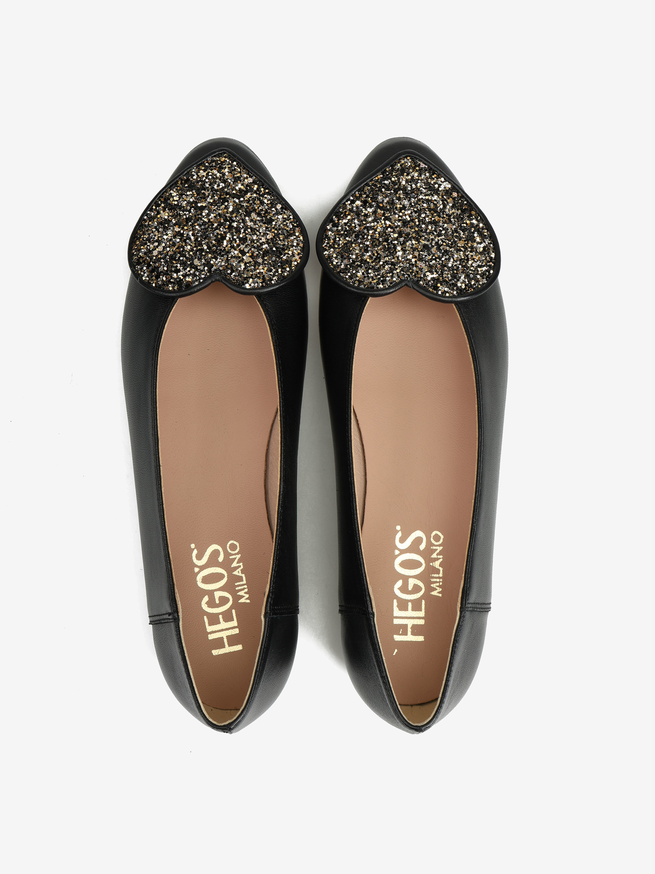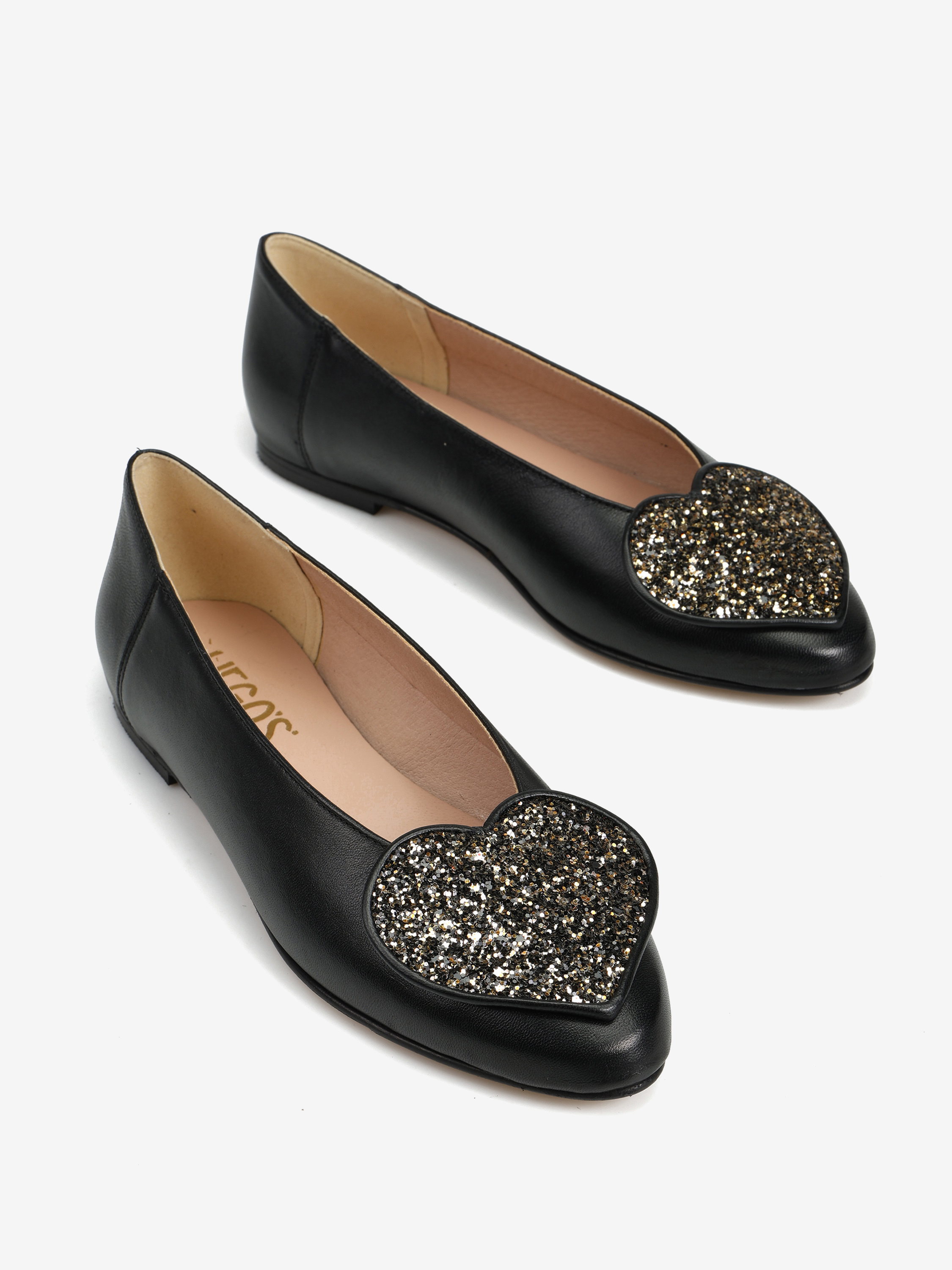 Proste baleriny z owalnym wycięciem i zabudowanymi brzegami na skórzanej podeszwie. Ozdobne serce z gruboziarnistym brokatem.