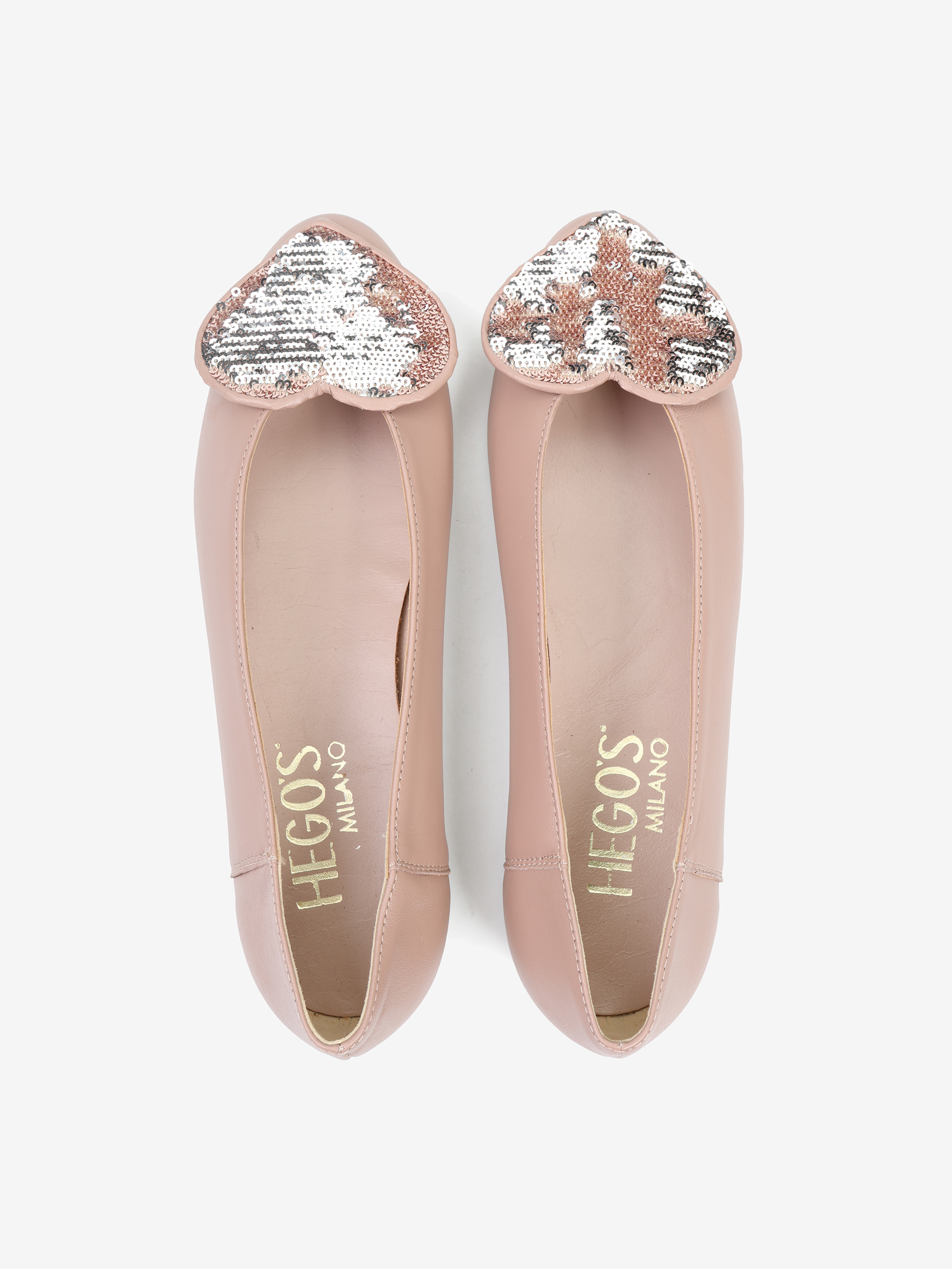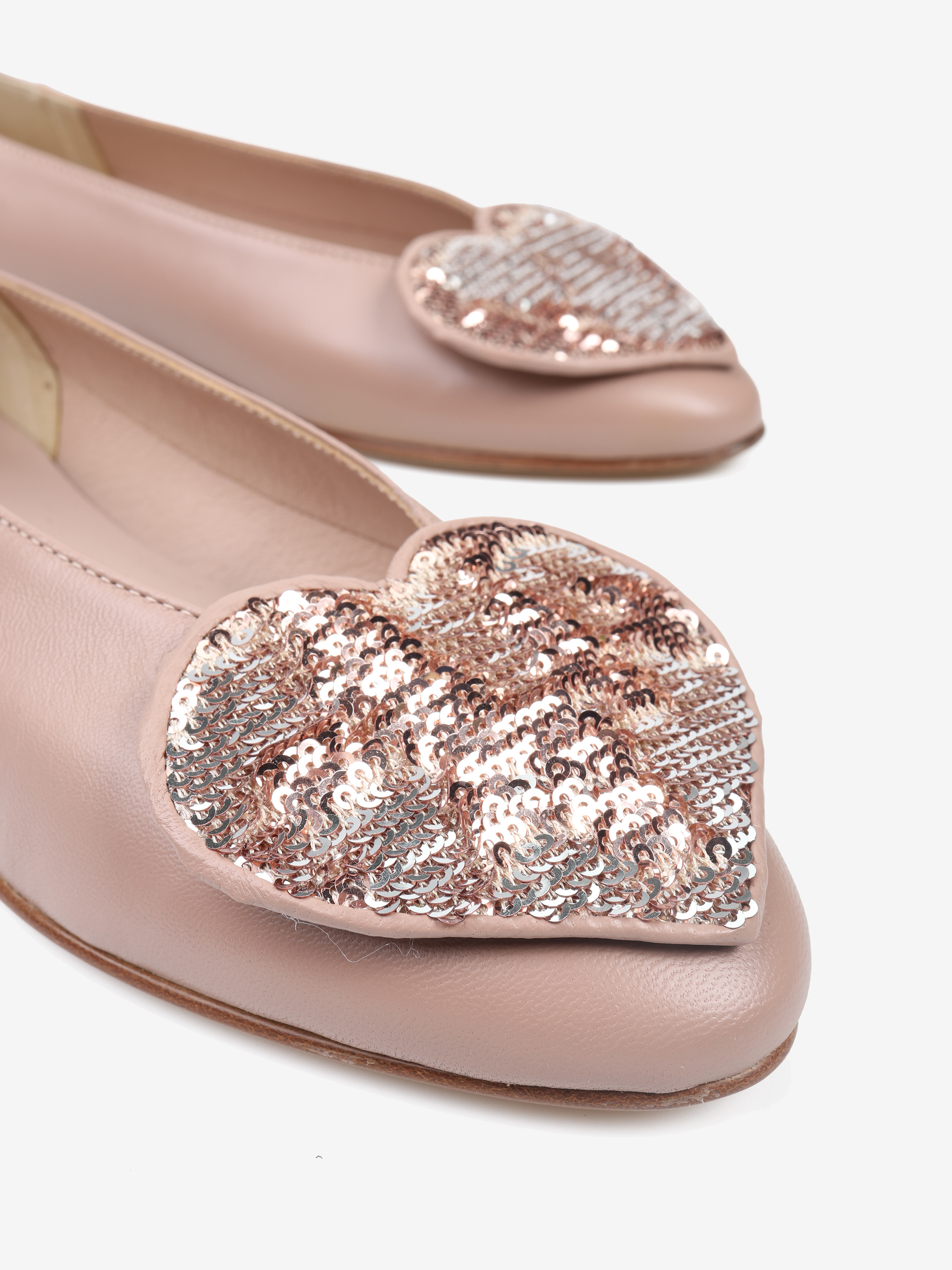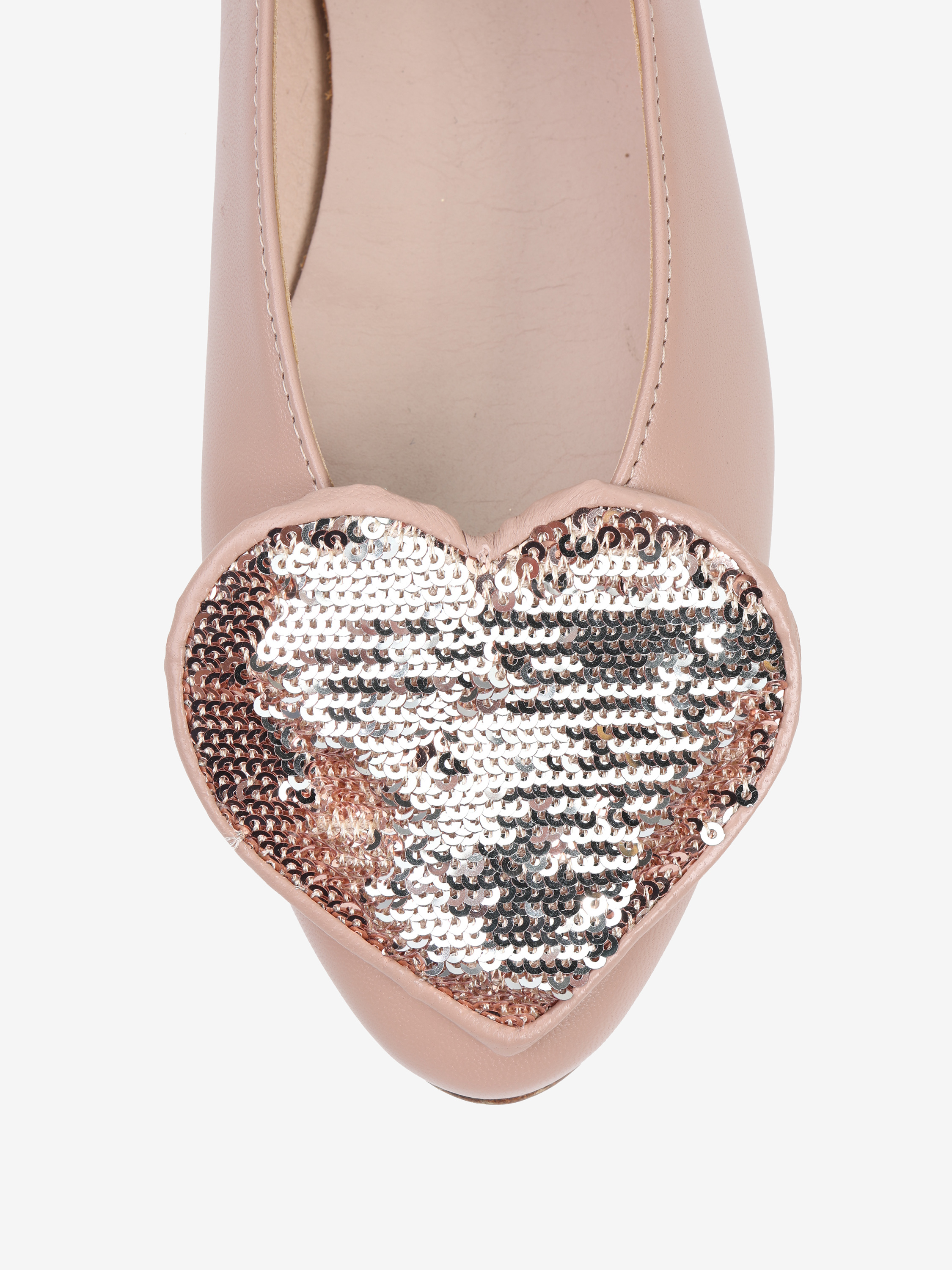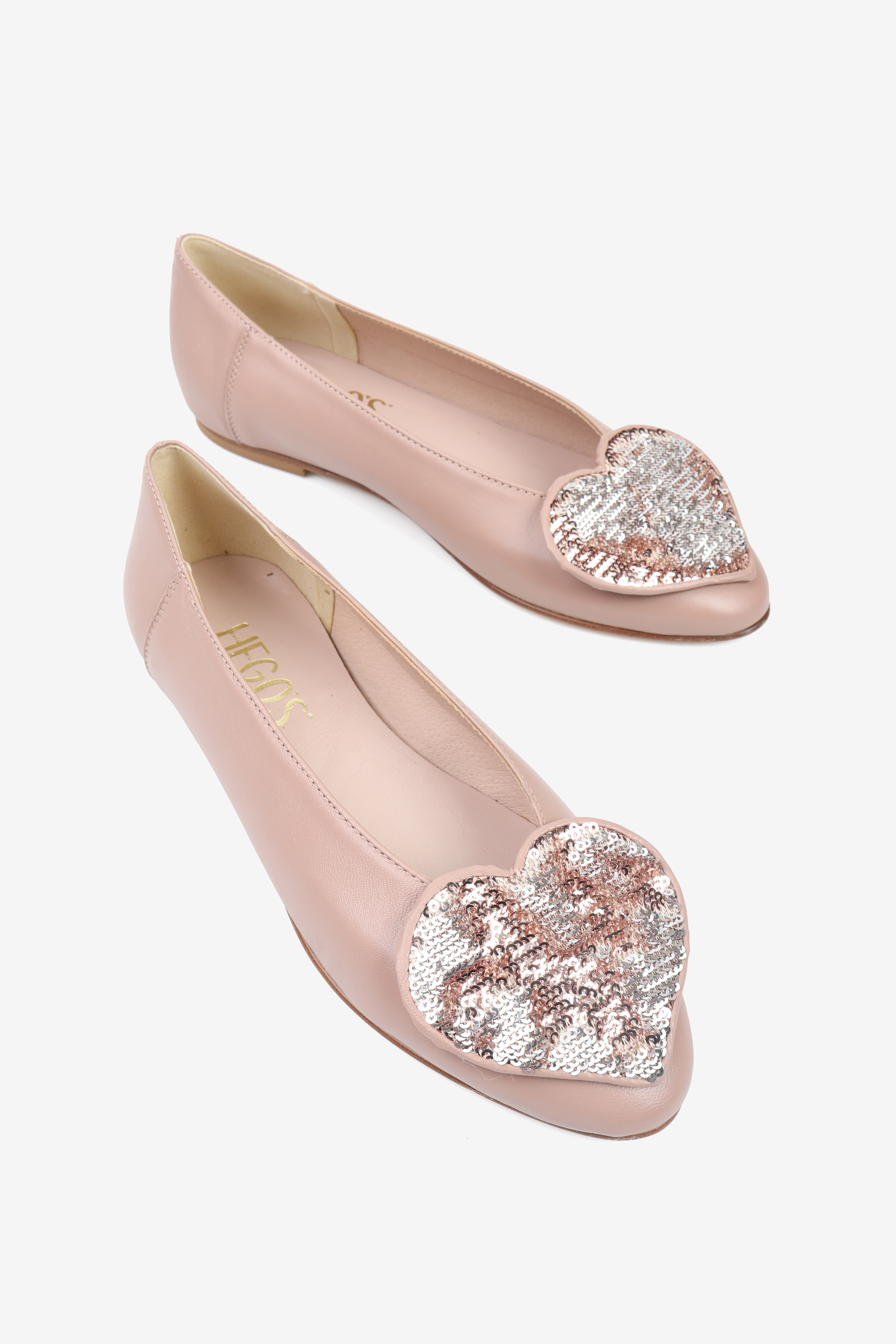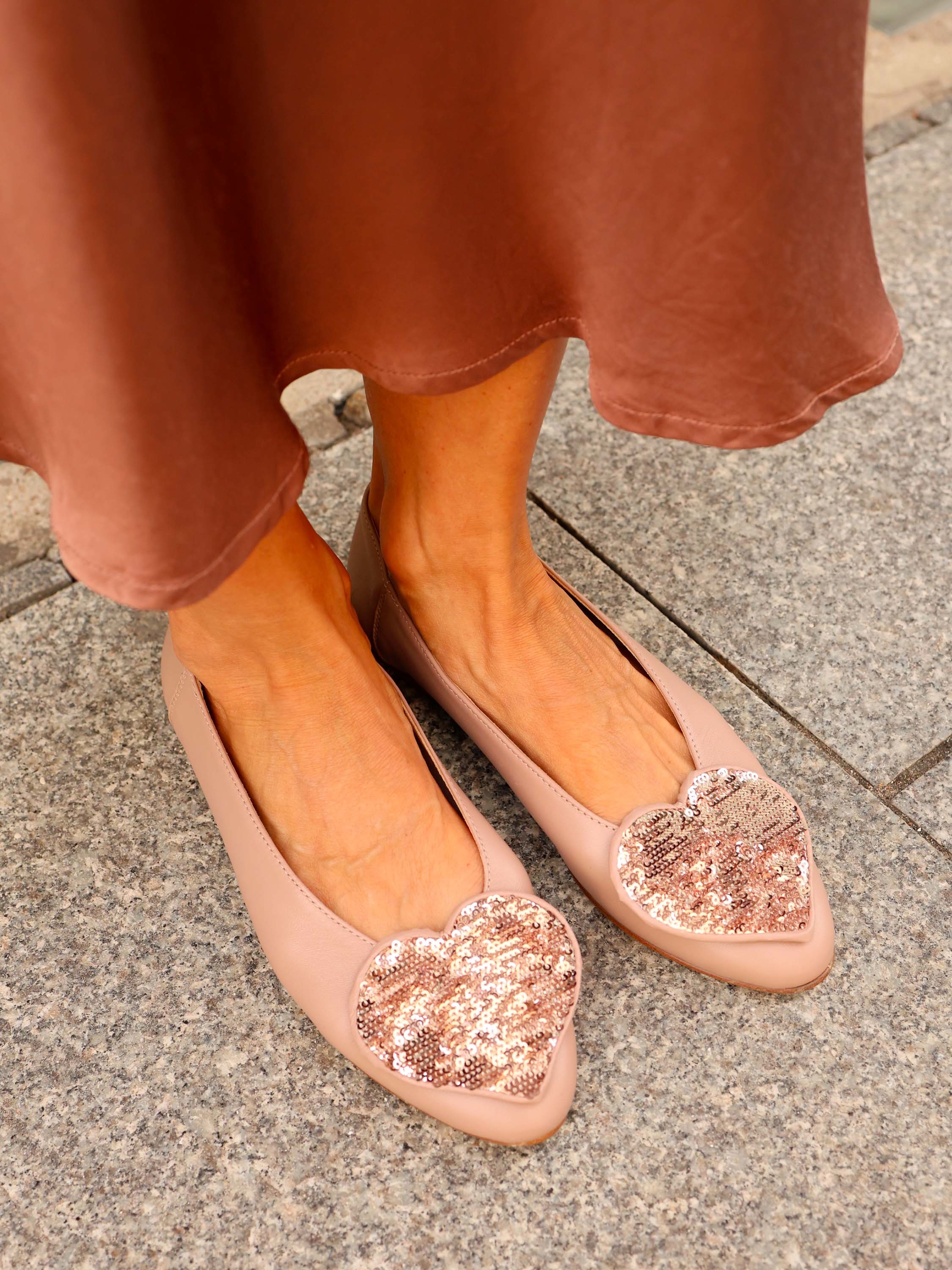 Proste baleriny z owalnym wycięciem i zabudowanymi brzegami na skórzanej podeszwie. Ozdobne serce z dwustronnymi cekinami, które można układać.
