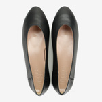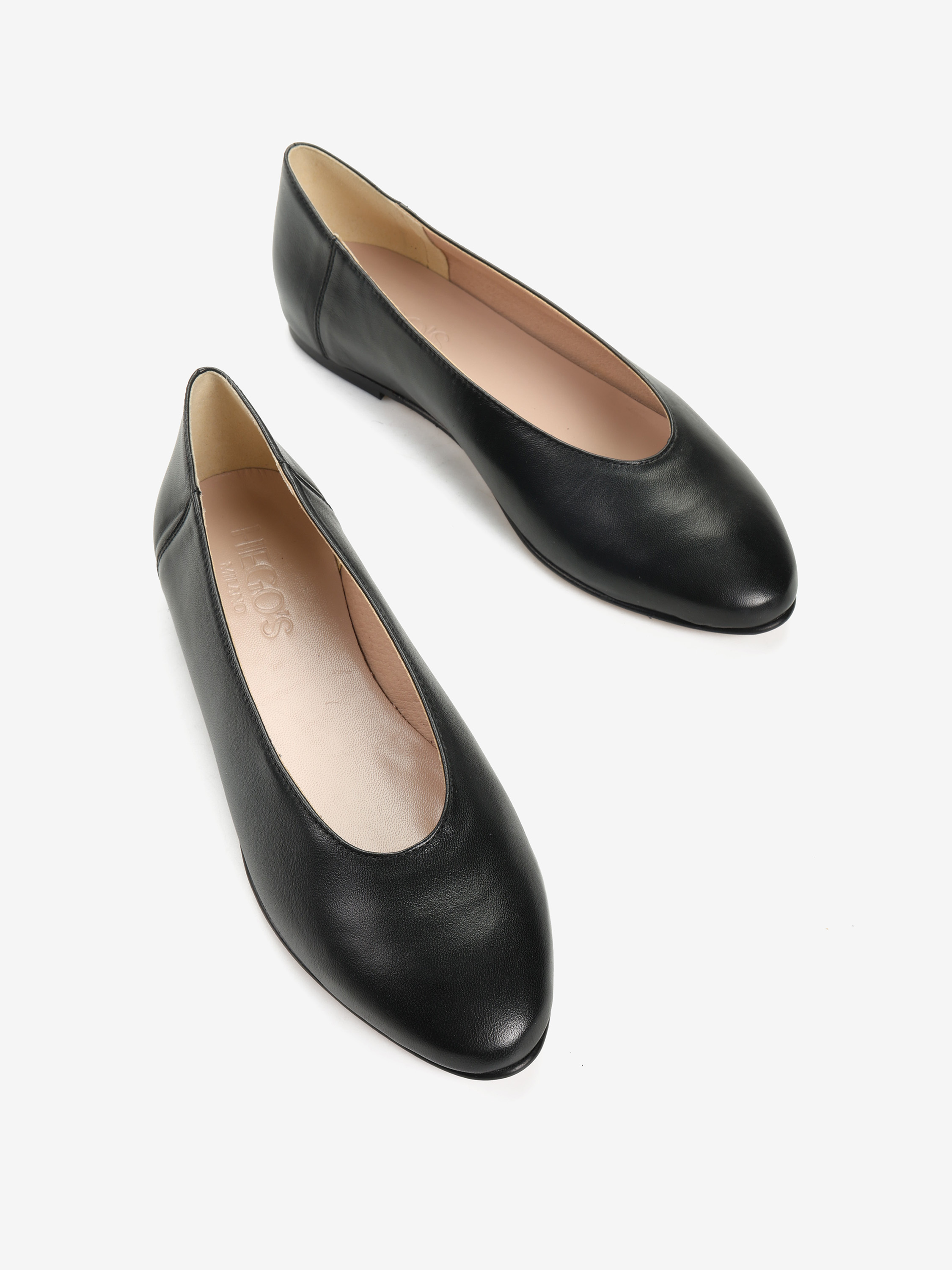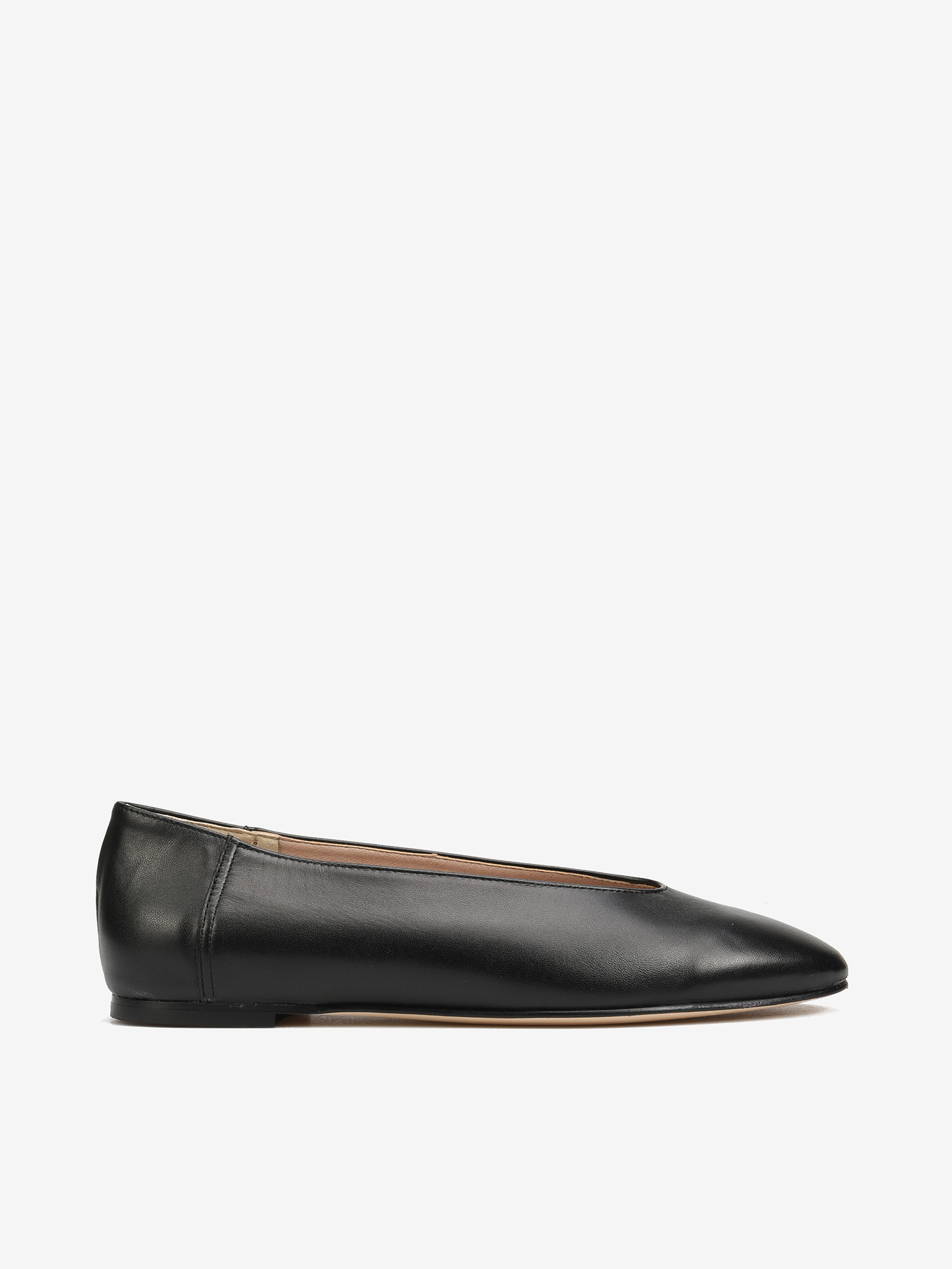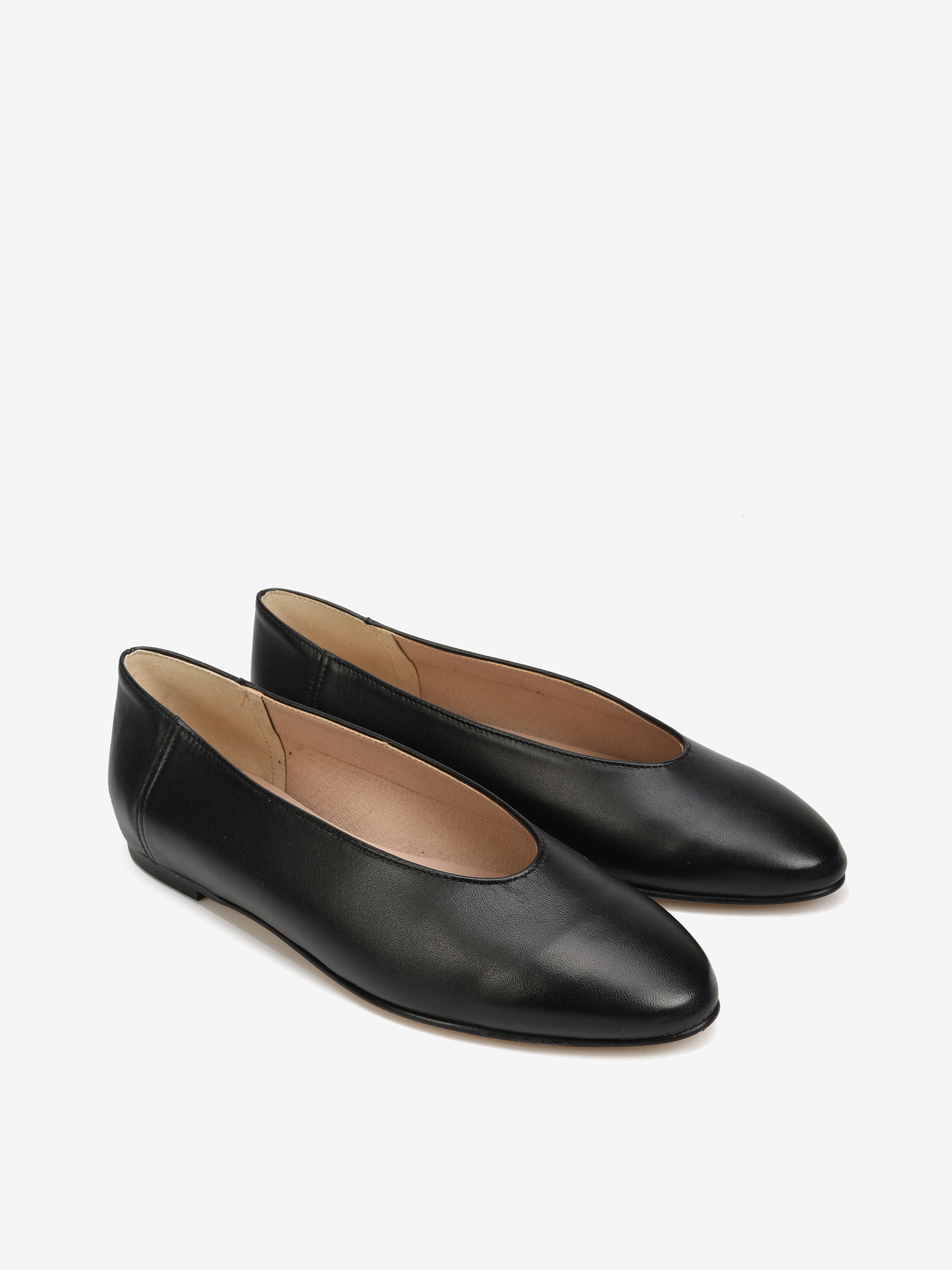 Proste baleriny z owalnym wycięciem i zabudowanymi brzegami na skórzanej podeszwie, wykonane z delikatnej, miękkiej skóry.