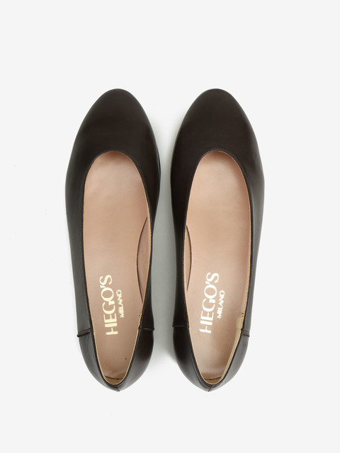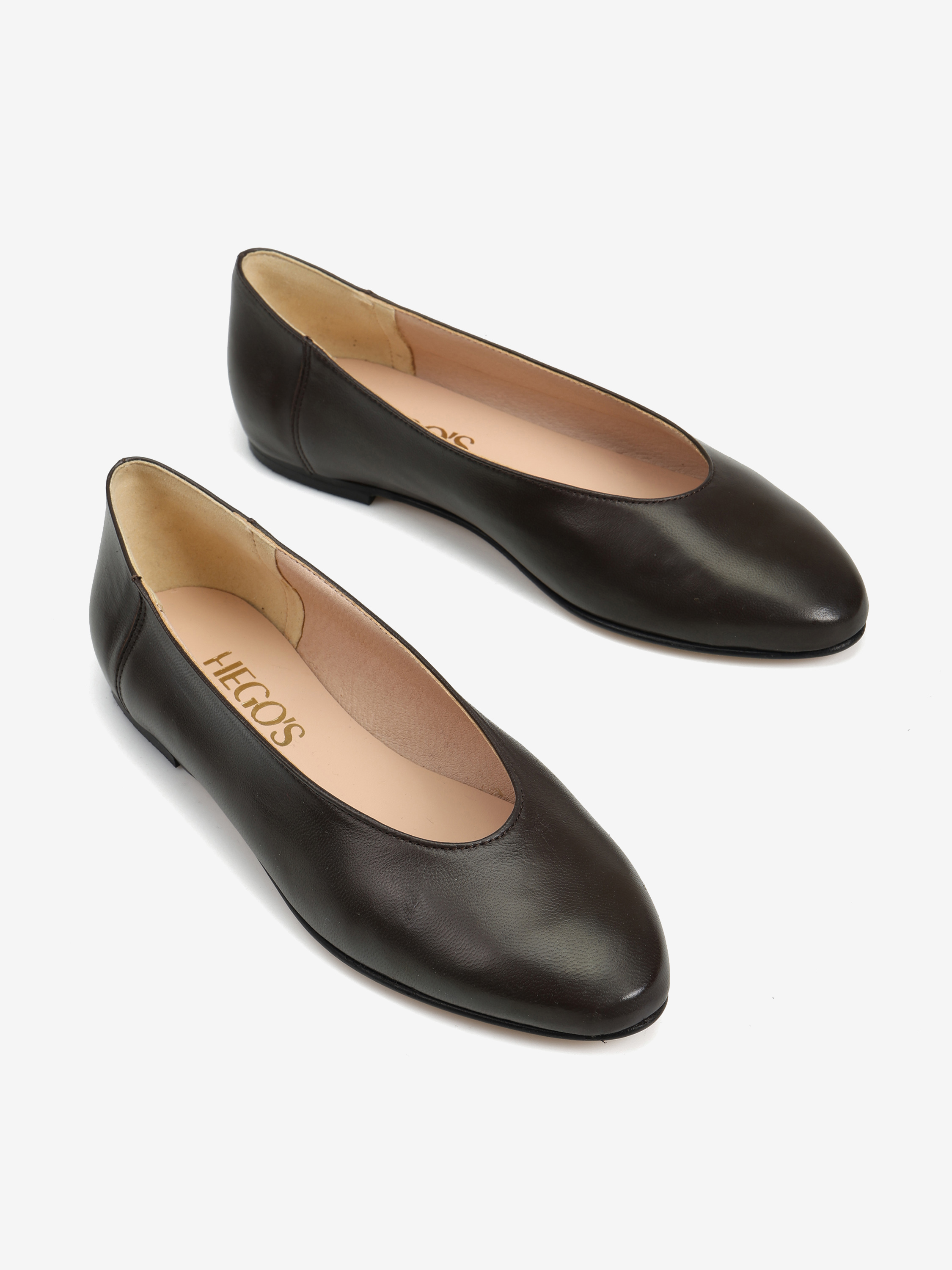 Proste baleriny z owalnym wycięciem i zabudowanymi brzegami na skórzanej podeszwie, wykonane z delikatnej, miękkiej skóry.