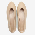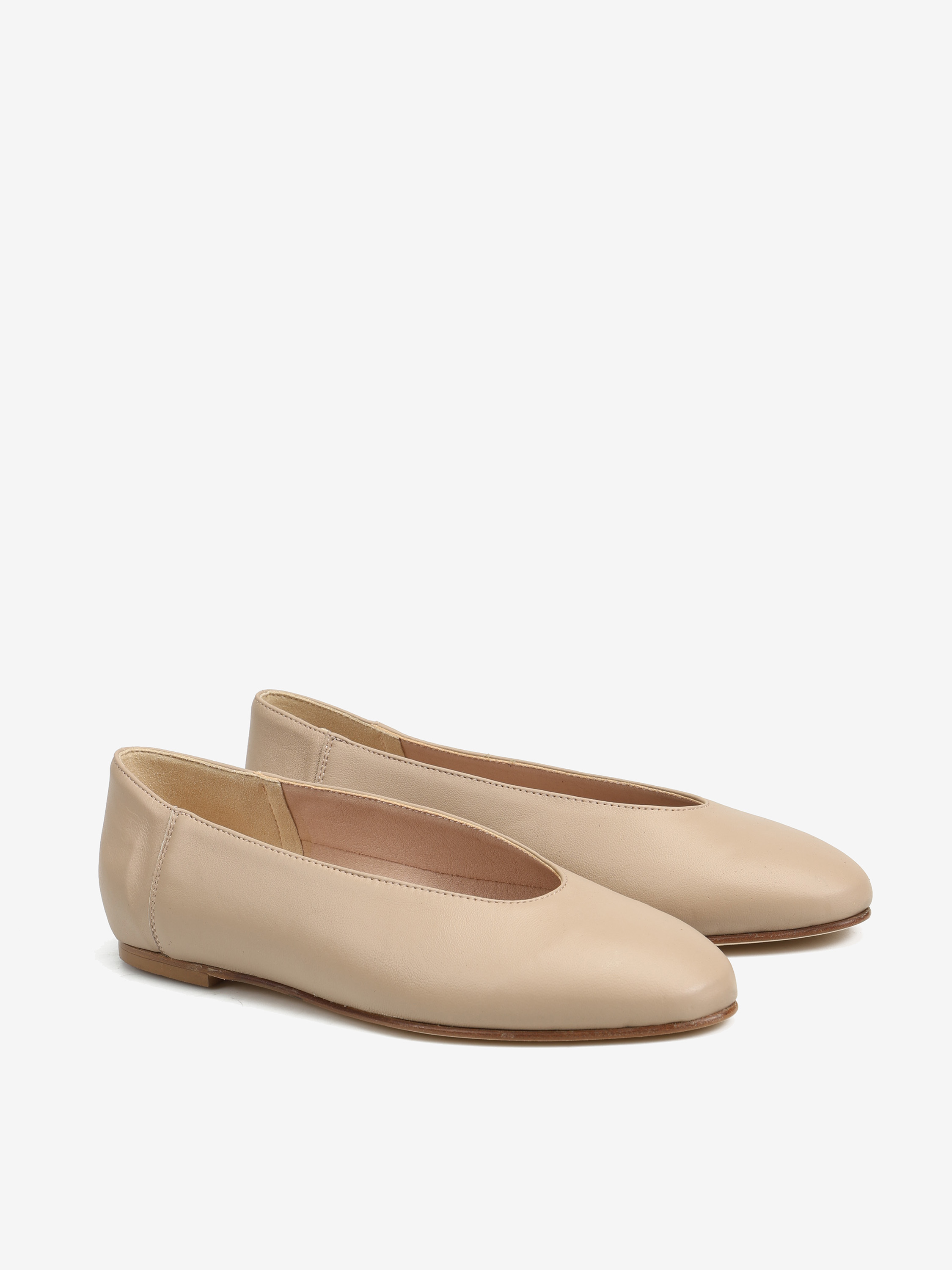 Proste baleriny z owalnym wycięciem i zabudowanymi brzegami na skórzanej podeszwie, wykonane z delikatnej, miękkiej skóry.