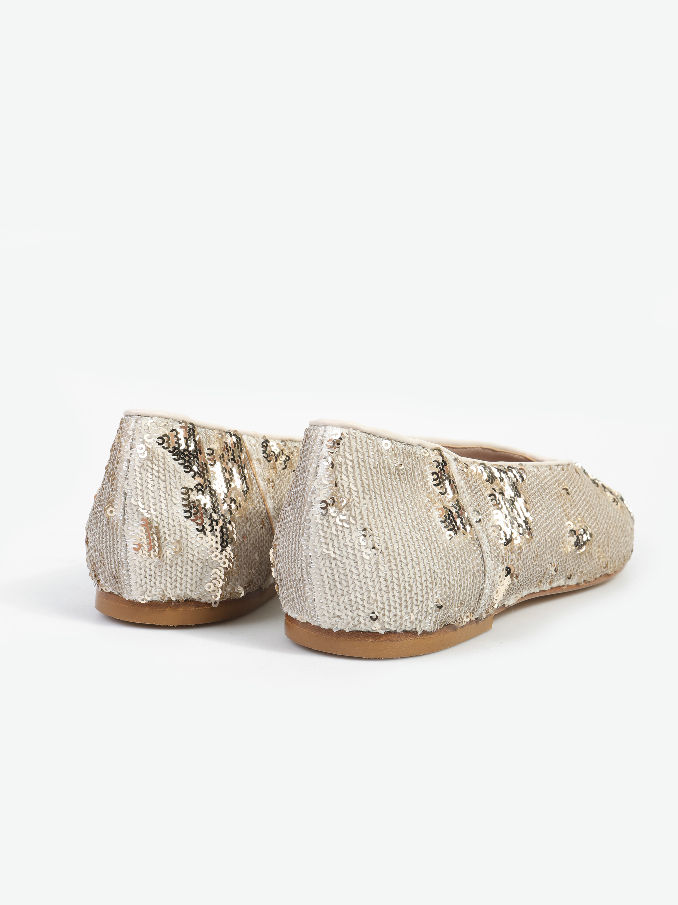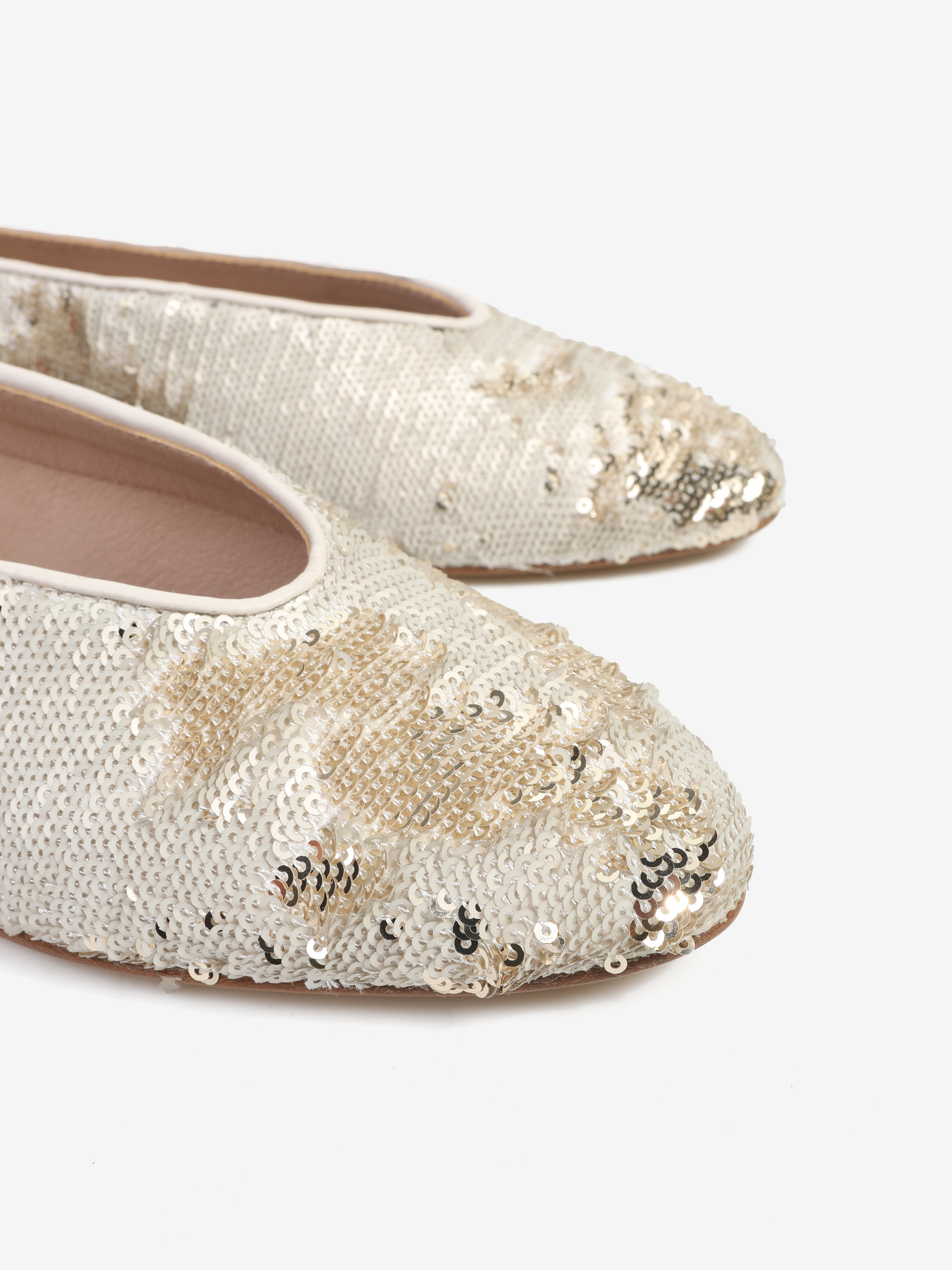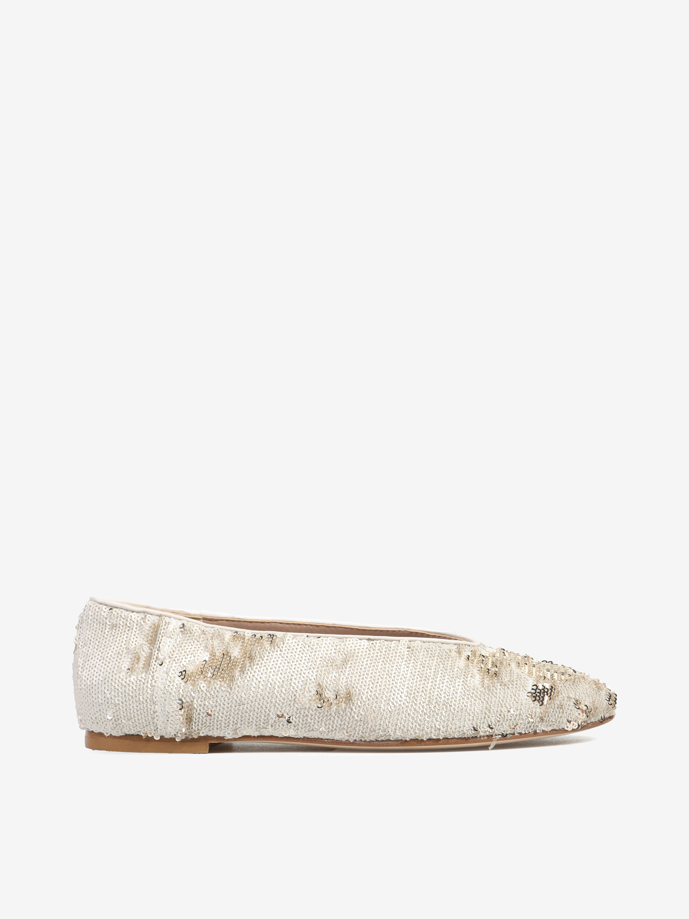 Proste baleriny z owalnym wycięciem i zabudowanymi brzegami na skórzanej podeszwie. Wykończone dwustronnymi cekinami, które można układać.