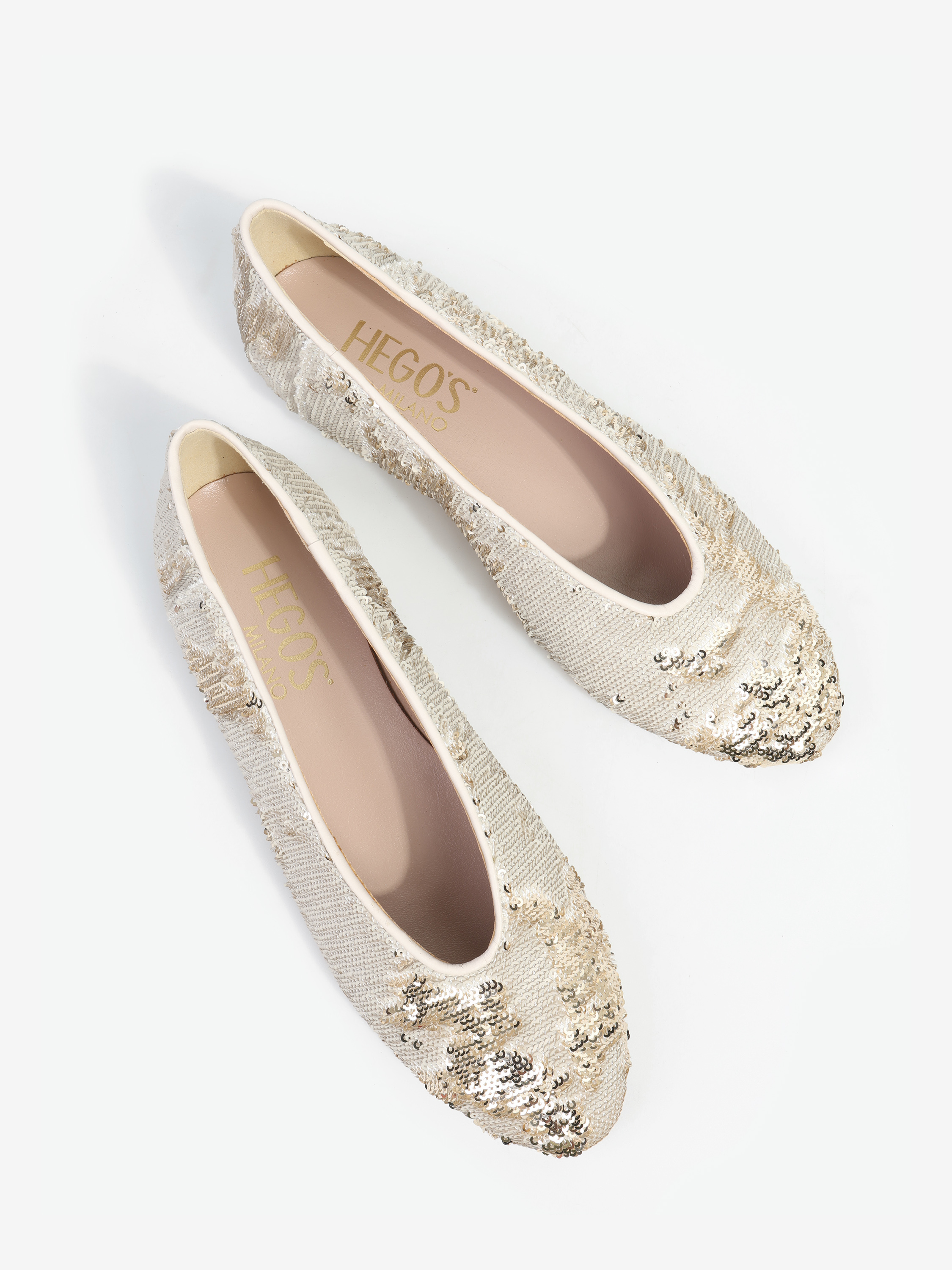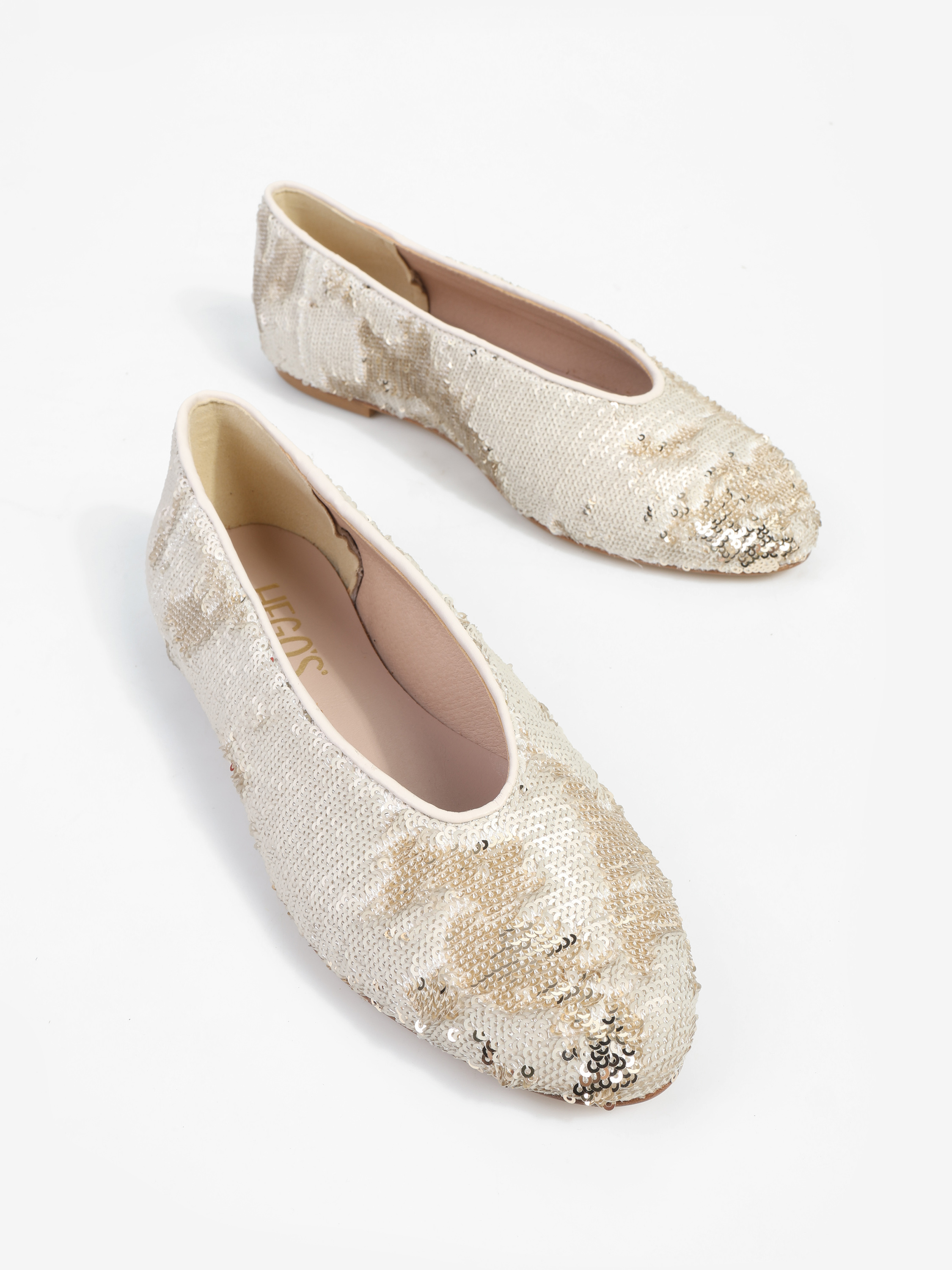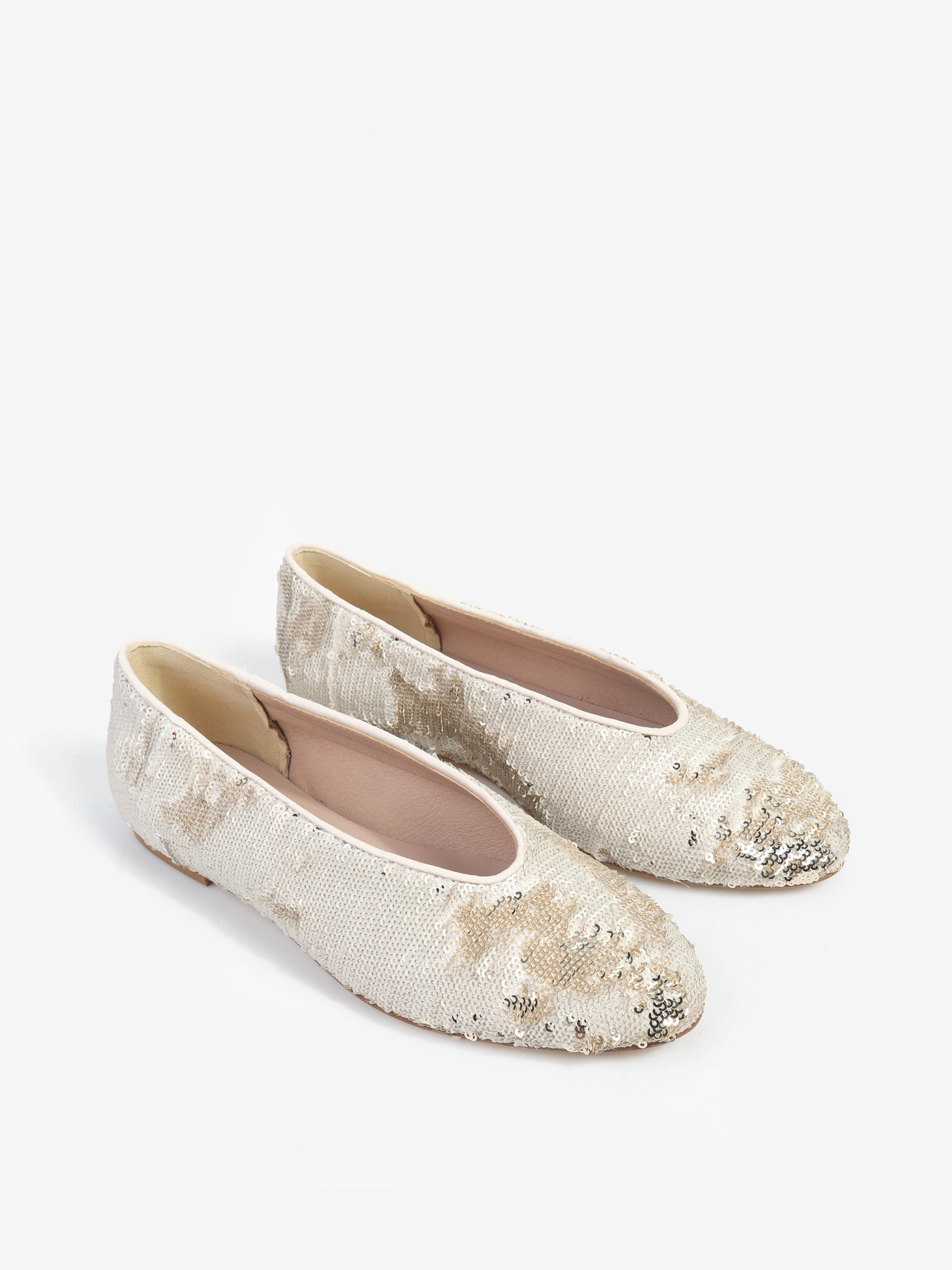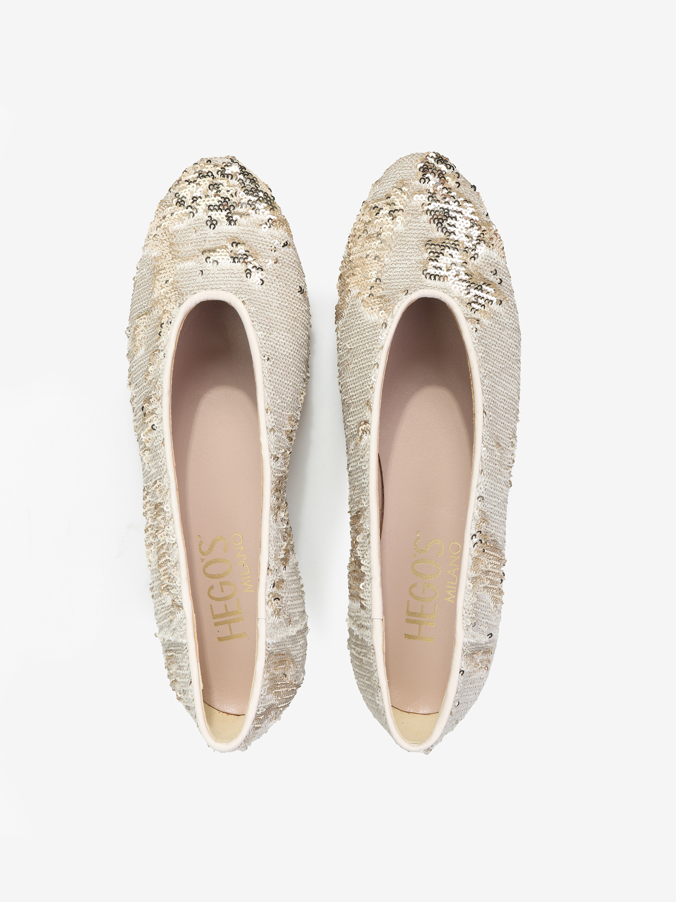 Proste baleriny z owalnym wycięciem i zabudowanymi brzegami na skórzanej podeszwie. Wykończone dwustronnymi cekinami, które można układać.