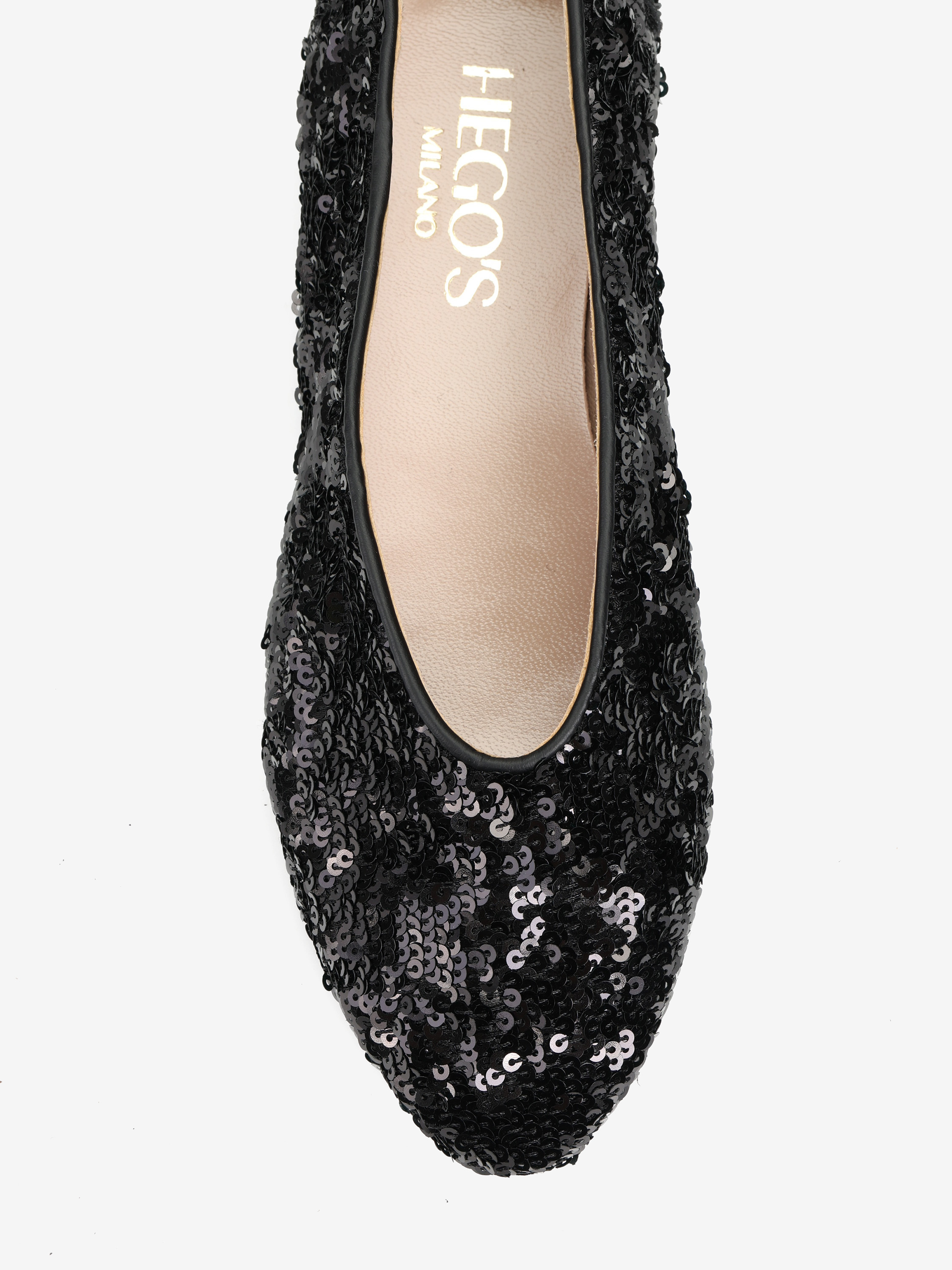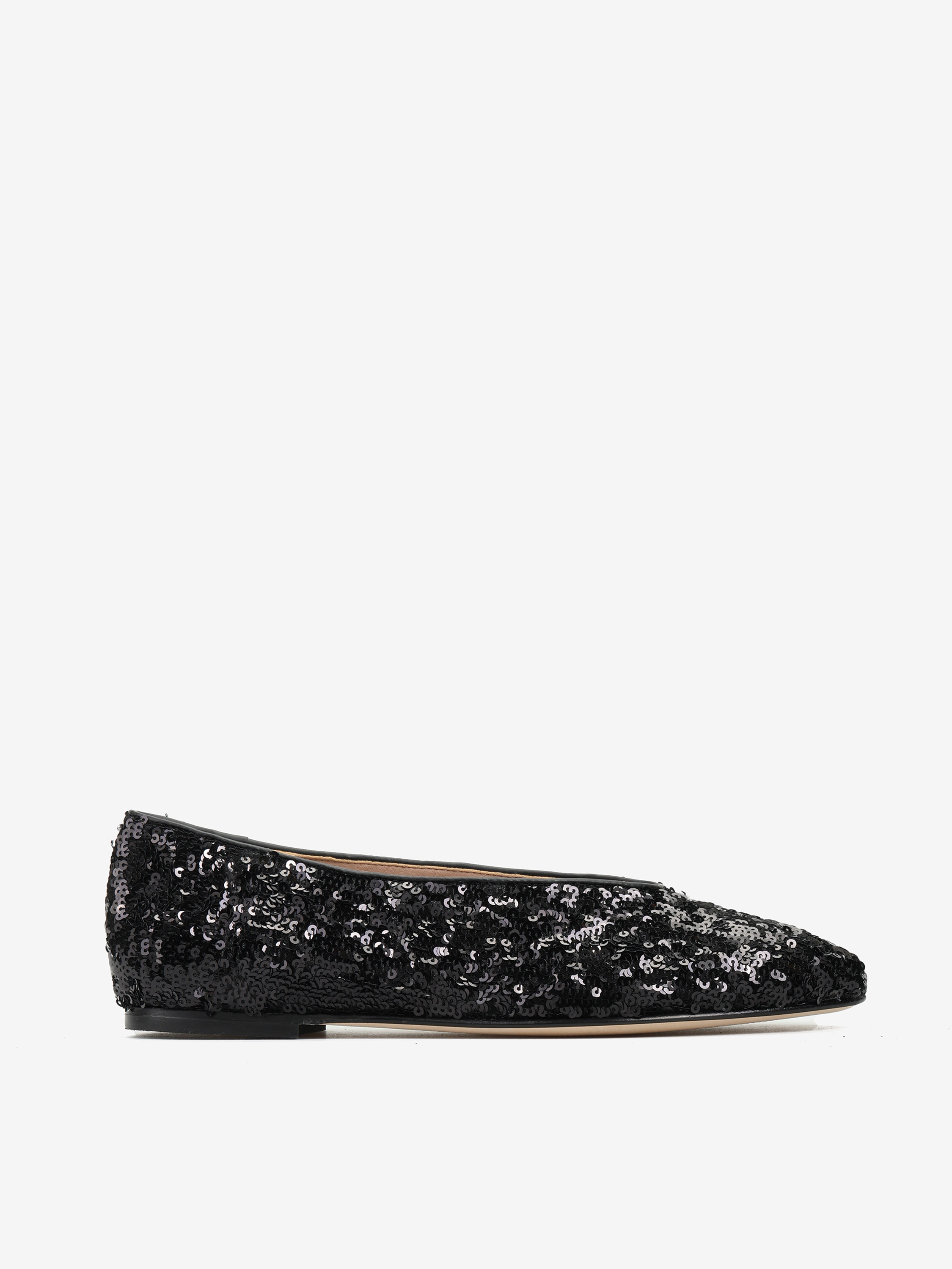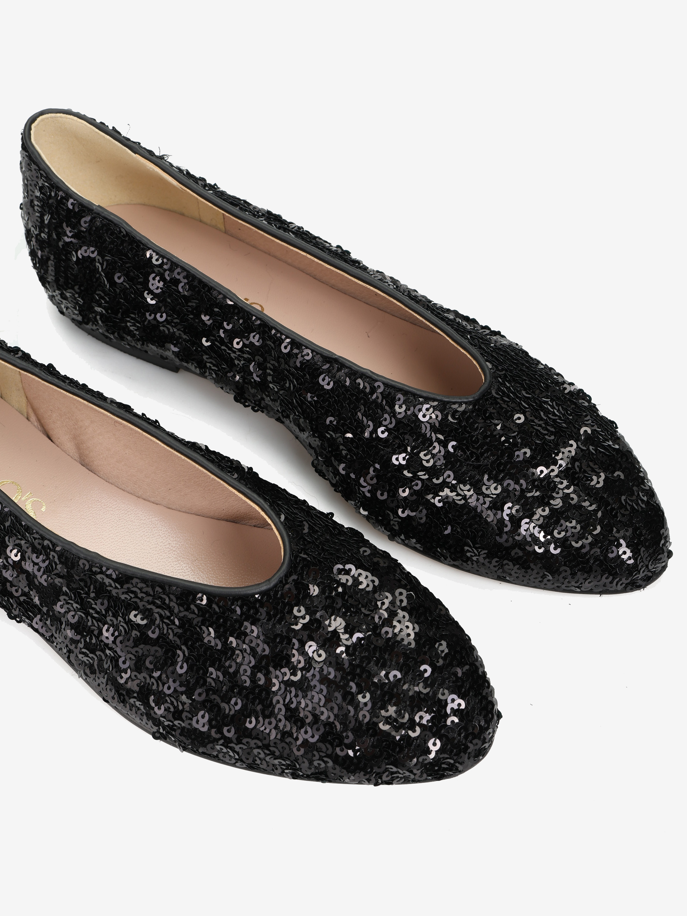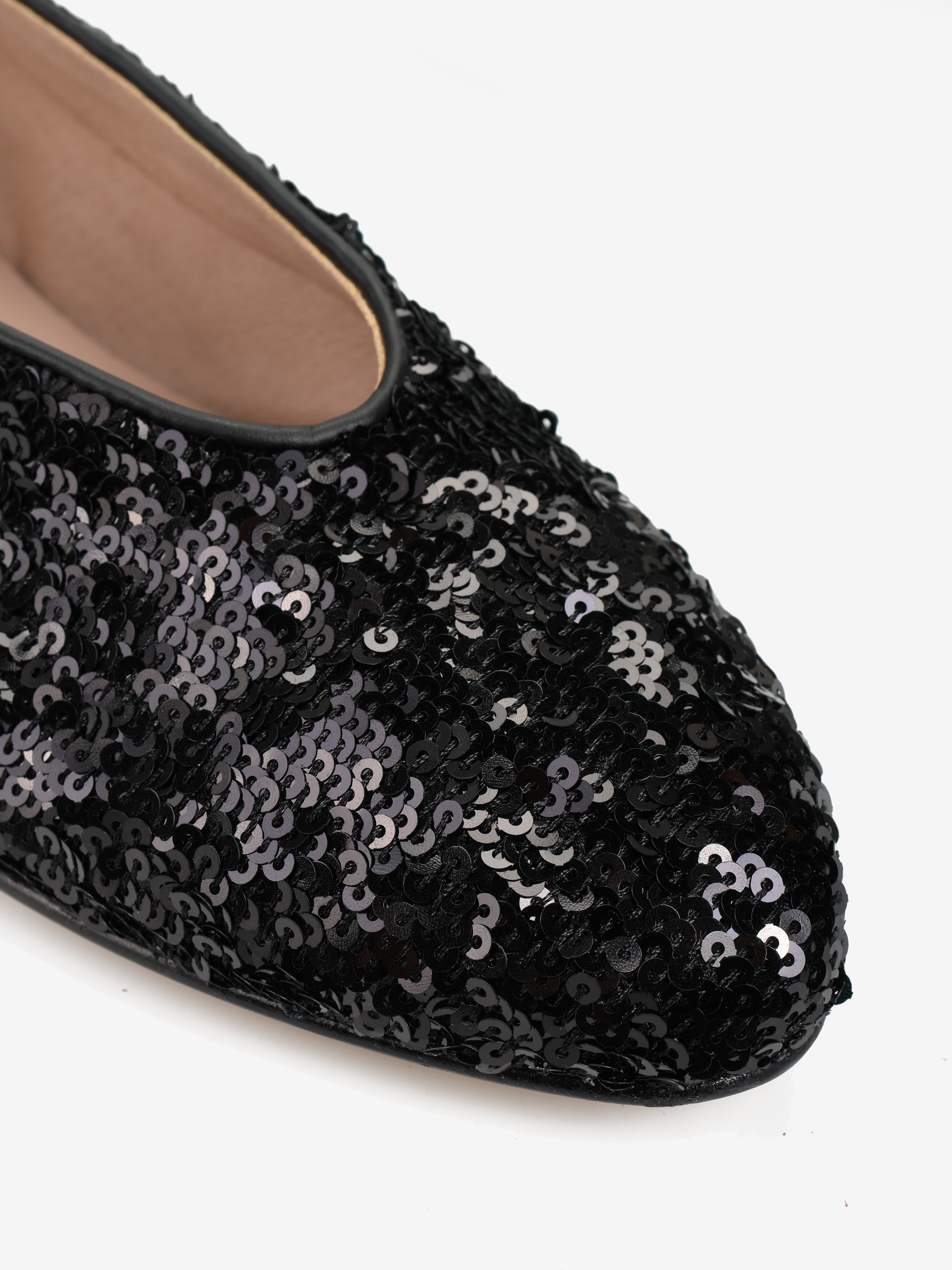 Proste baleriny z owalnym wycięciem i zabudowanymi brzegami na skórzanej podeszwie. Wykończone dwustronnymi cekinami, które można układać.