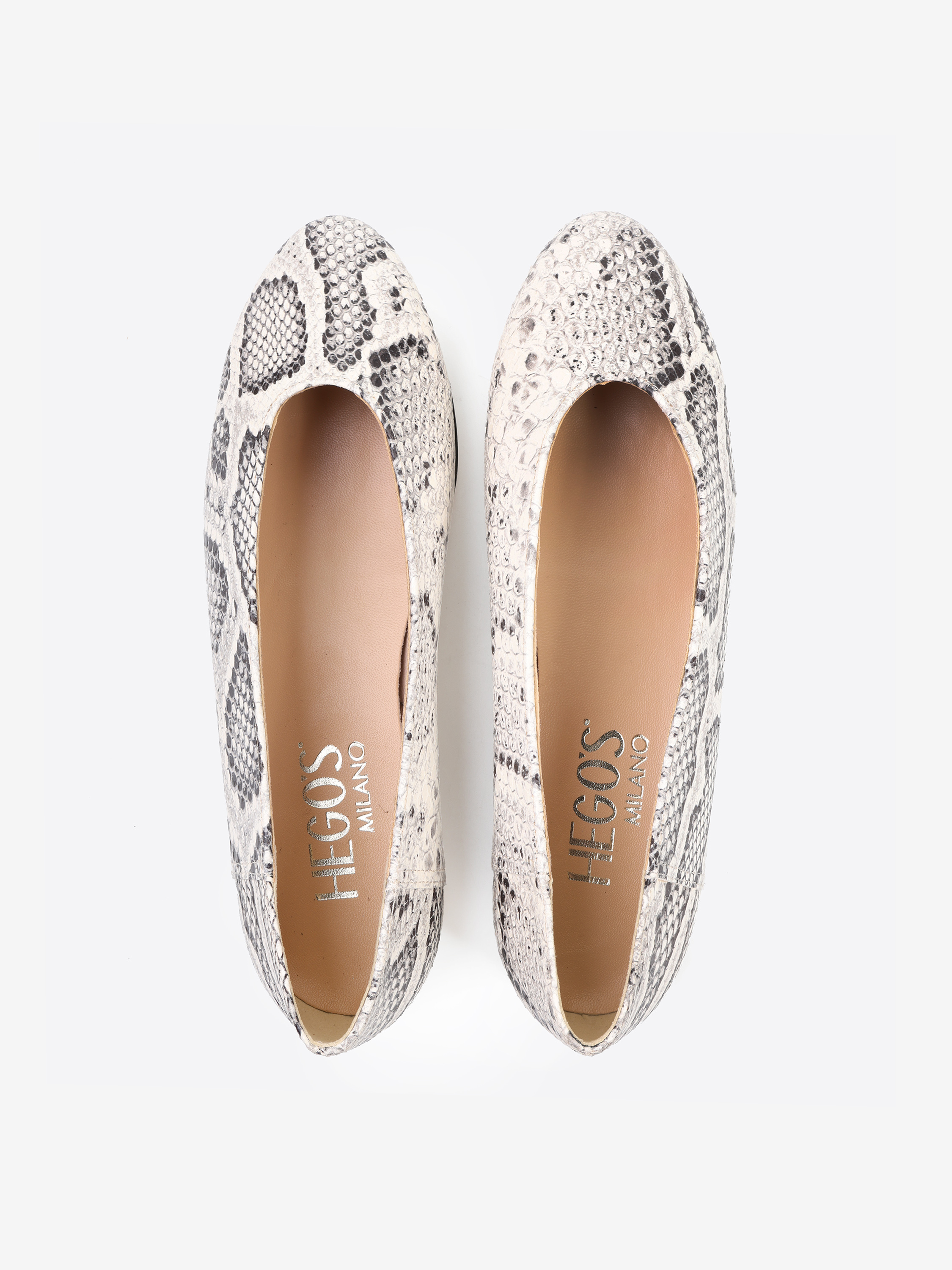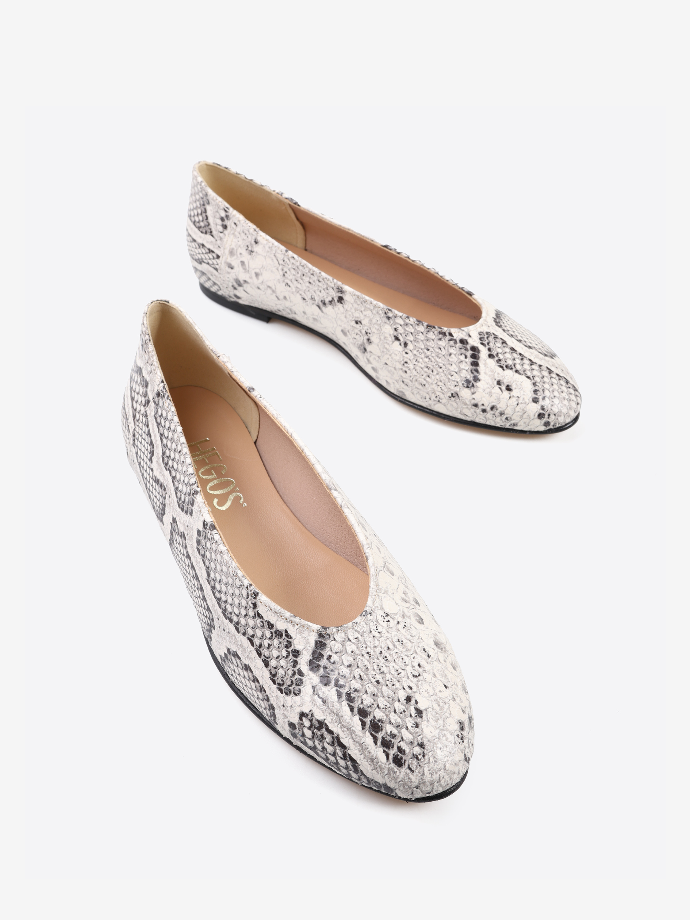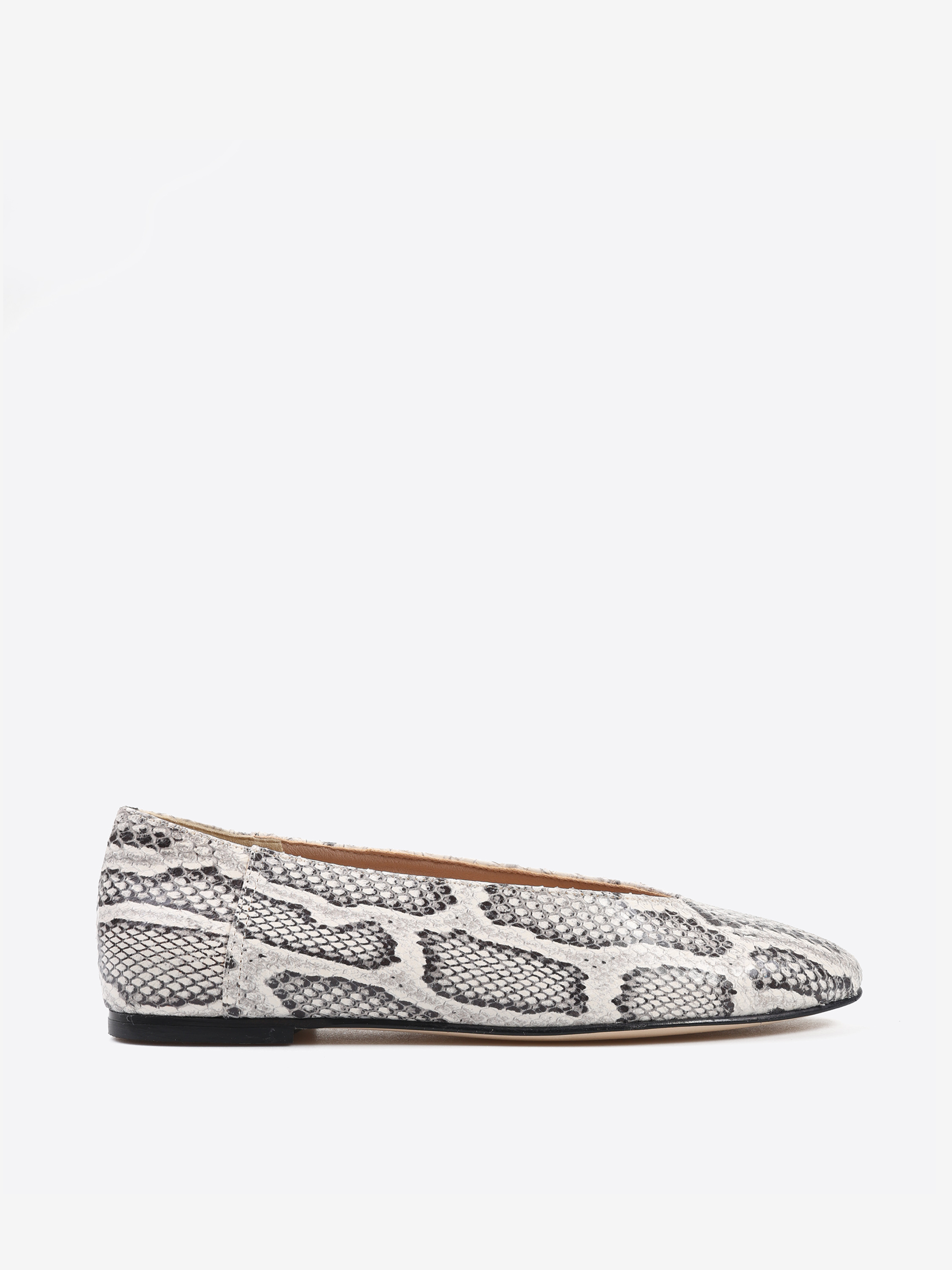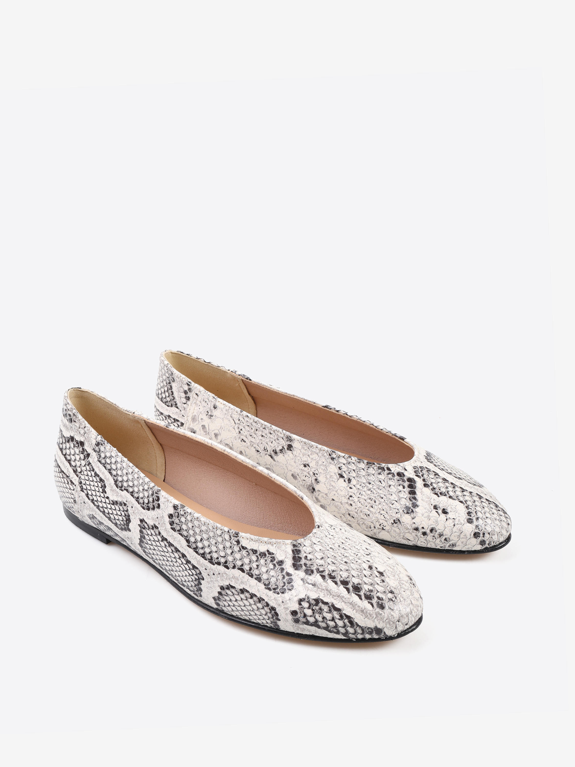 Proste baleriny z owalnym wycięciem i zabudowanymi brzegami na skórzanej podeszwie, wykonane z delikatnej, miękkiej skóry w wężowy wzór.