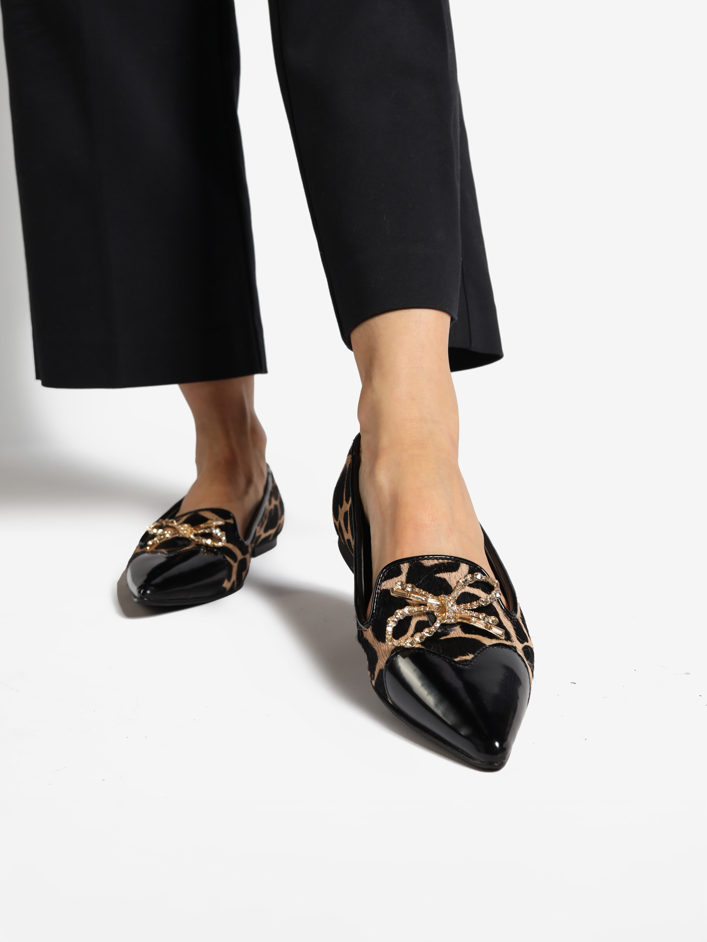 Baleriny z urodzinowej kolekcji Felicita' Autunno. Nosek w kształcie serca i biżuteryjna kokardka to dodatek, który przykuwa uwagę. Cholewa pokryta jest naturalnym włosiem.