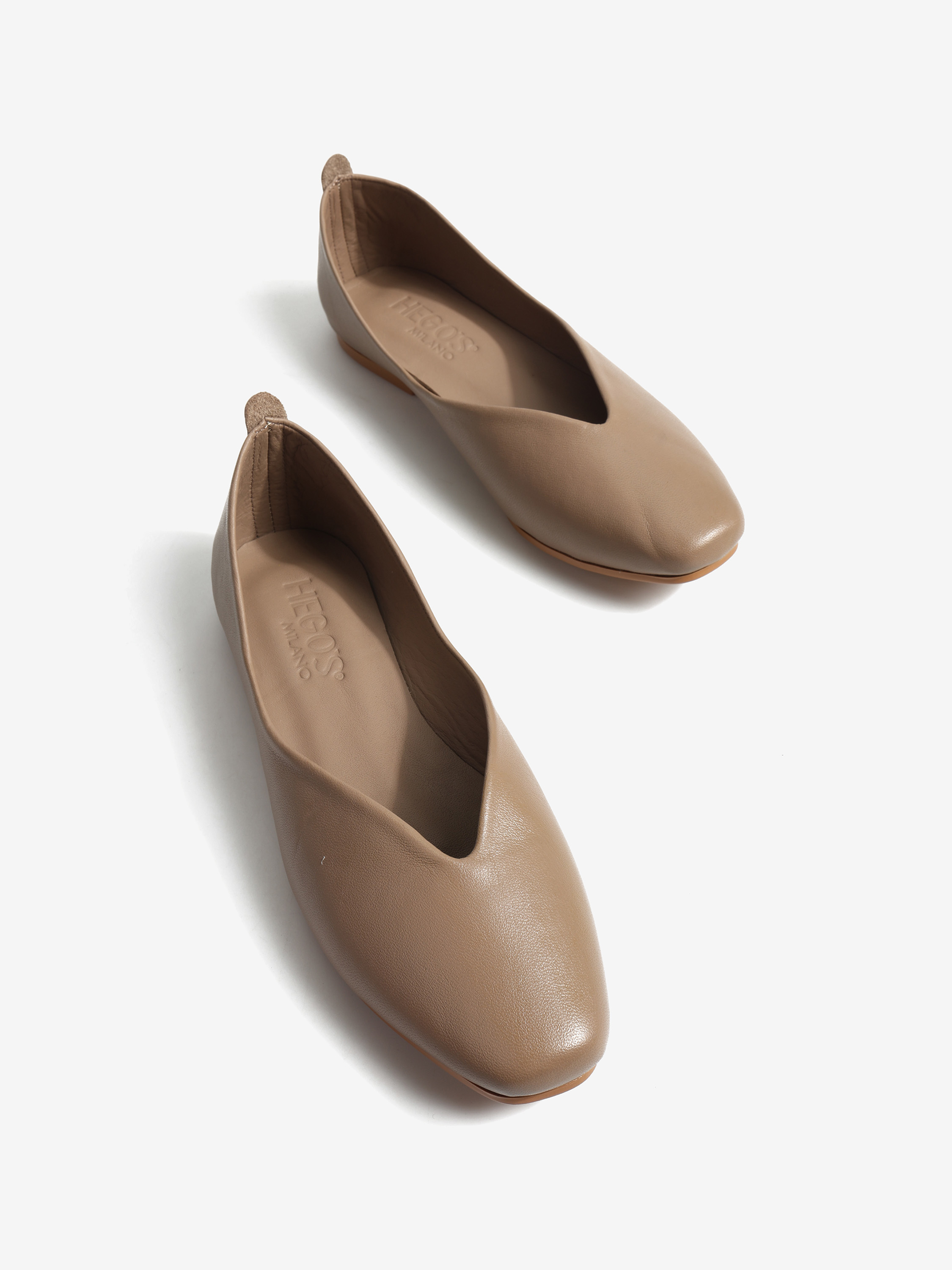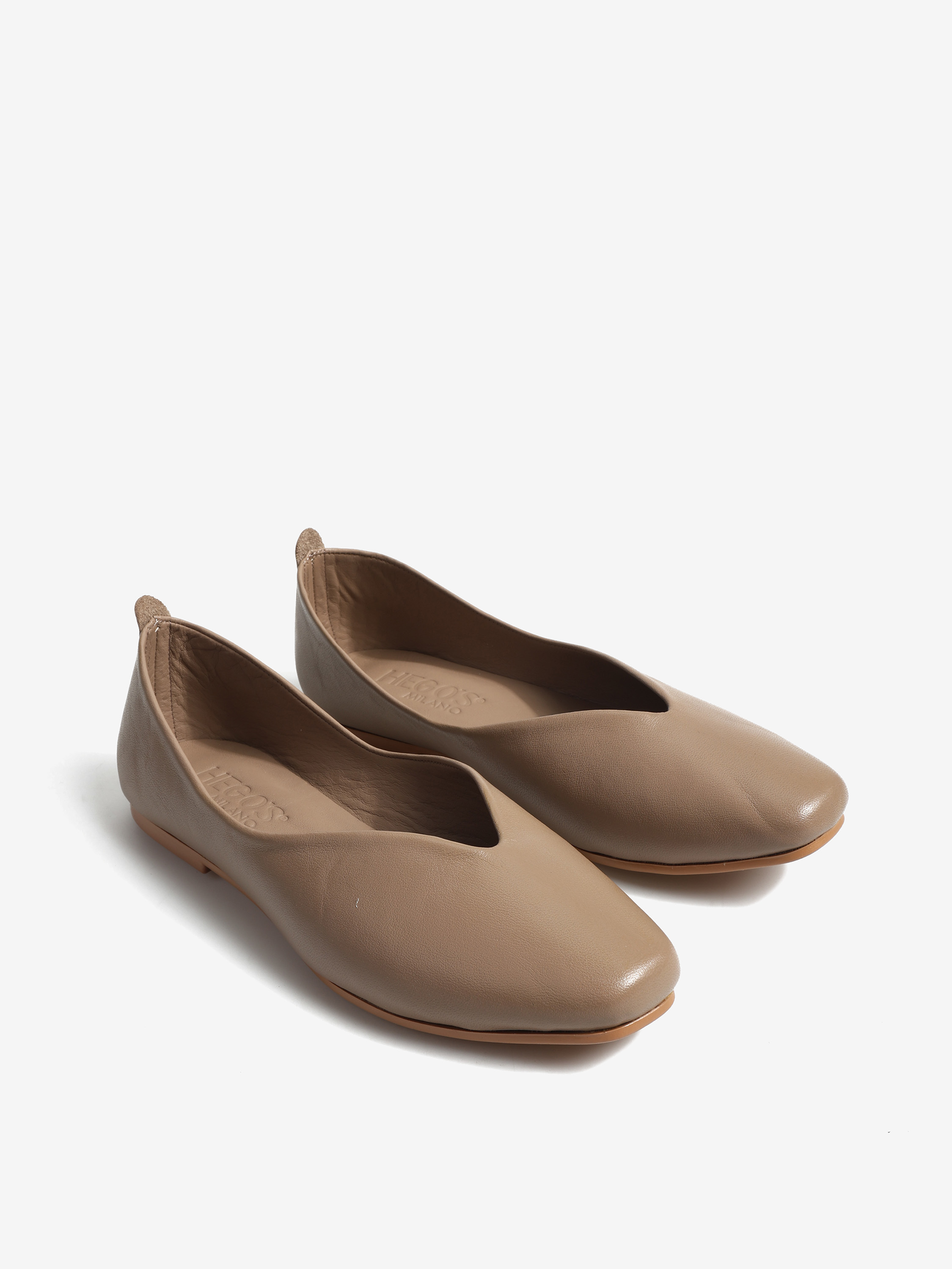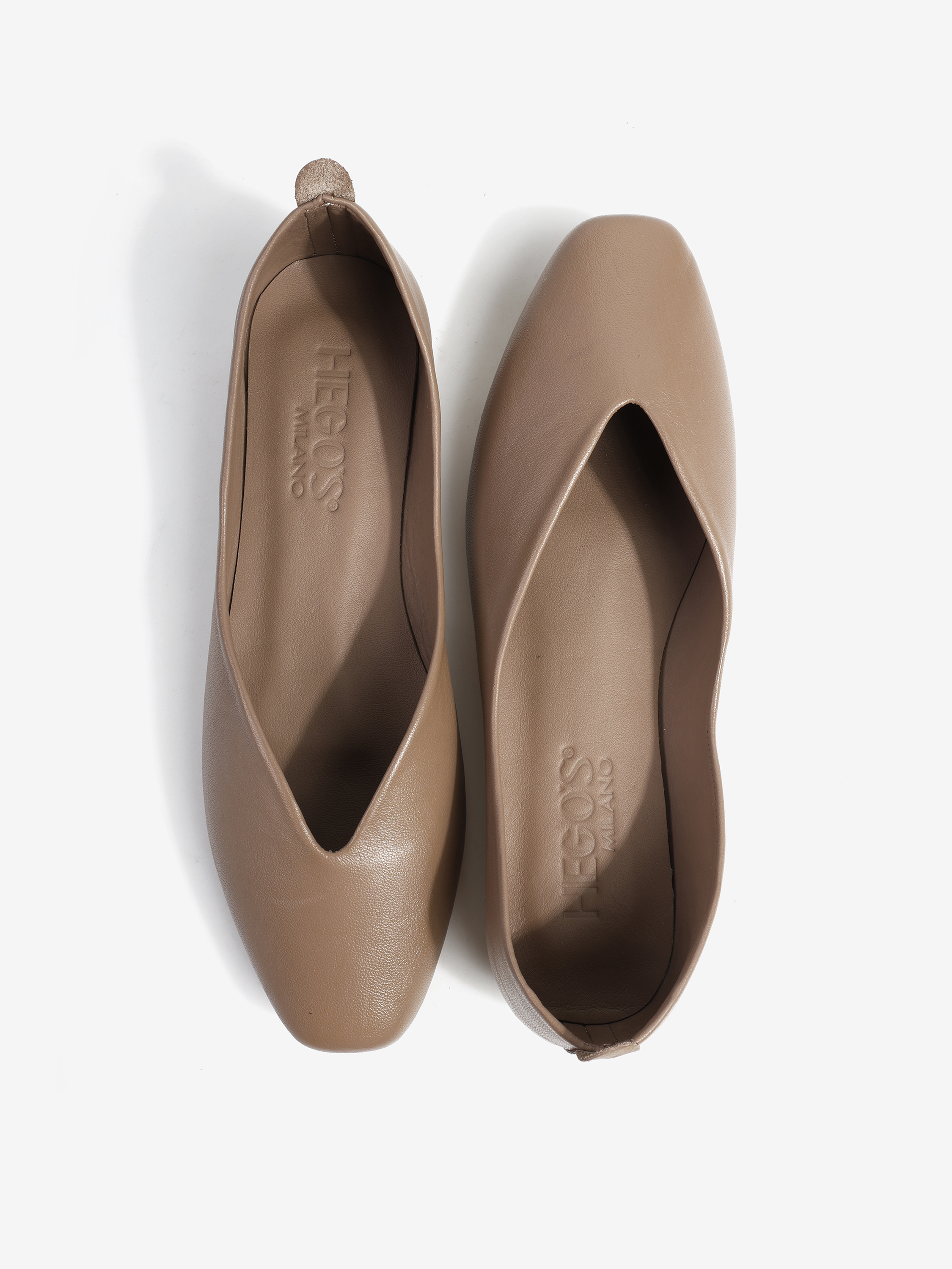 Baleriny wykonane z delikatnej, miękkiej skóry. Kwadratowy nosek i głębokie wycięcie w szpic.