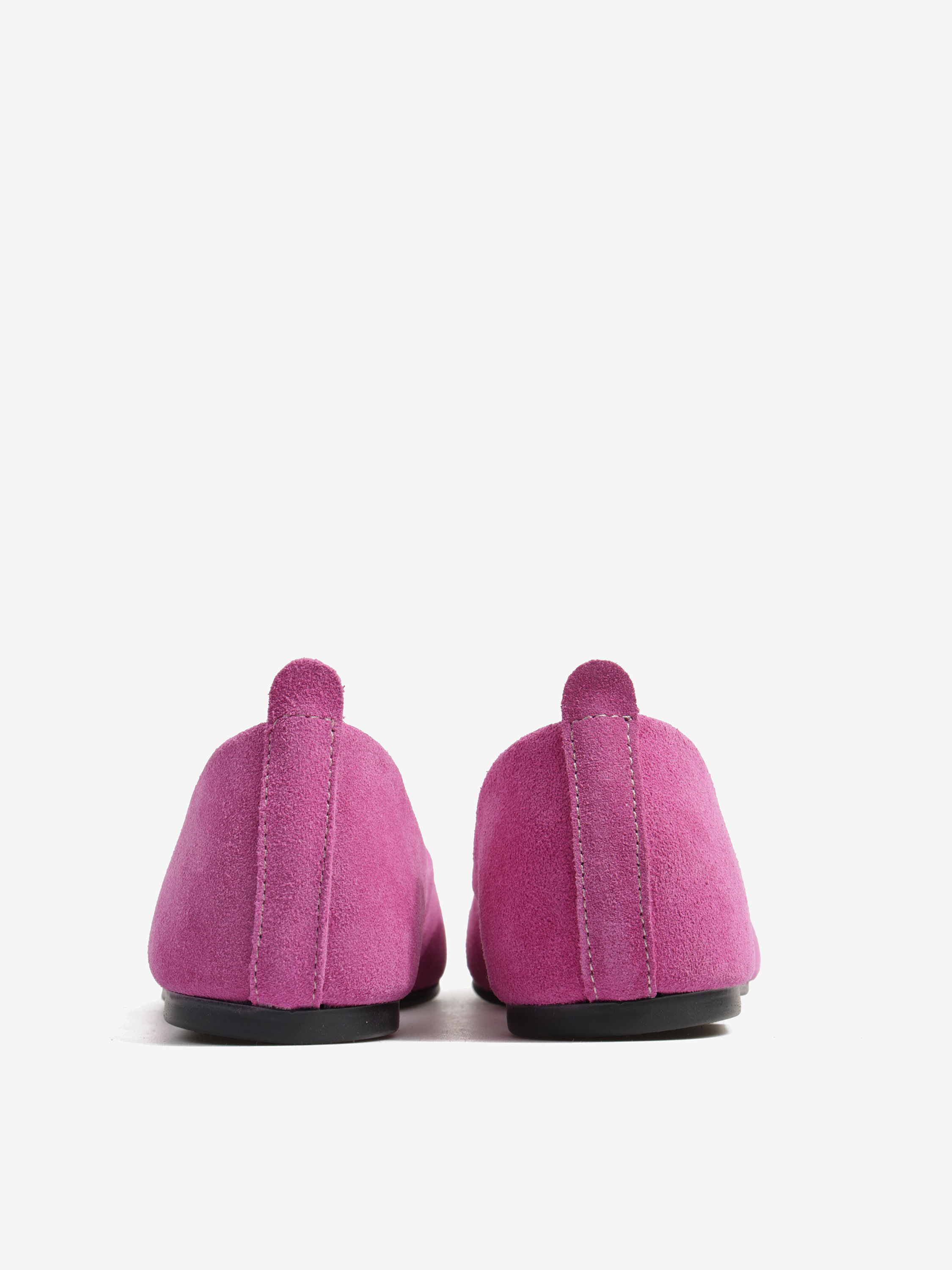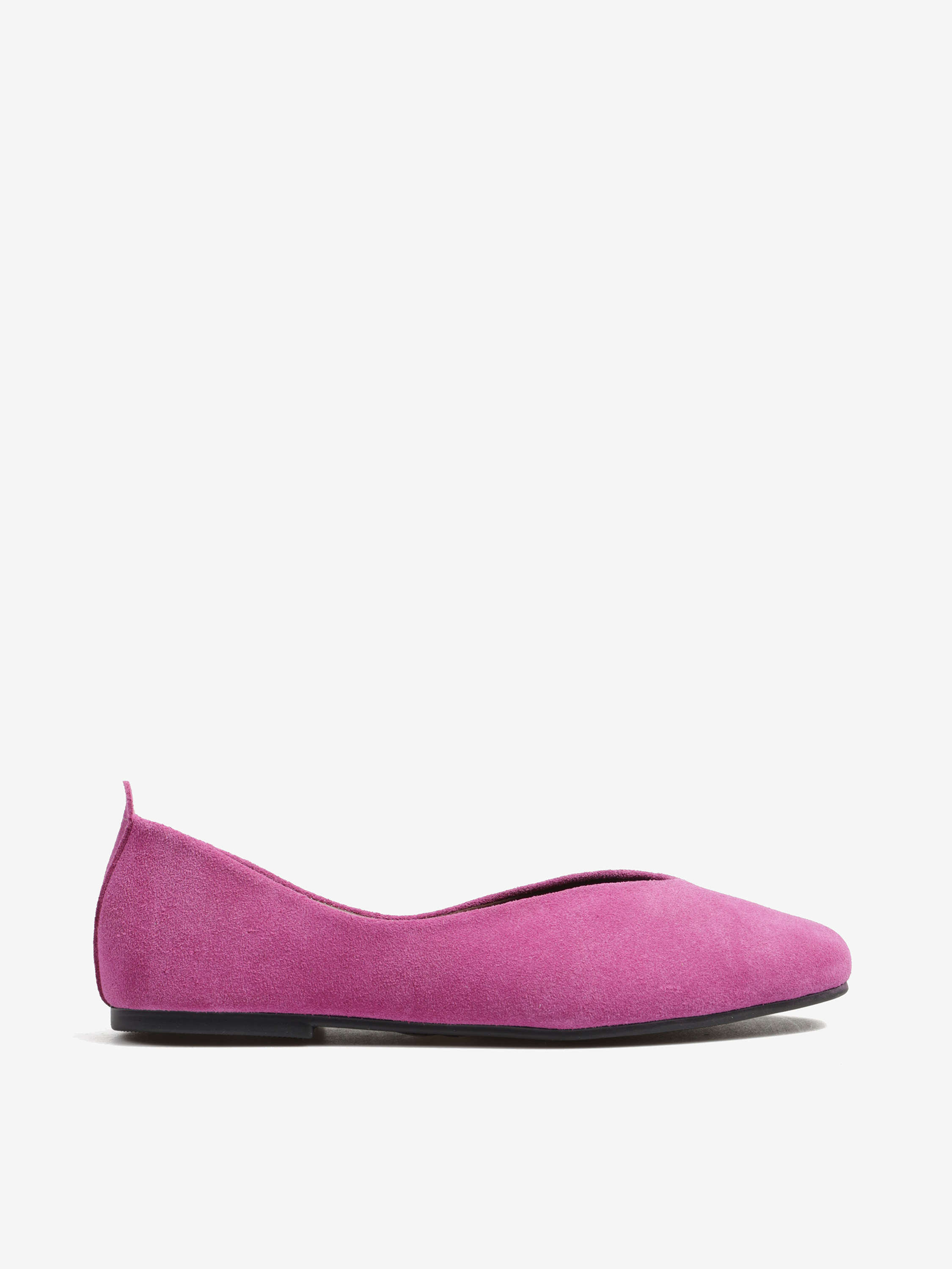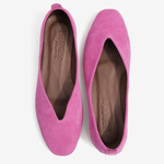 Baleriny wykonane z zamszowej, miękkiej skóry. Kwadratowy nosek i głębokie wycięcie w szpic.